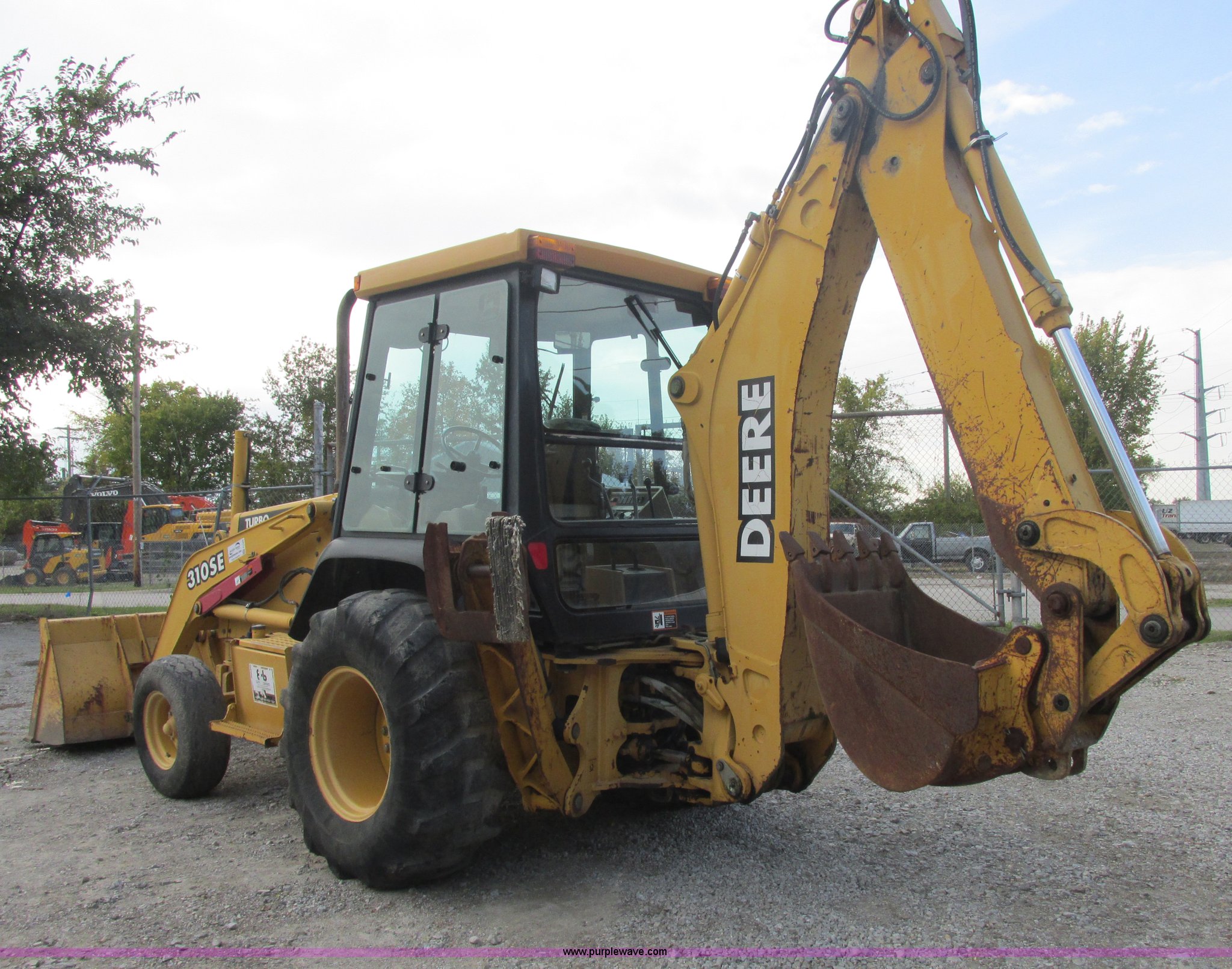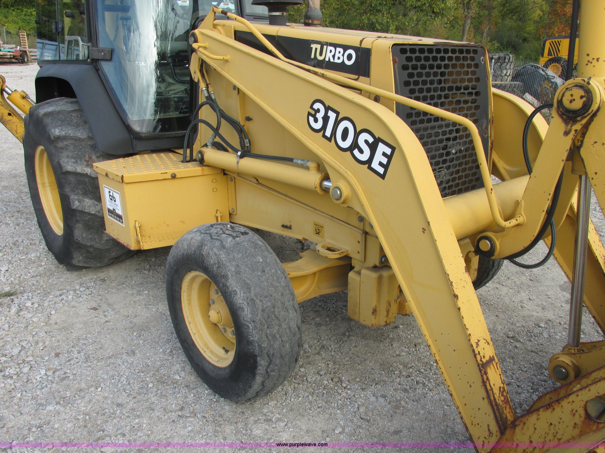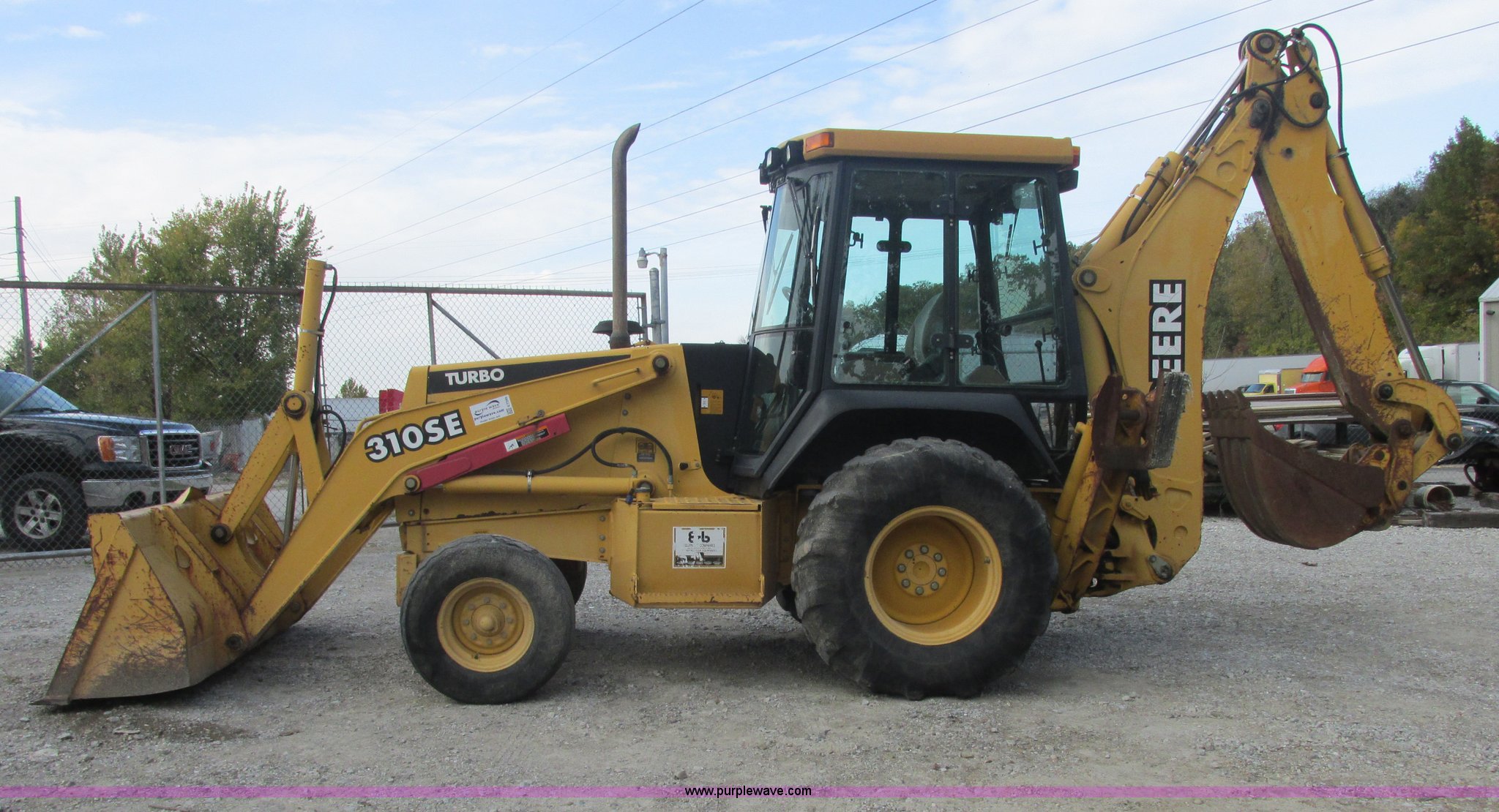 Purple Wave is selling a used Tractor Loader Backhoe in Missouri. This item is a 1998 John Deere 310SE backhoe with the following: 3,680 hours on meter, Hour meter flashes, John Deere diesel engine, Four speed transmission, Enclosed cab, Heat, AM/FM, Front and rear work lights, Front and rear windshield wipers, Mirror, Blinkers, Parking brake, 86"W front bucket, Cutting edge, Extend-A-Hoe, 24" toothed backhoe bucket, Manual quick attach bucket, Outriggers, One pad missing, Locking fuel tank, 16" front tires, 19.5L-24 rear tires, 14,790 lbs. base operating weight, Serial T0310SE849960