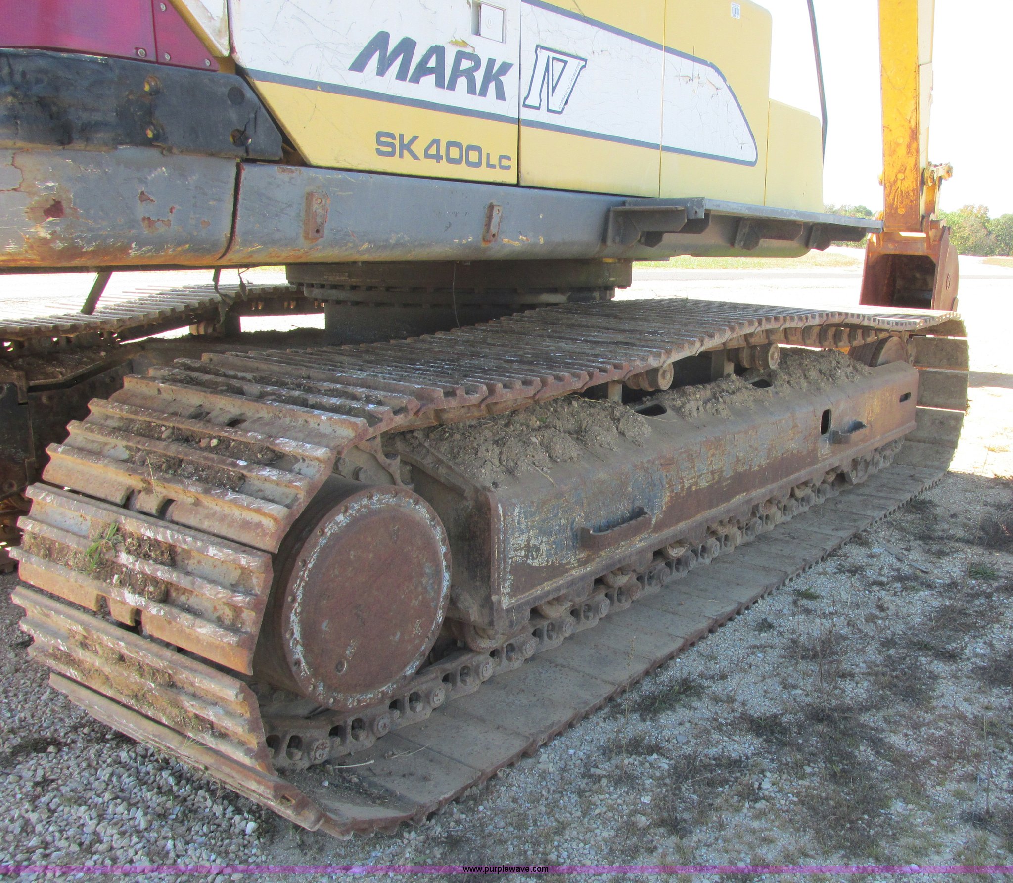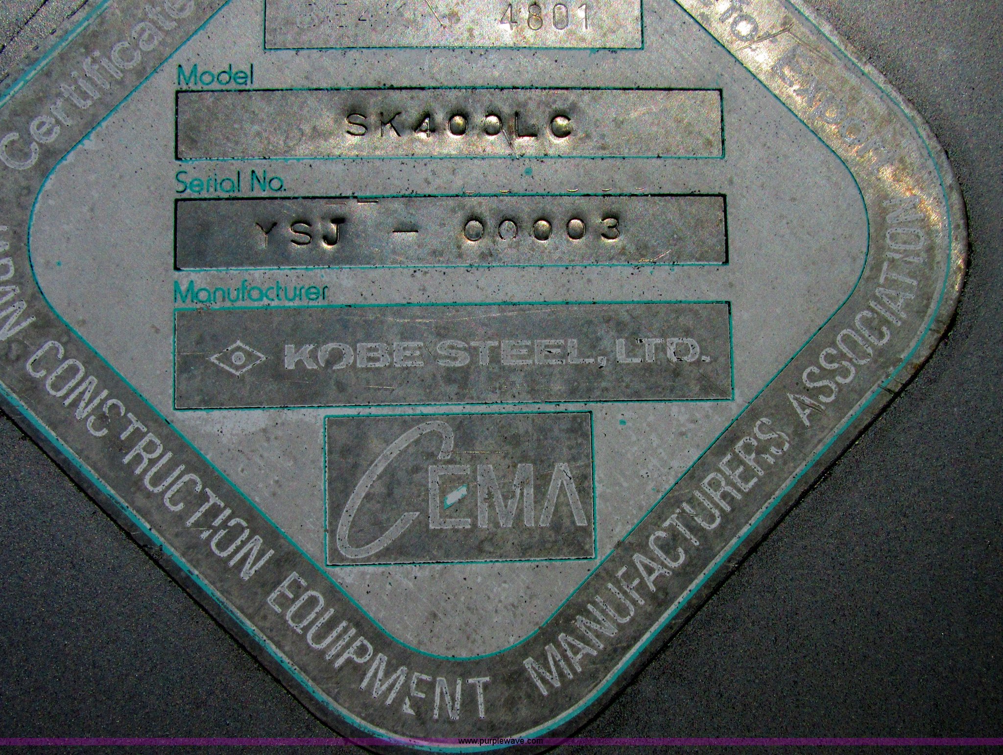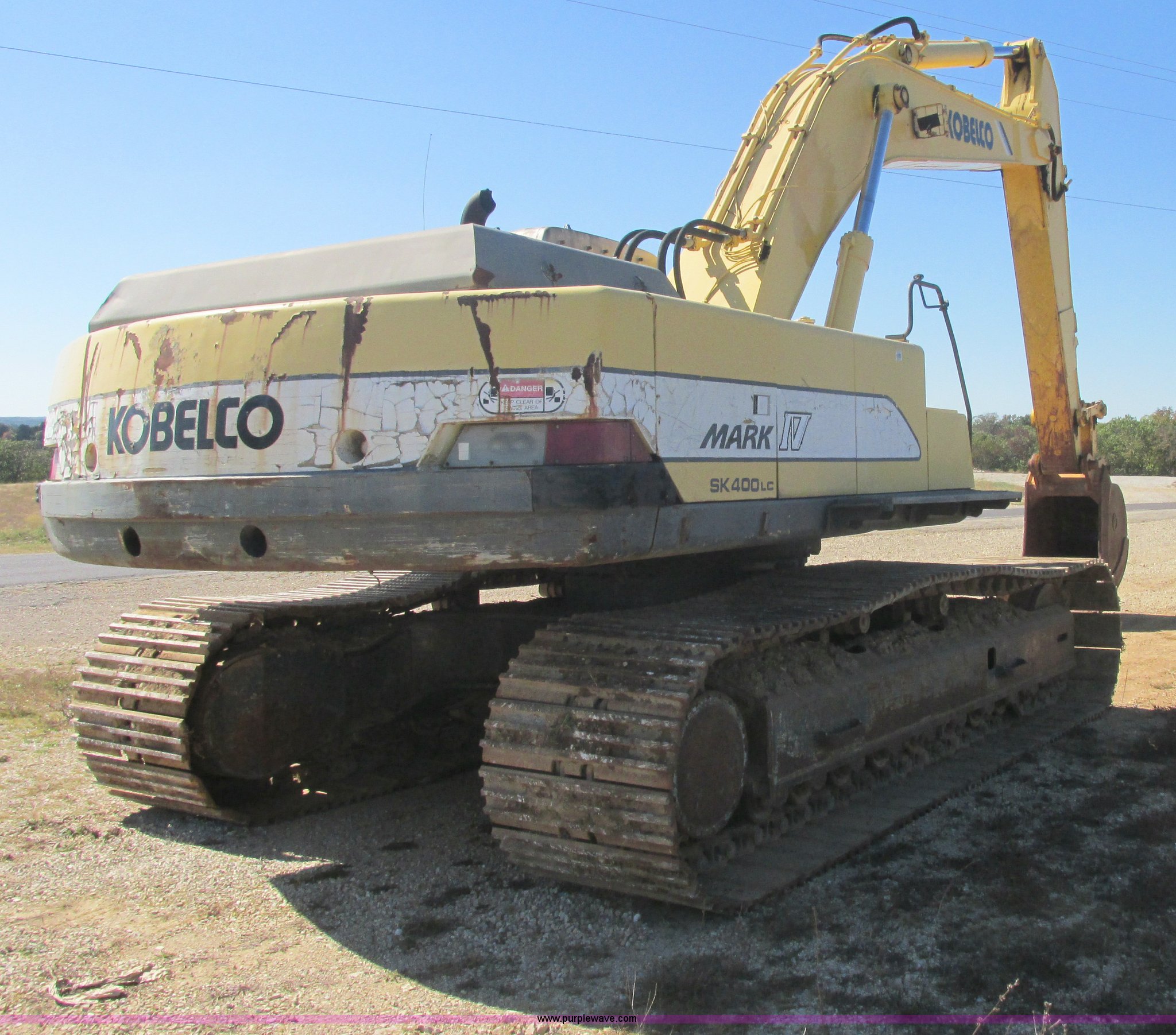 Purple Wave is selling a used Hydraulic Excavator in Missouri. This item is a 1995 Kobelco SK400LC Mark IV excavator with the following: Mitsubishi diesel engine, Hydrostatic transmission, EROPS, AC and heat, Unknown AC operating condition, Joystick controls, 11' stick, Exterior mirror bracket, No mirror, Work lights, Plumbed for breaker, (7) bottom rollers, 36" bucket, Side cutting edge, Twist on teeth, Chain loop, Built-in lube system, Reel gun, Storage, 35.5" triple grouser track pads, 101,684 lbs. base operating weight, Recently replaced batteries, Leaks, Interior/exterior cosmetic damage, Serial YSJ-00003