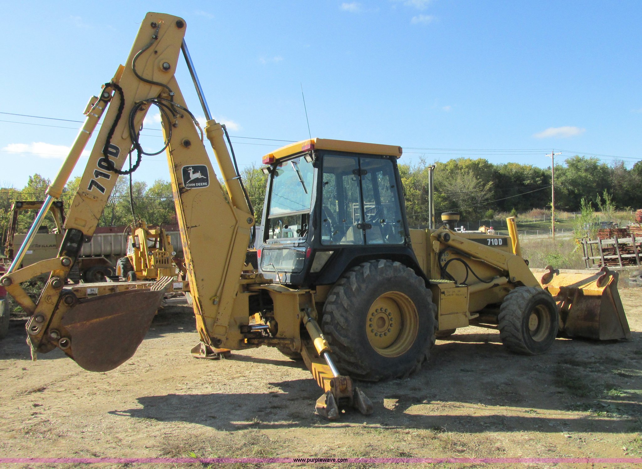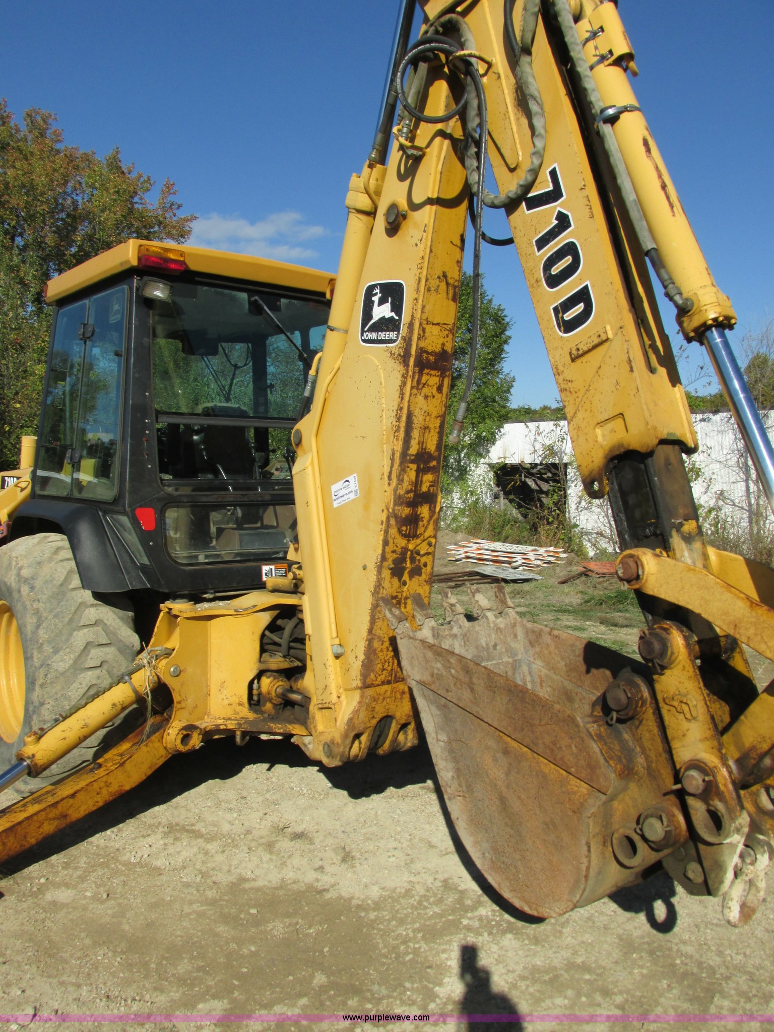 Purple Wave is selling a used Tractor Loader Backhoe in Missouri. This item is a 2000 John Deere 710D backhoe with the following: 2,885 hours on meter, John Deere Powertech 6.8L six cylinder turbo diesel engine, Four speed shuttle shift transmission, Four wheel drive, Enclosed cab, AC and heat, AM/FM, Joystick loader control, Two stick backhoe controls, Extend-A-Hoe, Hydraulic outriggers, 8'W loader bucket, Smooth bolt-on cutting edge, 24" five tooth backhoe bucket, 15-19 front tires, 21-28 rear tires, 24,552 lbs. base operating weight, Serial T0710DJ887650