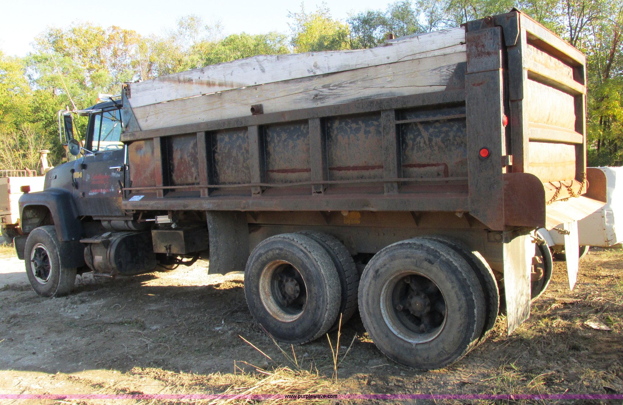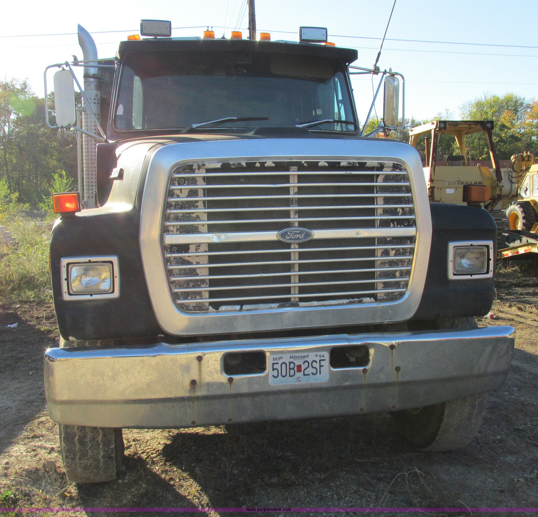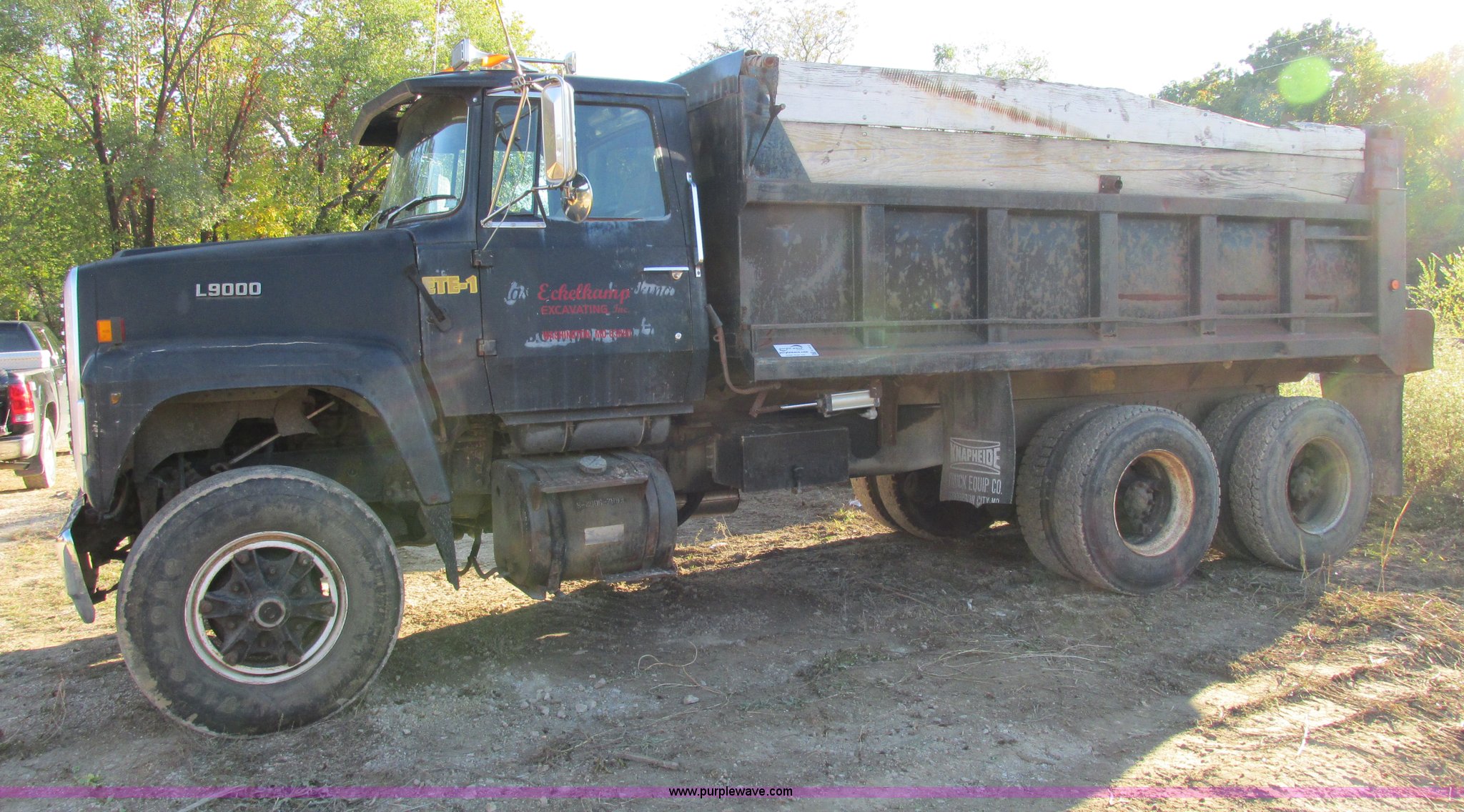Purple Wave is selling a used Construction Dump Truck in Missouri. This item is a 1988 Ford L9000 dump truck with the following: 658,406 miles on odometer, Cummins N14 14.0L L6 diesel engine, Eaton Fuller RTO-11613-14613 eight speed manual transmission, Locking differential, Heat, AM/FM/cassette, Manual windows and locks, Air suspension seat, 15'L x 8'W x 55"H dump bed, Air operated end gate, Exterior visor, PTO, Air brakes, 204" wheelbase, 315/80R22.5 front tires, 11R22.5 rear tires, GVWR 50,000 lbs