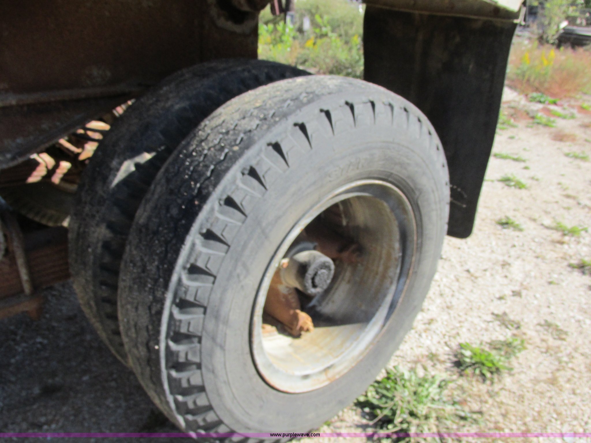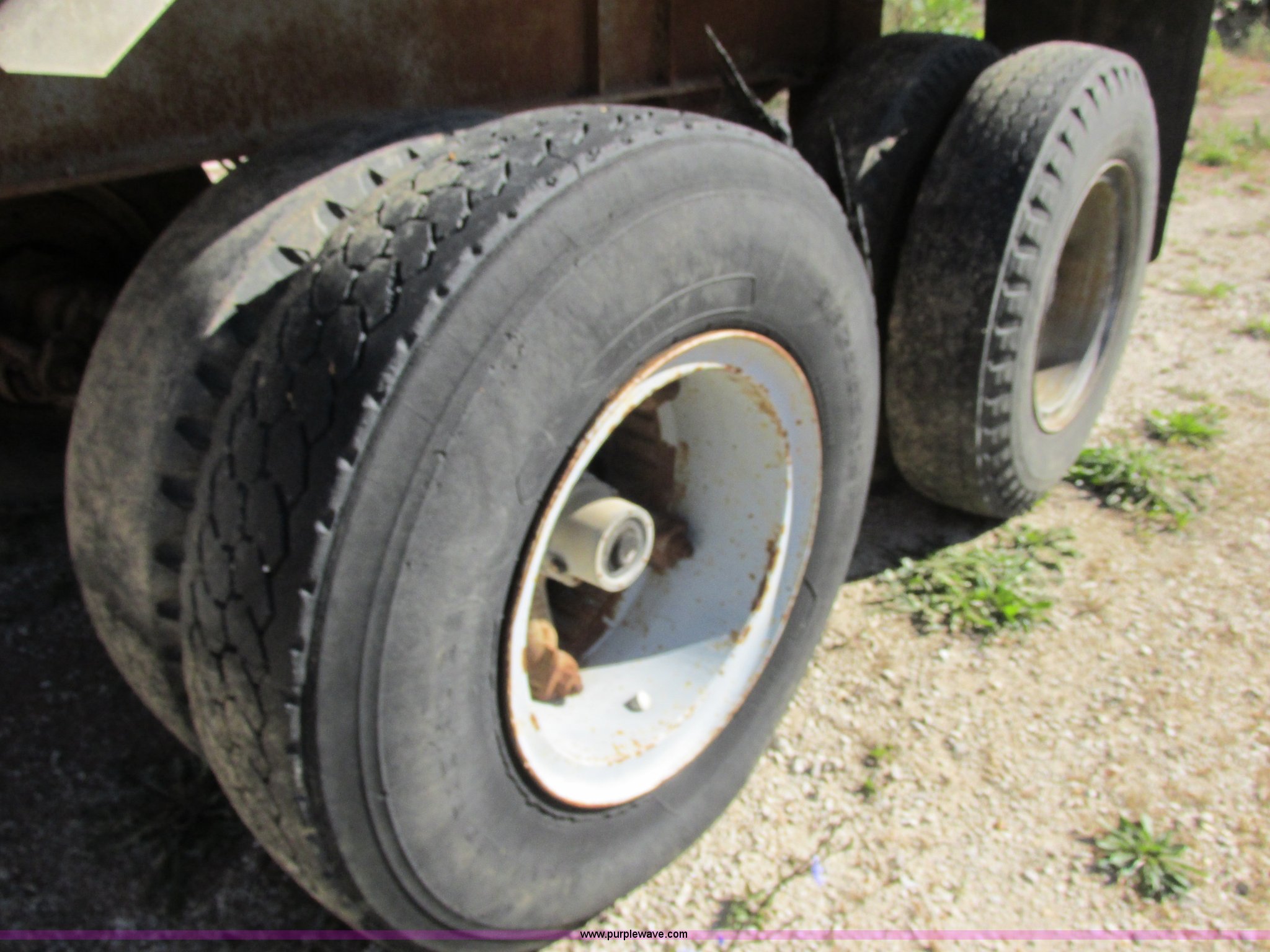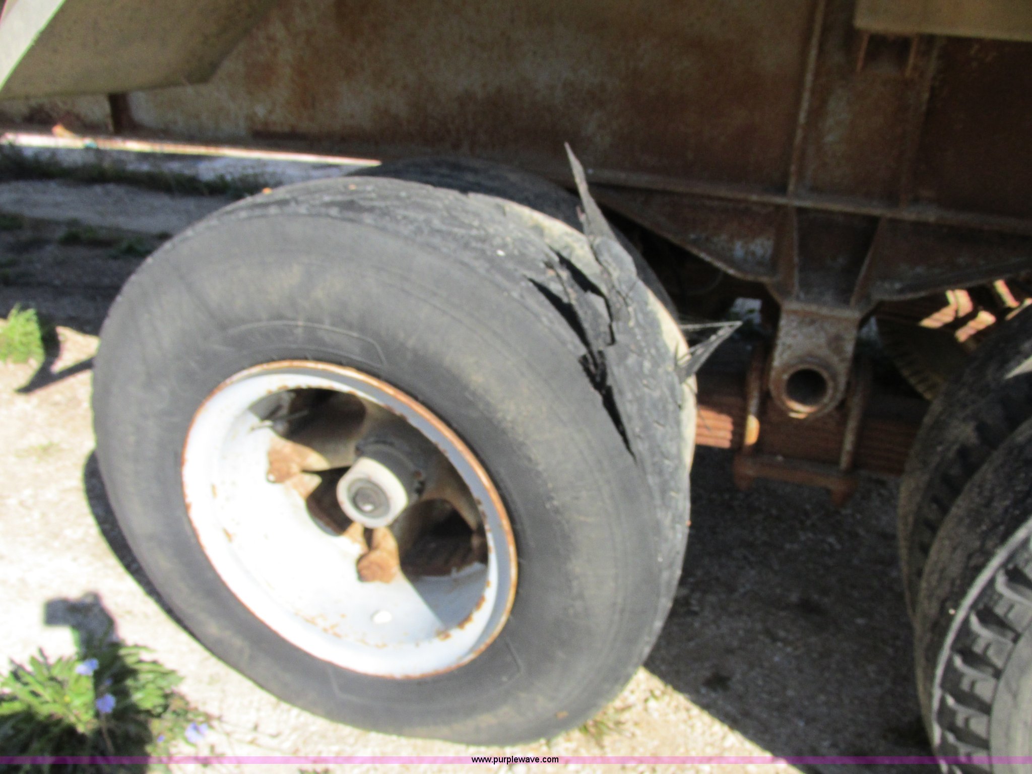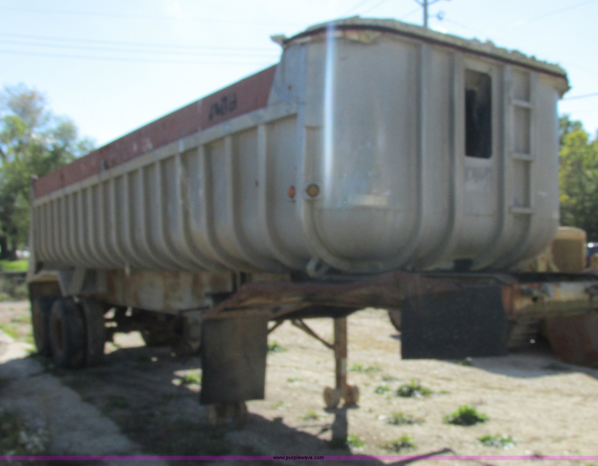Purple Wave is selling a used End Dump Rock Trailer in Missouri. This item is a 1966 Fruehauf aluminum dump trailer with the following: 28'L x 8'W, Steel sideboards, Air operated tailgate, Rear gate grain door, Dual leg jacks, Spring suspension, Air brakes, 10.00R20 tires, Tread separated on one tire, Fenders bent, Damaged air fitting, Dented, Weld repairs