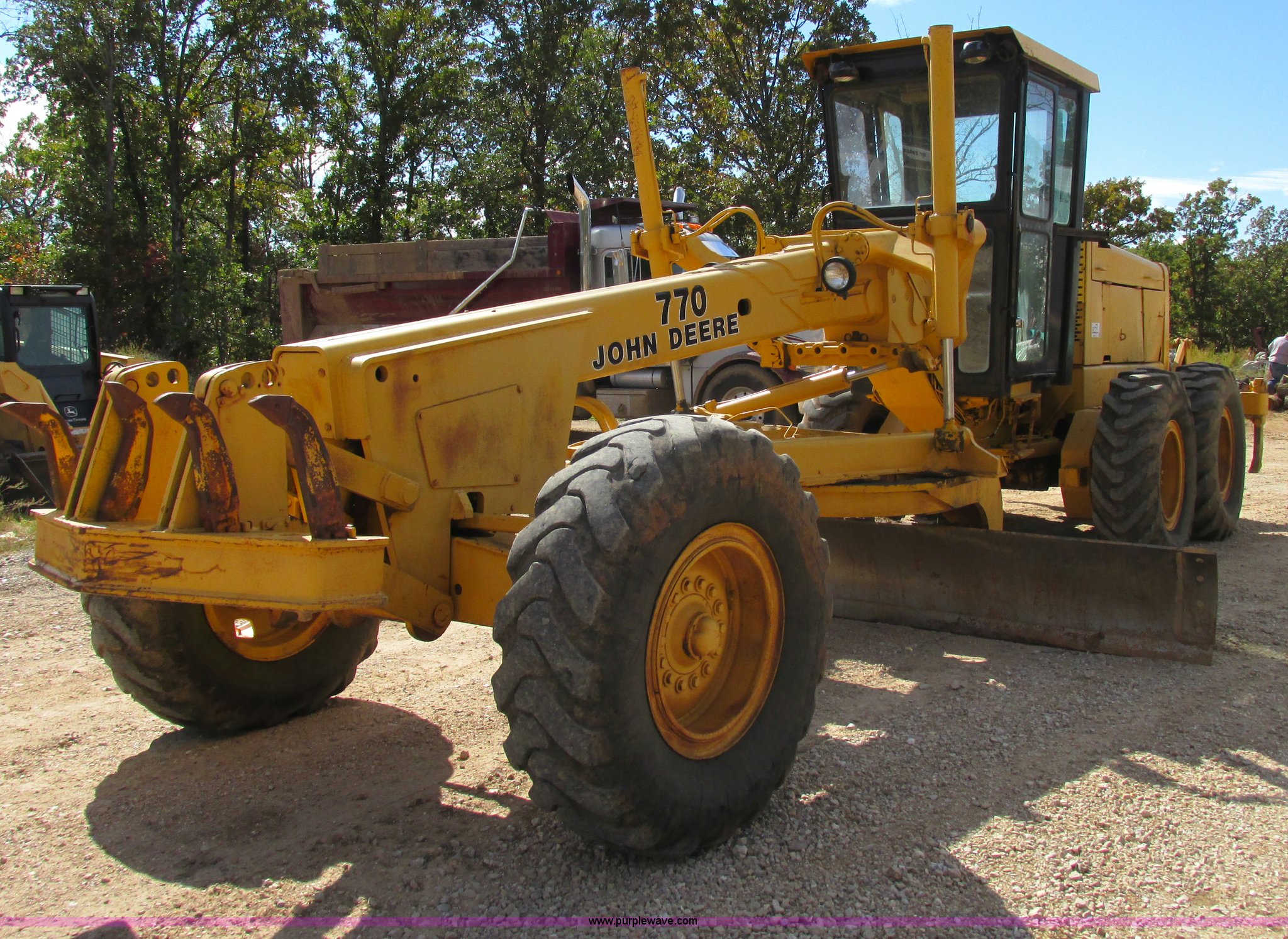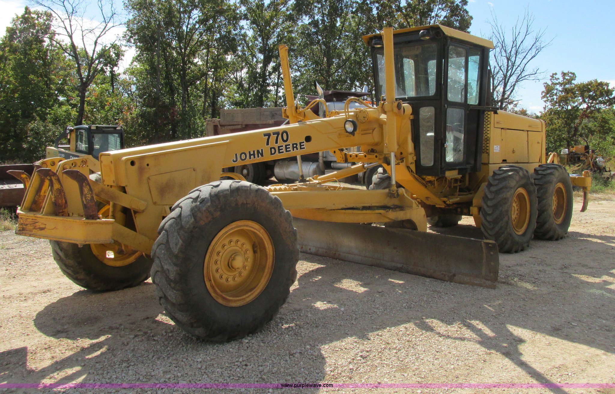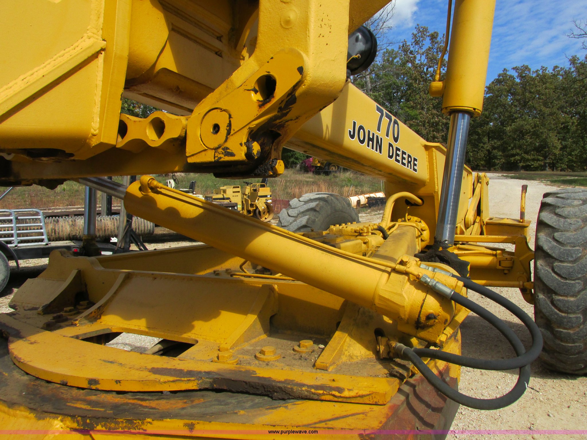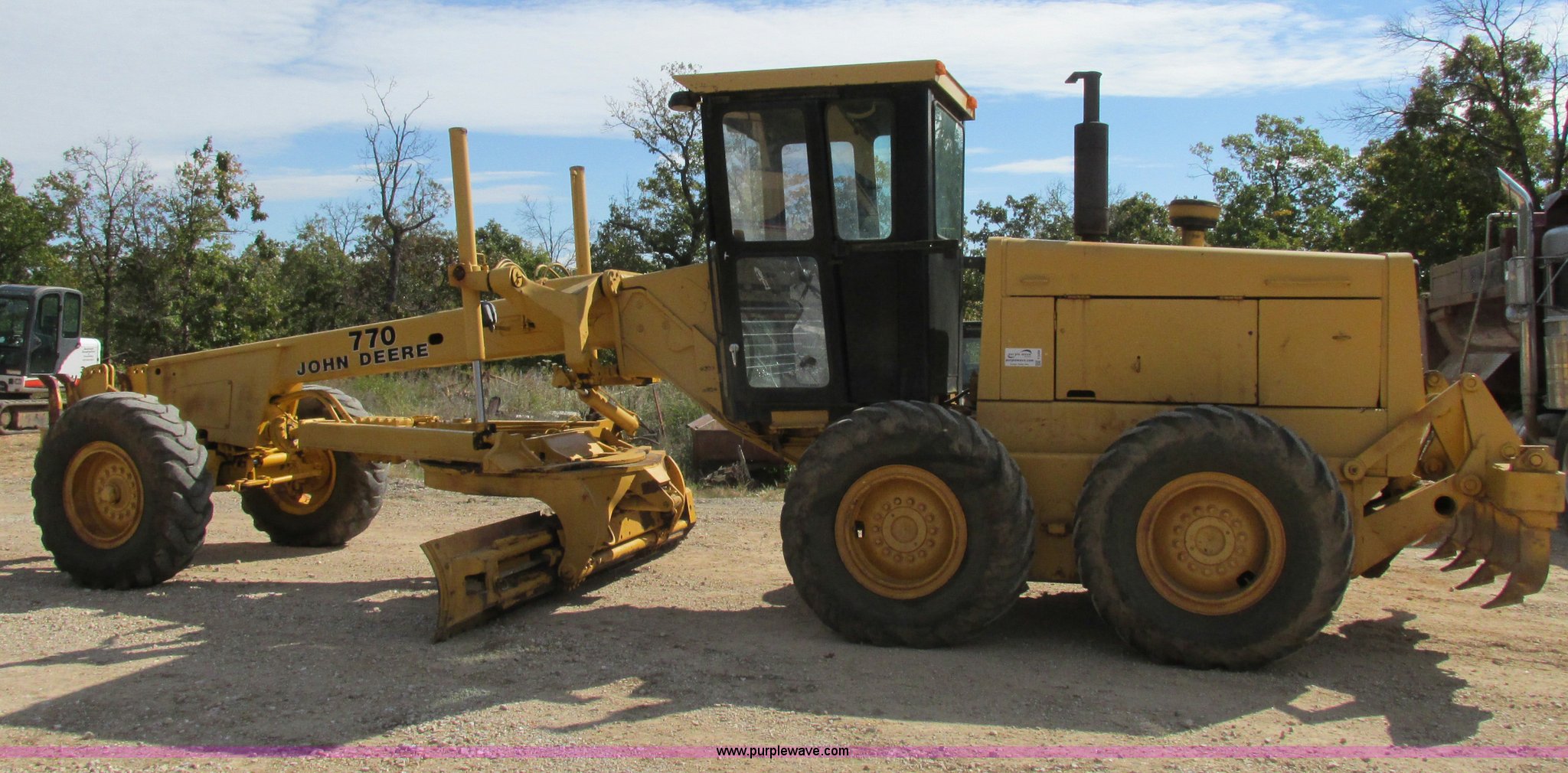 Purple Wave is selling a used Motor Grader in Missouri. This item is a 1980 John Deere 770A articulated motor grader with the following: 2,907 hours on meter, John Deere six cylinder turbo diesel engine, 155 HP, Eight speed powershift transmission, Enclosed cab, Heat, Adjustable spring suspension seat, Tinted windows, Electric over hydraulic controls, Hydraulic tilt front end, 13' moldboard, Tip control, Side shift, 4' front ripper, (4) shanks, 4' rear ripper, (5) shanks, 14.00-24 tires, 32,300 lbs. base operating weight, Some glass broken but intact, Serial 06274T