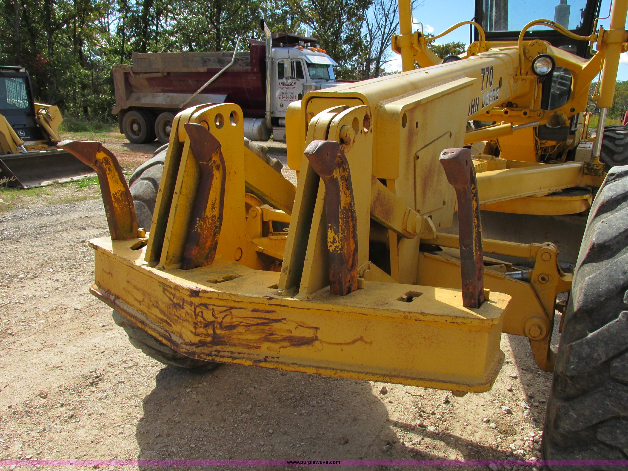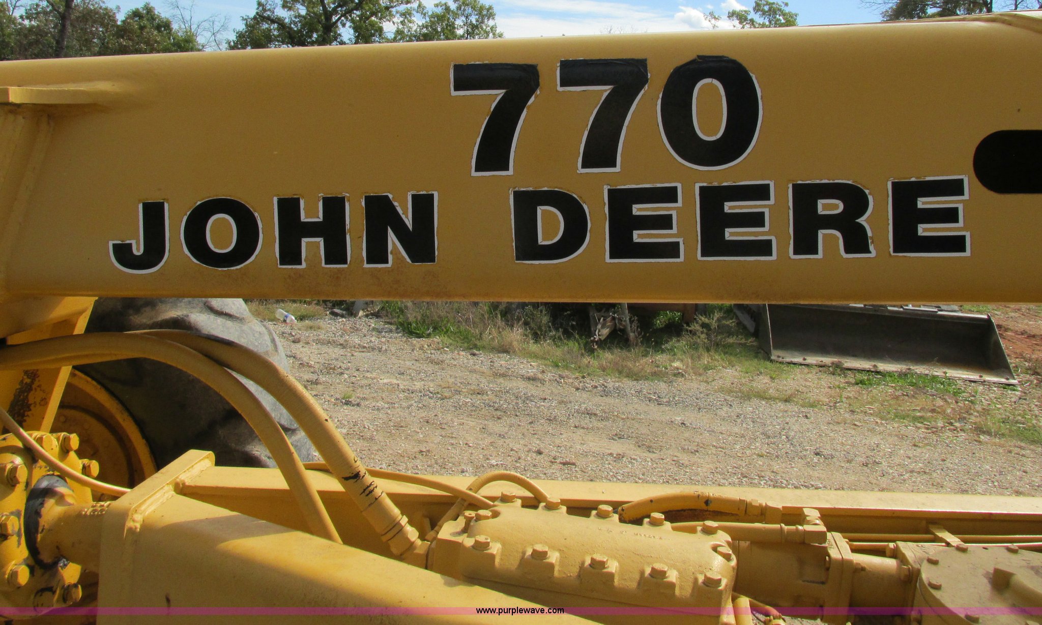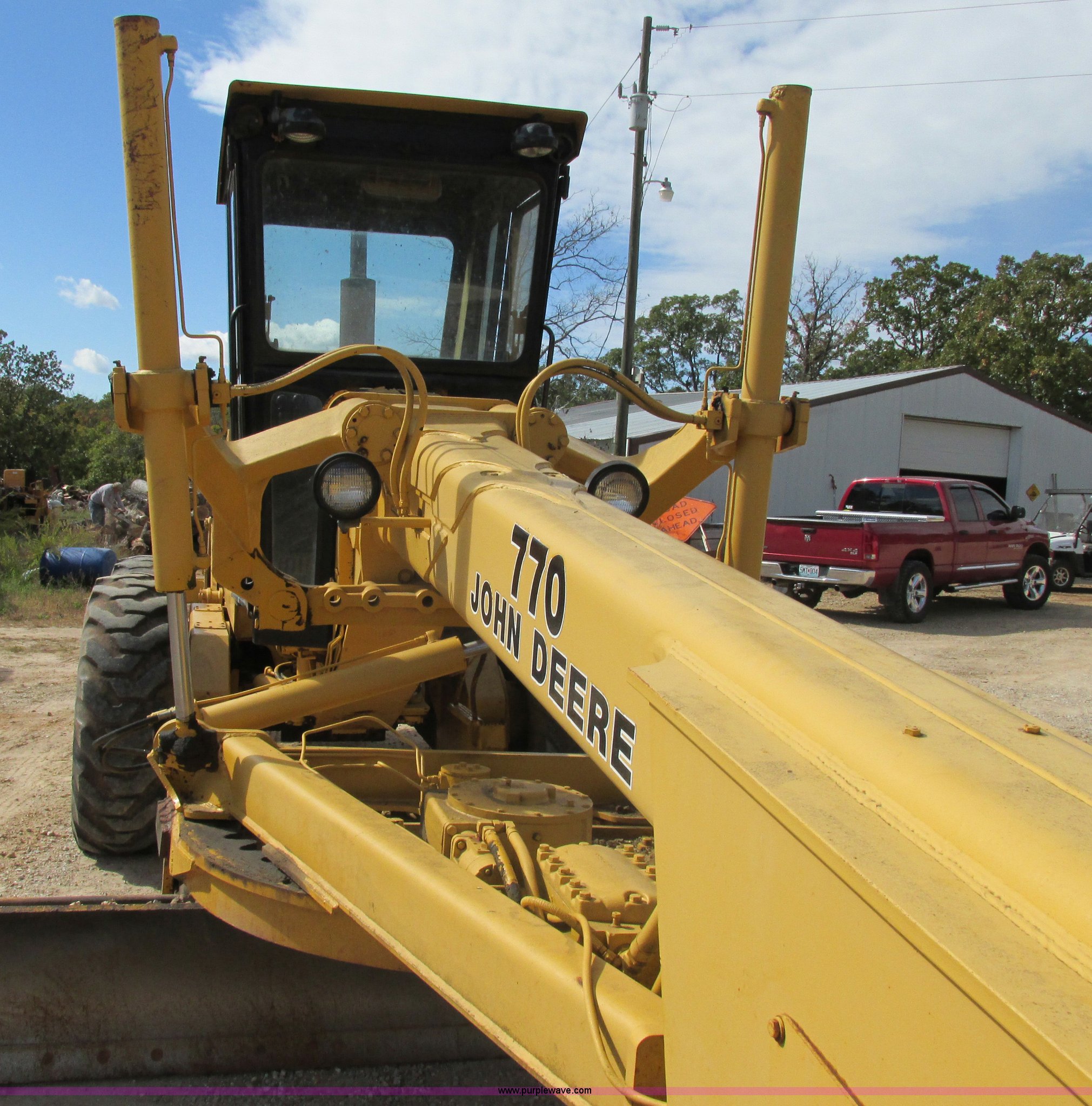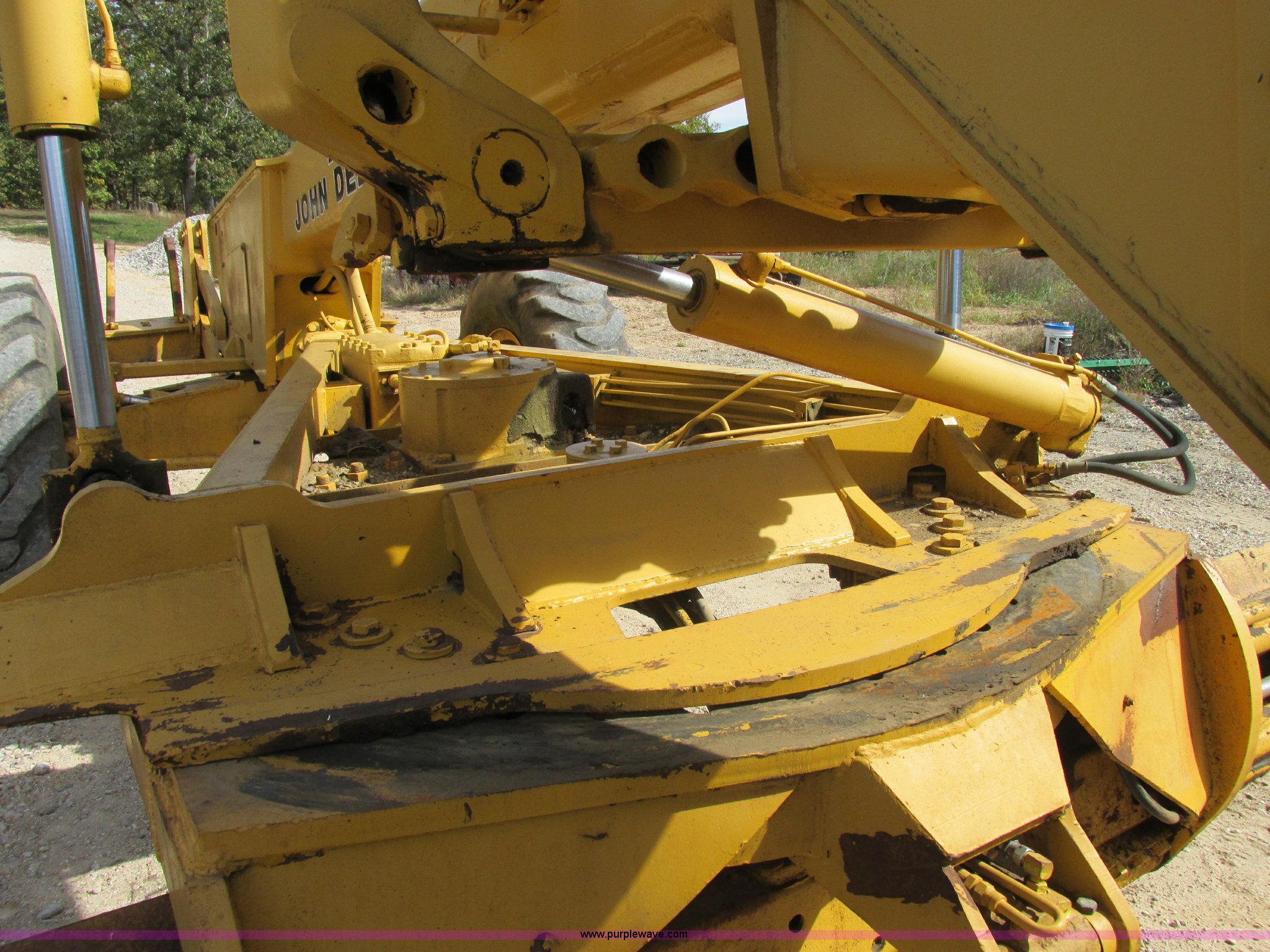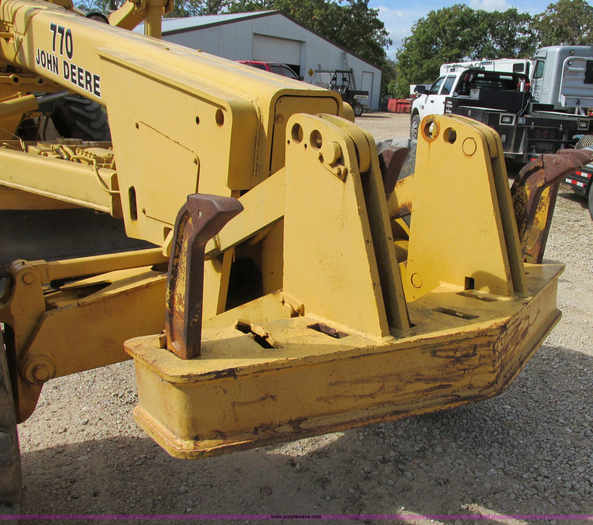 Purple Wave is selling a used Motor Grader in Missouri. This item is a 1980 John Deere 770A articulated motor grader with the following: 2,907 hours on meter, John Deere six cylinder turbo diesel engine, 155 HP, Eight speed powershift transmission, Enclosed cab, Heat, Adjustable spring suspension seat, Tinted windows, Electric over hydraulic controls, Hydraulic tilt front end, 13' moldboard, Tip control, Side shift, 4' front ripper, (4) shanks, 4' rear ripper, (5) shanks, 14.00-24 tires, 32,300 lbs. base operating weight, Some glass broken but intact, Serial 06274T