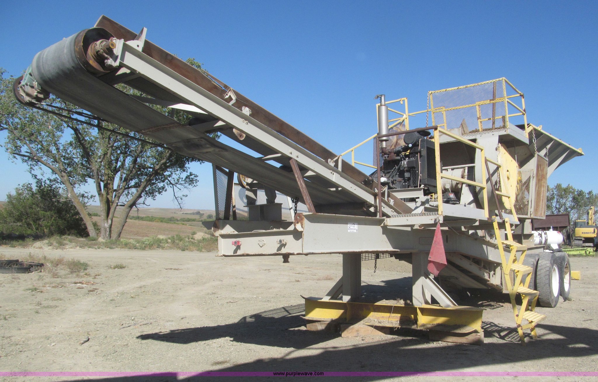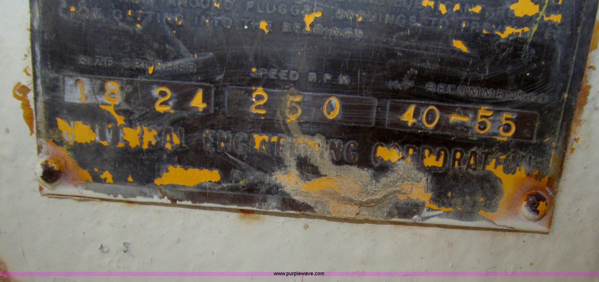 Universal portable jaw crusher. 250 RPM, 18 x 24 crusher, Approximately 32'L tandem axle trailer, 39'L x 9'W O.D., 2007 Cummins 3.261L four cylinder turbo diesel engine Serial 68081358, 53 hours on meter, Fines bypass, 10'L x 24"W metal apron feeder, Recently replaced toggle plate, NACD power take off 115S clutch size, Adjustable clutch 109 to 115 ft lbs, Serial 08D29270, 22"W discharge belt, Guards in place, Conveyor belt rollers, 2" to 8" crushing range, Uenco chassis data plate serial 501X2, Front conveyor belt foldable for transport, Gladhand and seven pin connectors, Spring suspension, Air brakes, 10R22 front tires, 11R24.5 rear tires, Belts replaced Summer 2012, Serviced regularly, Conveyor discharge belt showing wear and repair, Serial 114X7. View equipment video. Franklin, NE 68939