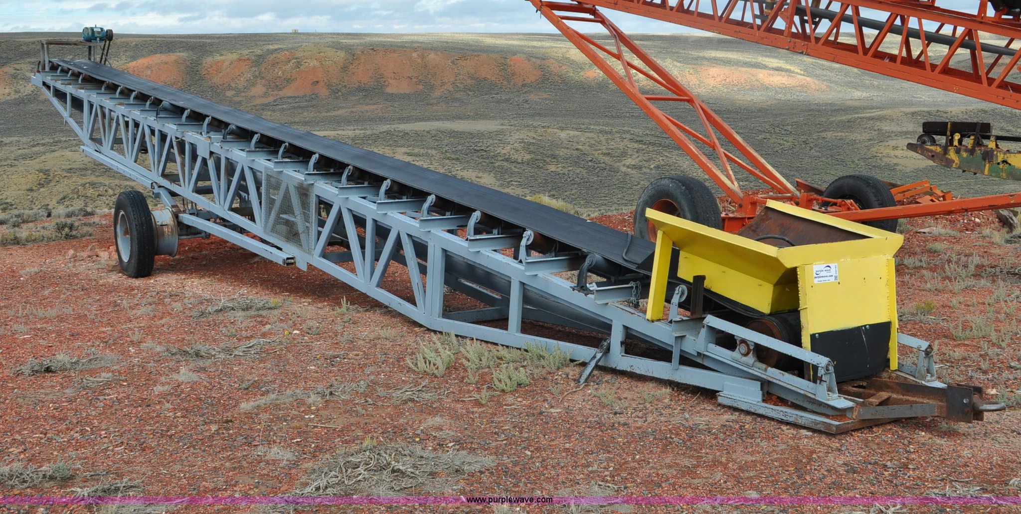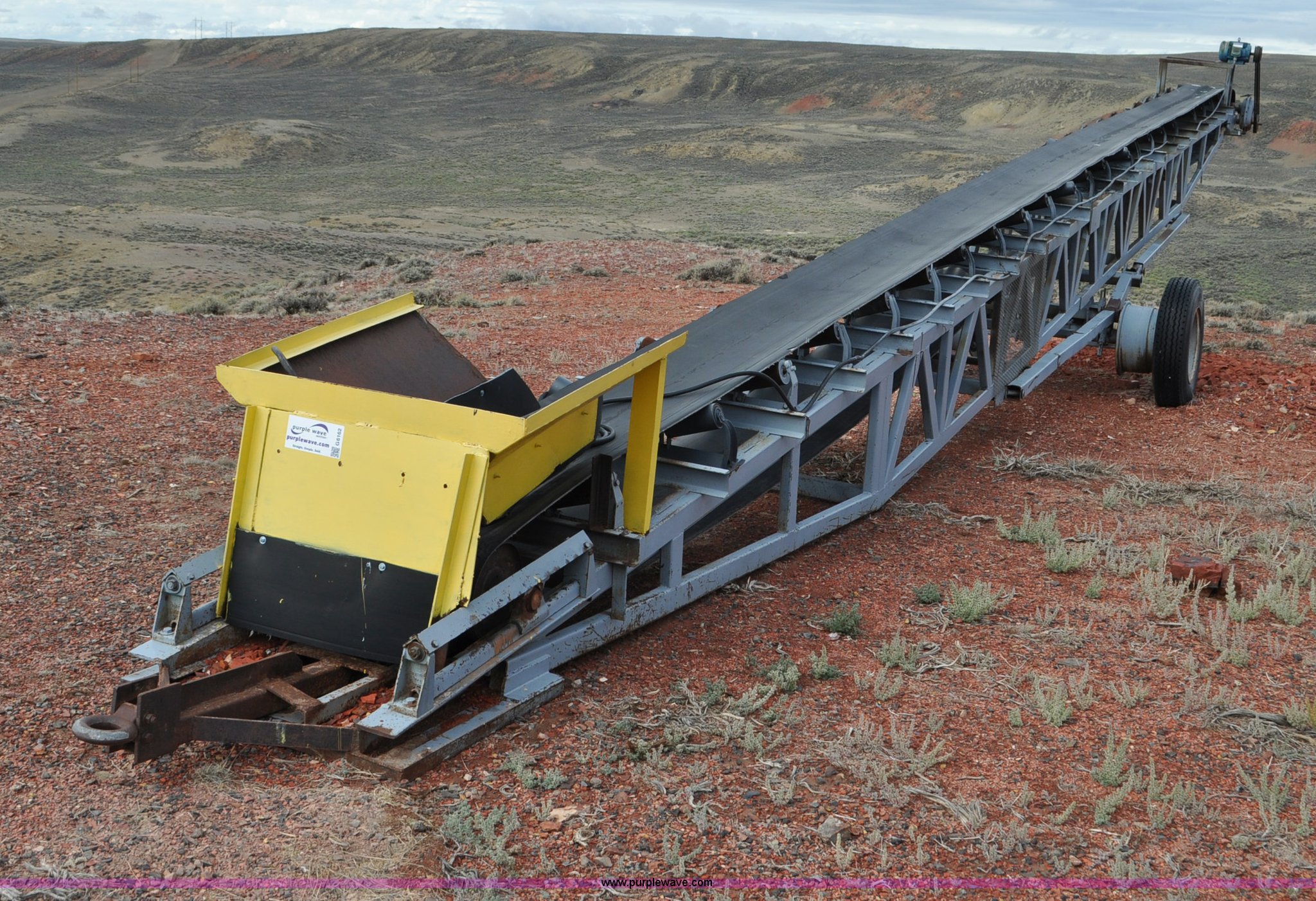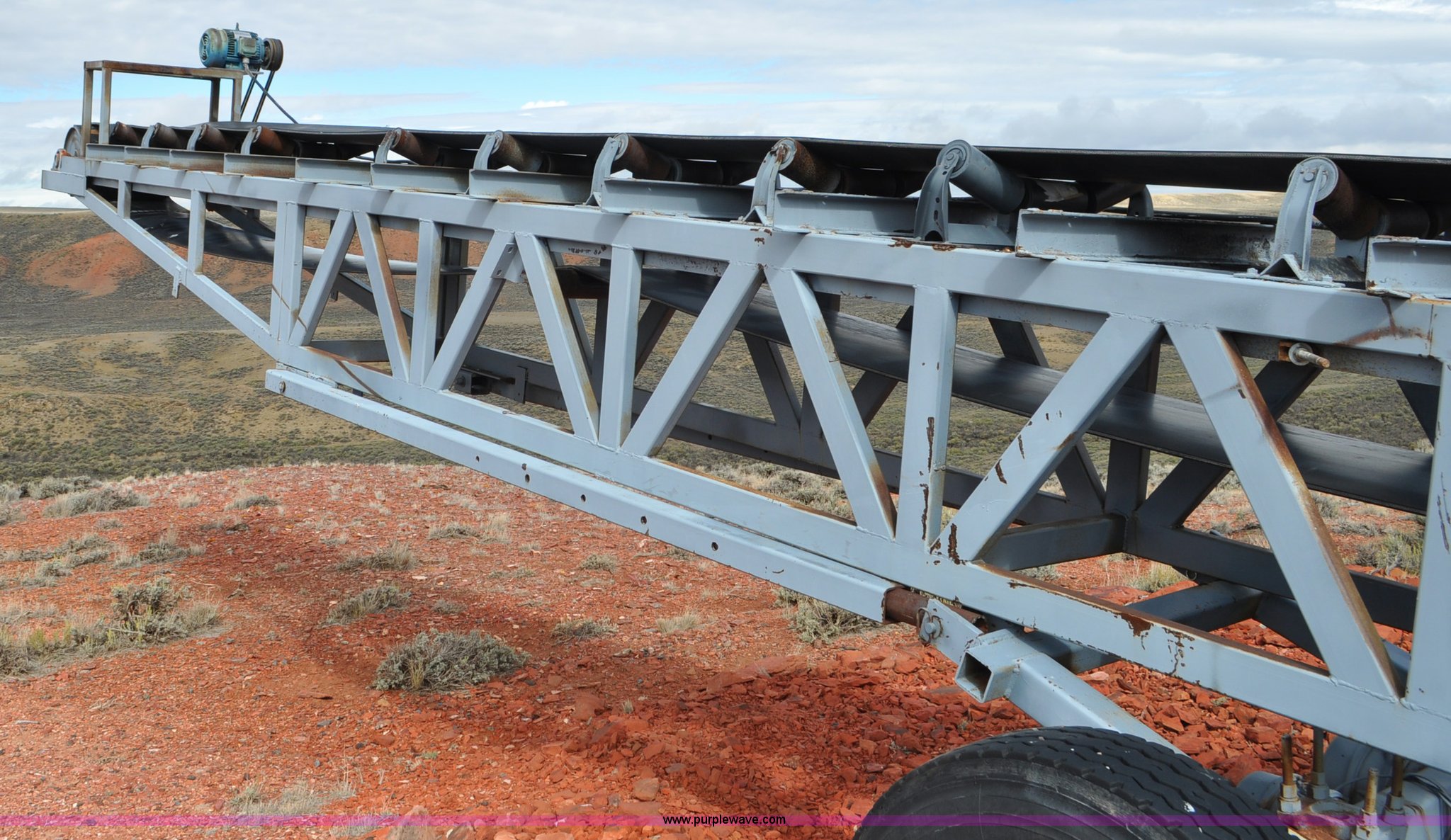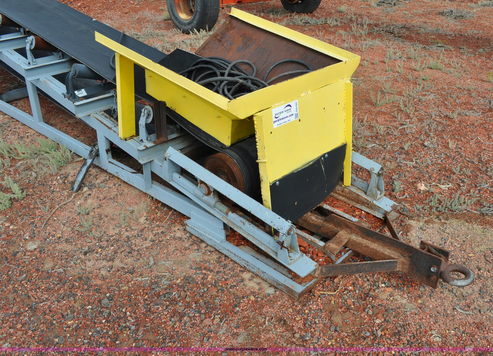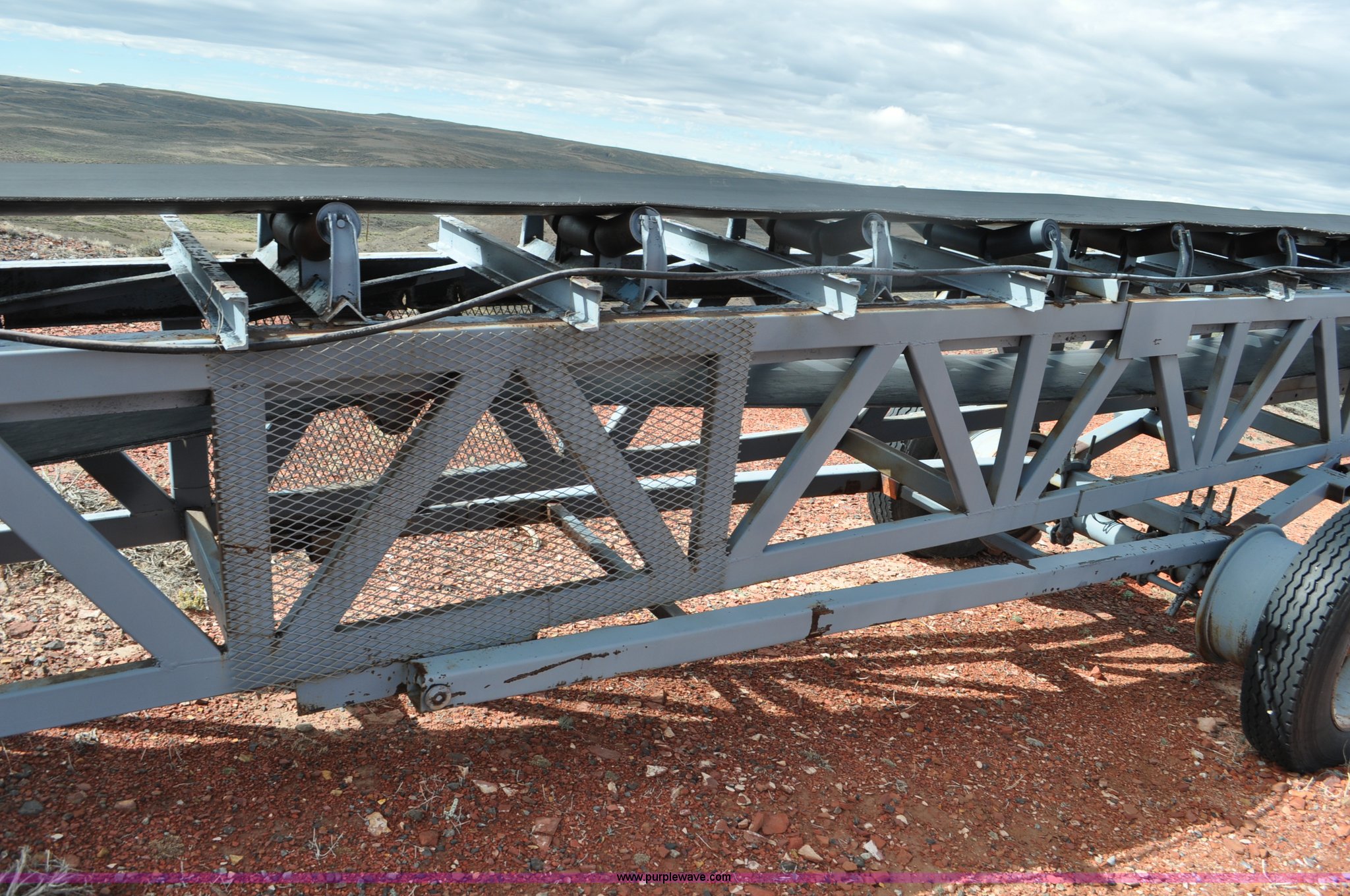 Purple Wave is selling a used Auger or Conveyor in Wyoming. This item is a Stacking conveyor with the following: 63'L, 24" belt, 7.5 HP, Manual lift, Air brakes, Pintle hitch, 10.00R22 tires