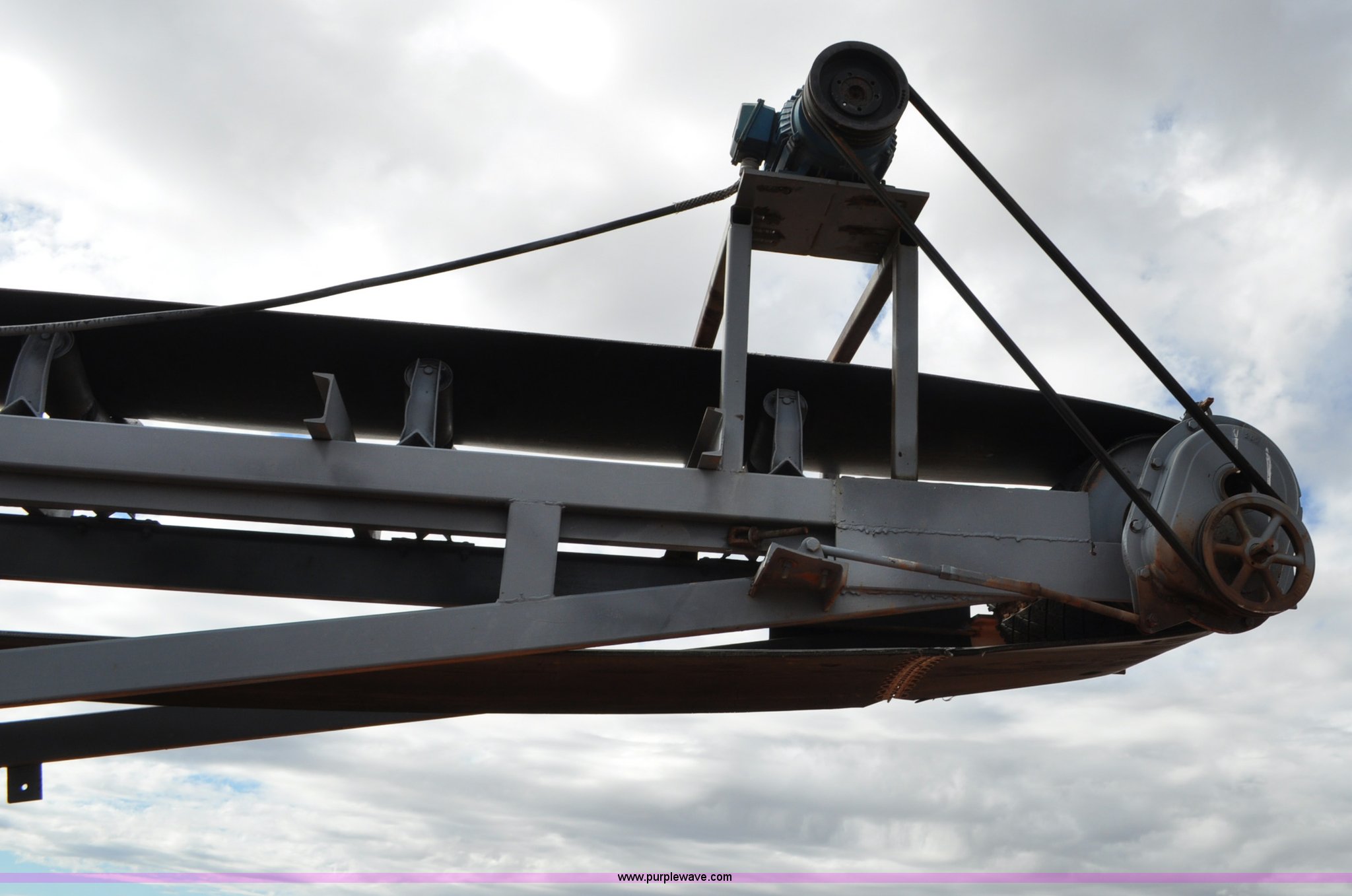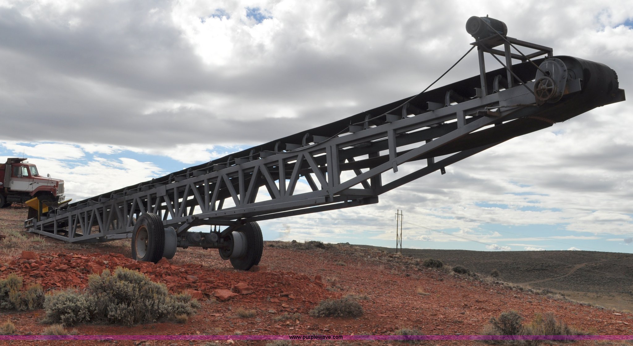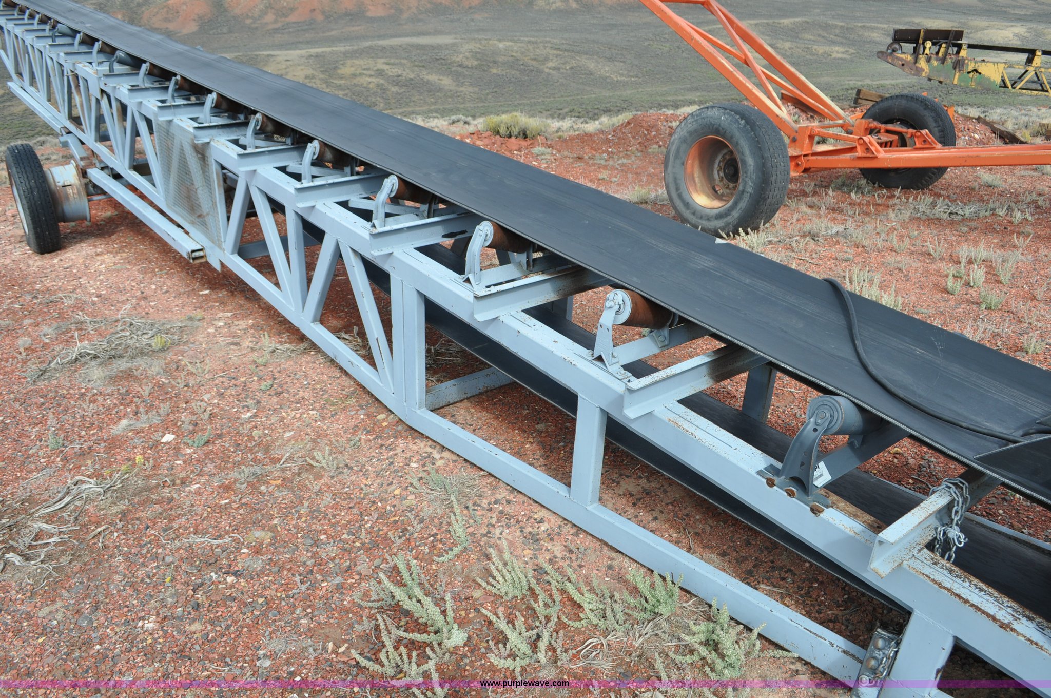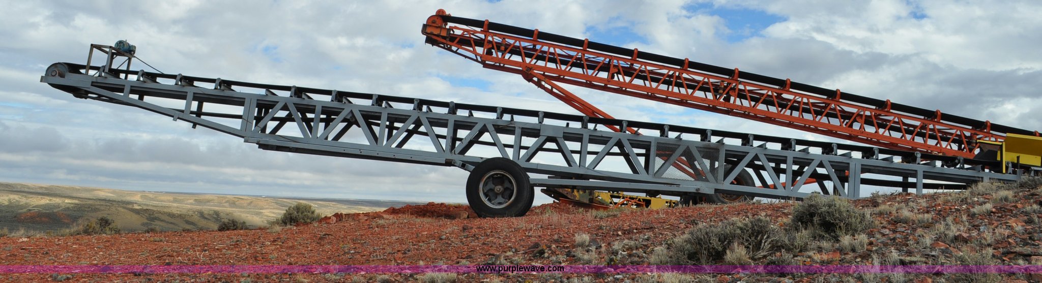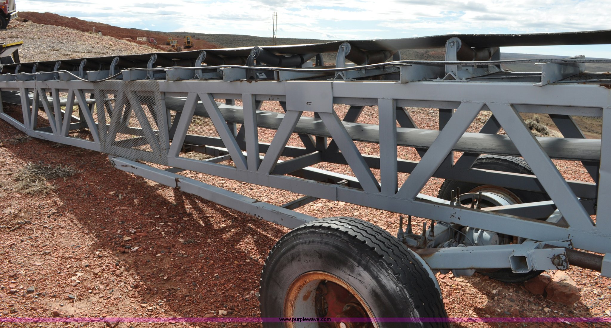 Purple Wave is selling a used Auger or Conveyor in Wyoming. This item is a Stacking conveyor with the following: 63'L, 24" belt, 7.5 HP, Manual lift, Air brakes, Pintle hitch, 10.00R22 tires