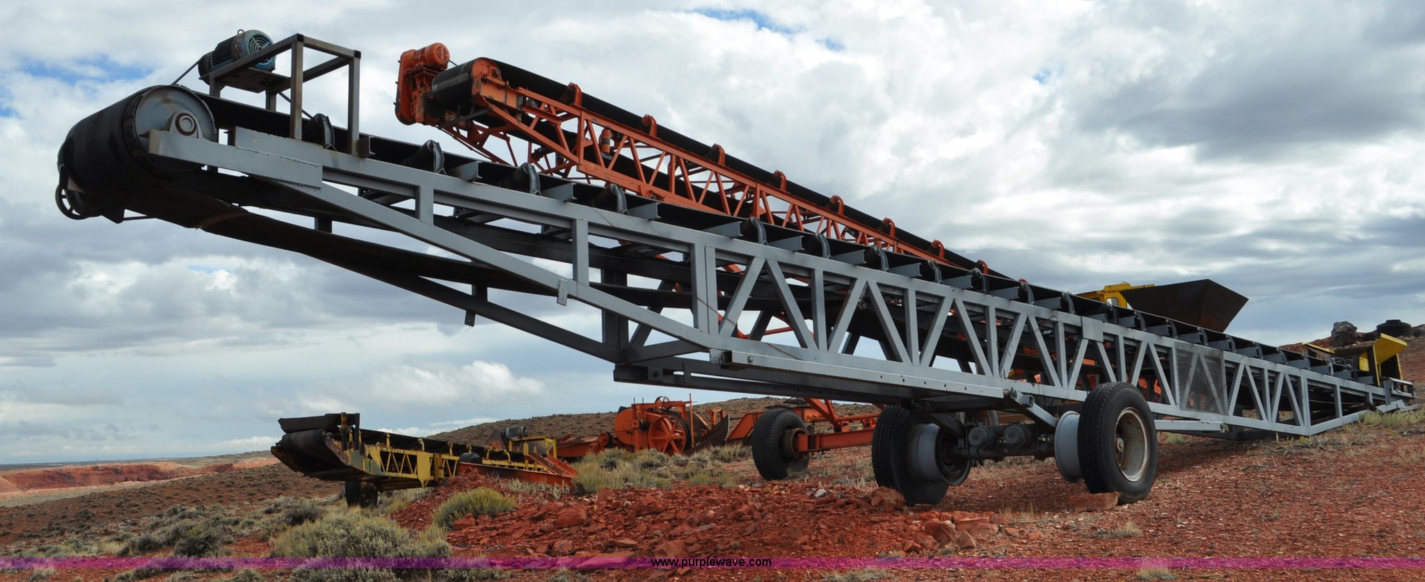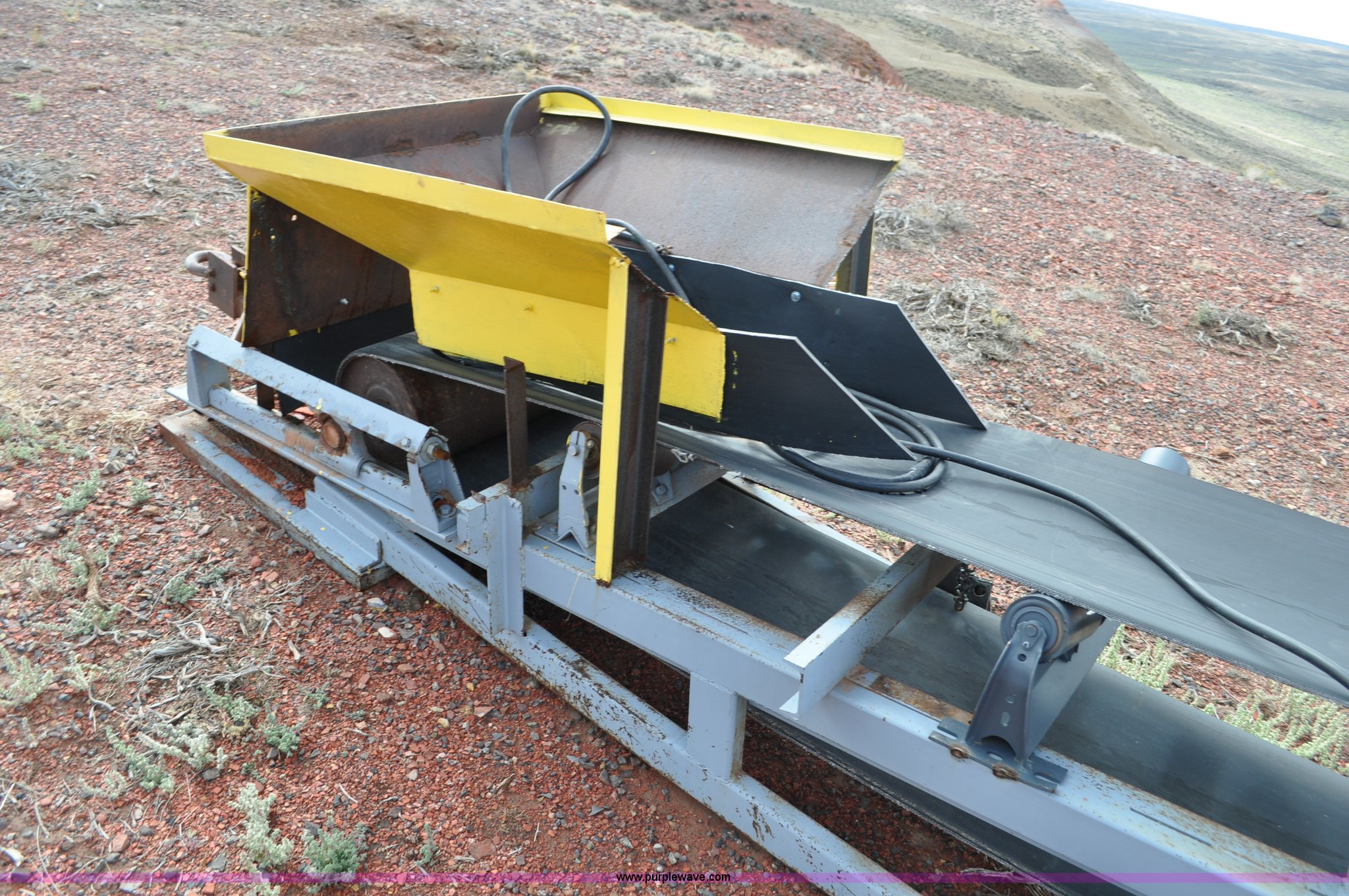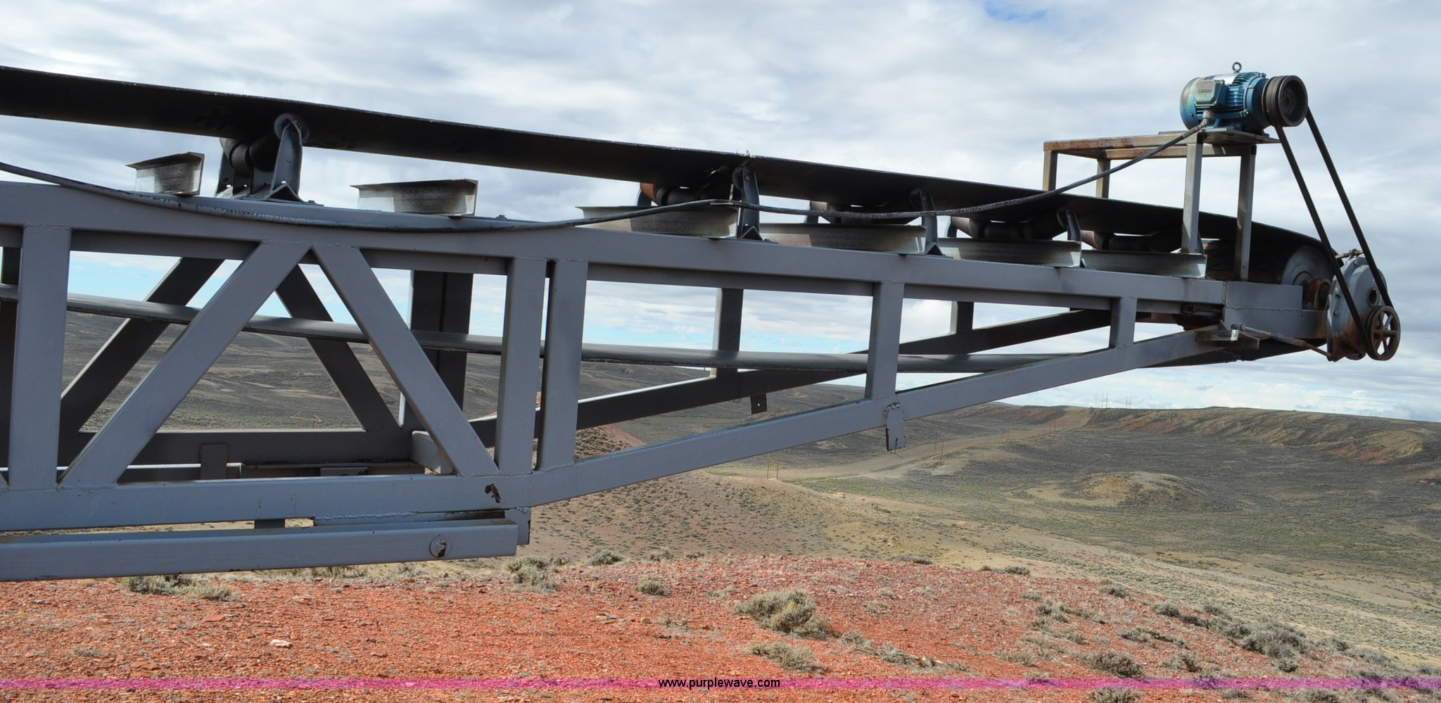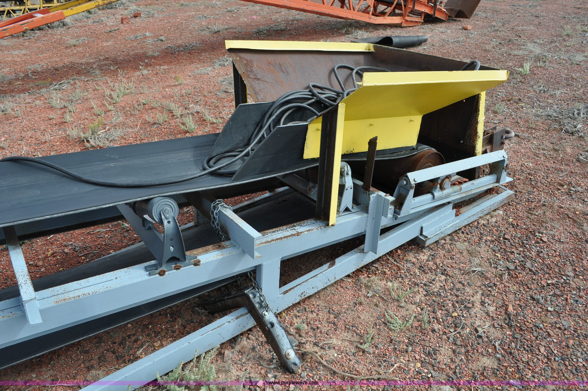 Purple Wave is selling a used Auger or Conveyor in Wyoming. This item is a Stacking conveyor with the following: 63'L, 24" belt, 7.5 HP, Manual lift, Air brakes, Pintle hitch, 10.00R22 tires