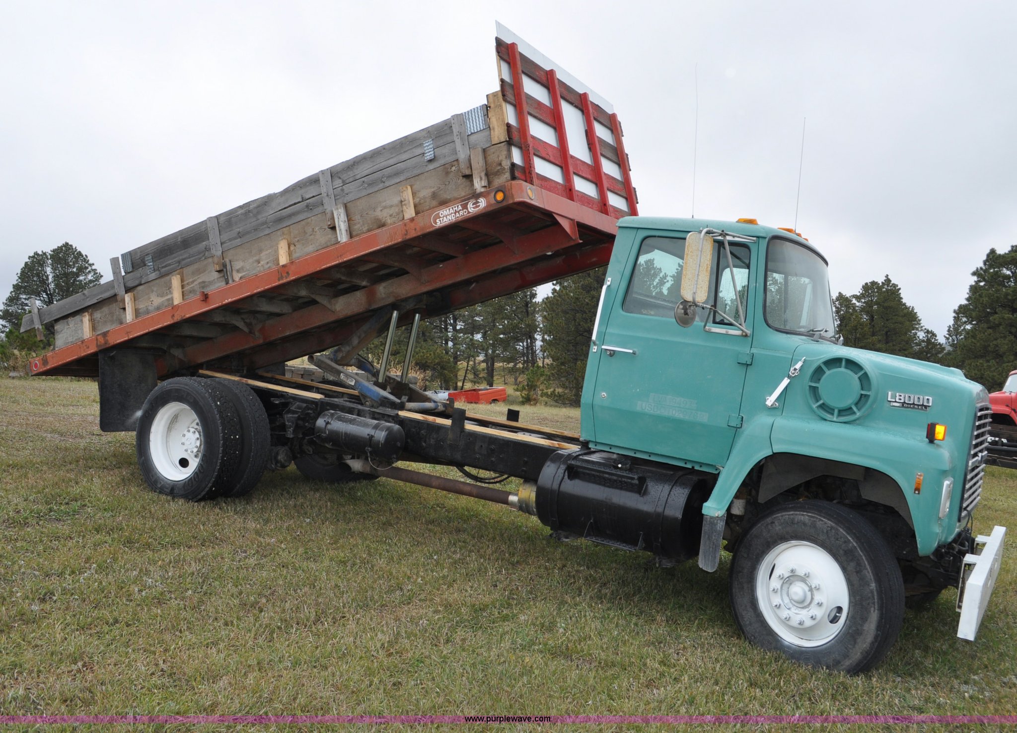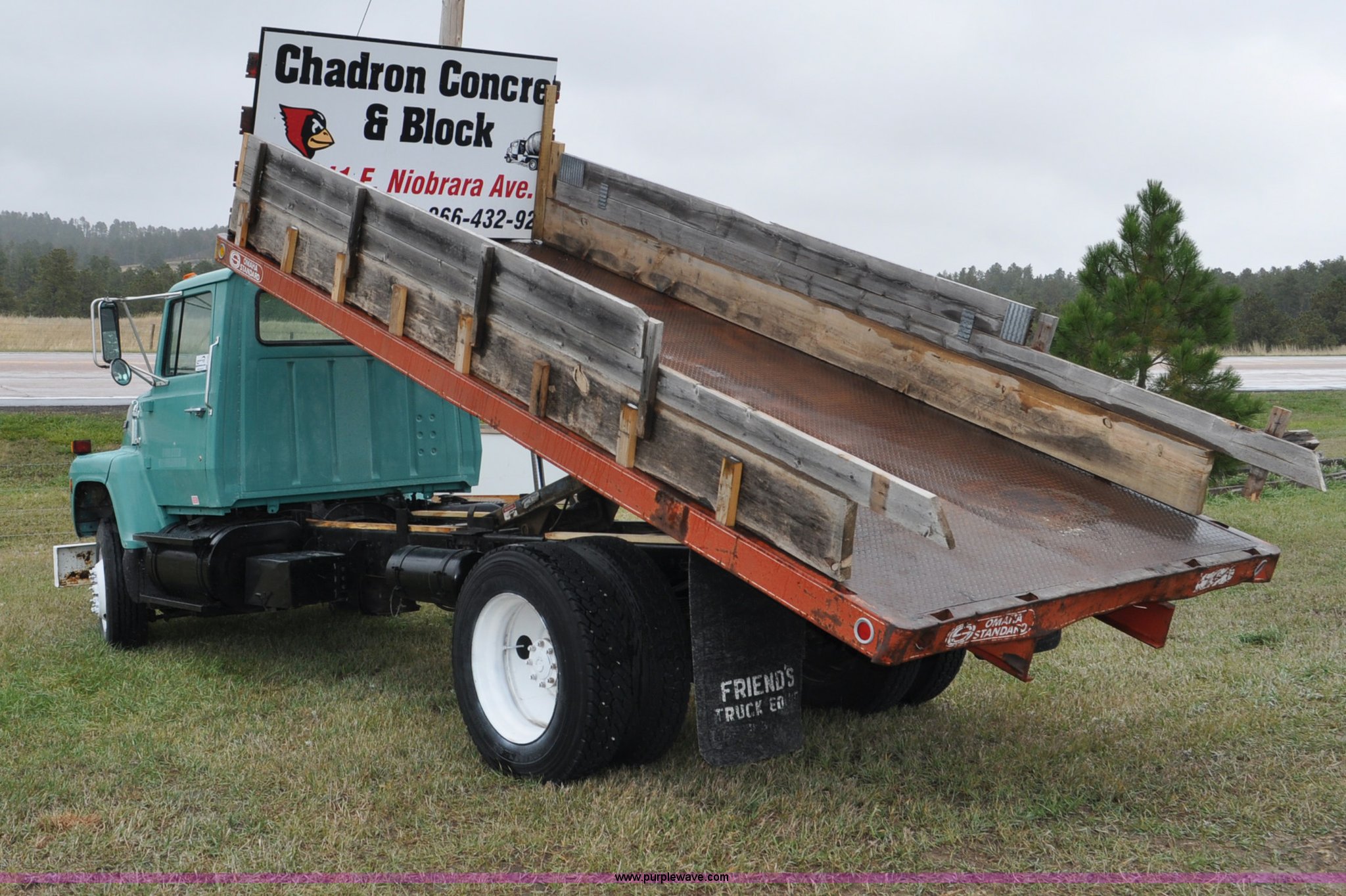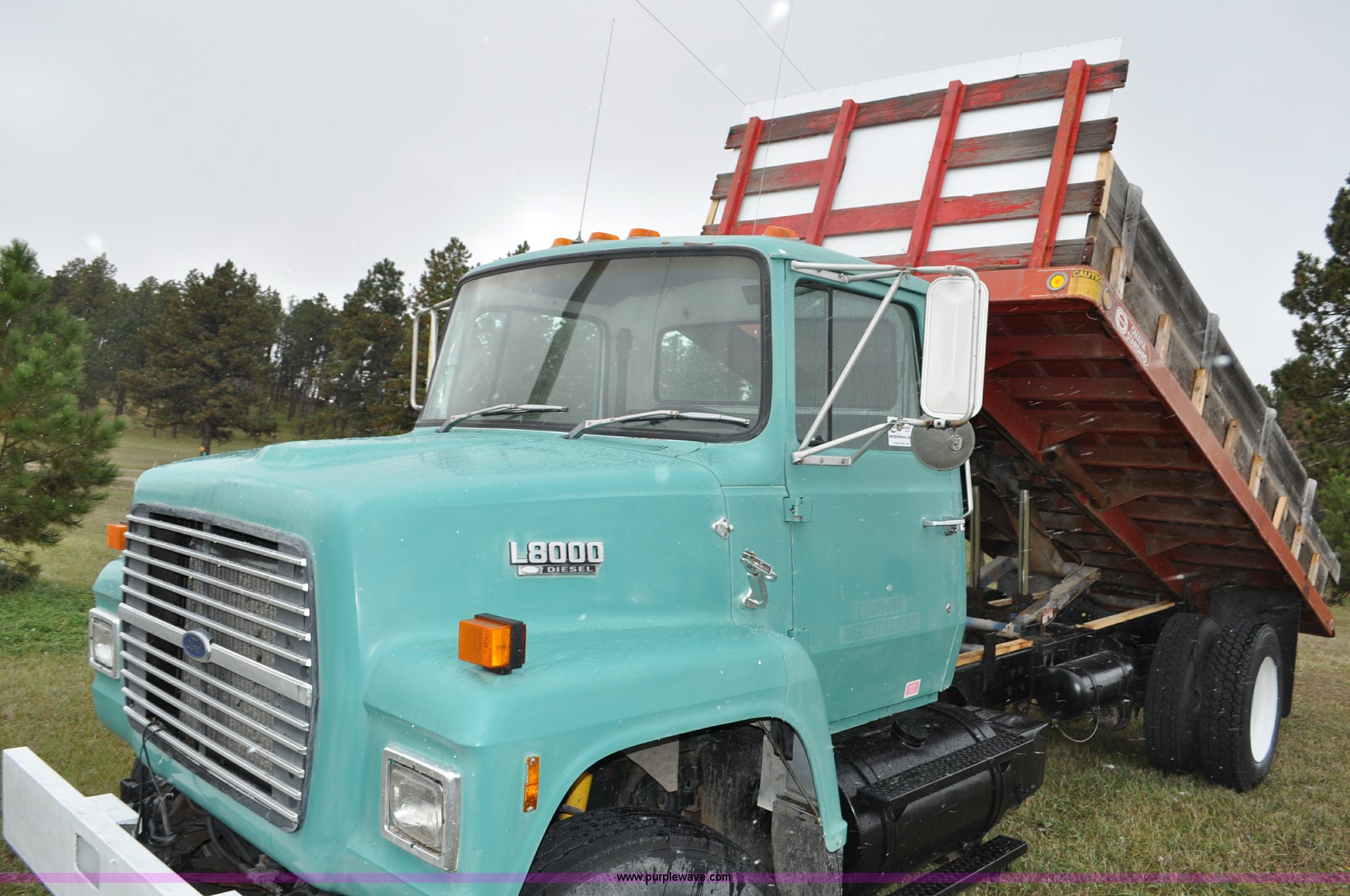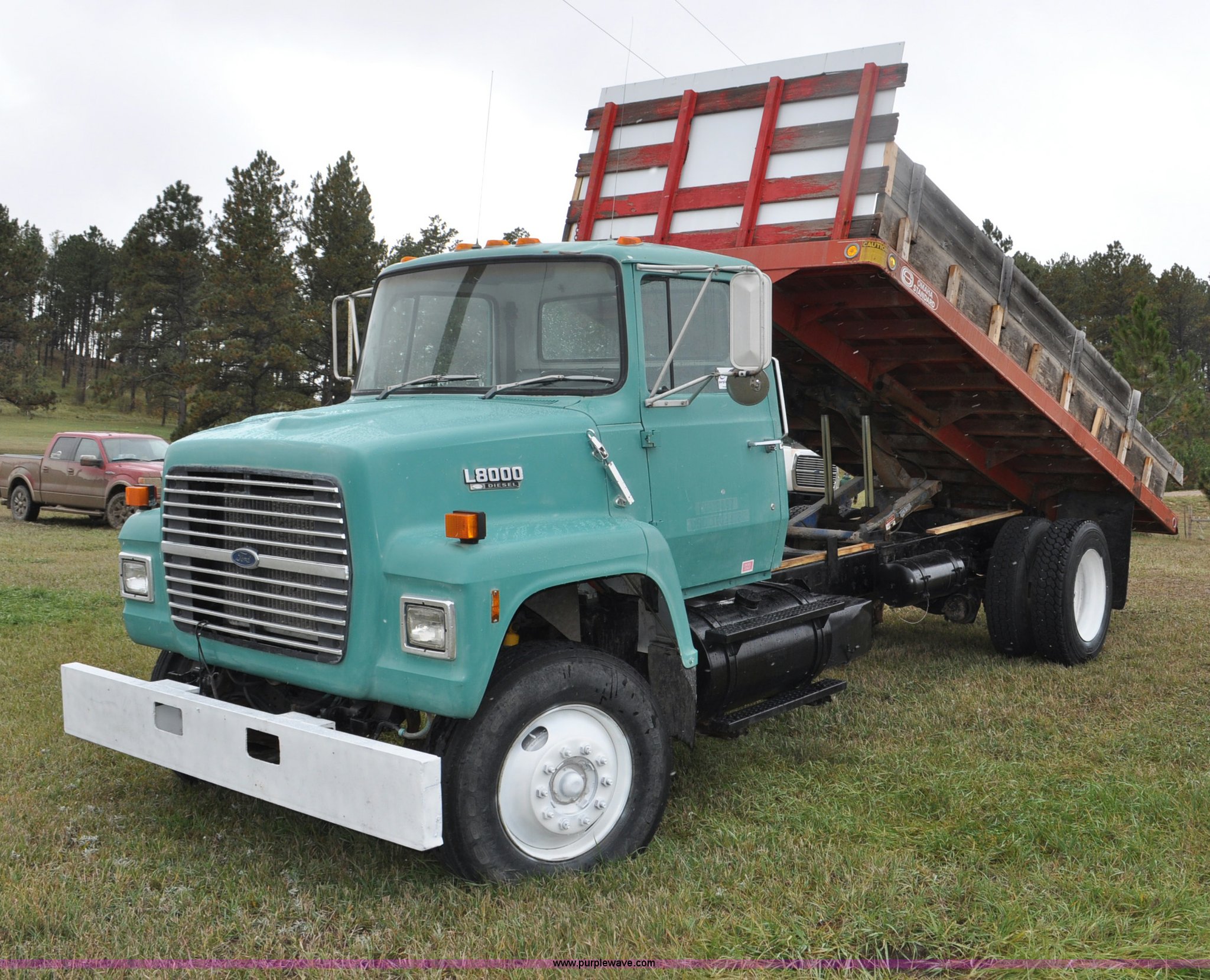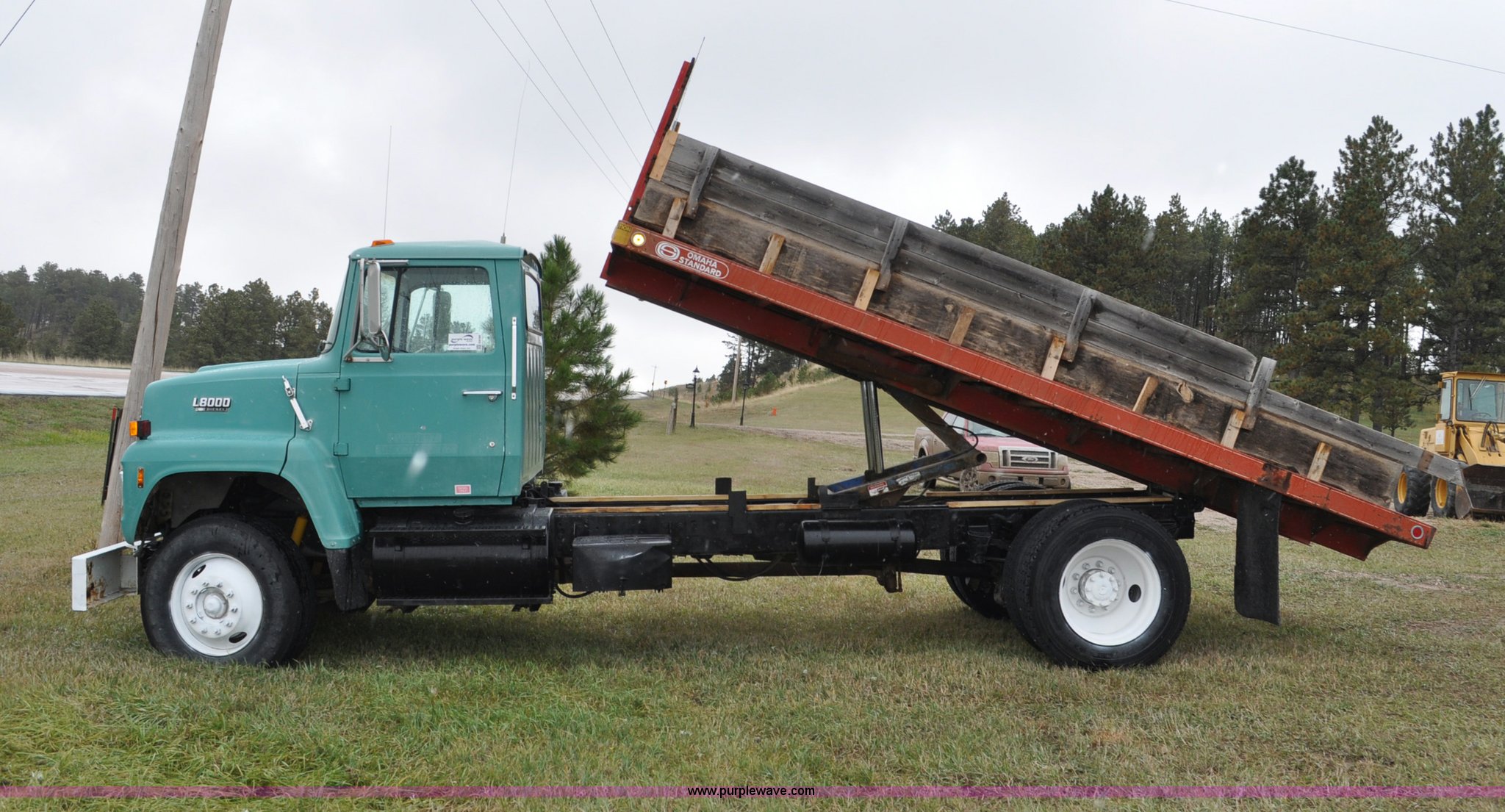 Purple Wave is selling a used Flat Bed Truck in Nebraska. This item is a 1990 Ford L8000 dump bed truck with the following: 148,955 miles on odometer, Ford 7.8L six cylinder turbo diesel engine, Six speed manual transmission, AC and heat, AM/FM, Manual windows and locks, Omaha 18'L bed, Wood side boards, Steel floor, Harsh R-105 twin cylinder hoist, Dual 75 gallon fuel tanks, Air brakes, 275/80R24.5 tires, Back edge of cab dented