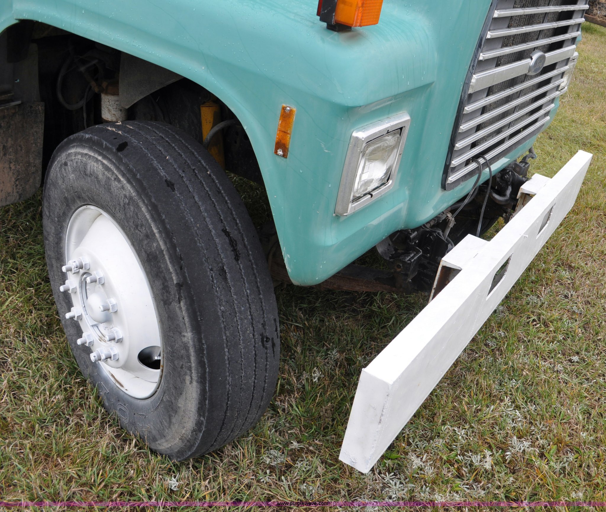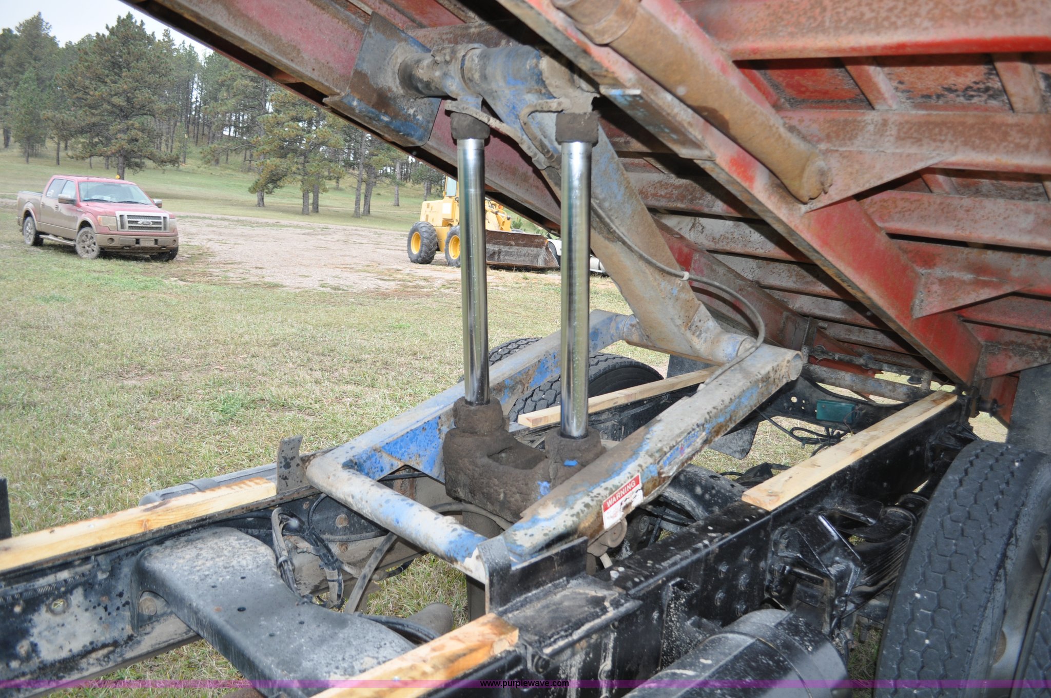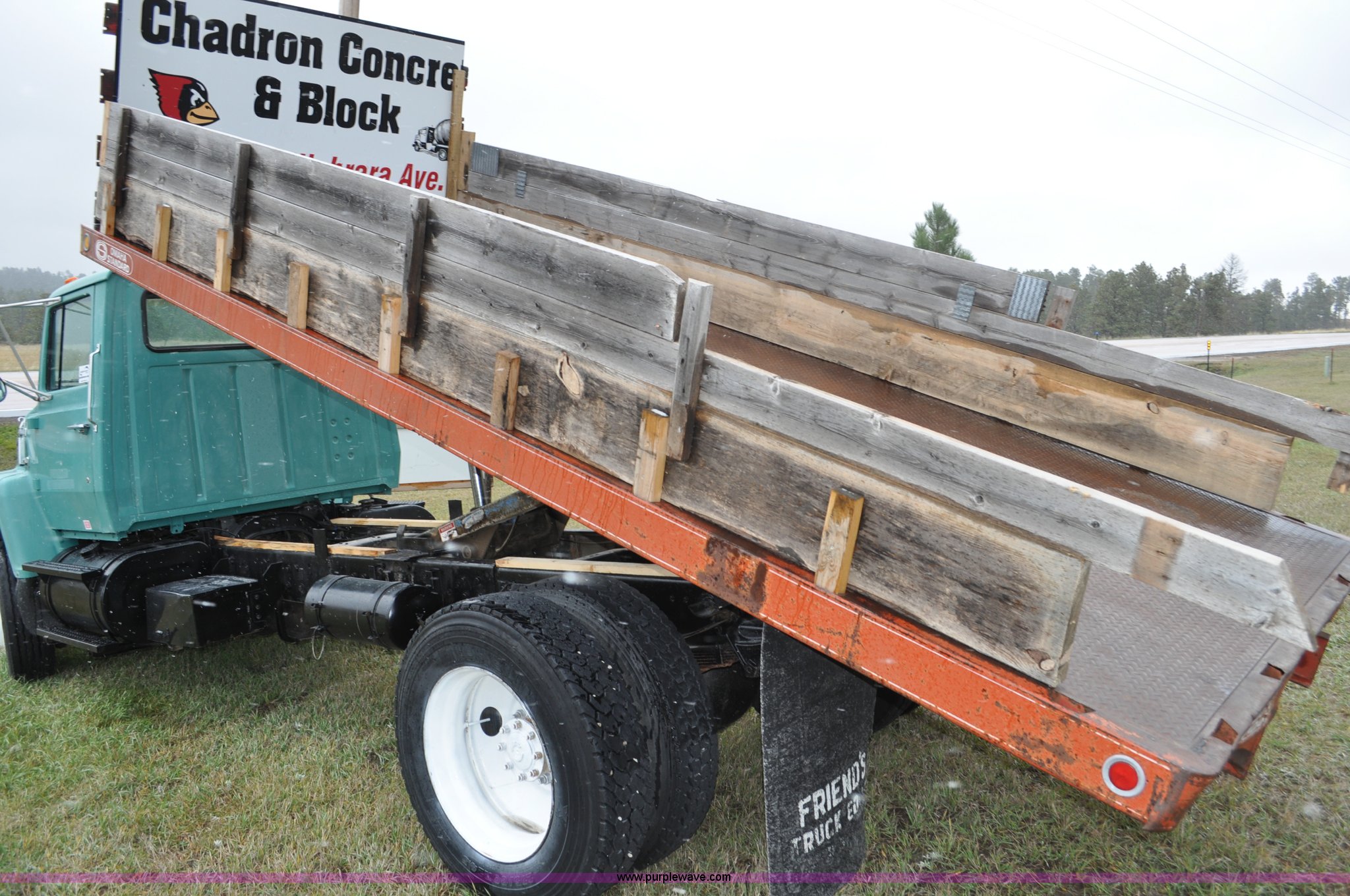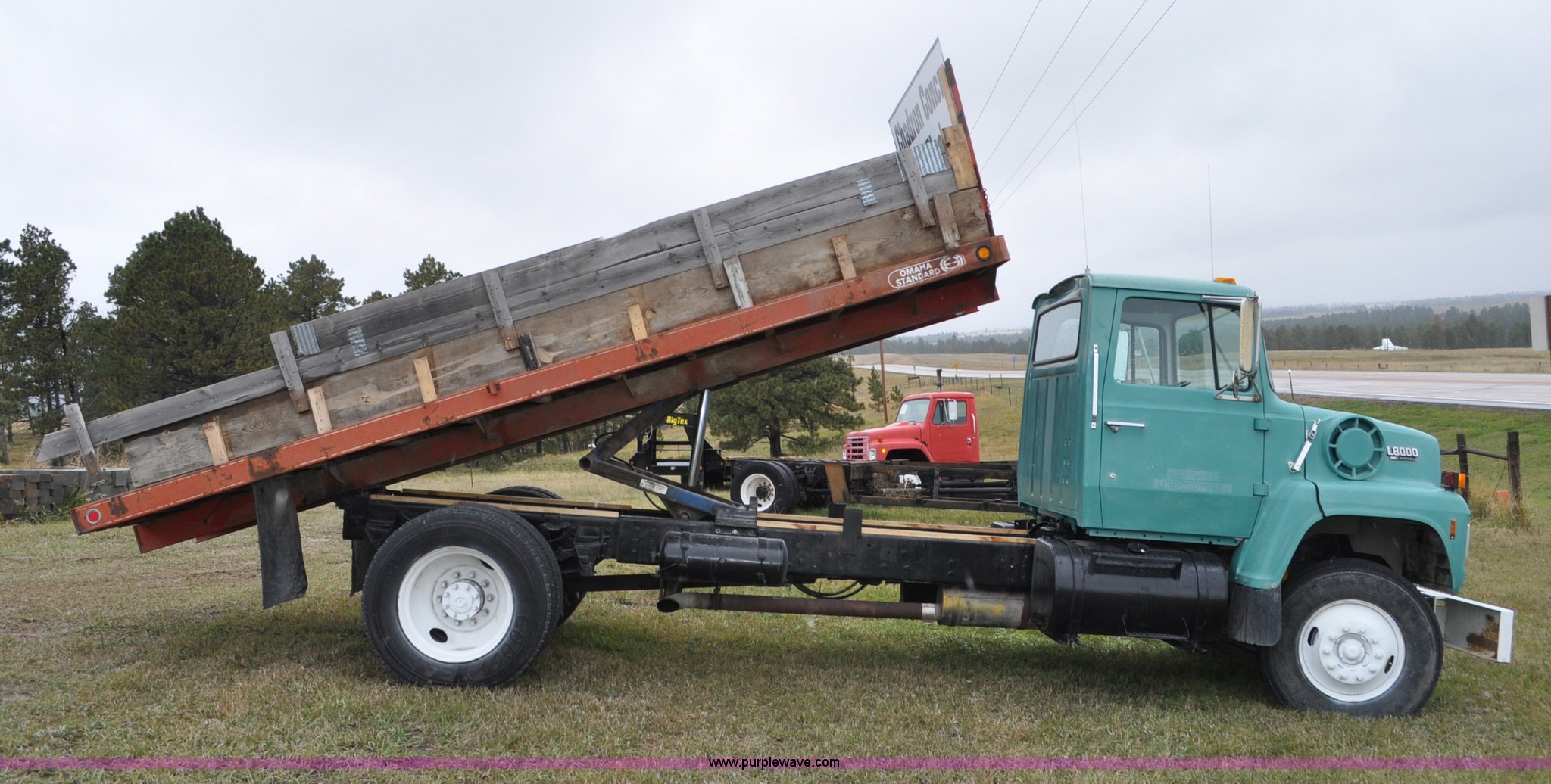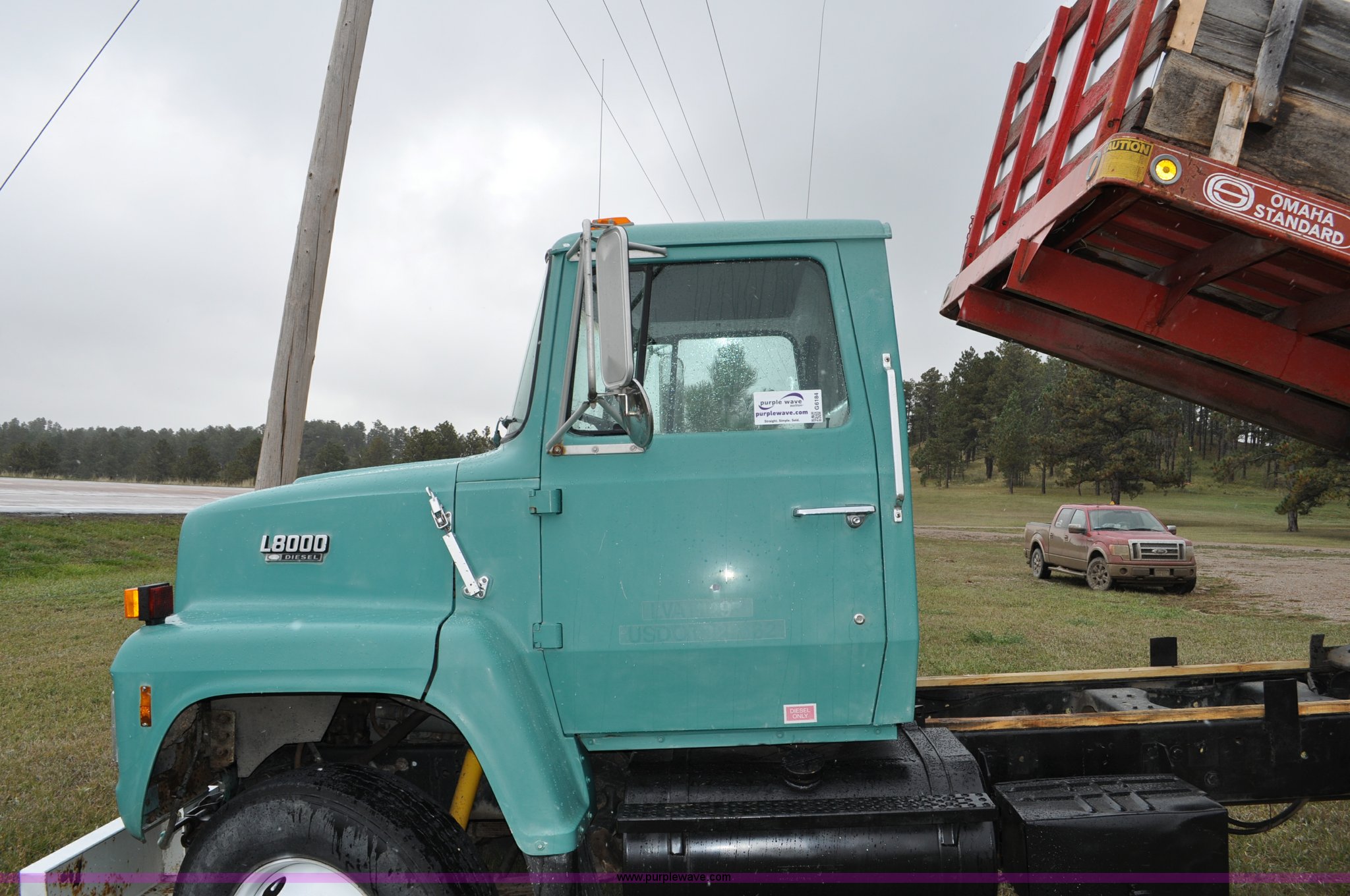 Purple Wave is selling a used Flat Bed Truck in Nebraska. This item is a 1990 Ford L8000 dump bed truck with the following: 148,955 miles on odometer, Ford 7.8L six cylinder turbo diesel engine, Six speed manual transmission, AC and heat, AM/FM, Manual windows and locks, Omaha 18'L bed, Wood side boards, Steel floor, Harsh R-105 twin cylinder hoist, Dual 75 gallon fuel tanks, Air brakes, 275/80R24.5 tires, Back edge of cab dented