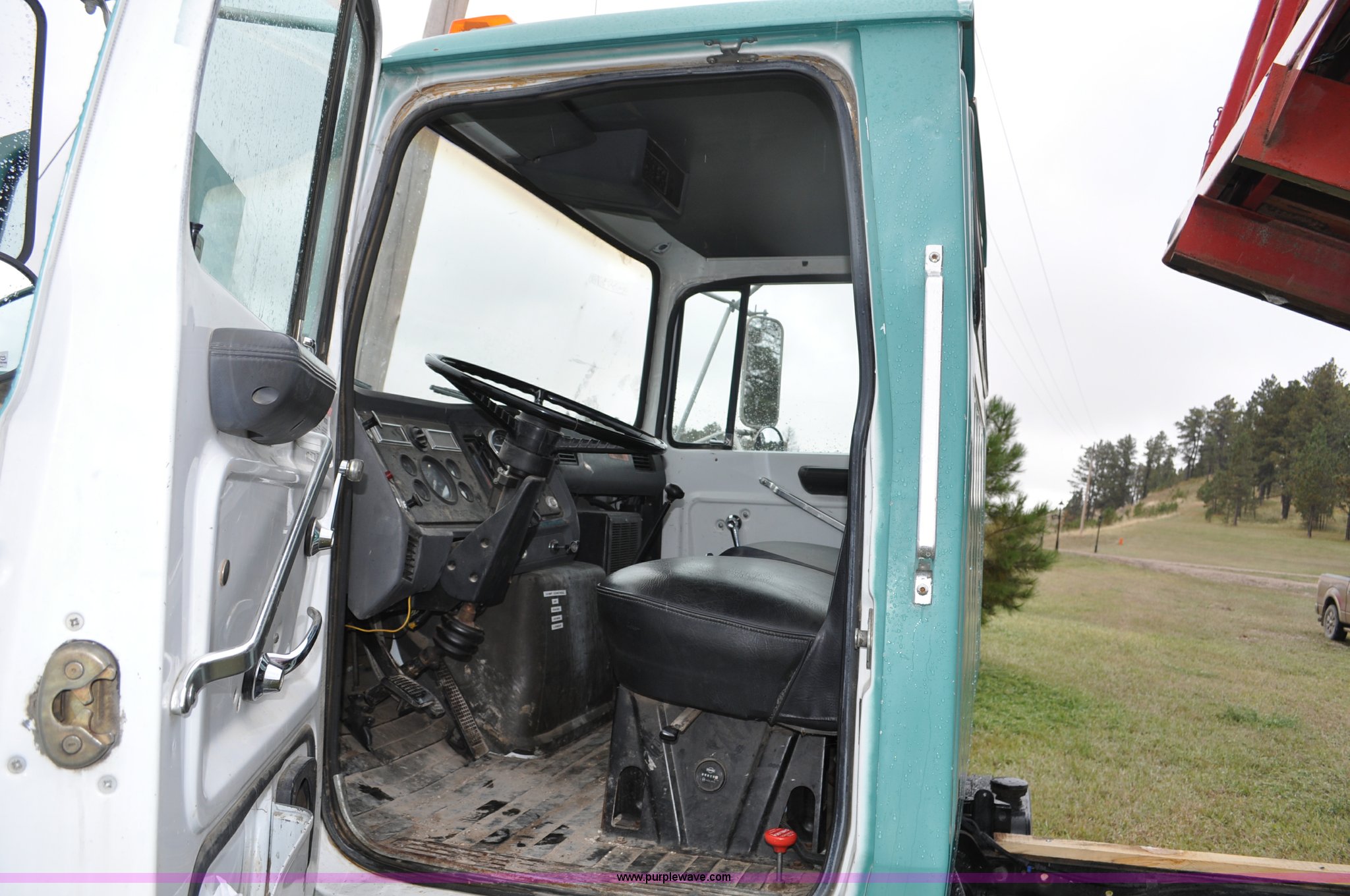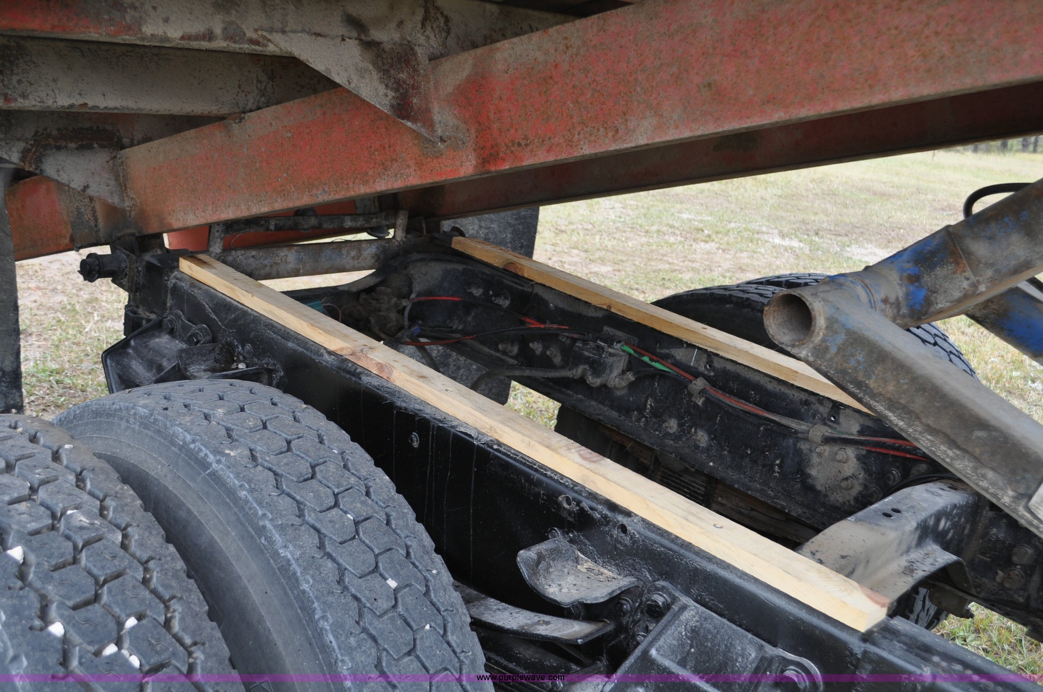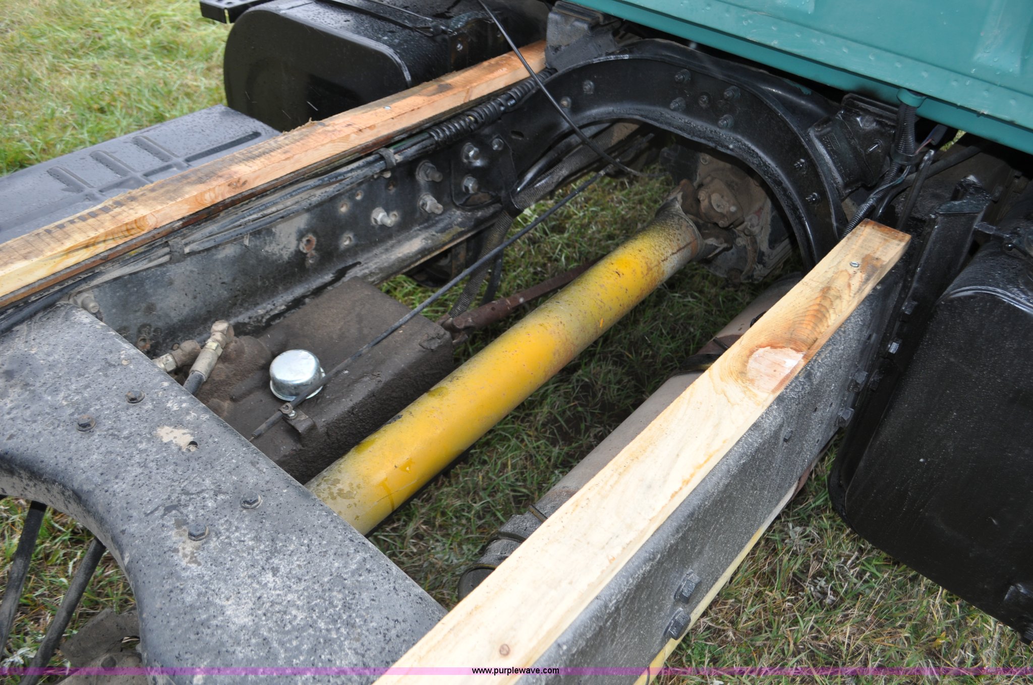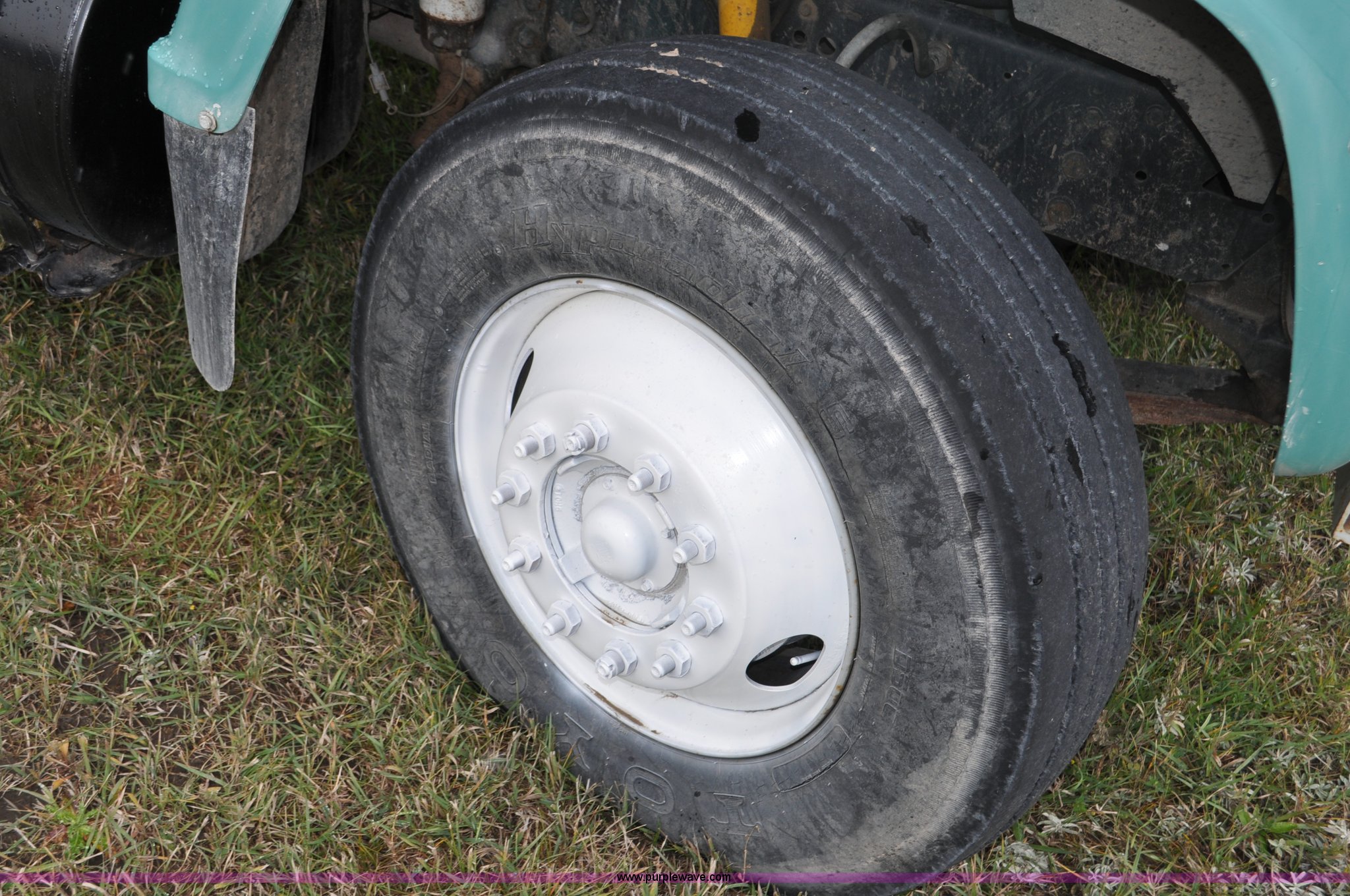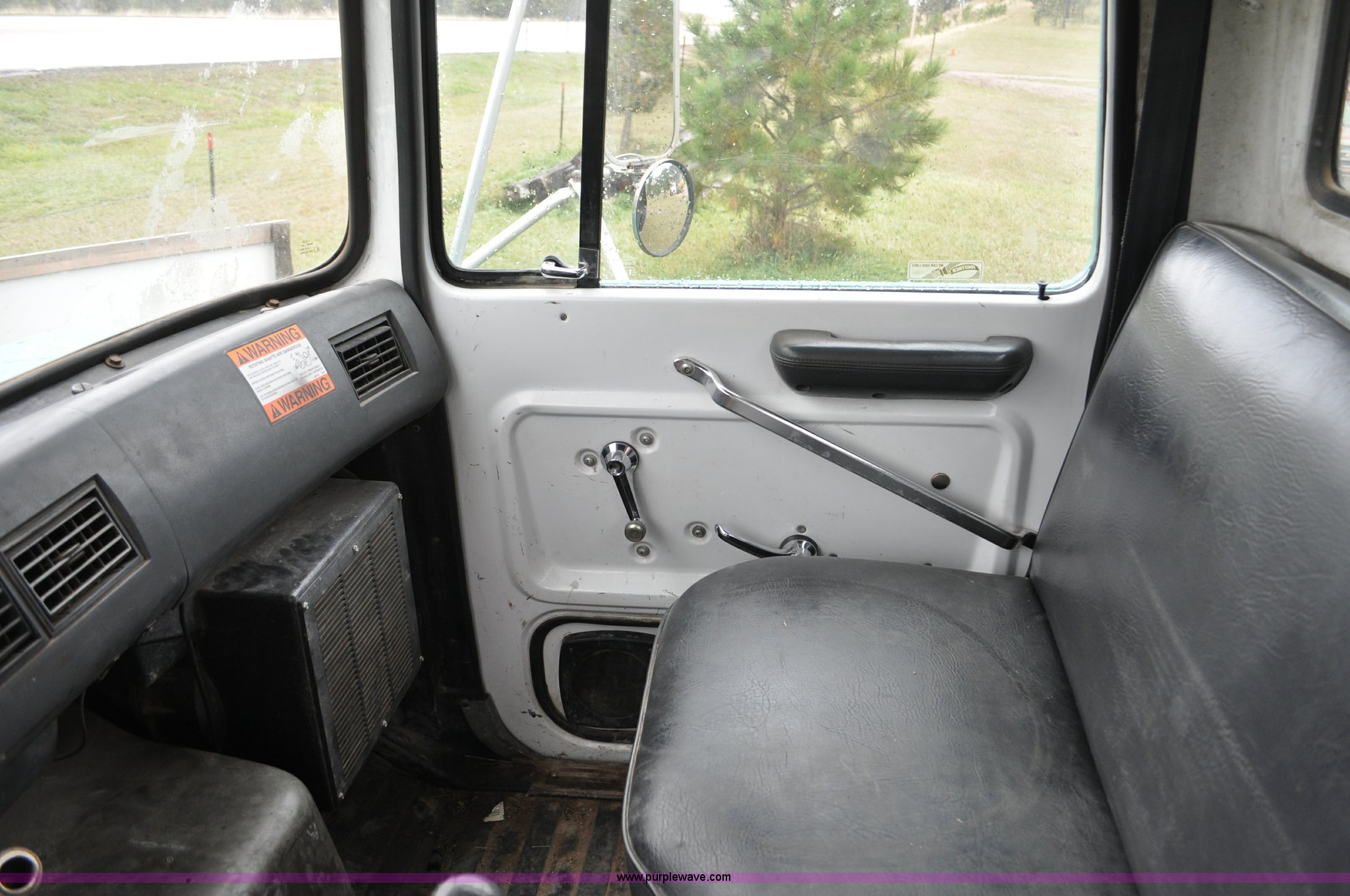Purple Wave is selling a used Flat Bed Truck in Nebraska. This item is a 1990 Ford L8000 dump bed truck with the following: 148,955 miles on odometer, Ford 7.8L six cylinder turbo diesel engine, Six speed manual transmission, AC and heat, AM/FM, Manual windows and locks, Omaha 18'L bed, Wood side boards, Steel floor, Harsh R-105 twin cylinder hoist, Dual 75 gallon fuel tanks, Air brakes, 275/80R24.5 tires, Back edge of cab dented