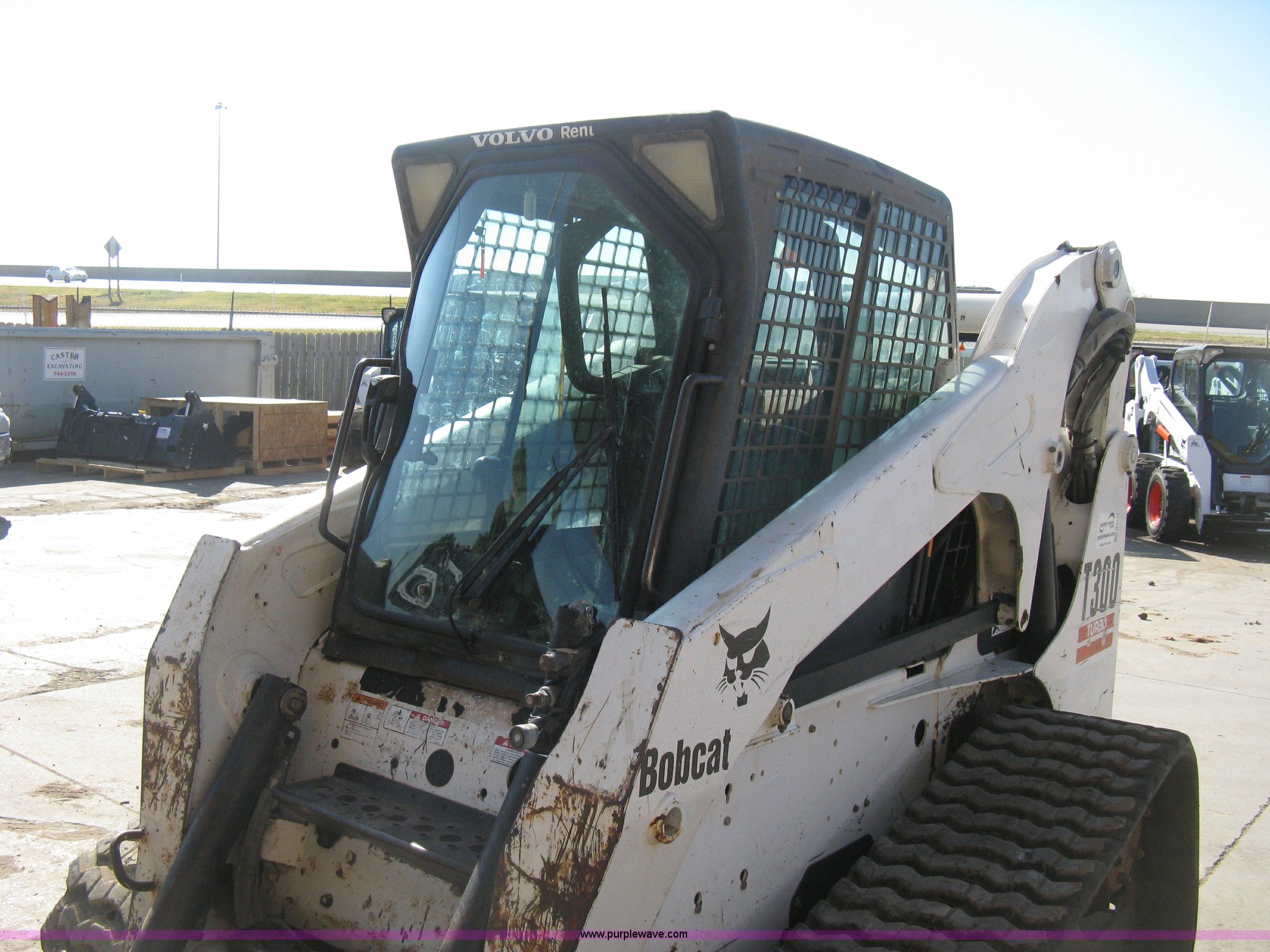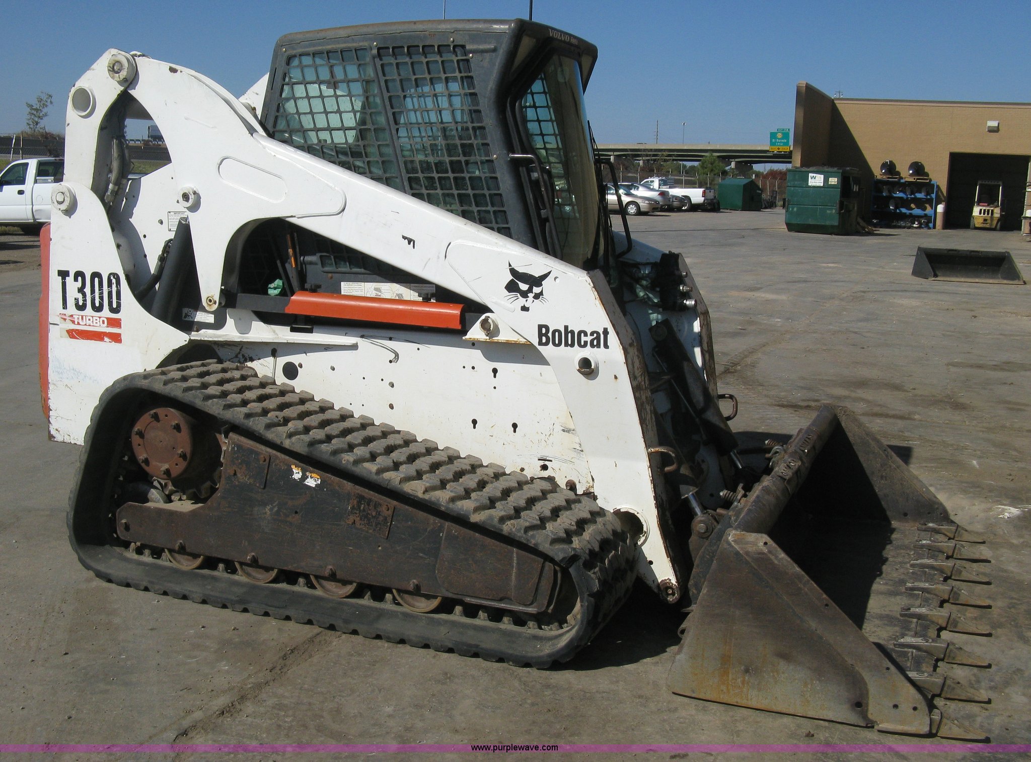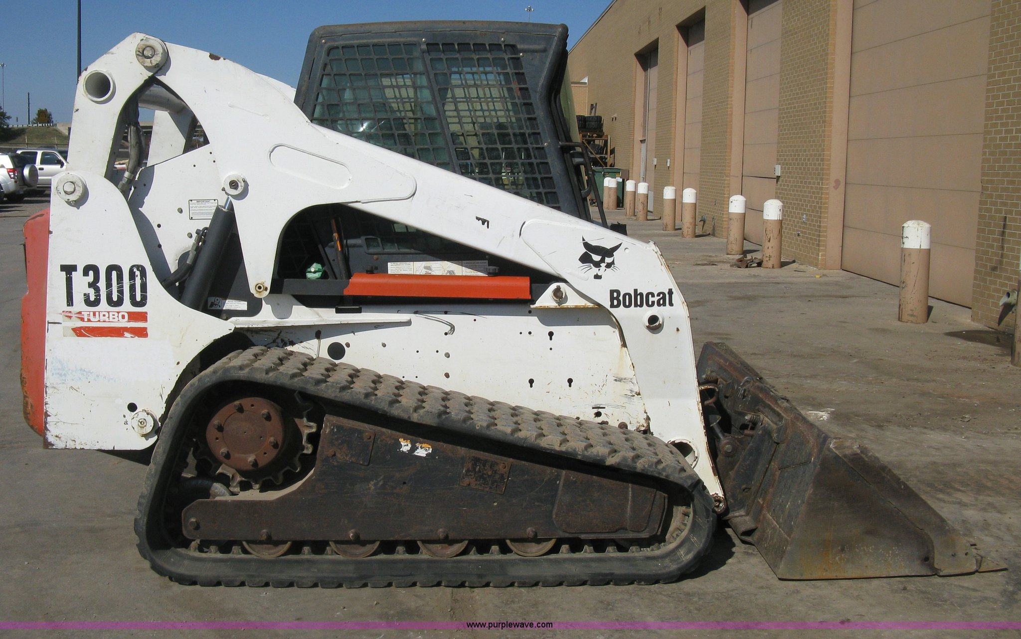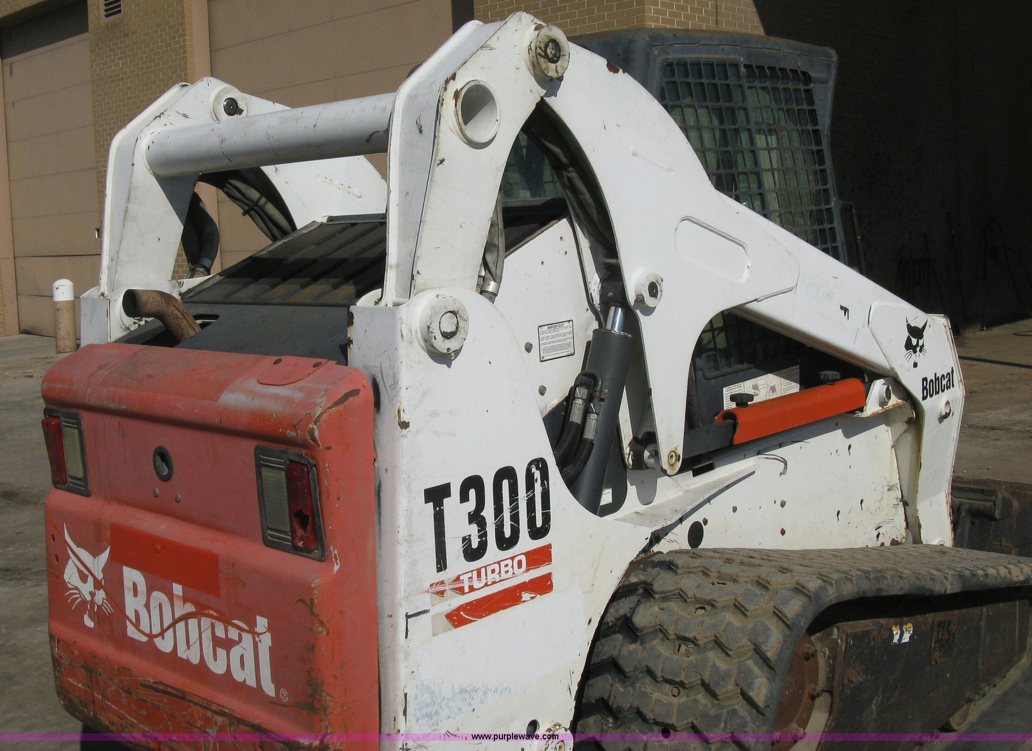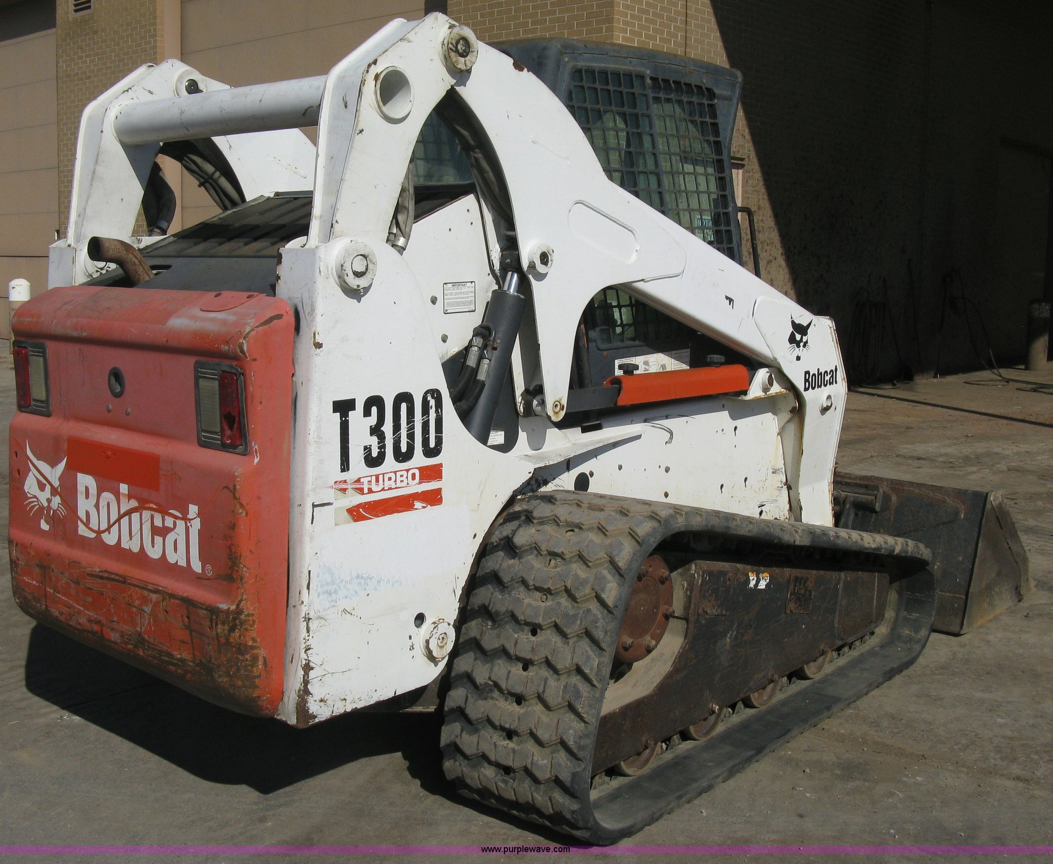 Purple Wave is selling a used Tracked Skid Steer Loader in Kansas. This item is a 2004 Bobcat T300 Turbo track skid steer with the following: 2,527 hours on meter, Kubota V3300-T four cylinder diesel engine, Traction lock override, Enclosed cab, Heat, Suspension seat, Sliding side windows, Foot pedal and hand loader control, High Flow auxiliary hydraulics, 78" toothed bucket, (8) bolt-on teeth, Quick attach, 17.5" rubber tracks, 9,702 lbs. base operating weight, Broken taillight, After-market tracks and sprockets replaced in December 2012, Injection pump, injectors, lift pump, fuel lines, and fuel tank replaced in August 2013, Serial 525412082