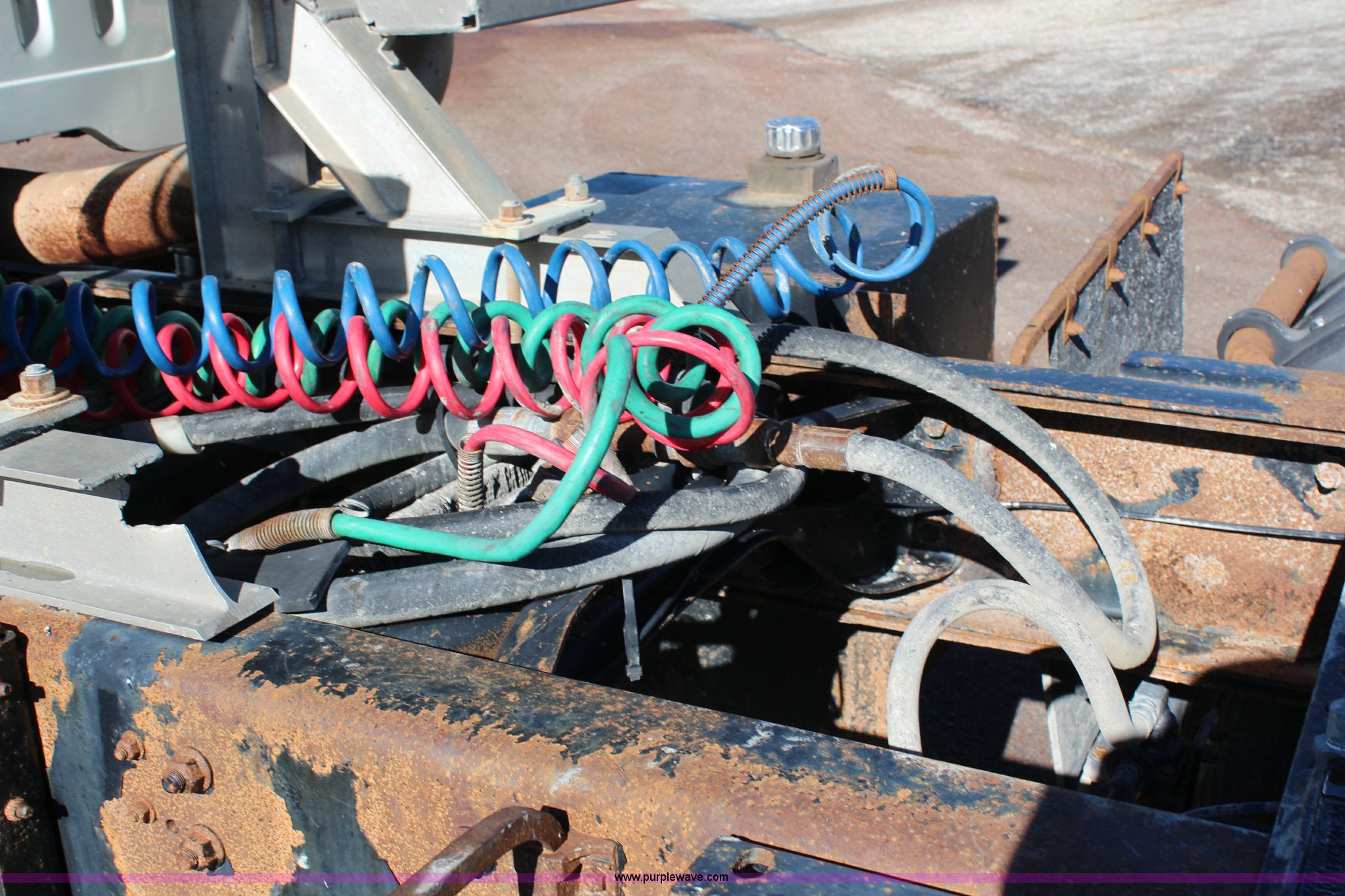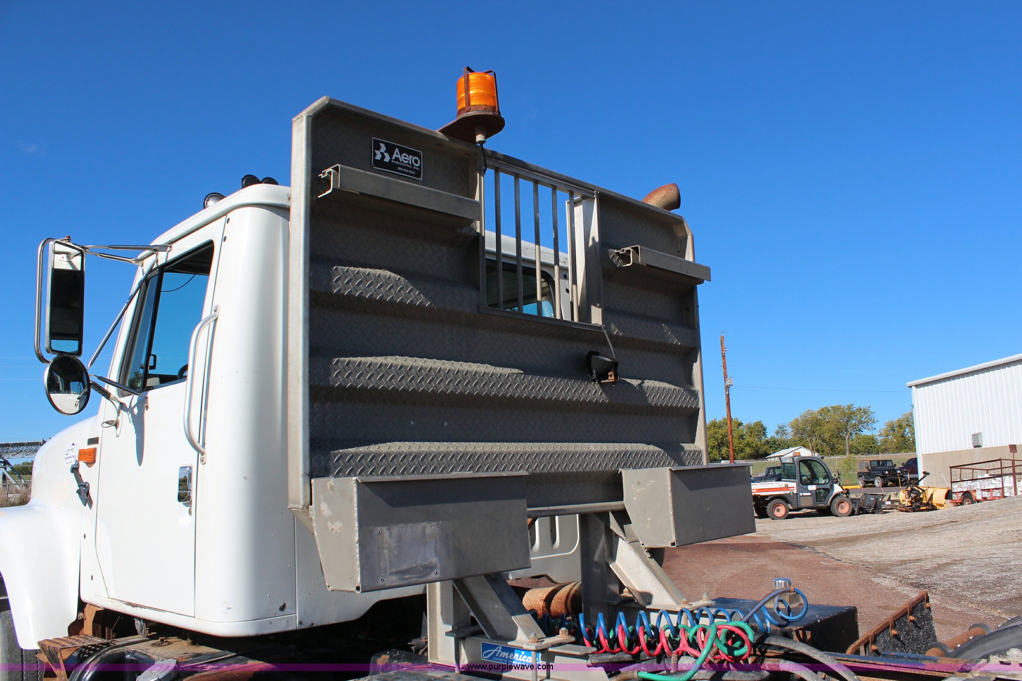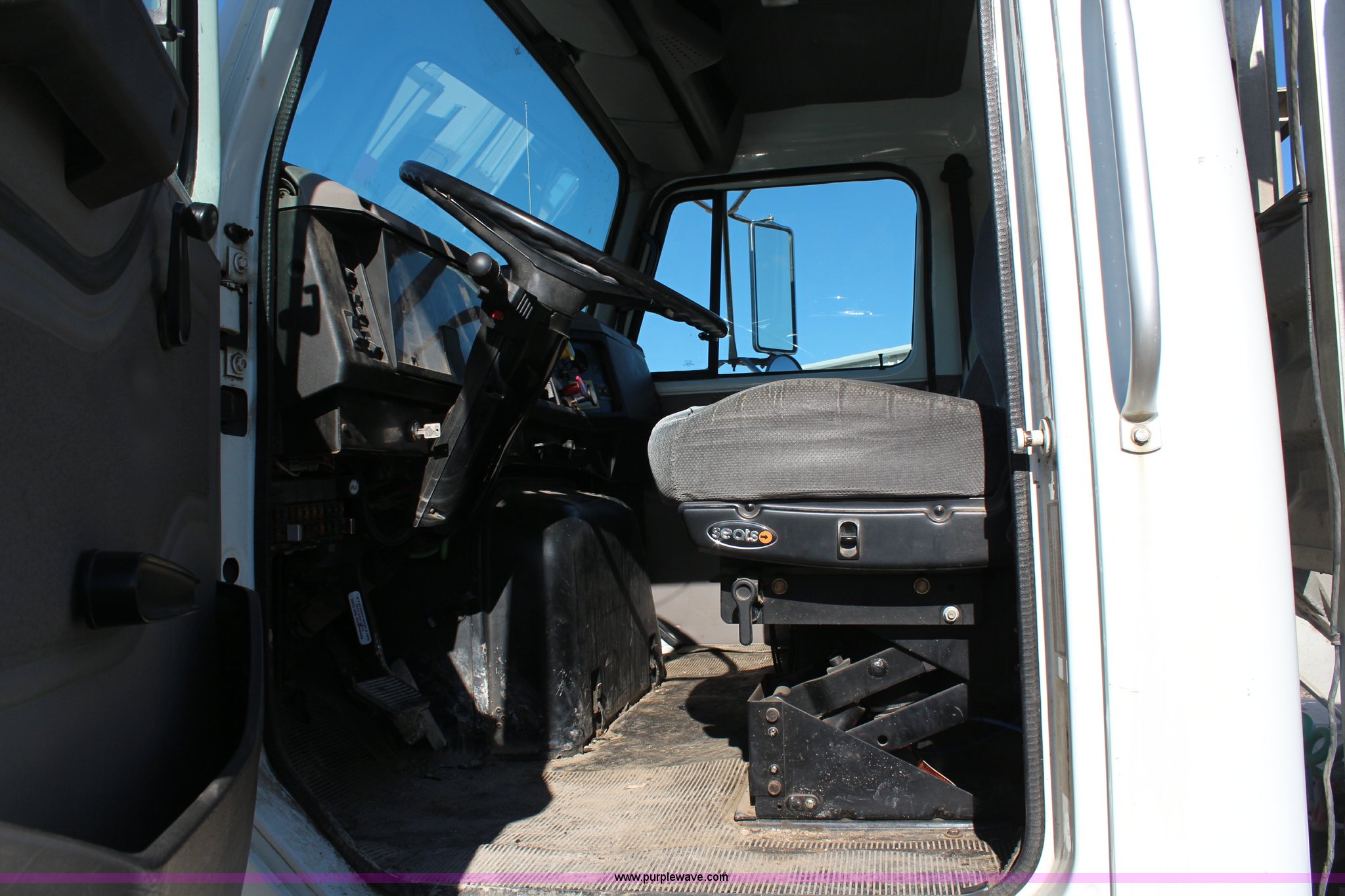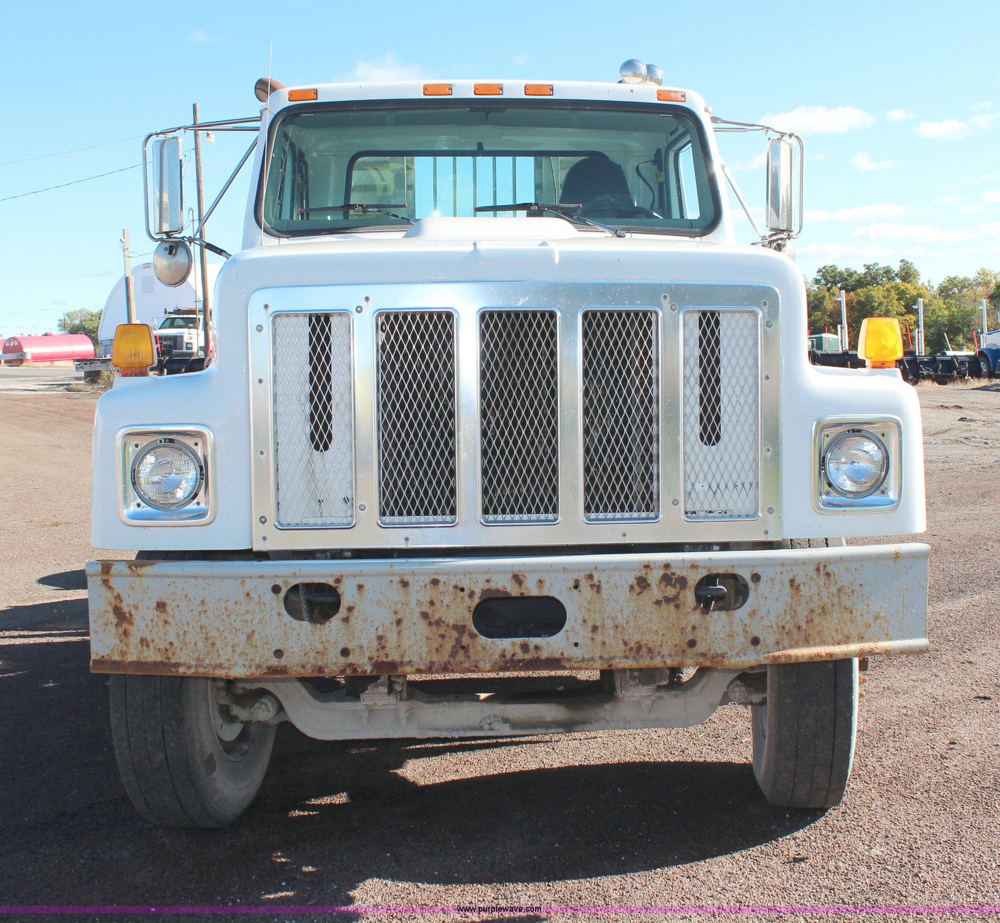 Purple Wave is selling a used Flat Bed Truck in Kansas. This item is a 2002 International F2574 semi truck with the following: 236,139 miles on odometer, 11,048 hours on meter, Caterpillar C12 12.0L L6 diesel engine, Eaton Fuller automatic transmission, Twin screw, AC and heat, Cruise, Heated mirrors, Air suspension seat, Headache rack, Window, Storage, Chain hanger, Block heater, 100 gallon fuel tank, Single rear exhaust stack, PTO, Wet kit, Spring suspension, Air brakes, Jake brake, Double framed, 180" wheelbase, 11R22.5 tires, Unit# 59