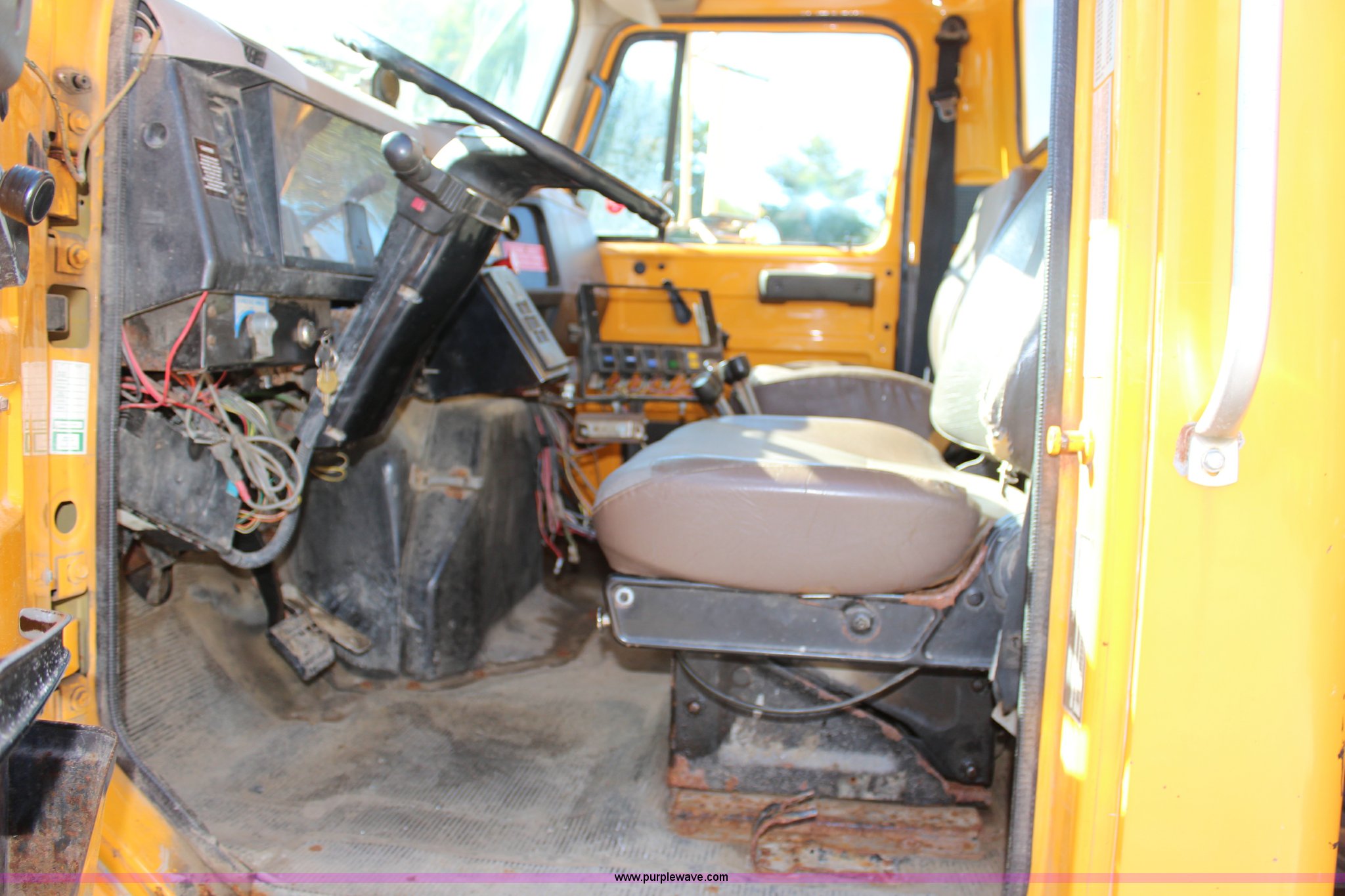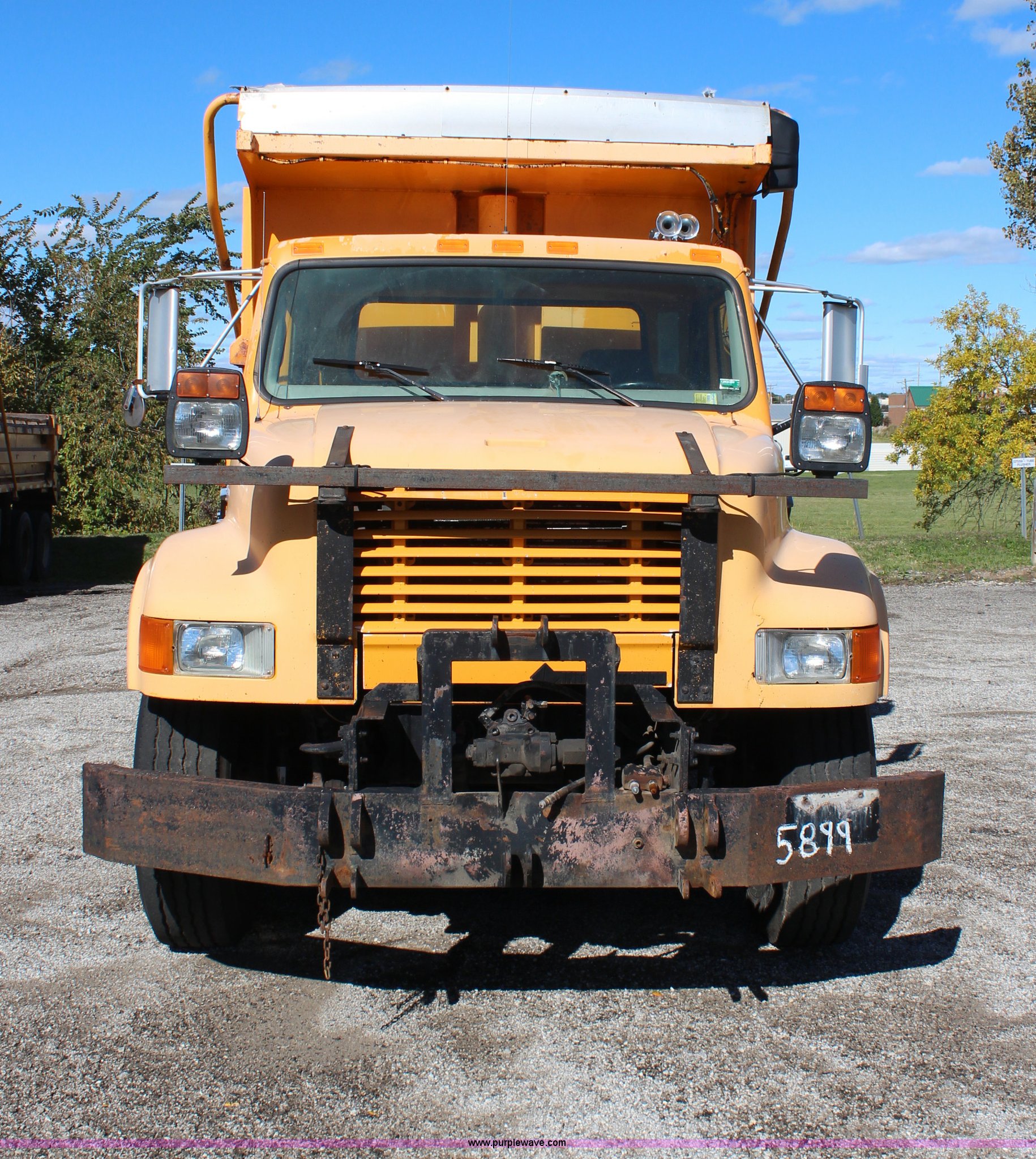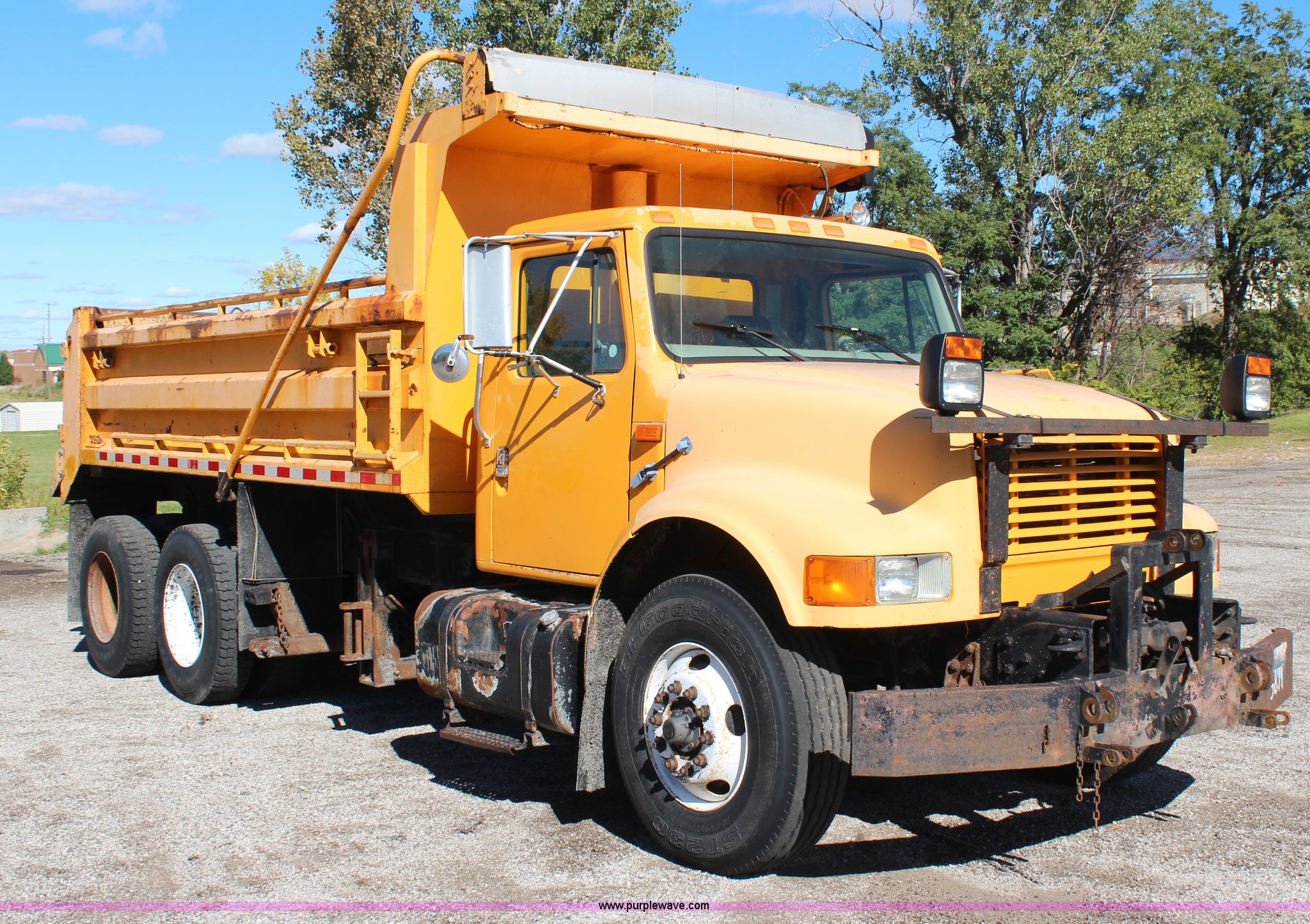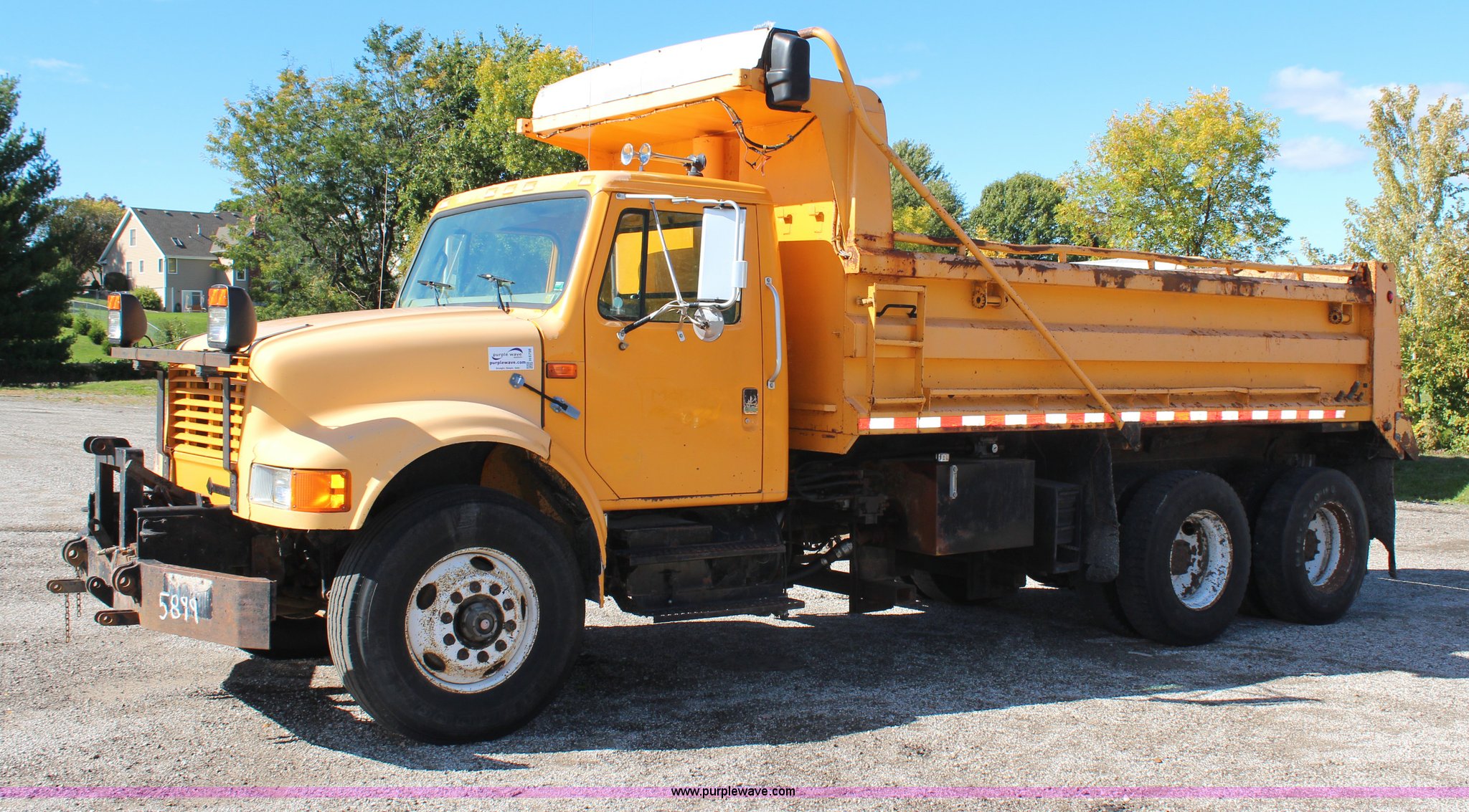 Purple Wave is selling a used Construction Dump Truck in Missouri. This item is a 1999 International 4900 dump truck with the following: 209,148 miles on odometer, 8,192 hours on meter, International DT530 8.7L L6 diesel engine, Allison MD3060 automatic transmission, Twin screw, Heat, Cruise, AM/FM, Air suspension seat, 16'L dump bed, Electric tarp, Plow hydraulic controls, Side mount plow bracket, Block heater, 70 gallon fuel tank, Front mount PTO, Spring suspension, Air brakes, 206" wheelbase, 315/80R22.5 tires, GVWR 56,000 lbs, FAWR 16,000 lbs, IAWR 20,000 lbs, RAWR 20,000 lbs, Transmission output shaft seal leaks, Cam shaft follower gasket leaks, Fiberglass damage on left fender, Rust, MoDOT ID 5899