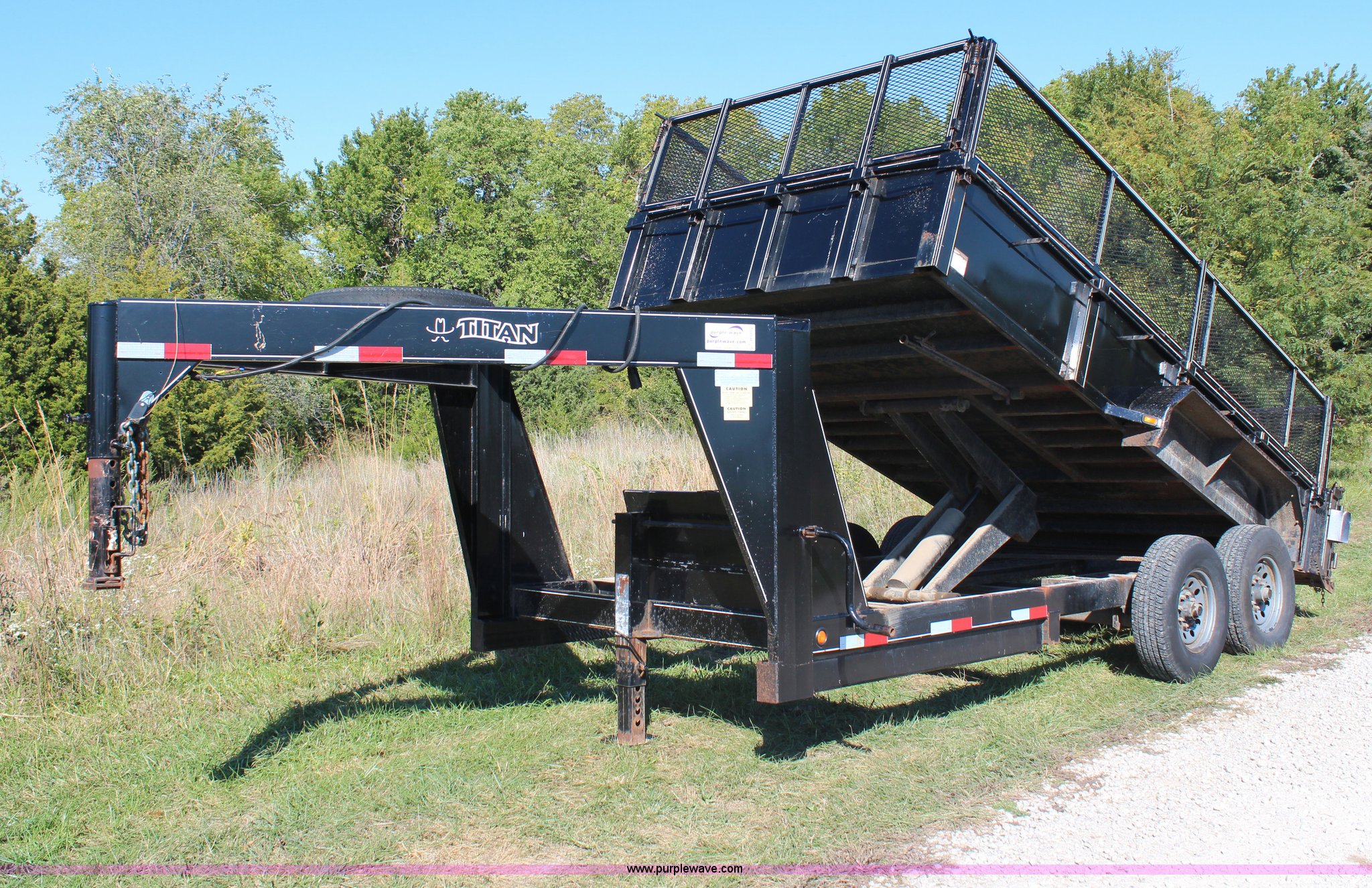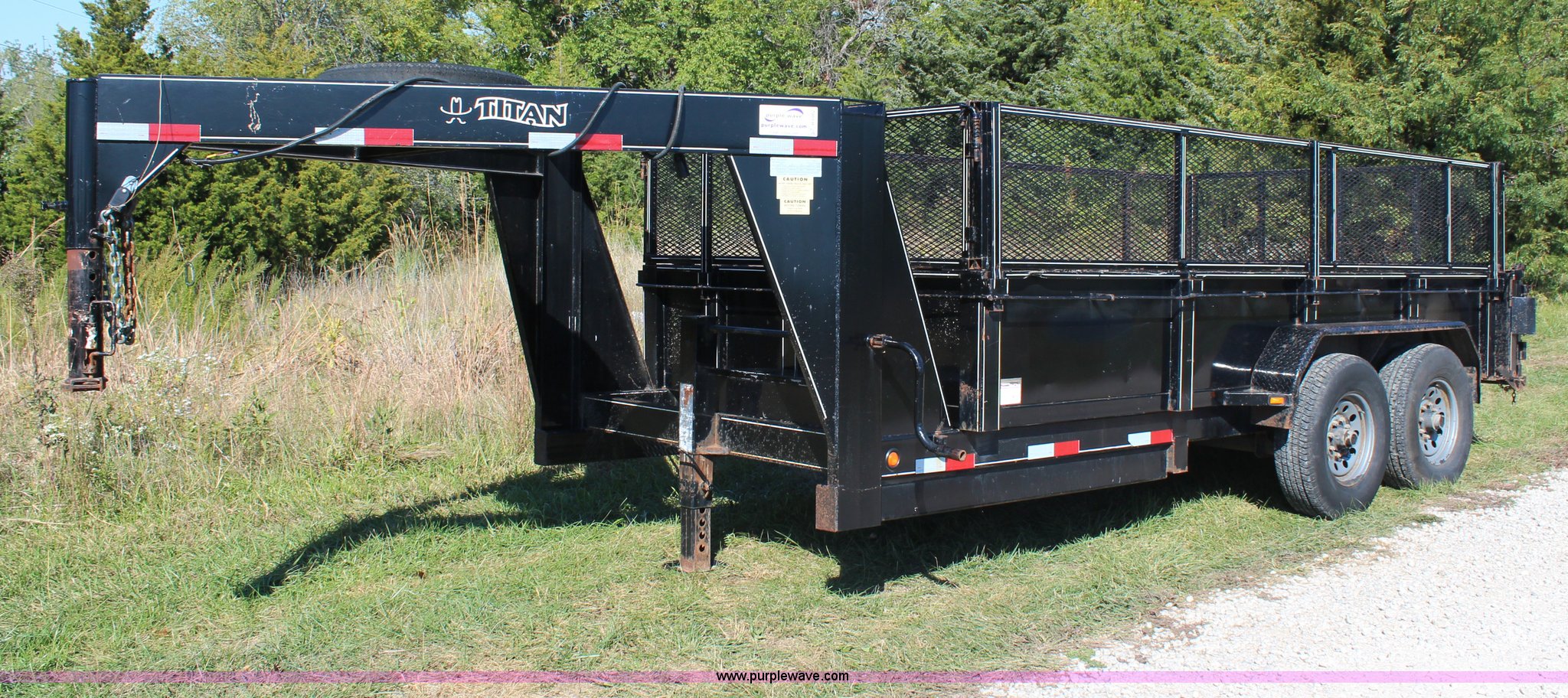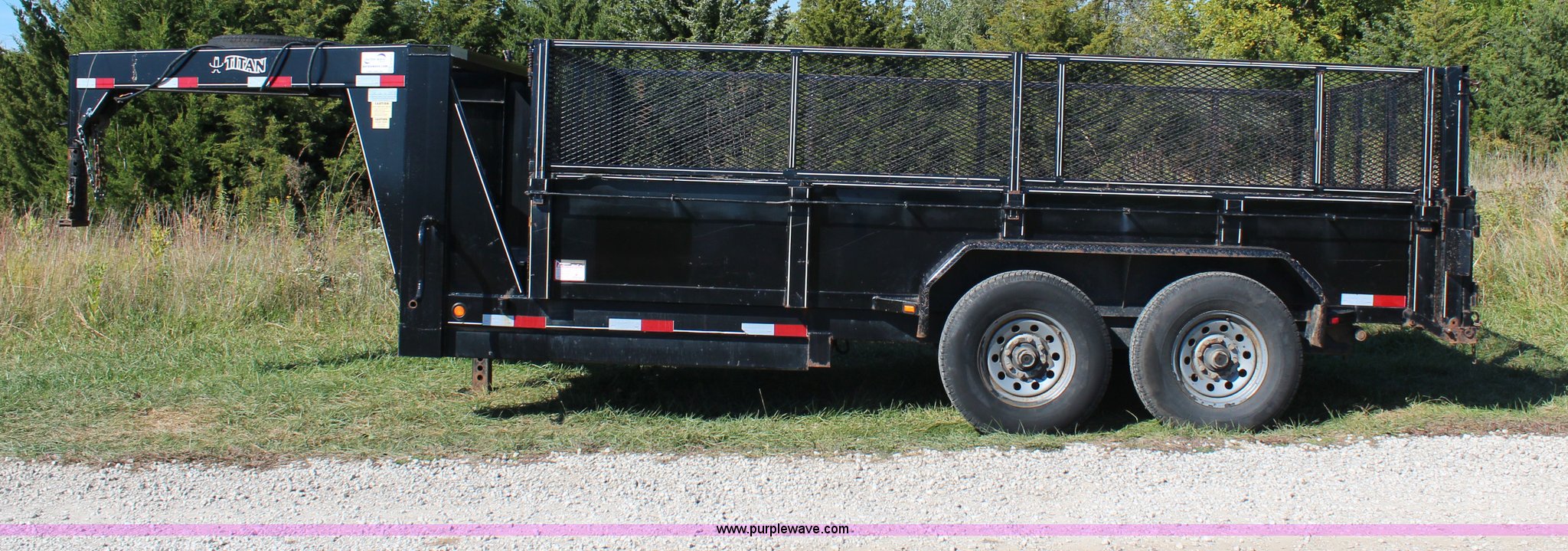 Purple Wave is selling a used Dump Trailer in Kansas. This item is a 2007 Titan gooseneck dump trailer with the following: 14'L x 82"W, 20"H solid sides, 24"H side extensions, Electric over hydraulic dump, Remote, 5.91 cu. yd. capacity, Dual electric braking axles, 235/80R16 tires, Dual 7,000 lbs torsion axles, GVWR 14,000 lbs, Recently replaced deep cycle battery, 4,200 lbs empty weight