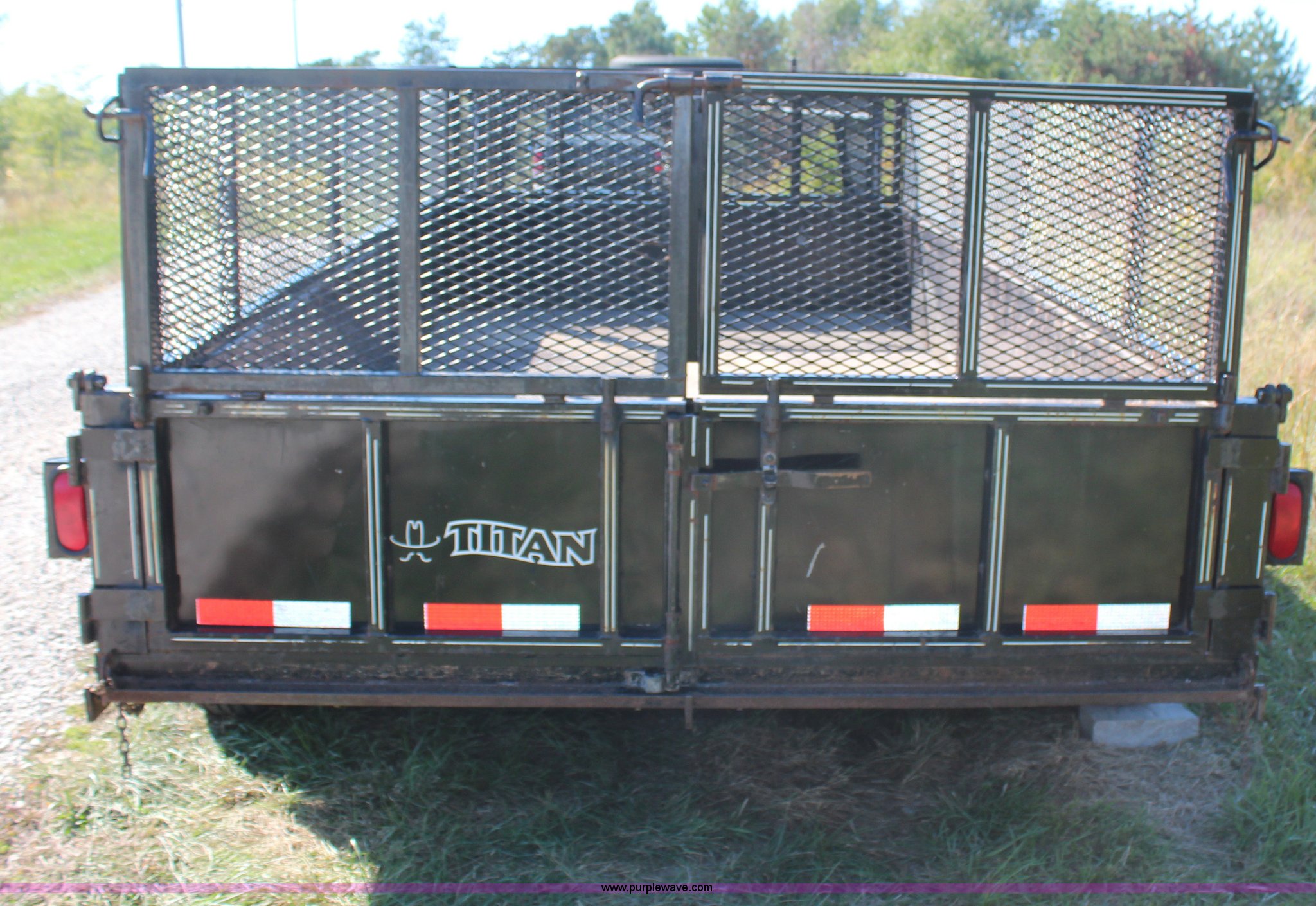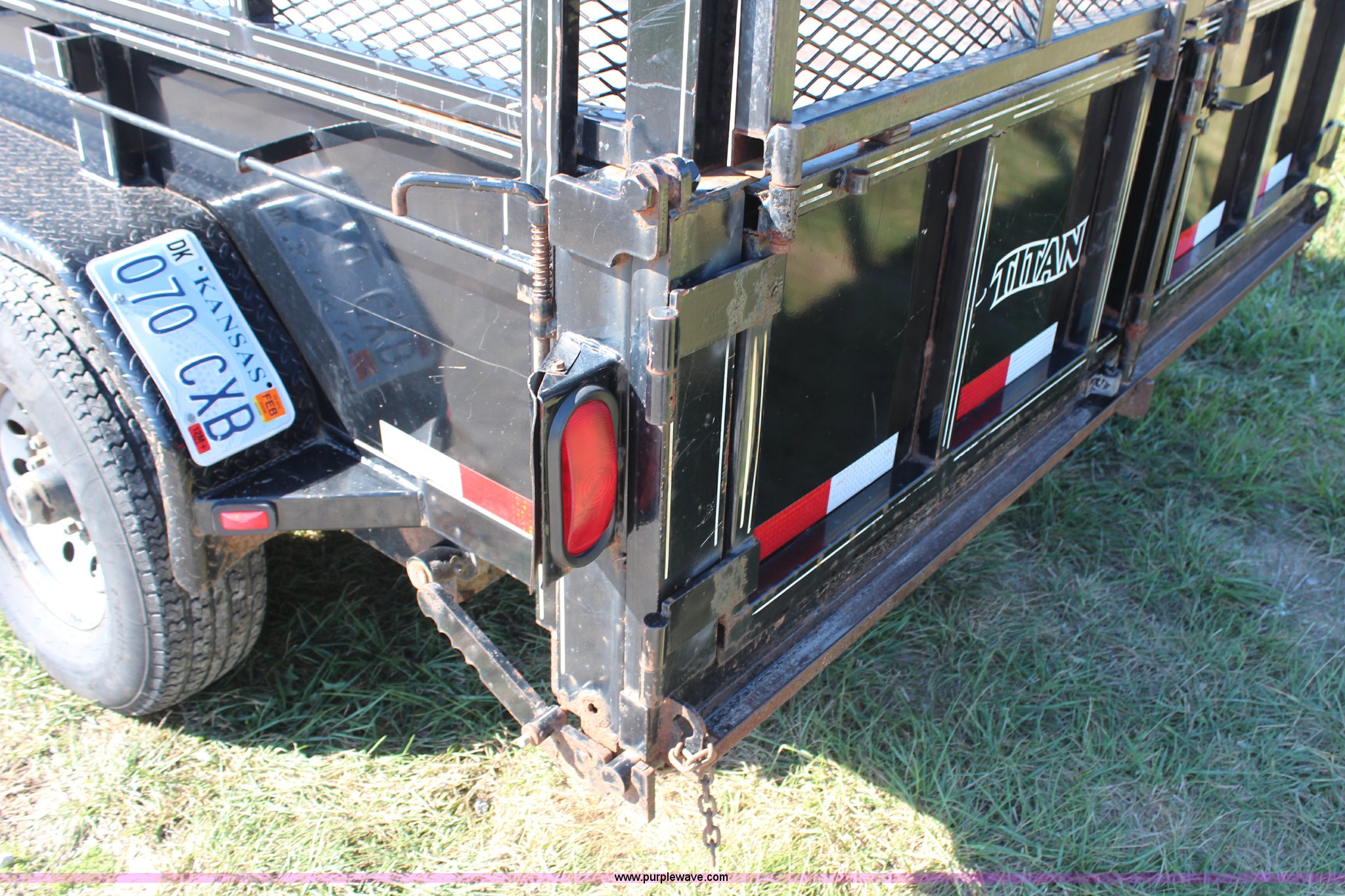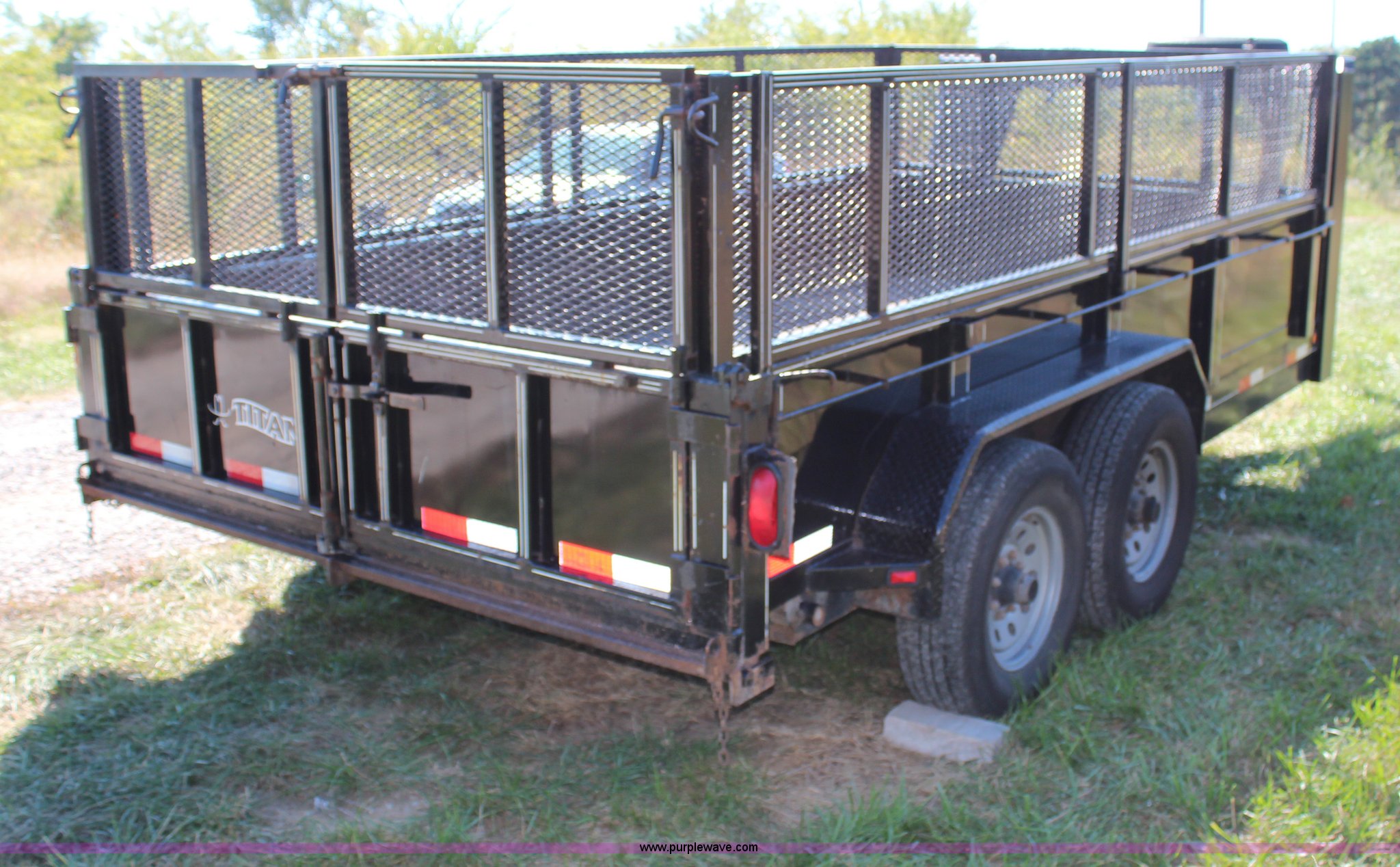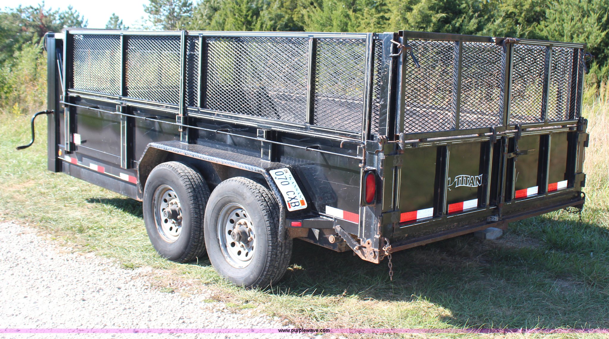 Purple Wave is selling a used Dump Trailer in Kansas. This item is a 2007 Titan gooseneck dump trailer with the following: 14'L x 82"W, 20"H solid sides, 24"H side extensions, Electric over hydraulic dump, Remote, 5.91 cu. yd. capacity, Dual electric braking axles, 235/80R16 tires, Dual 7,000 lbs torsion axles, GVWR 14,000 lbs, Recently replaced deep cycle battery, 4,200 lbs empty weight