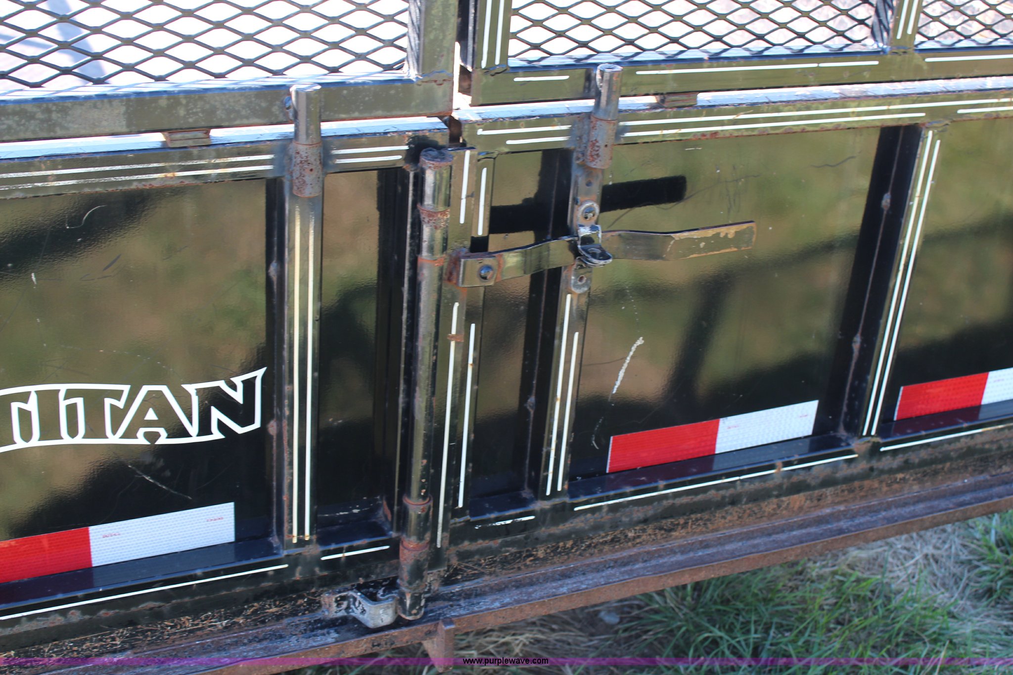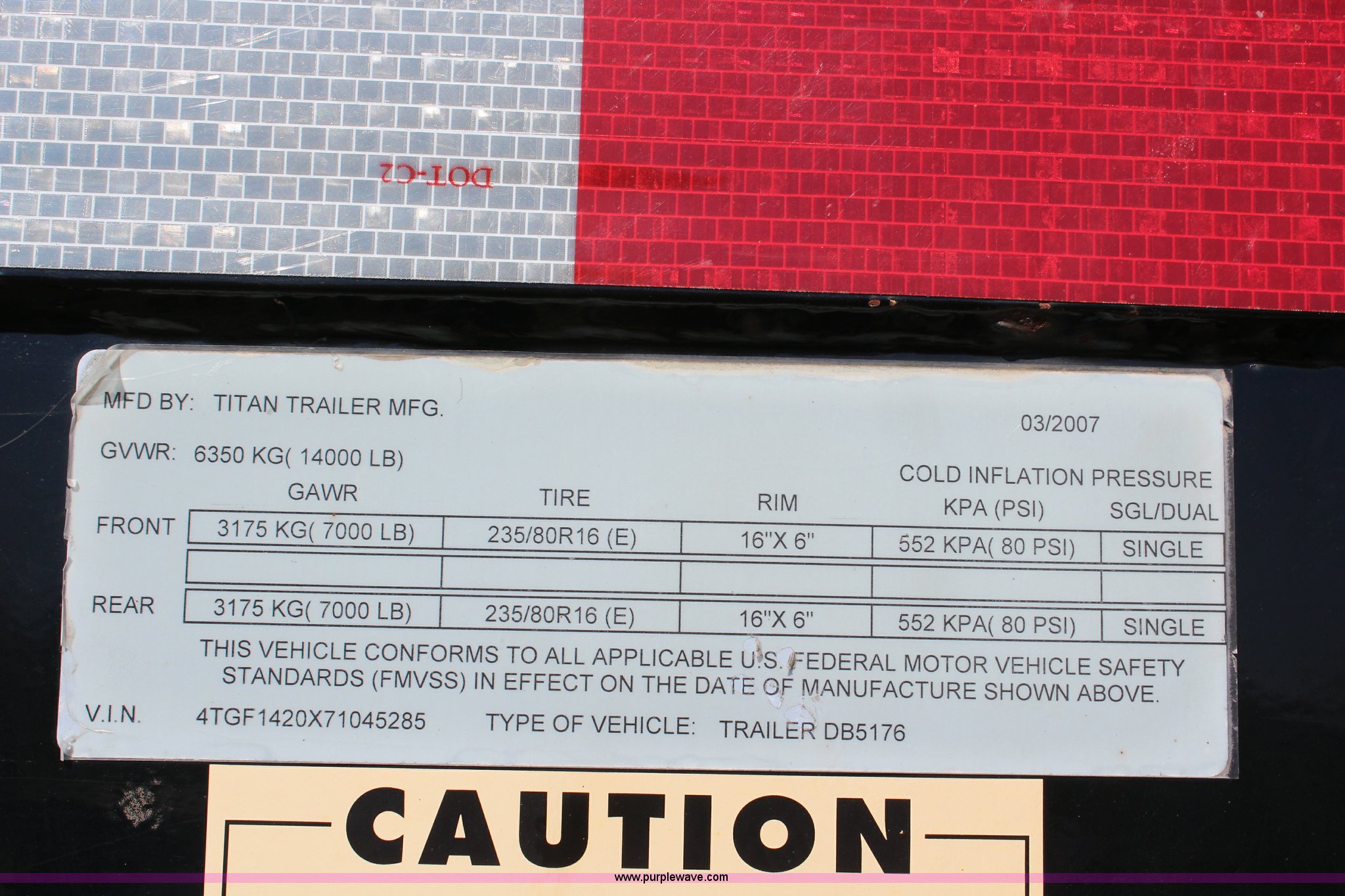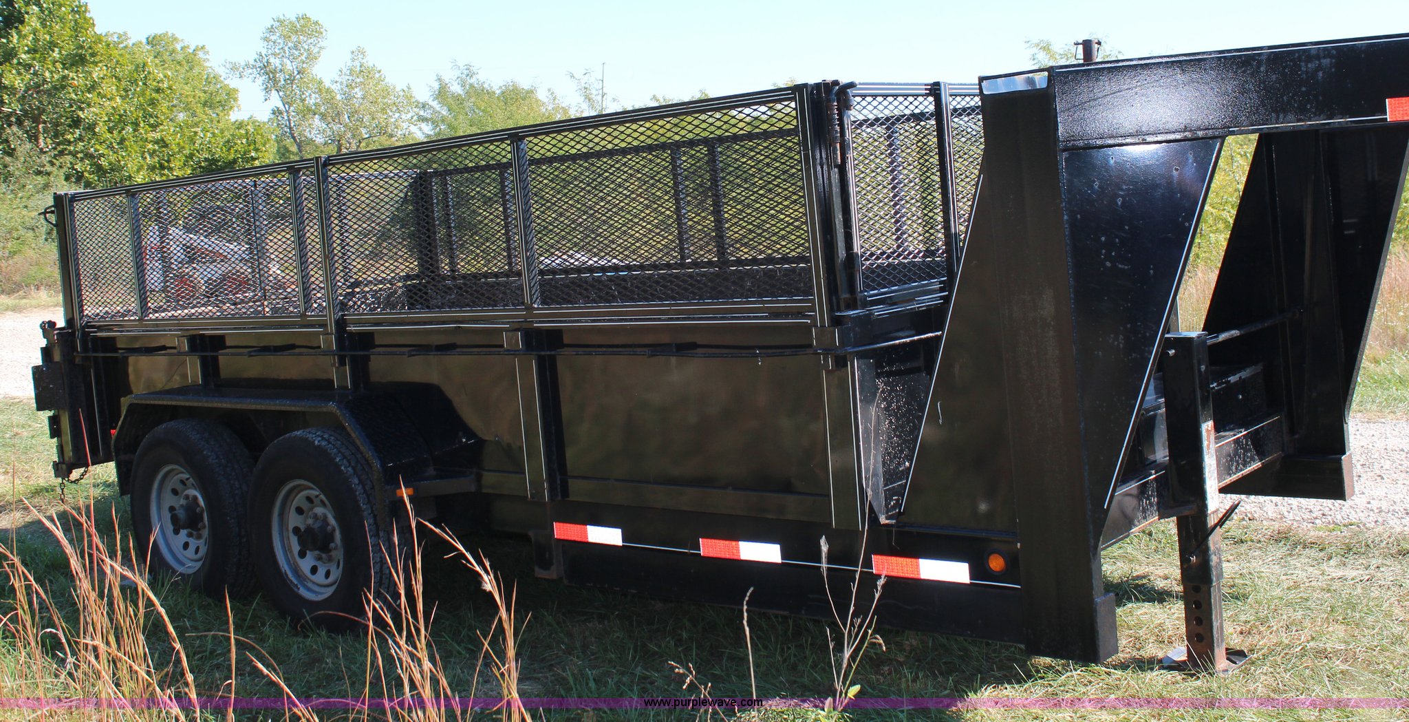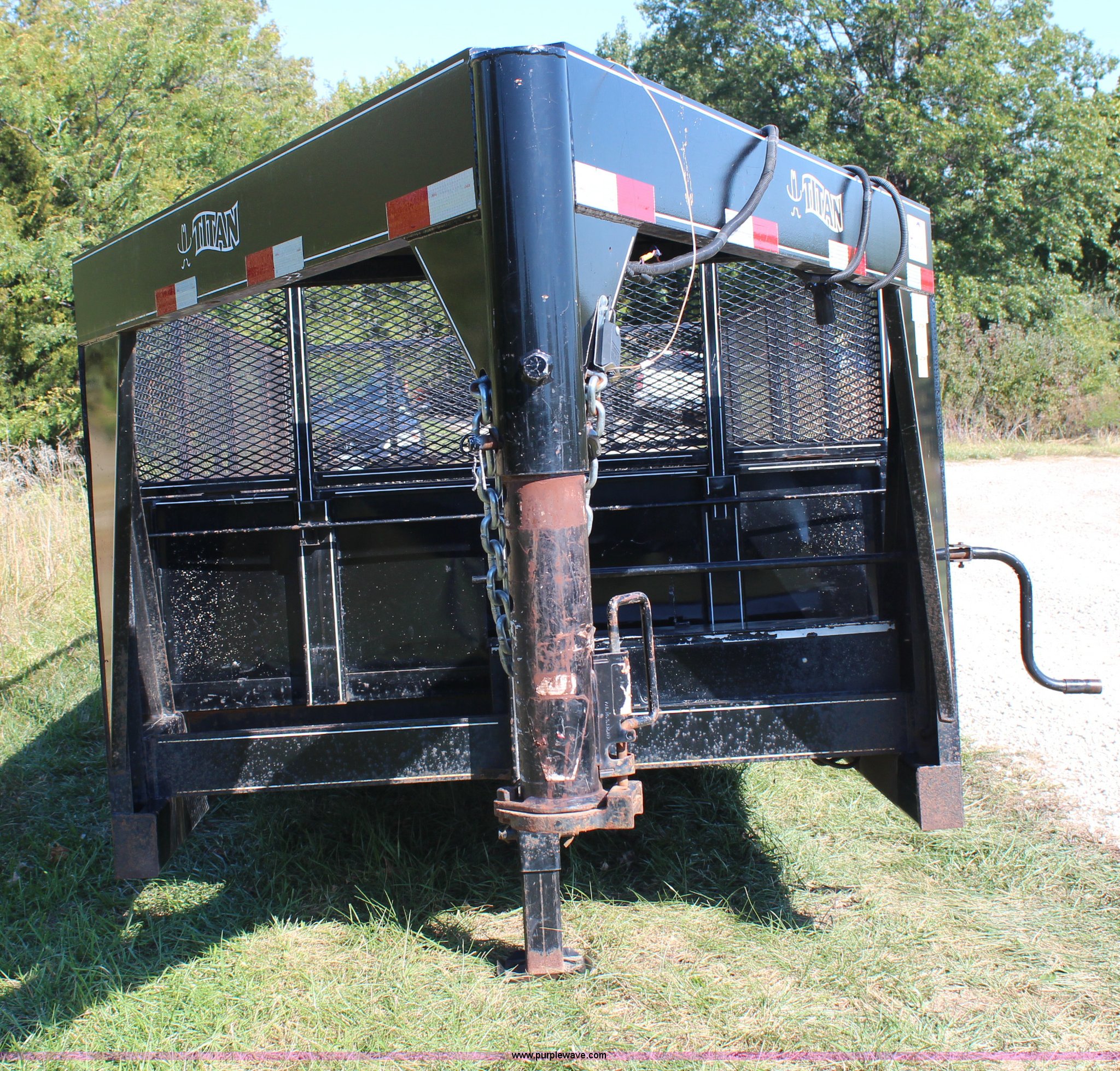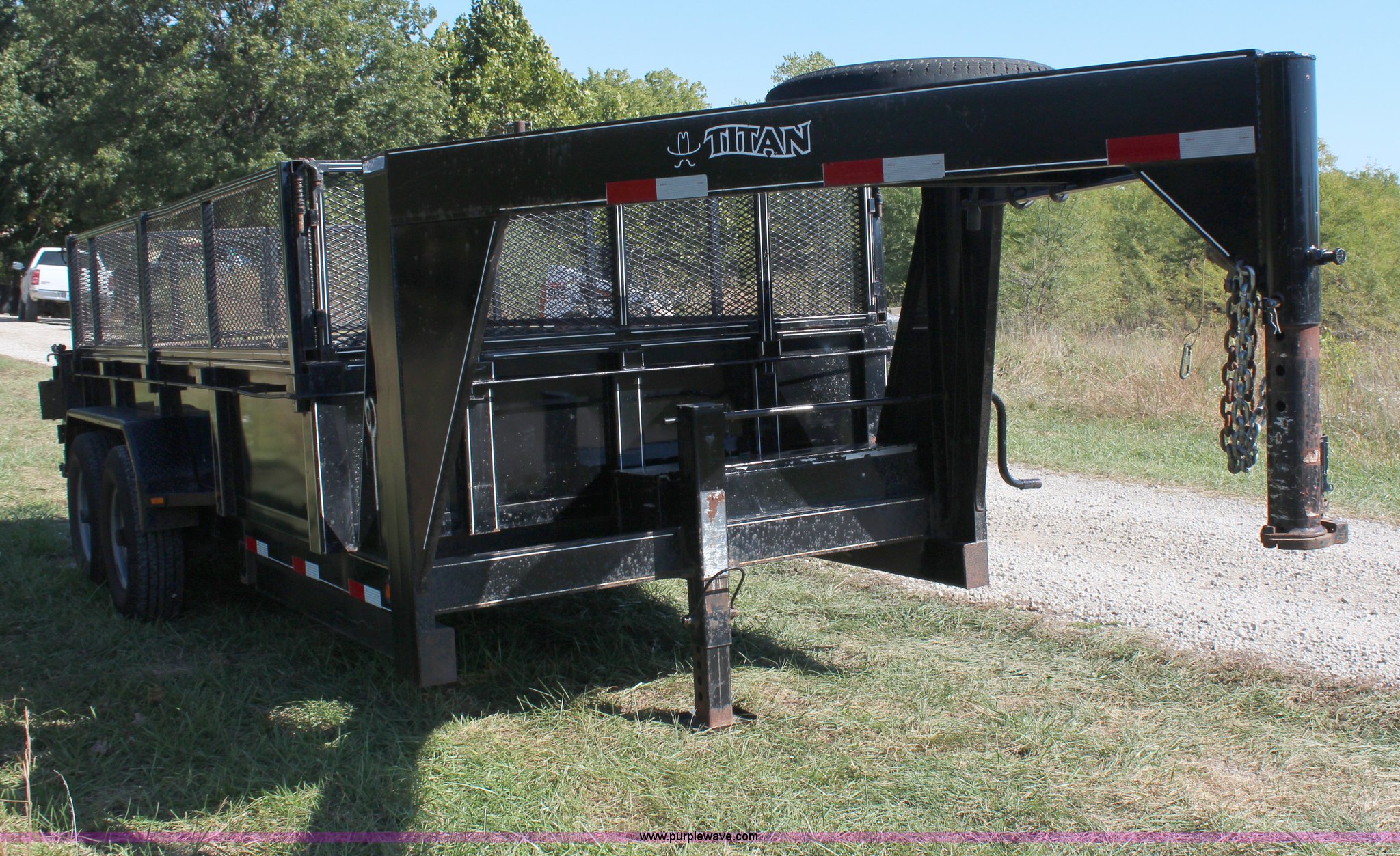 2007 Titan gooseneck dump trailer. 14'L x 82"W, 20"H solid sides, 24"H side extensions, Electric over hydraulic dump Remote, 5.91 cu. yd. capacity, Dual electric braking axles, 235/80R16 tires, Dual 7,000 lbs torsion axles, GVWR 14,000 lbs, Recently replaced deep cycle battery, 4,200 lbs empty weight. 4TGF1420X71045285. Olathe, KS 66061