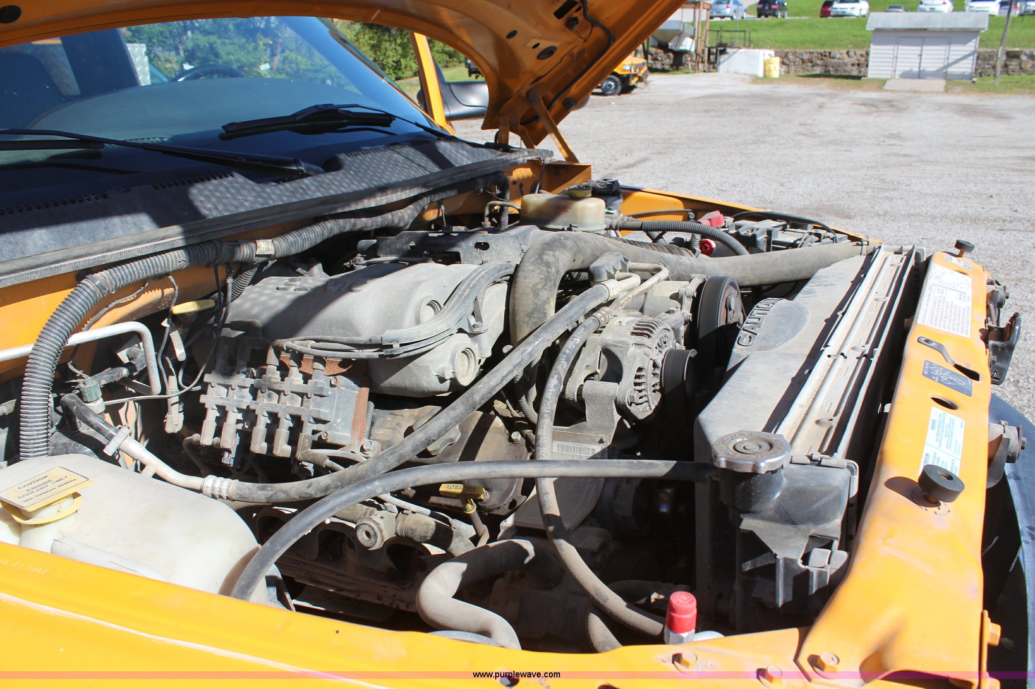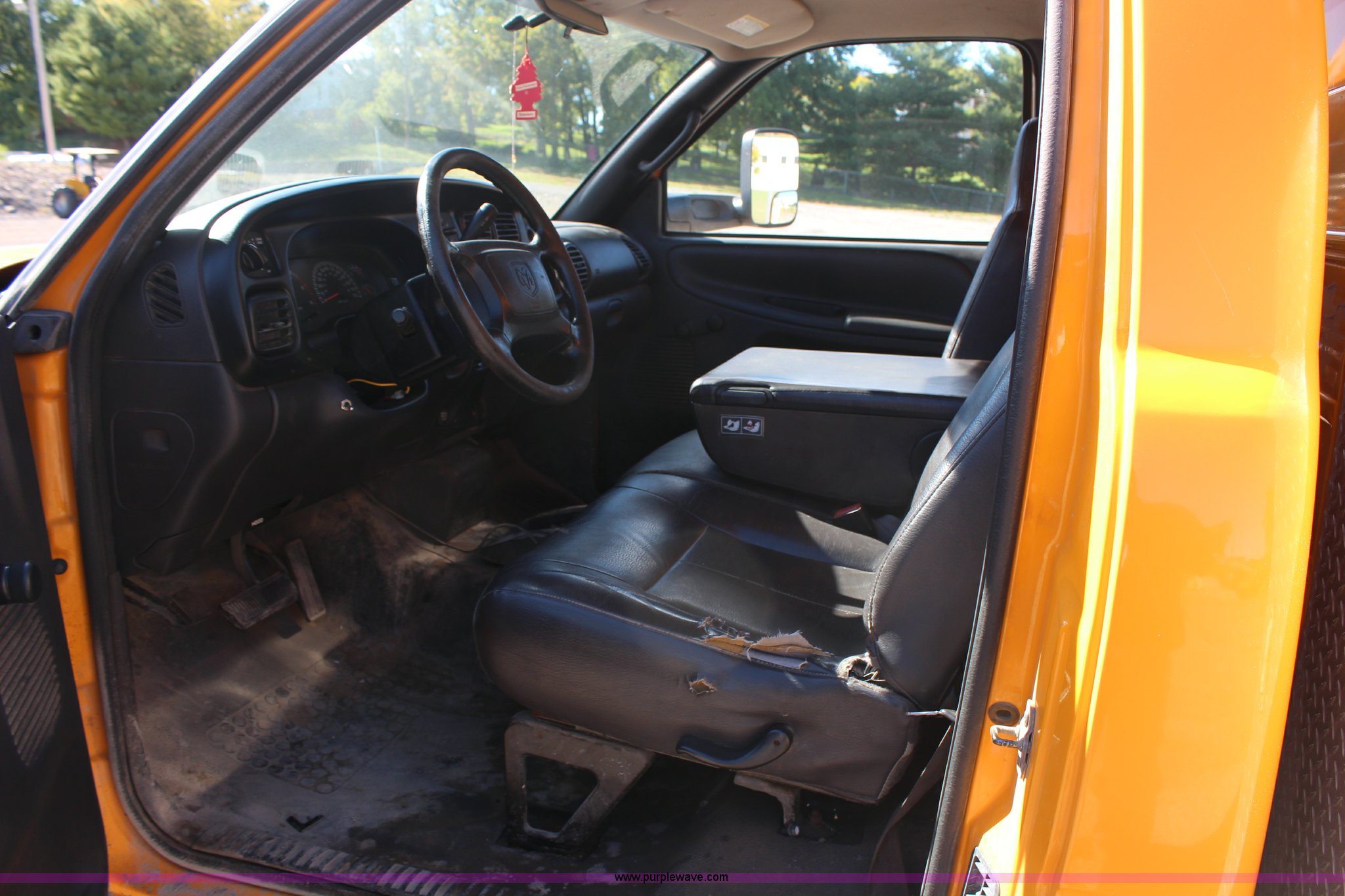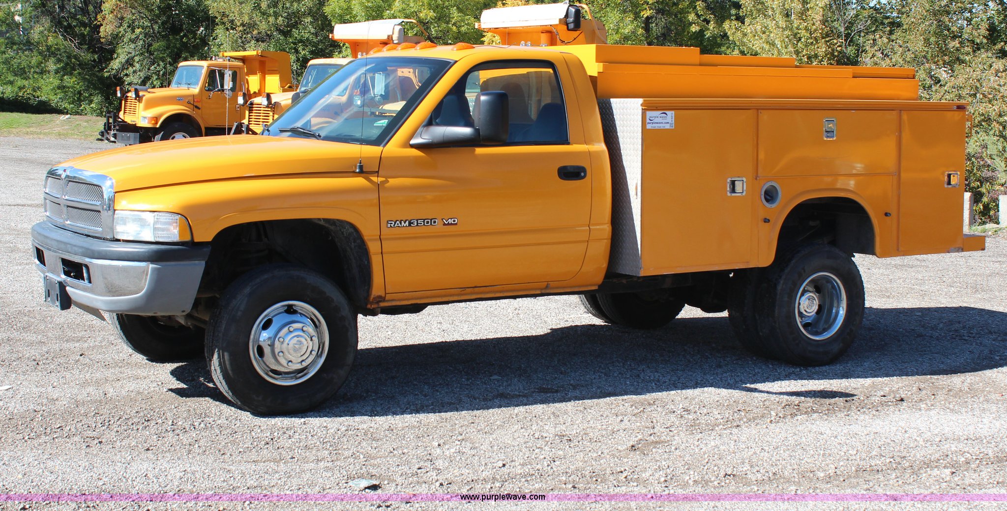Purple Wave is selling a used Passenger Vehicle in Missouri. This item is a 2002 Dodge Ram 3500 utility truck with the following: 179,225 miles on odometer, 8.0L V10 OHV 20V gas engine, Automatic transmission, AC and heat, AM/FM/cassette, Manual windows and locks, Vinyl interior, Knapheide utility bed, 9'L, 9" bumper, 235/85R16 tires, Valve cover gasket leaks, Antifreeze leak from thermostat housing, ABS light is on, Interior/exterior cosmetic damage, MoDOT ID 7026