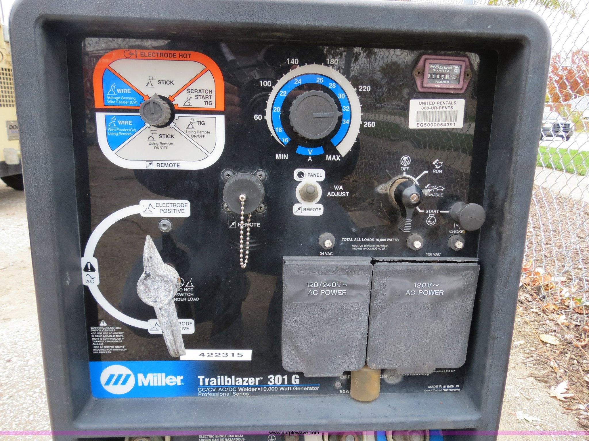 2002 Miller Trailblazer 301G welder/generator. 405 hours on meter, Kohler CH205 gas engine 624cc, Serial 3209600811, 10,000 watt generator, CC/CV, AC/DC welder, 120V outlet, (4) 240V outlets, Serial LC106869, EIN 422315. View equipment video. United Rentals - Cleveland. 2415 Brookpark Rd. Cleveland, OH 44134