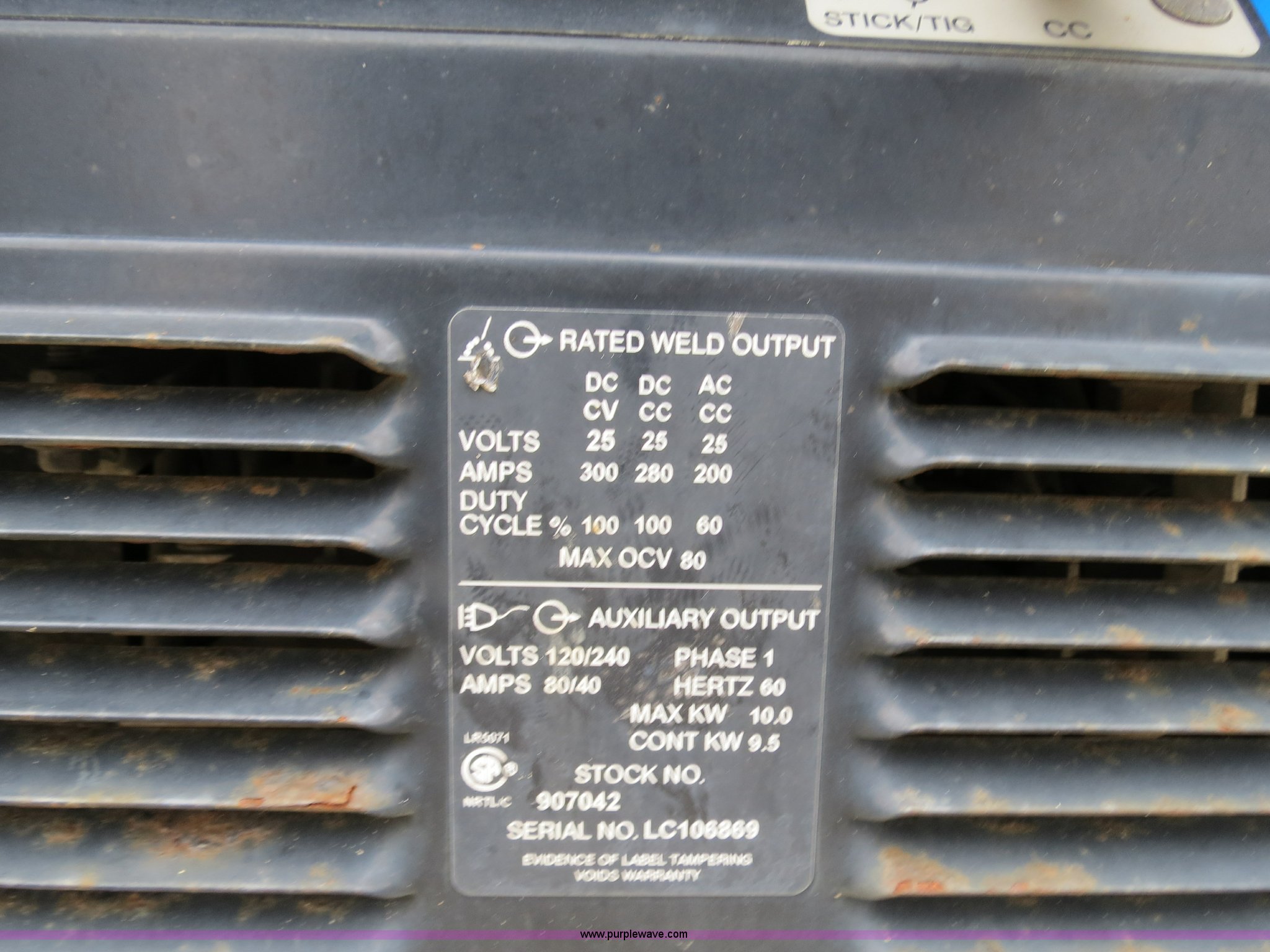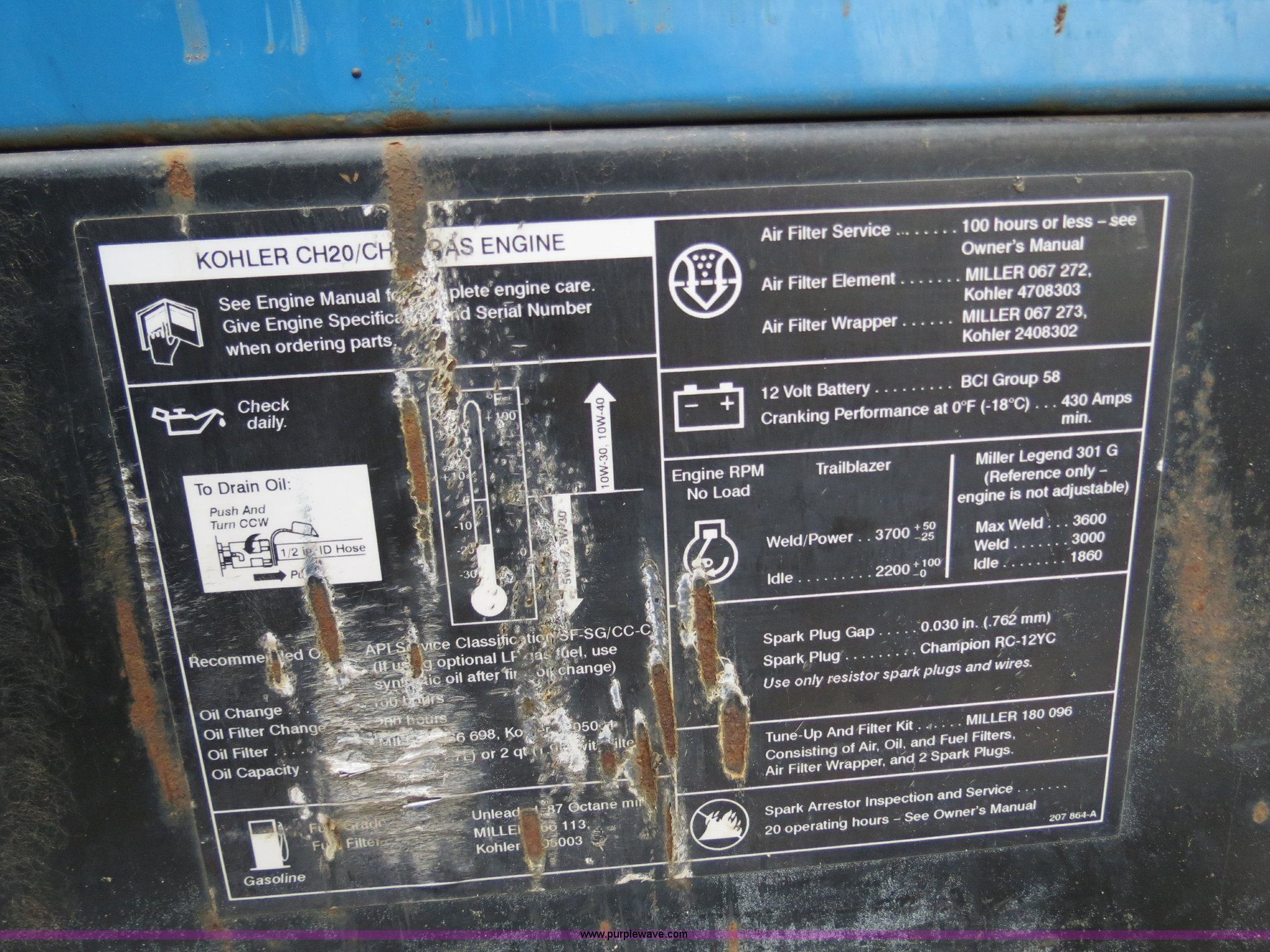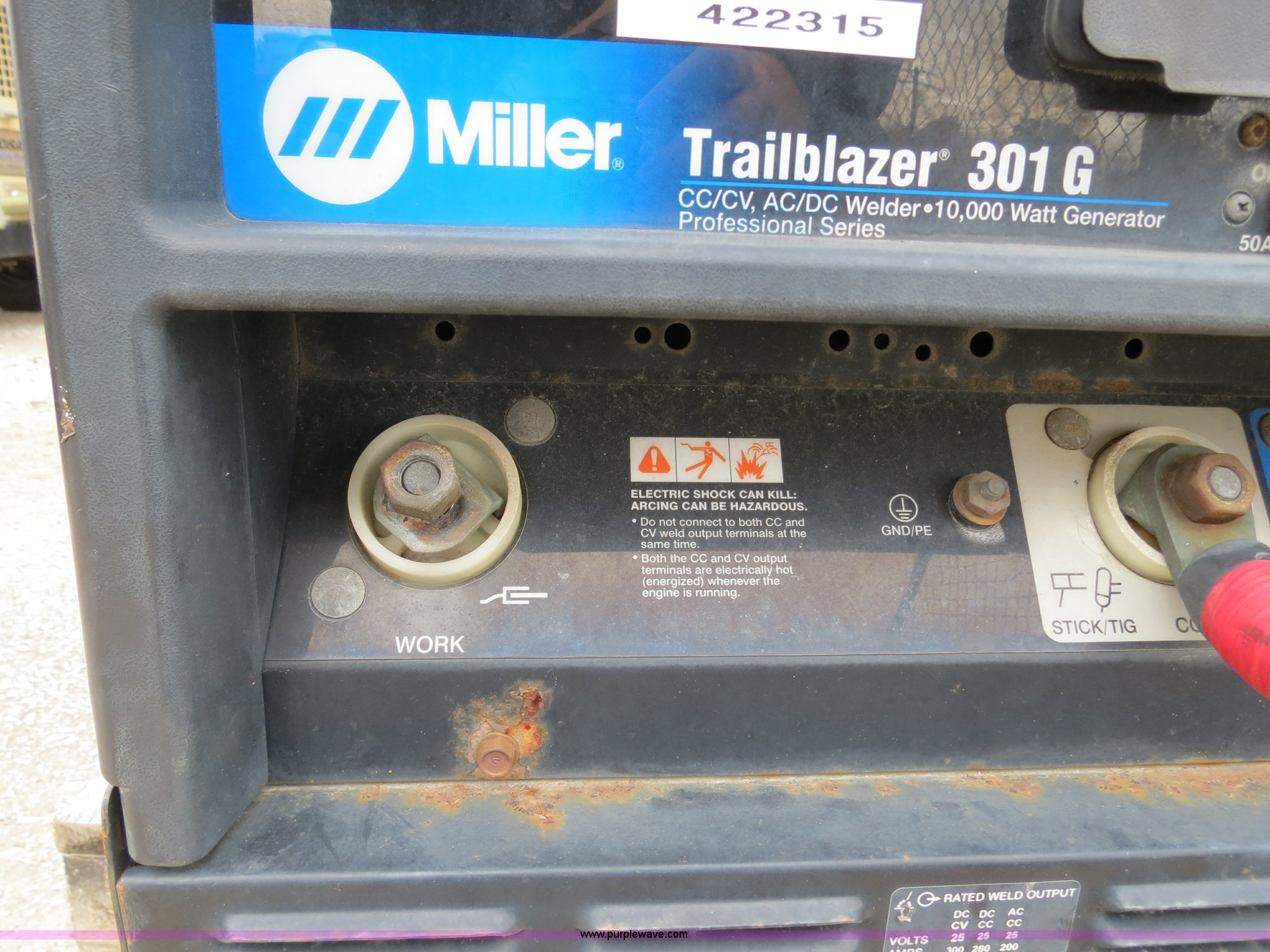 Purple Wave is selling a used Welder (Manual) in Ohio. This item is a 2002 Miller Trailblazer 301G welder/generator with the following: 405 hours on meter, Kohler CH205 gas engine, 624cc, Serial 3209600811, 10,000 watt generator, CC/CV, AC/DC welder, 120V outlet, (4) 240V outlets, Serial LC106869, EIN 422315