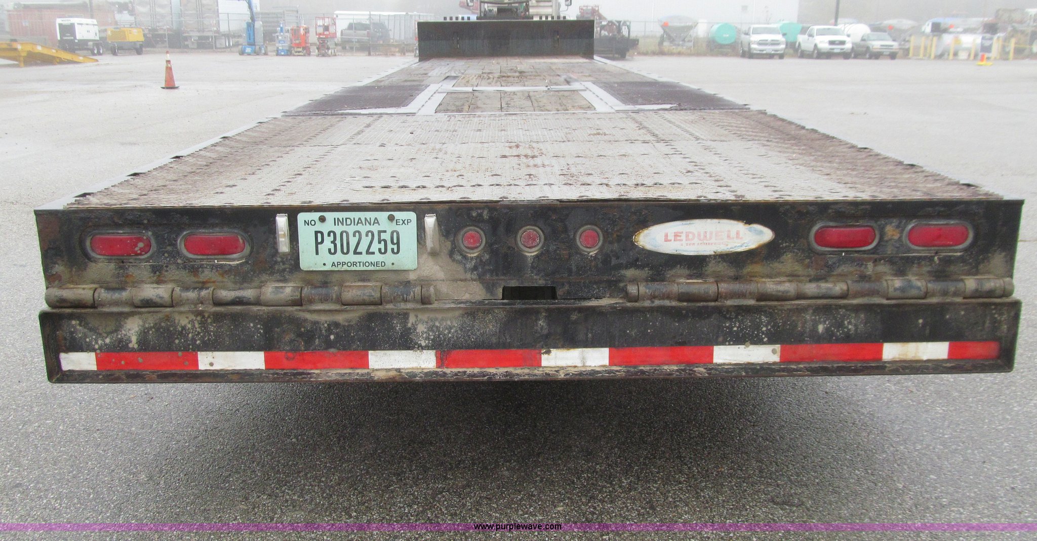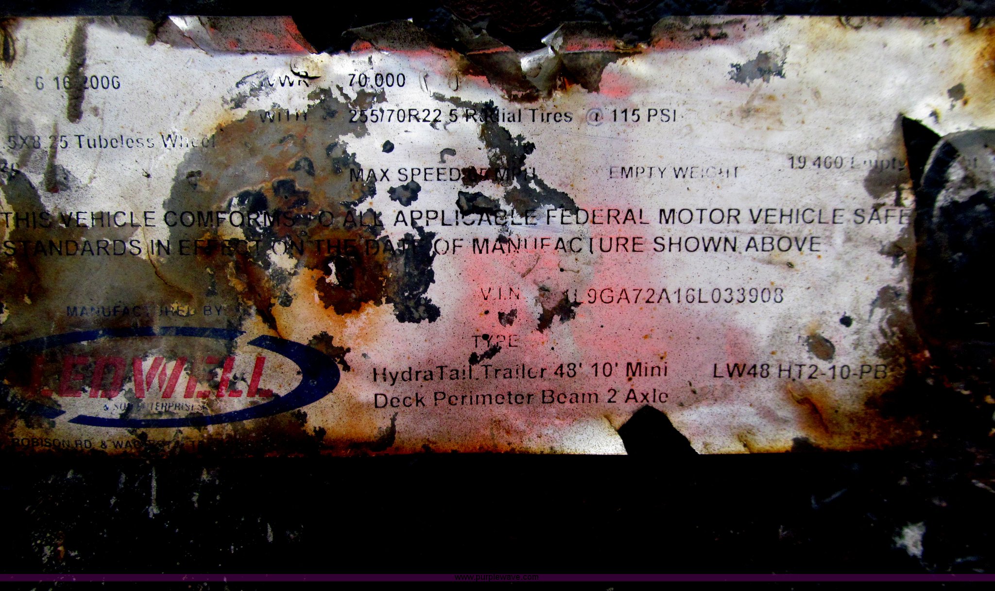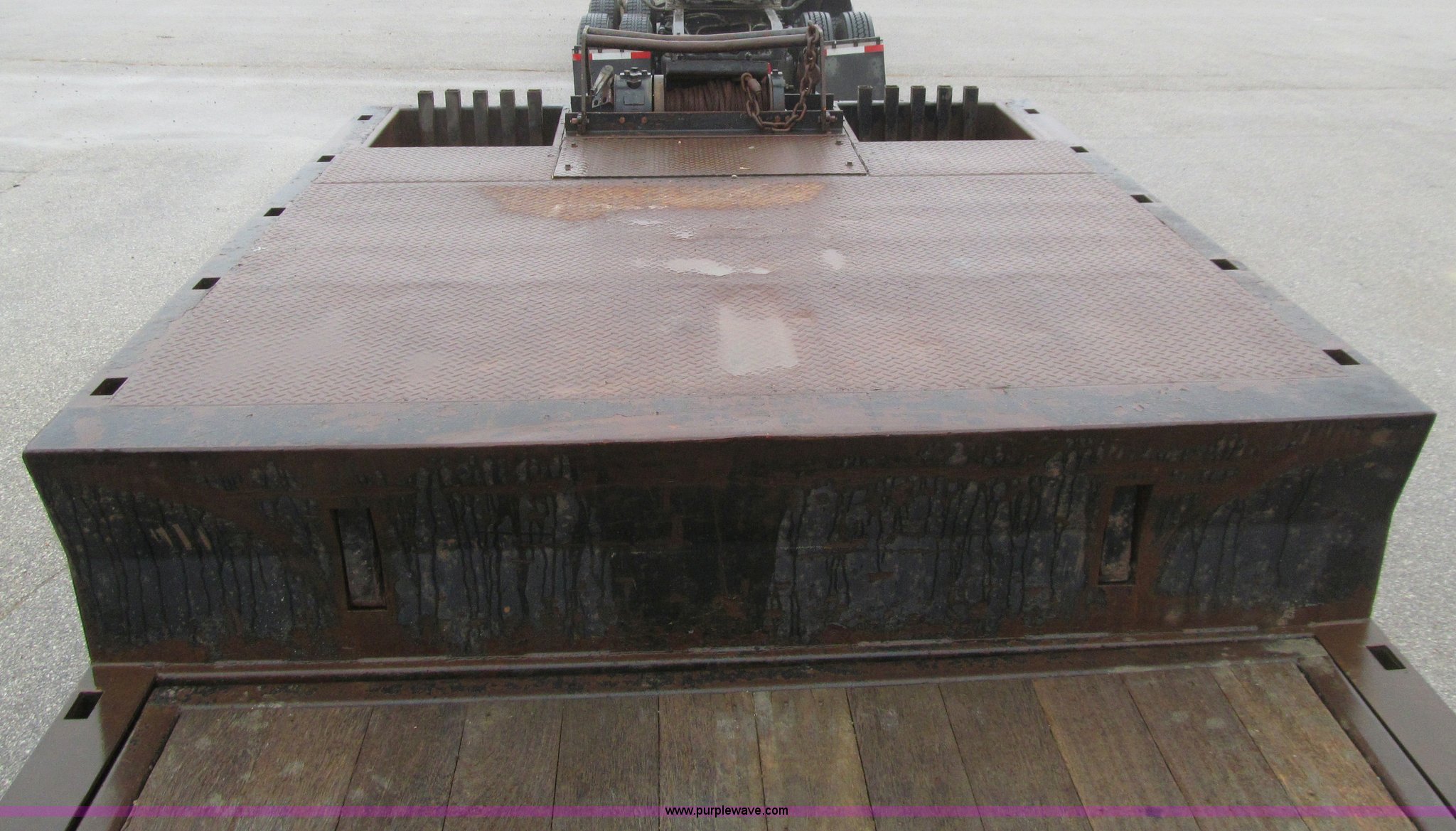 Purple Wave is selling a used Equip. Trailer in Iowa. This item is a 2006 Ledwell LW48HT2-10-PB Hydratail trailer with the following: 48'L x 102"W, Braden winch, Expanded metal on rear portions of deck, Perimeter beam, Chain storage, Stake pockets, Mud flaps, Landing gear, Air ride suspension, 255/70R22.5 tires, GVWR 70,000 lbs, 19,460 lbs empty weight, Surface rust/scaling, EIN 644104RA