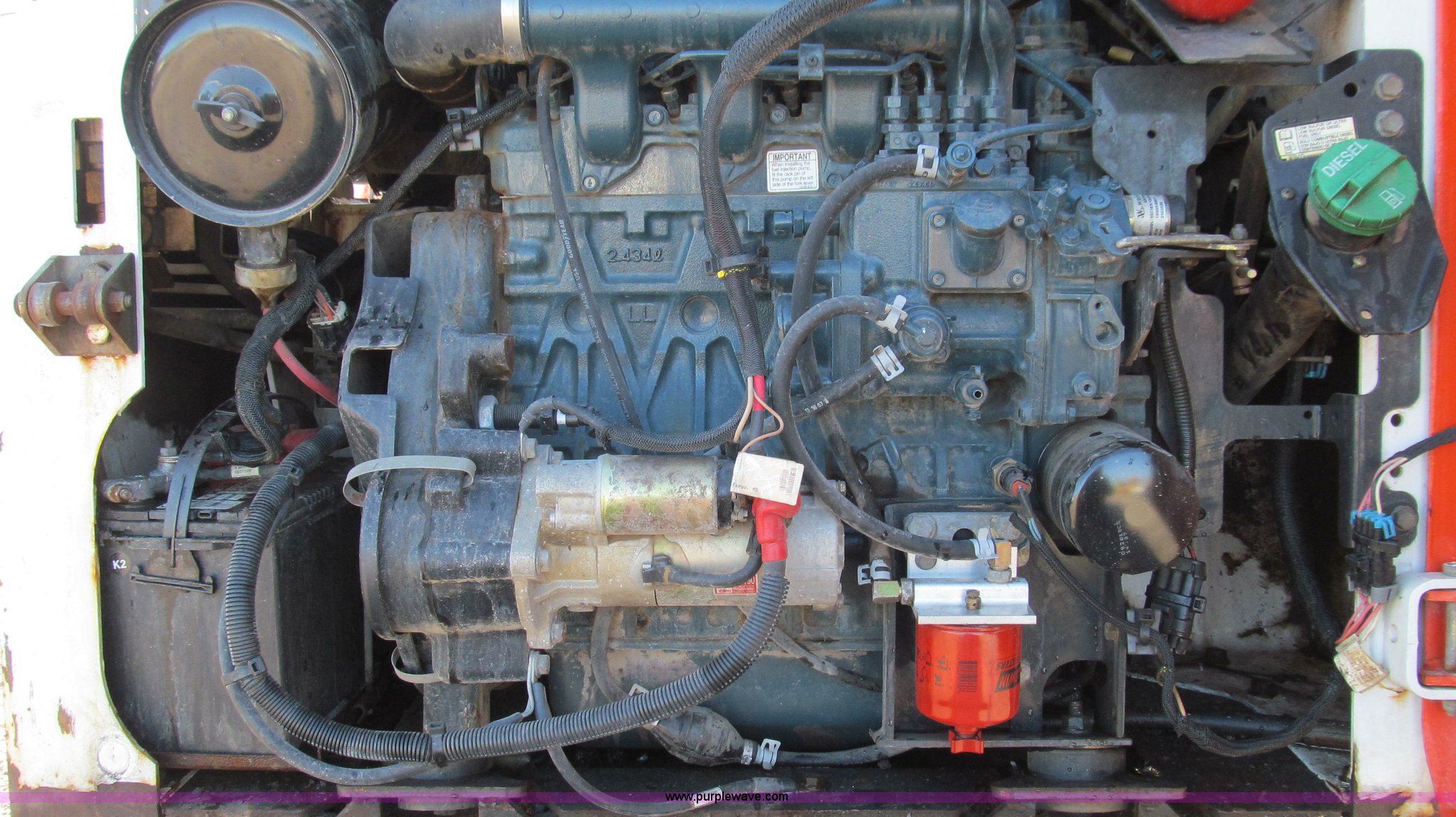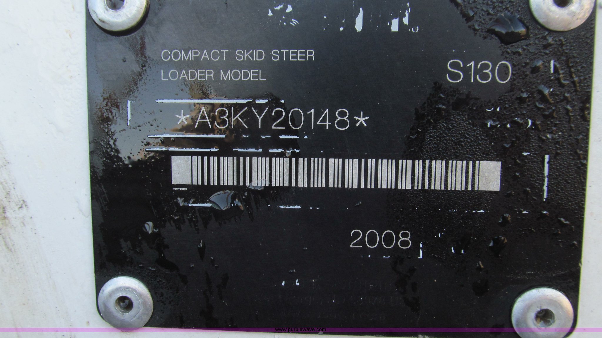 Purple Wave is selling a used Skid Steer Loader in Missouri. This item is a 2008 Bobcat S130 skid steer with the following: 908 hours on meter, Kubota V2403 four cylinder diesel engine, 49 HP, Liquid cooled, Serial 08C3194, OROPS, Back glass, Side cage, Top glass hatch, Hand and foot controls, Auxiliary hydraulics, Work lights, Keyless start, 62"W smooth edge bucket, Manual quick tach, 13.3 gallon fuel tank, 31x6x10/10-16.5 solid rubber tires, Service records available, Serial A3KY20148, EIN 752039RA