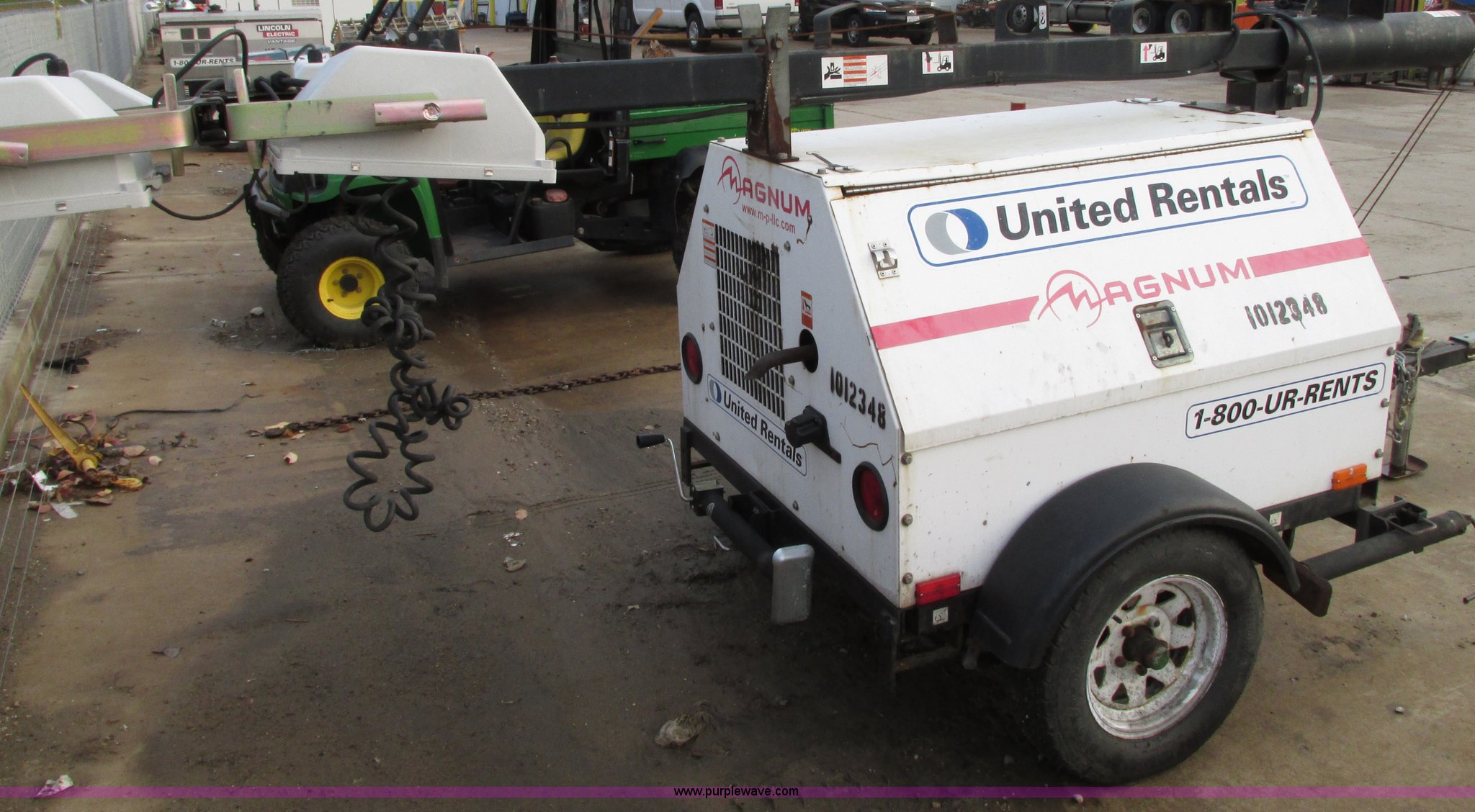 Magnum Pro MLT4060 light tower. 6,504 hours on meter, Diesel engine, Manual tower winch, Front and rear stabilizer jacks, Telescopic light tower, ST175/30D13 tires, Serial 176169, EIN 1012348. United Rentals - East Peoria. 3407 N Main St. East Peoria, IL 61611