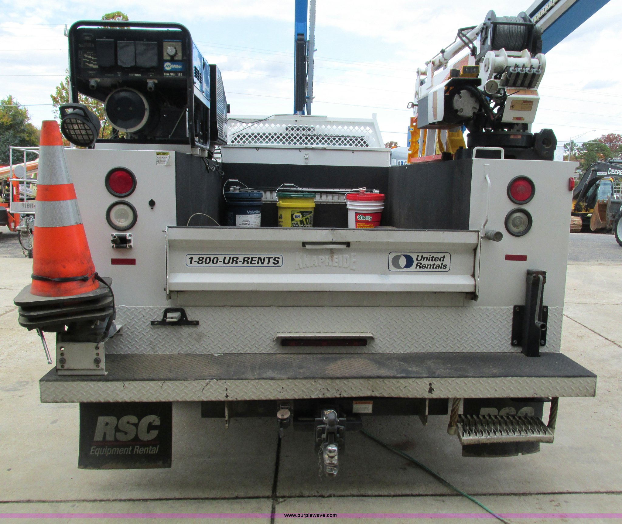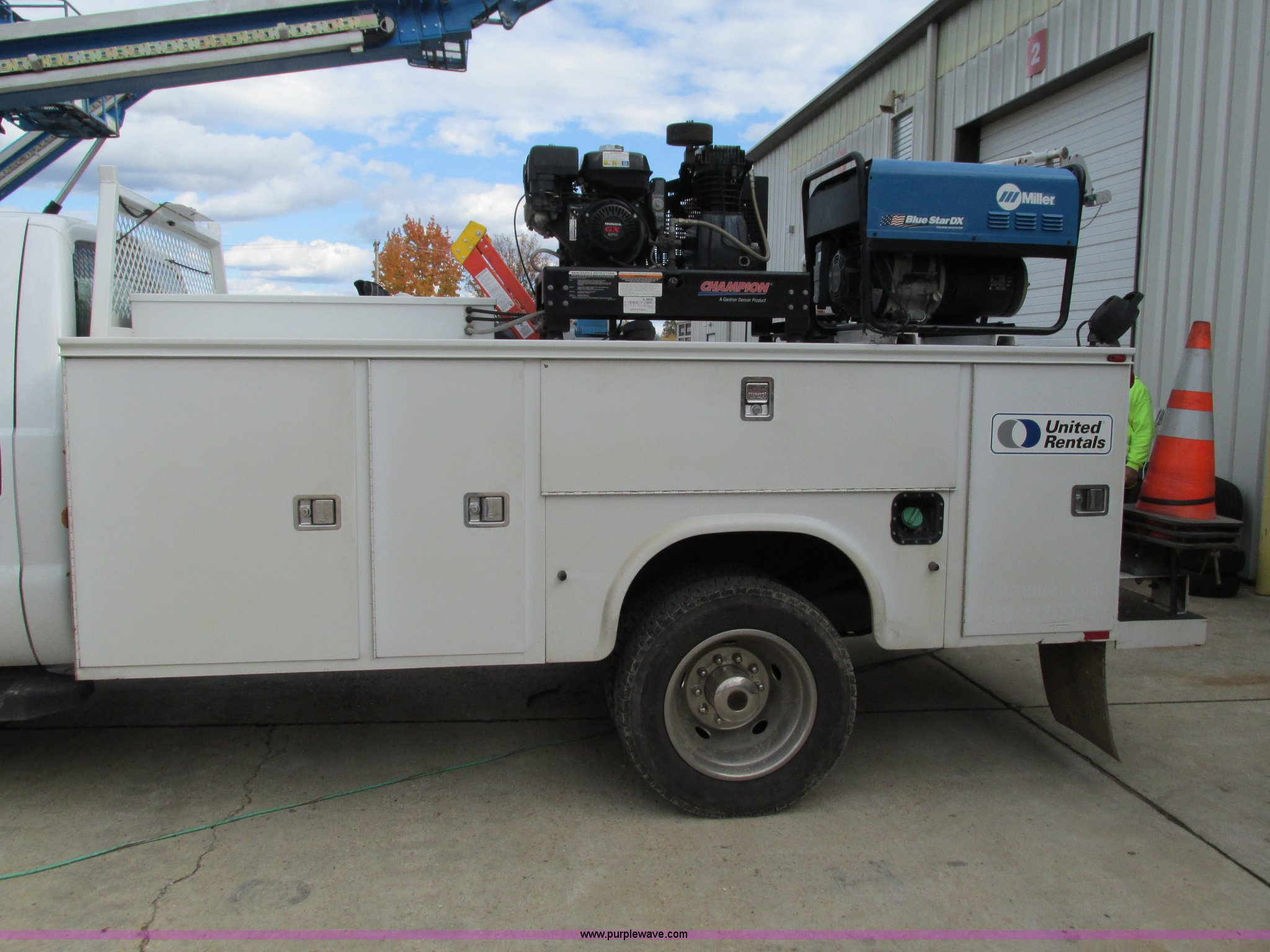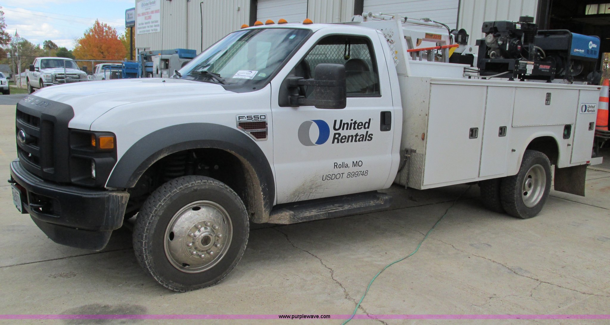 2008 Ford F550 Super Duty service truck with crane. 135,849 miles on odometer Miles may vary, still in use, 6.4L V8 OHV 32V turbo diesel engine, Automatic transmission, Four wheel drive, AC and heat, Tilt, Cruise, AM/FM/CD, Manual windows and locks, Vinyl interior, Headache rack, (3) oil/hydraulic tanks Graco FireBall air power pumps, (3) hose reels Grease, hydraulic oil, and oil, Front tow hooks, Air hose reel, Stellar 3315 crane 3,000 lbs capacity, Serial ECW08874, Miller Blue Star 185 welder Kohler 12.75 HP engine, Champion air compressor Model AS2-SH09-CHP, Honda GX270 engine, Electric start, Serial 20084983, Rear bumper vise, Receiver hitch, Trailer wiring, 225/70R19.5 tires, Interior/exterior cosmetic damage, Seat damage, Rear work light broken, Contents not included, EIN 762142RA. Title distribution may be delayed up to 30 days from verification of funds. 1FDAF57R48EE12713. United Rentals - Rolla. 1326 South Bishop Rd. Rolla, MO 65401