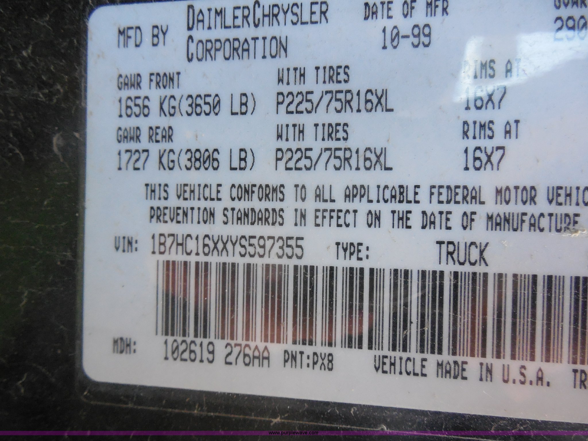 Purple Wave is selling a used Wrecked and Abandoned in Kansas. This item is a 2000 Dodge Ram 1500 pickup truck with the following: Unknown miles on odometer, 3.9L V6 OHV 12V gas engine, Automatic transmission, AC and heat, AM/FM/cassette, Manual windows and locks, Cloth interior, Receiver hitch, Trailer wiring, Headache rack, Ladder rack, 255/70R16 tires, Interior/exterior cosmetic damage, Case# 13C55901