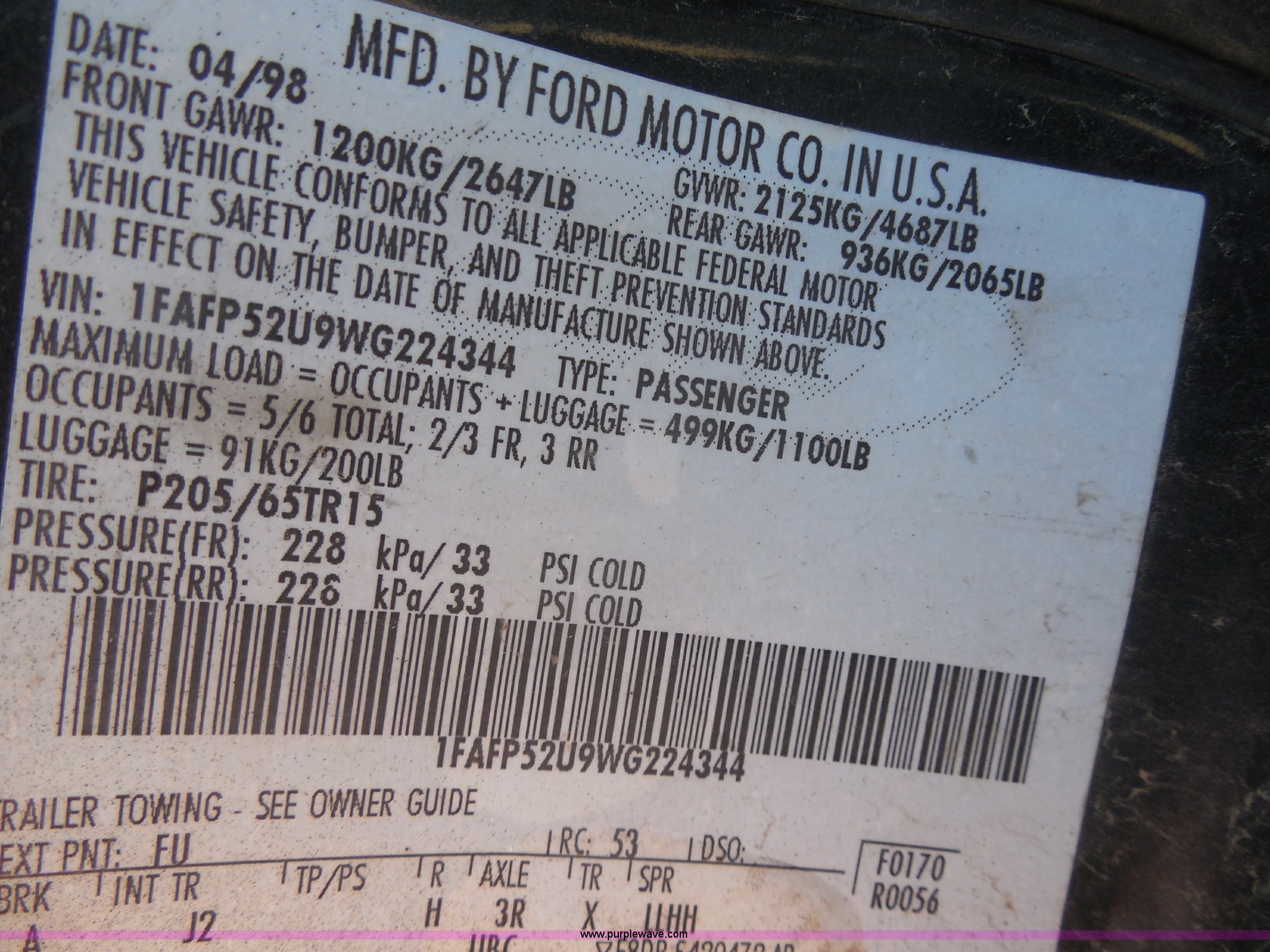 Purple Wave is selling a used Wrecked and Abandoned in Kansas. This item is a 1998 Ford Taurus LX with the following: 160, 851 miles on odometer, Not actual mileage, 3.0L V6 OHV 12V gas engine, Automatic transmission, AM/FM/CD, 205/70R15 tires, Case# 13C60532