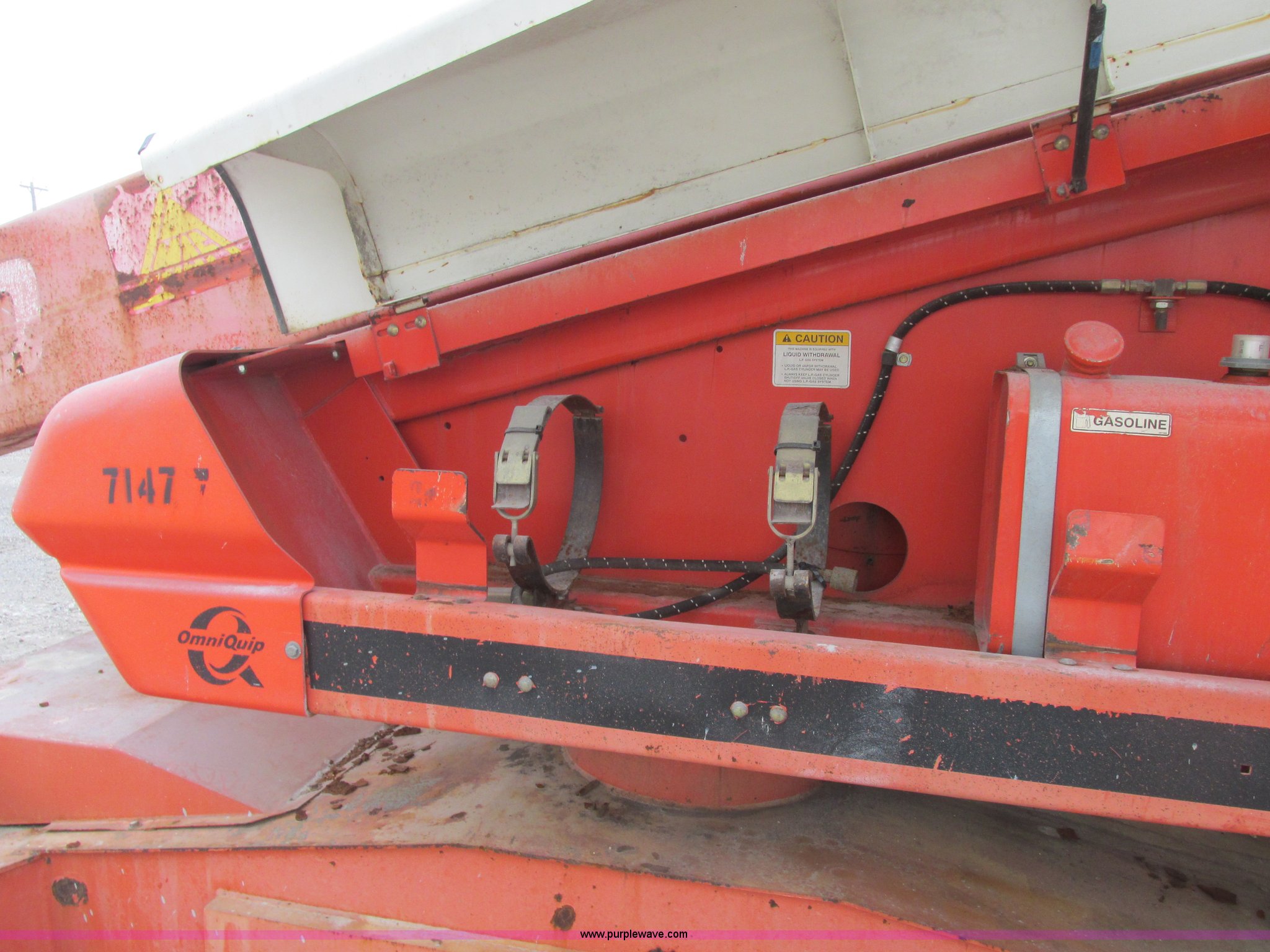 2001 Snorkel TB60 boom lift. 2,762 hours on meter, Ford four cylinder dual fuel gas or LP engine Serial 90178-1-11-00, Hydrostatic transmission, Four wheel drive, Rotating platform, 8'W platform, 60' max platform height, 49.9' max horizontal reach, 500 lbs lift capacity, (3) boom sections, 30.8'L x 8.2'W x 8.9'H overall, Adjustable boom speed, Ground and platform controls Ground control main boom elevation and turn table swing inoperable, Strobe light, Tie downs, 40 gallon fuel tank, 15 x 19.5 foam filled tires, 20,699 lbs. base operating weight, Front nose plastic housing cracked, Turntable drive motor gear missing three teeth, Unit# 7147. View equipment video. 6905 N 94th Plz. Omaha, NE 68122