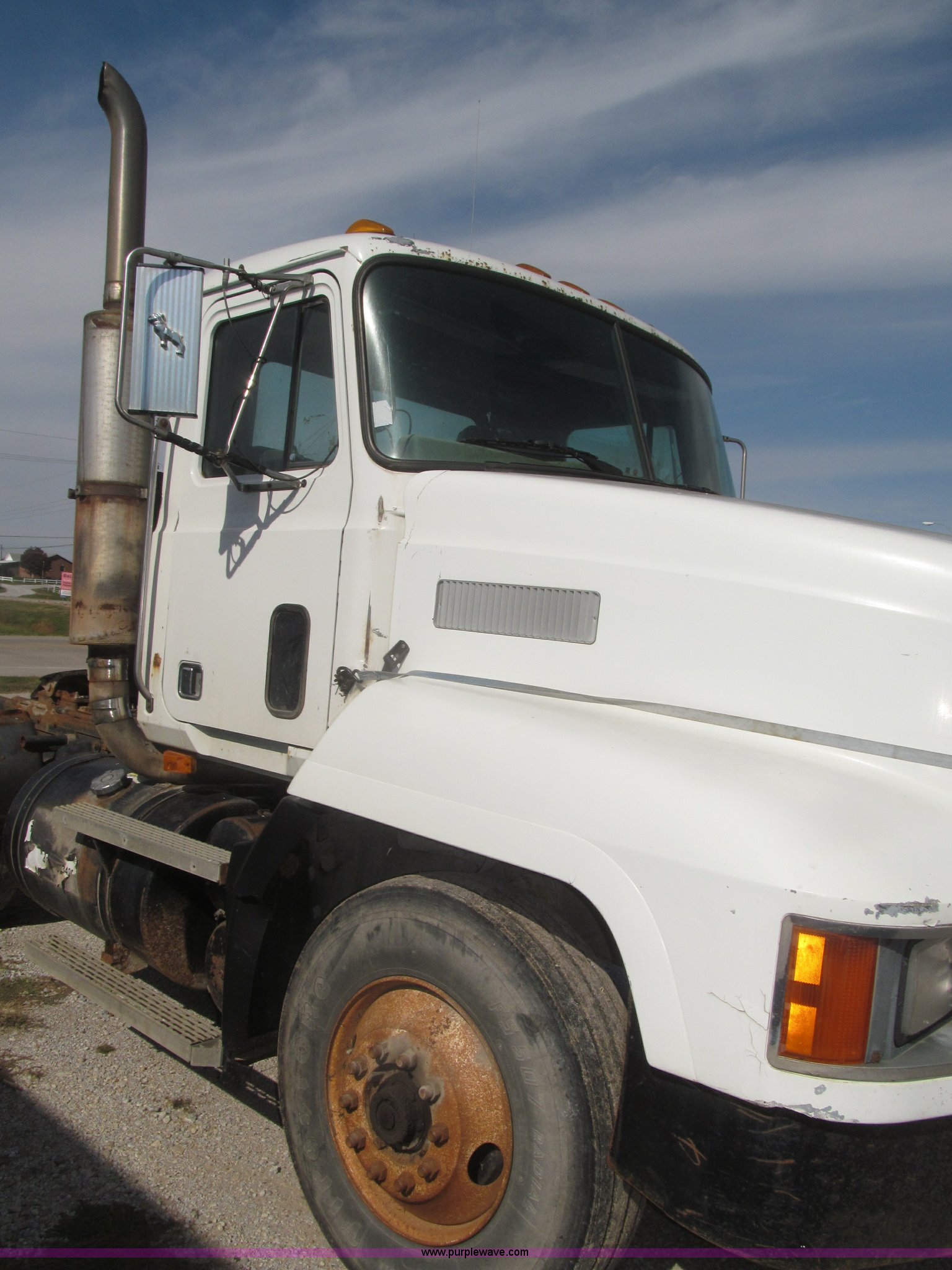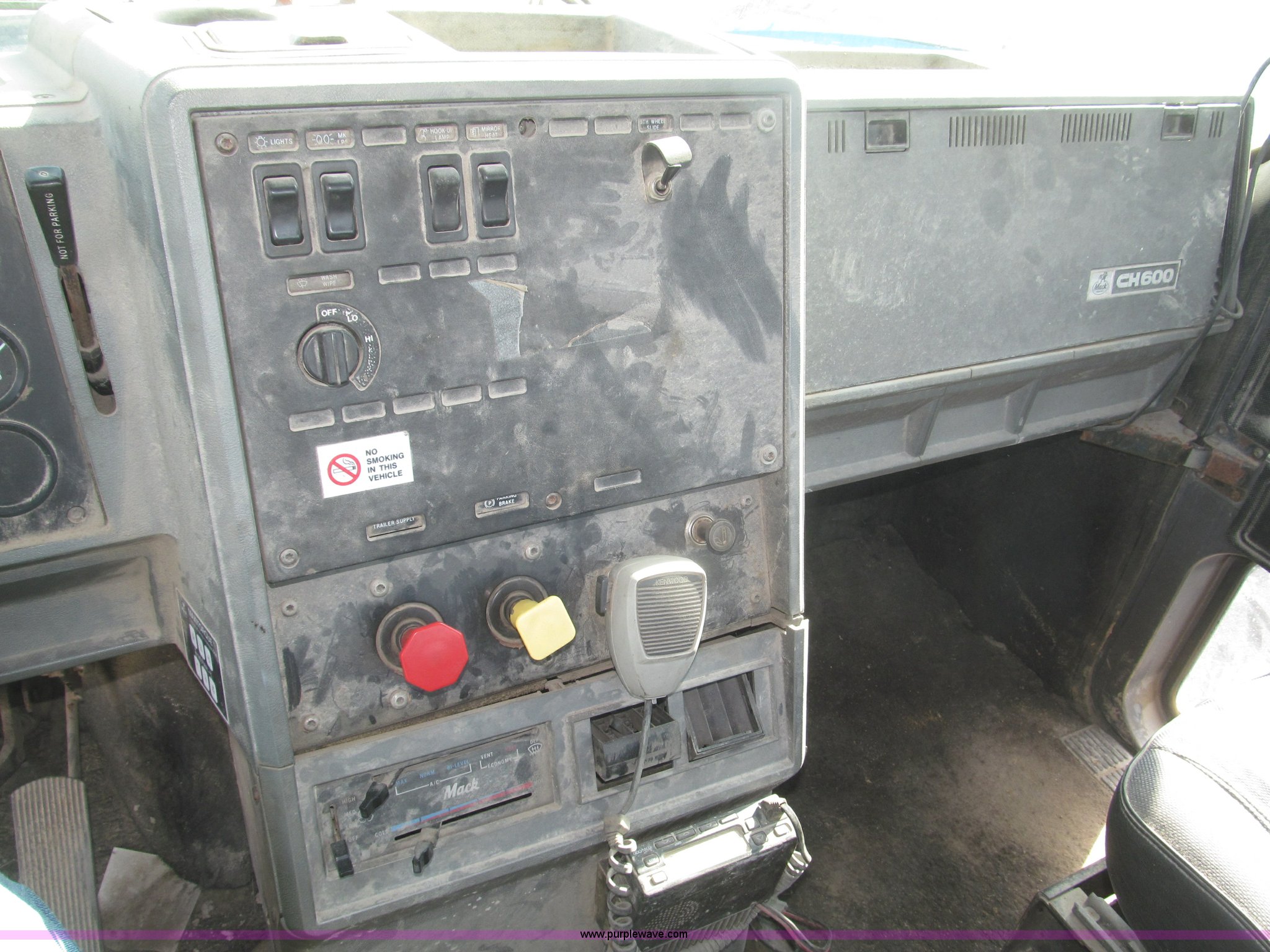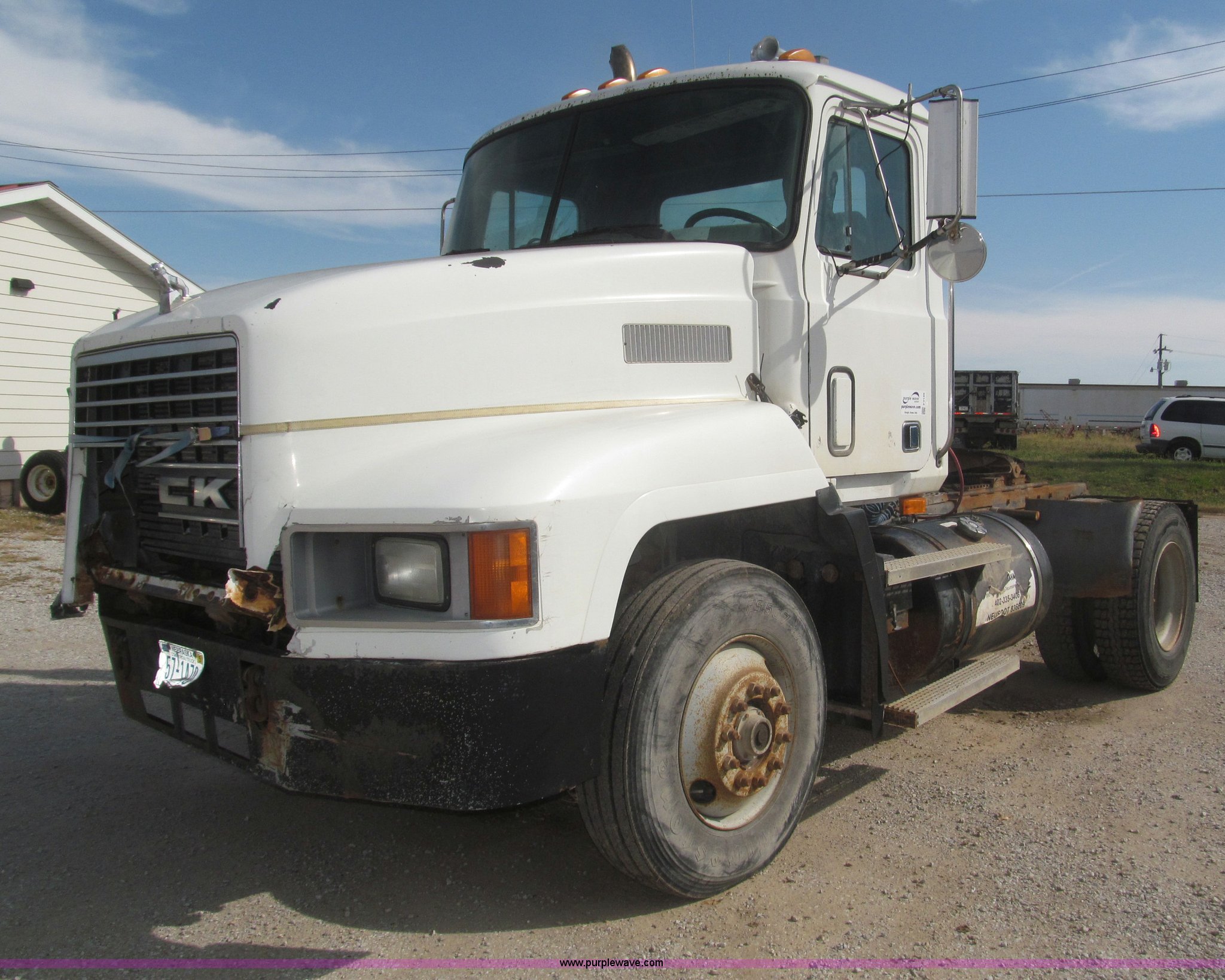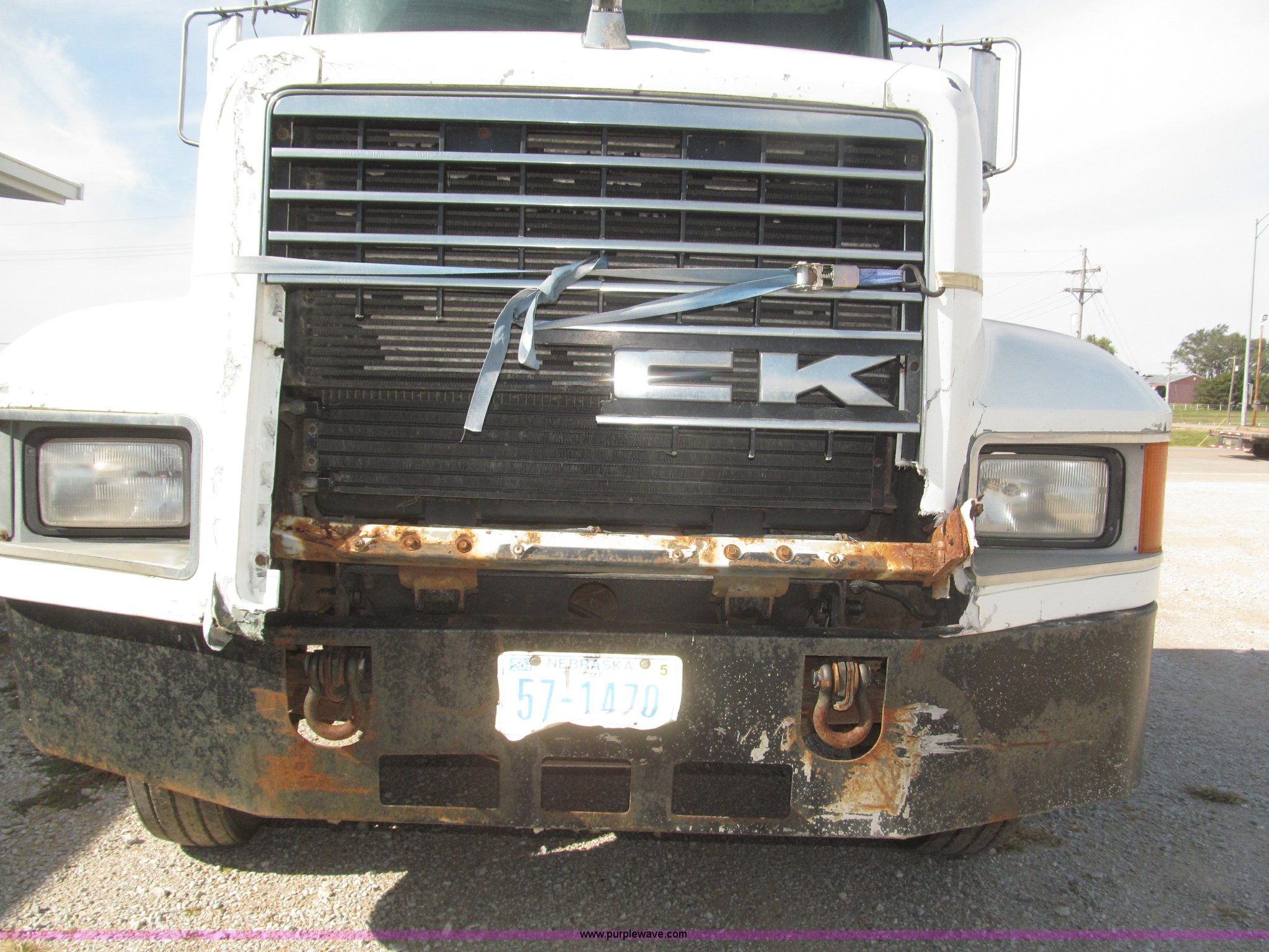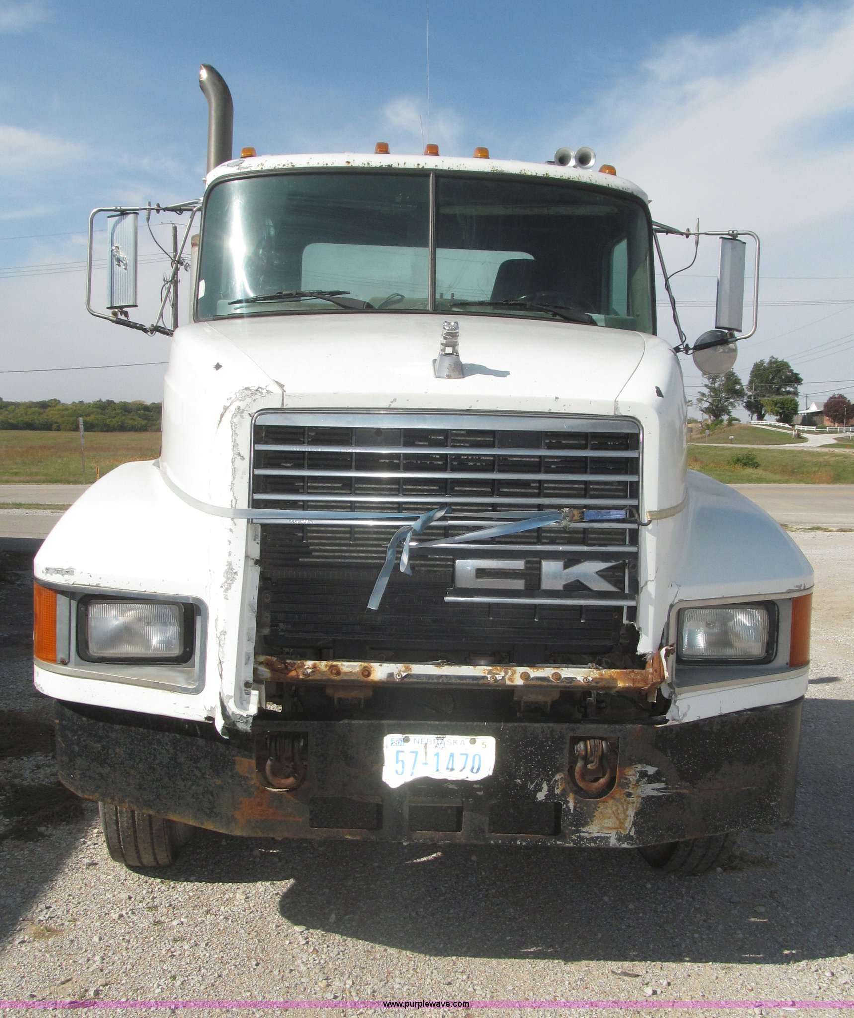 Purple Wave is selling a used Truck Chassis in Nebraska. This item is a 1990 Mack CH612 semi truck with the following: 581,711 miles on odometer, Mack E6 11.0L L6 turbo diesel engine, Serial 061724, Maxitorqe T2050 five speed manual transmission, AC and heat, Panasonic AM/FM/cassette, Dual air suspension seats, Air ride cab, Heated mirrors, Passenger daylight door, 14 gauge instrument panel, Kenwood CB radio, Block heater, Powered fifth wheel slide, D-ring tow hooks, Passenger side air tanks, Steel quarter fenders, Damaged, Steel deck plate, Roof mounted clearance lights, Roof mounted horn, Fire extinguisher, Highway safety triangles, Spring suspension, Air brakes, 145" wheelbase, 11R22.5 tires, Grill replacement behind set, Hood strapped on, Rear exterior cab work light broken, Driver's side windshield cracked, Steering wheel broken, Operable, Driver's seat torn
