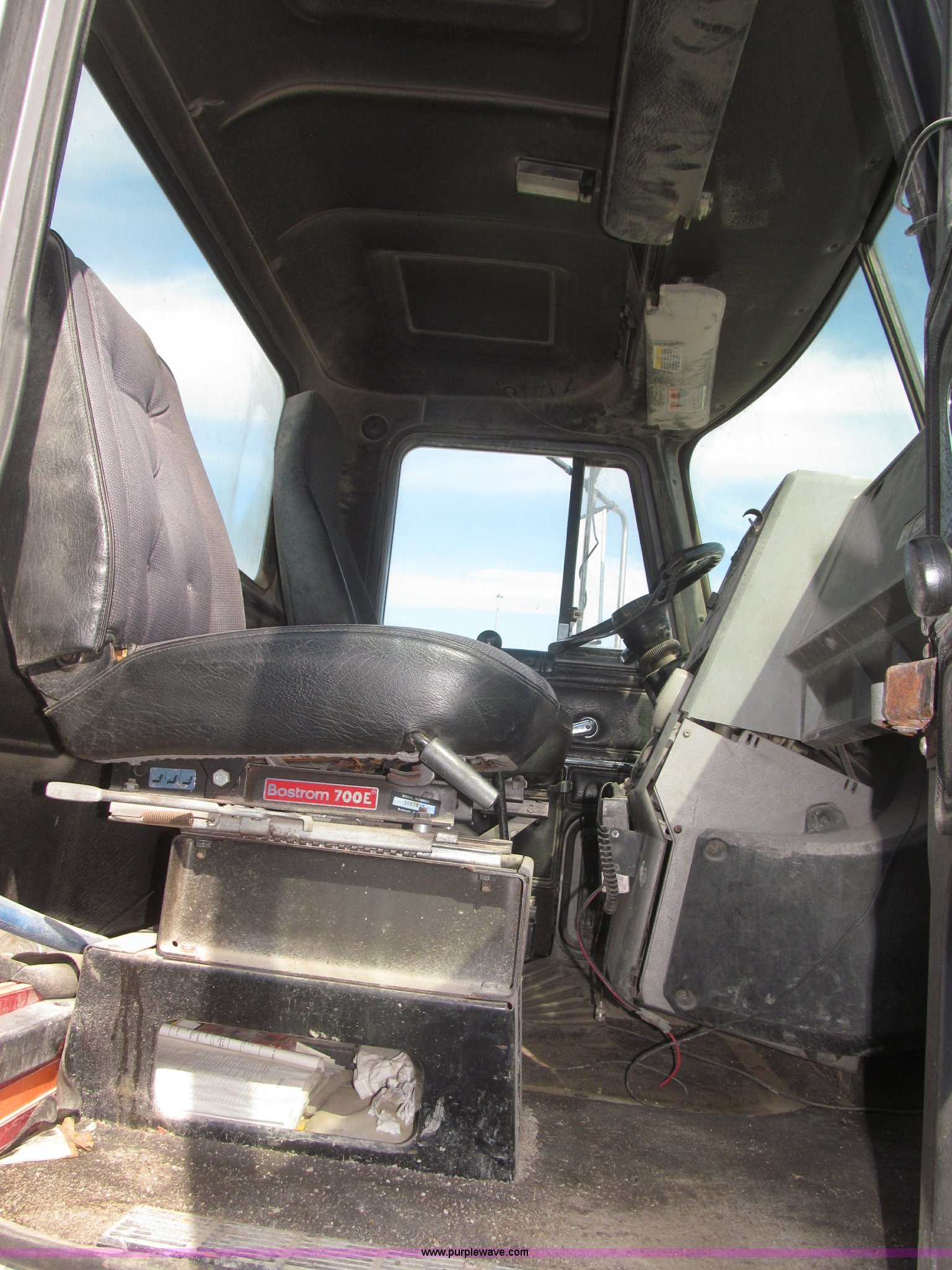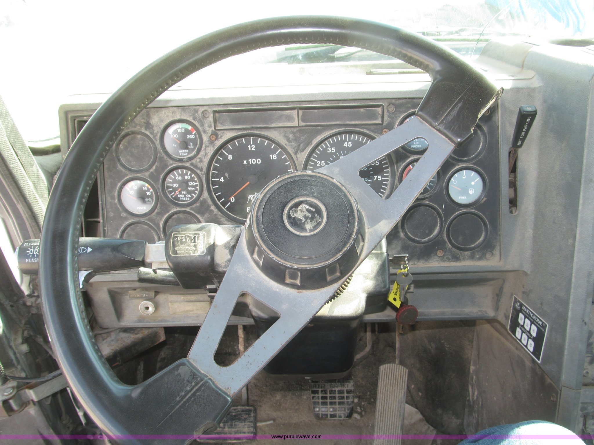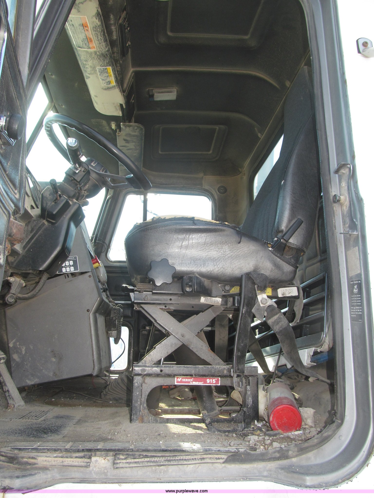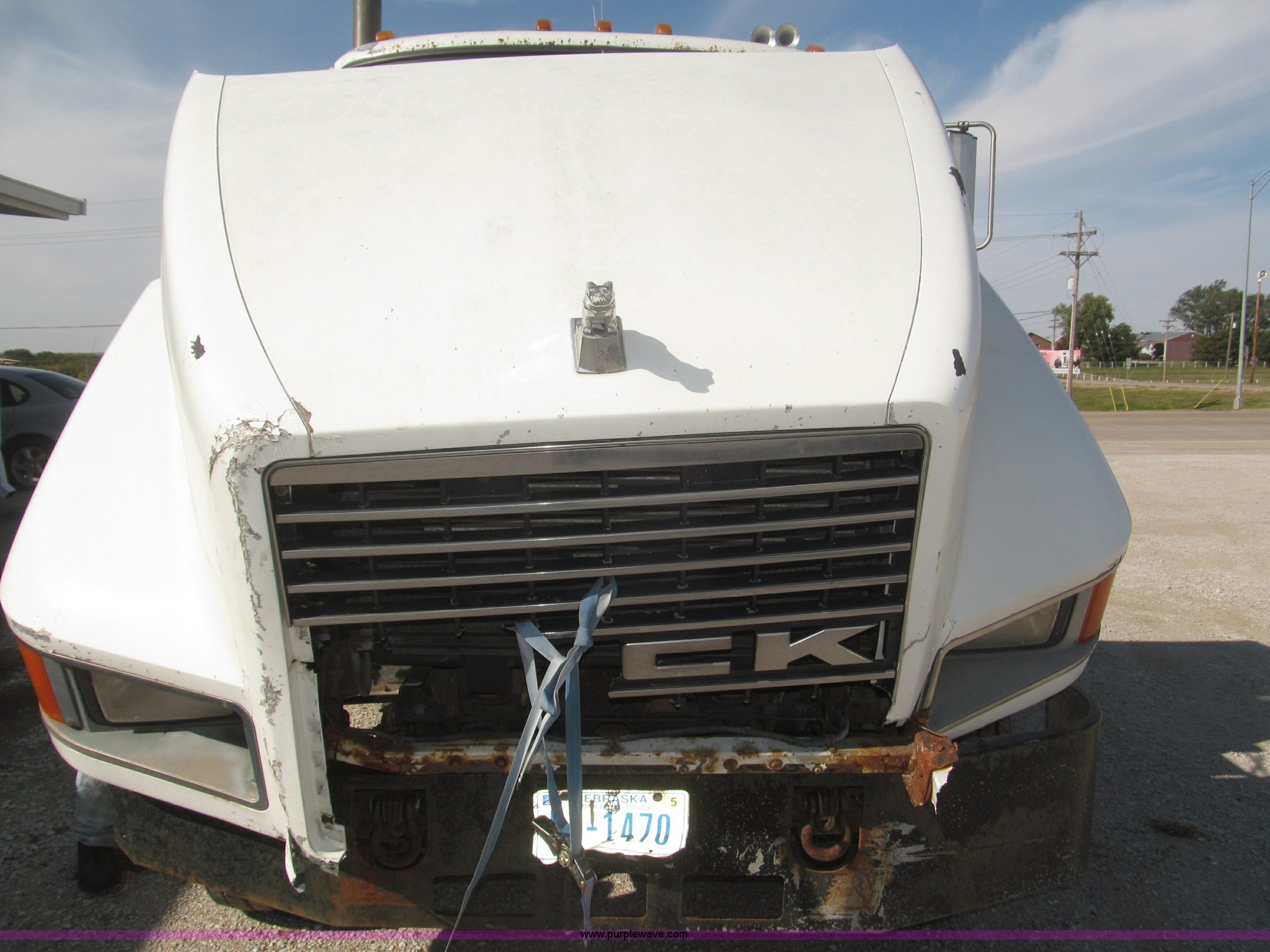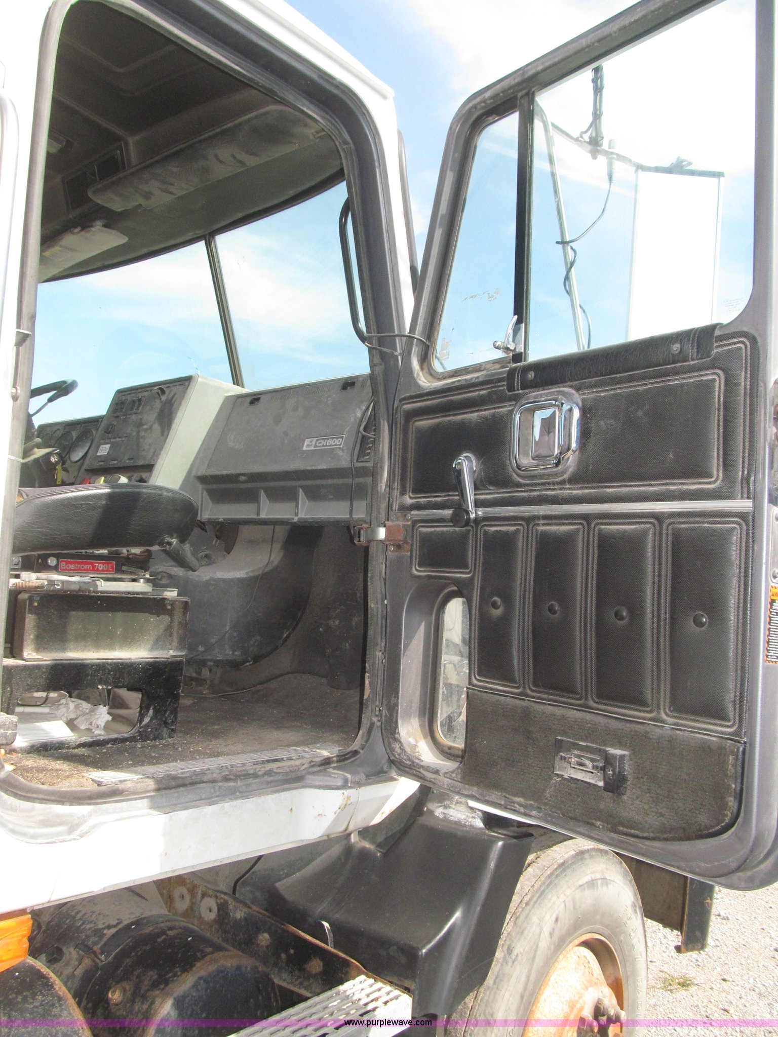 Purple Wave is selling a used Truck Chassis in Nebraska. This item is a 1990 Mack CH612 semi truck with the following: 581,711 miles on odometer, Mack E6 11.0L L6 turbo diesel engine, Serial 061724, Maxitorqe T2050 five speed manual transmission, AC and heat, Panasonic AM/FM/cassette, Dual air suspension seats, Air ride cab, Heated mirrors, Passenger daylight door, 14 gauge instrument panel, Kenwood CB radio, Block heater, Powered fifth wheel slide, D-ring tow hooks, Passenger side air tanks, Steel quarter fenders, Damaged, Steel deck plate, Roof mounted clearance lights, Roof mounted horn, Fire extinguisher, Highway safety triangles, Spring suspension, Air brakes, 145" wheelbase, 11R22.5 tires, Grill replacement behind set, Hood strapped on, Rear exterior cab work light broken, Driver's side windshield cracked, Steering wheel broken, Operable, Driver's seat torn