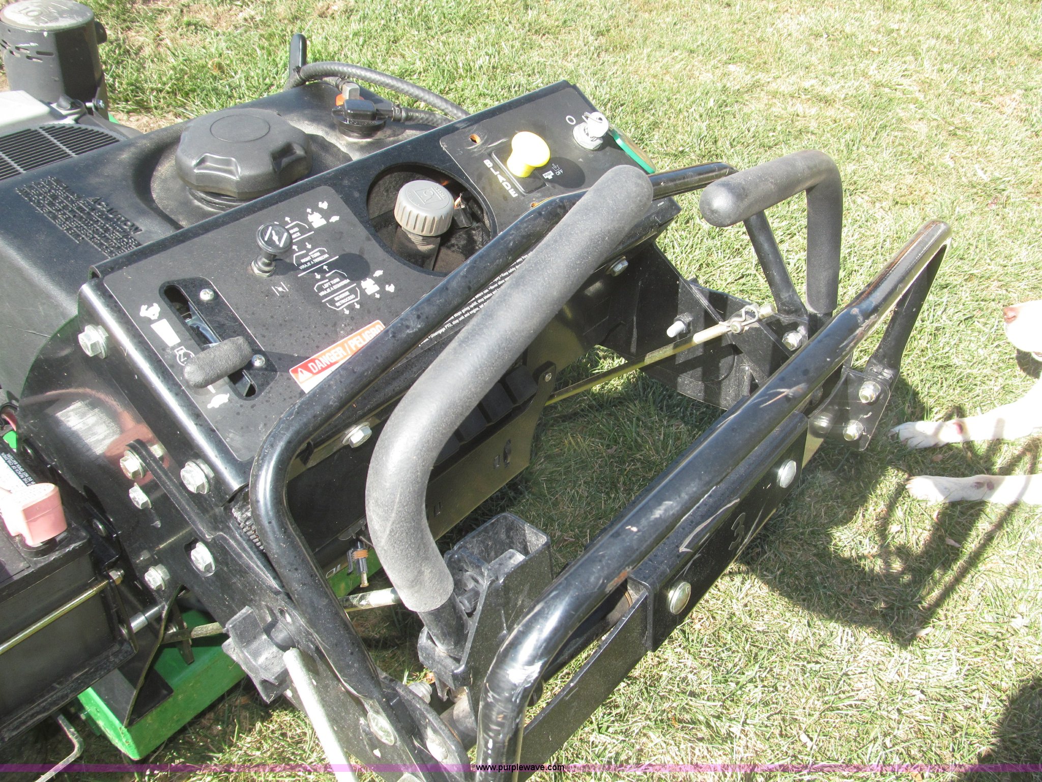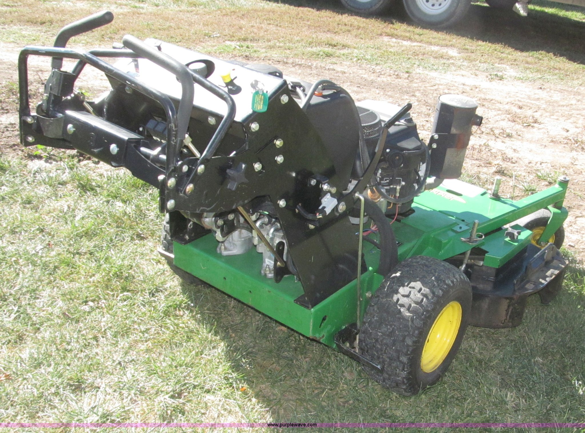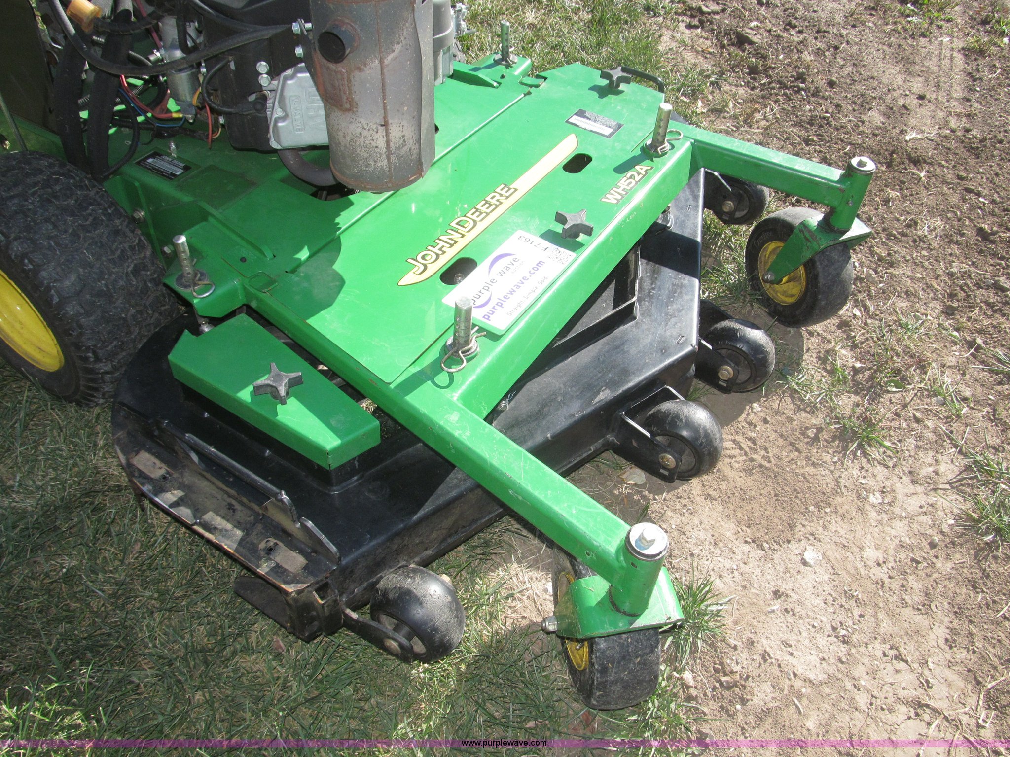 Purple Wave is selling a used Commercial Turf Mower in Nebraska. This item is a John Deere WH52A lawn mower with the following: 52" cut, Kawasaki OHV V-twin 20 HP gas engine, Serial FS600VA02626, Hydra Gear PG-1HDA-D41X-XXX hydrostatic drive, Three blade steel deck, 1 1/2" to 4" height adjustment, Front mounted guide wheels, Top fill rear mounted gas tank, 9-3.50-4 NHS swivel tires, 16 x 7.50-8 turf drive tires, No discharge chute, Serial XTCWH52000006