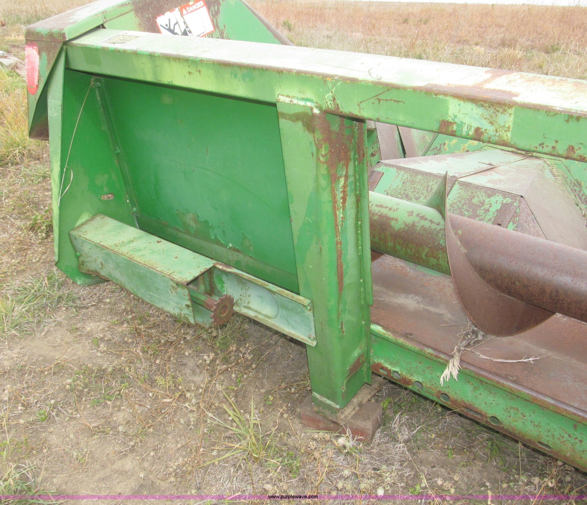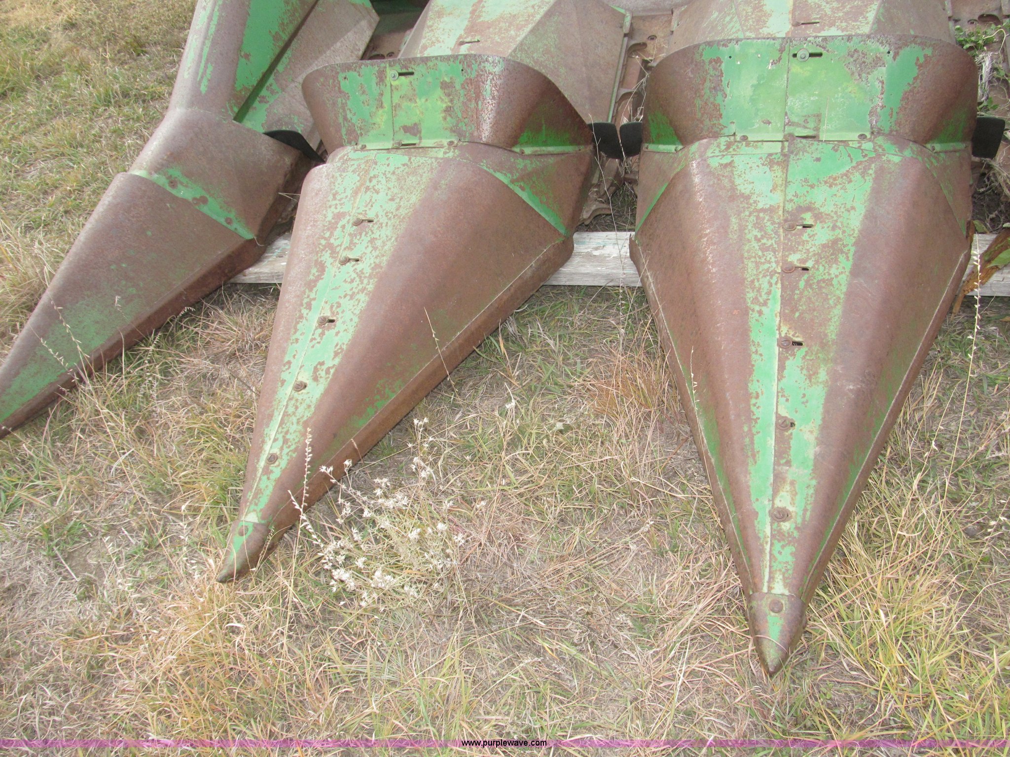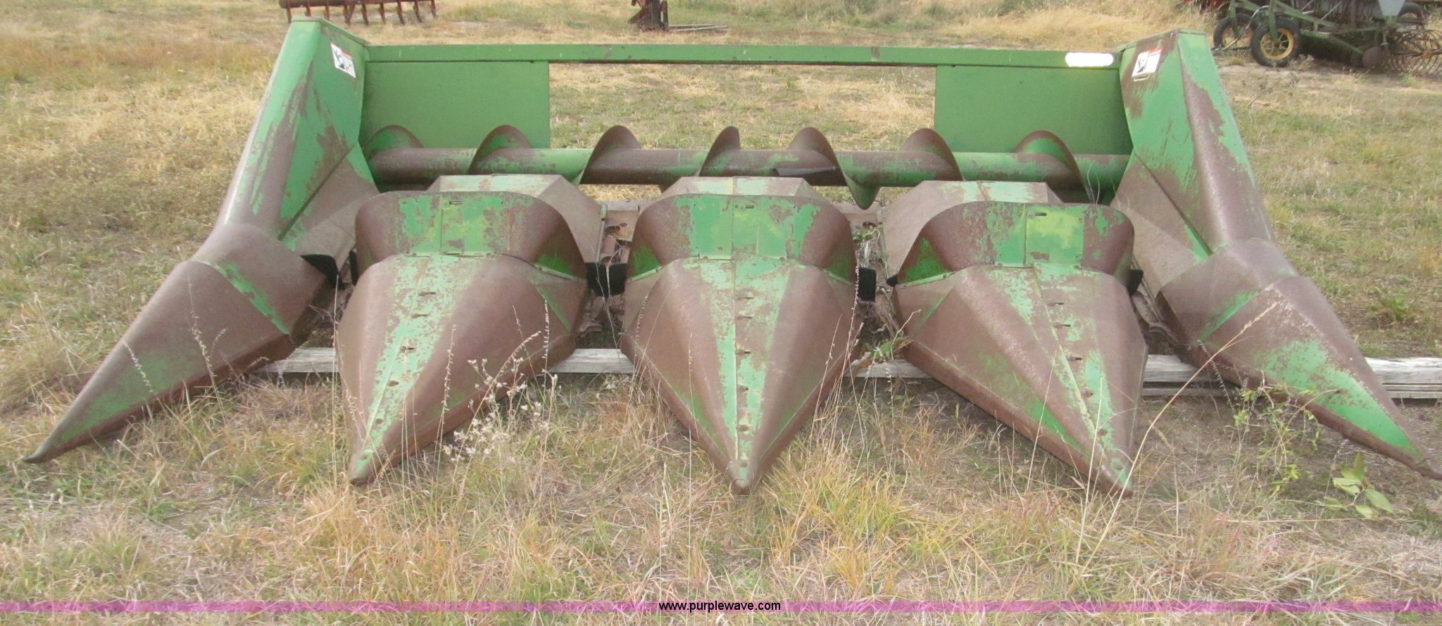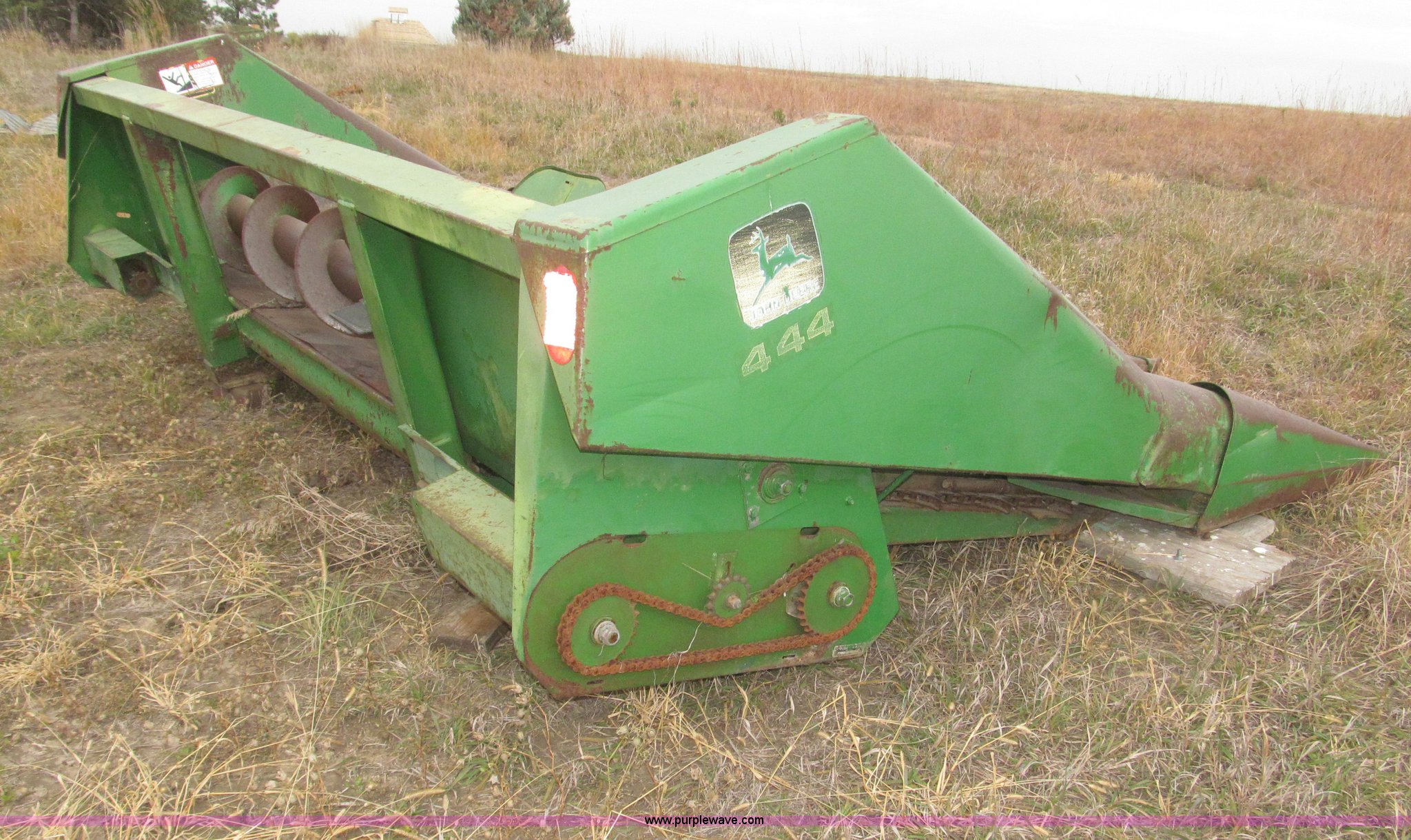 Purple Wave is selling a used Corn or Row Head in Nebraska. This item is a John Deere 444 corn header with the following: Four row, 38" spacing, Metal snouts, Side guards missing