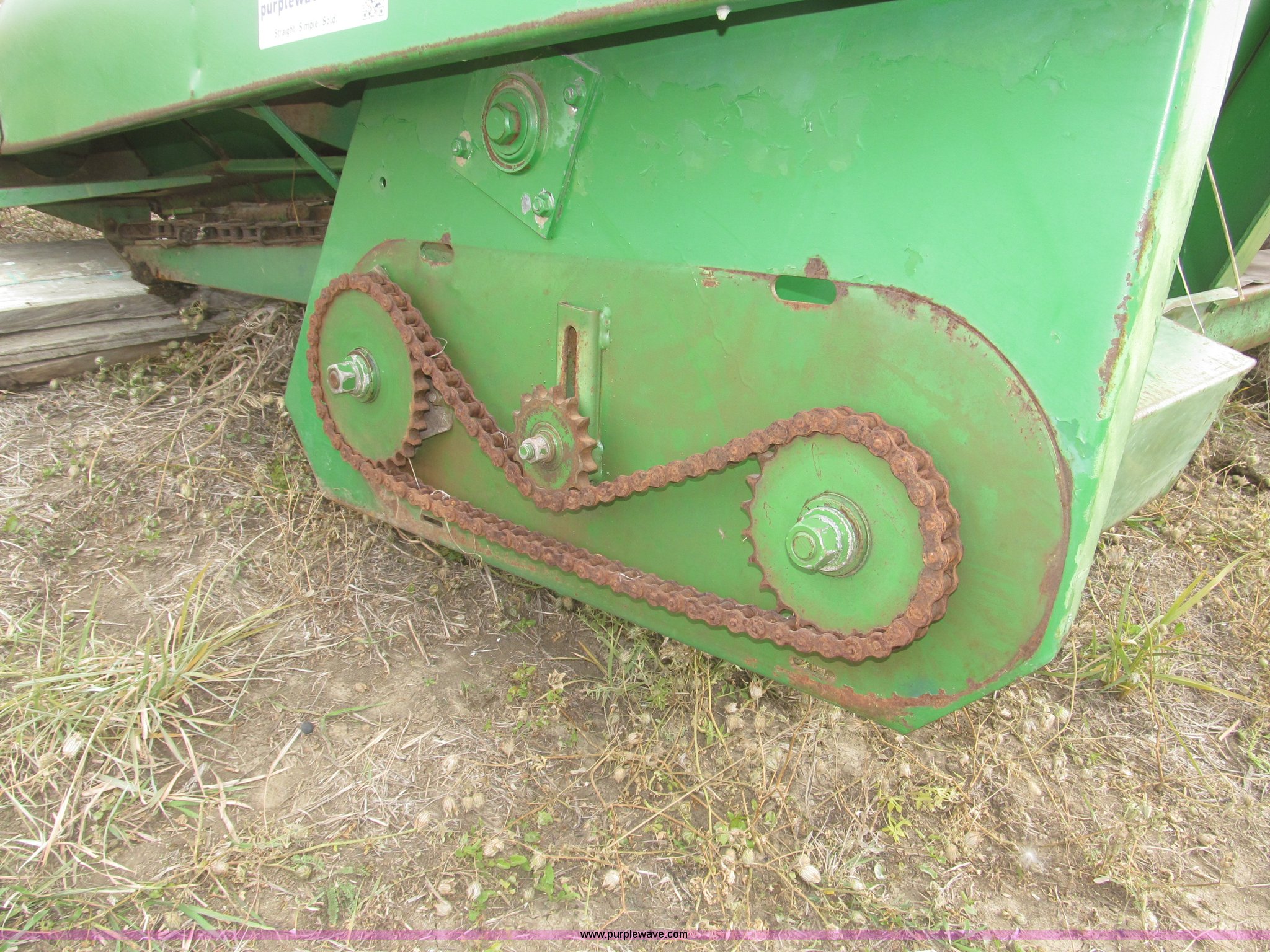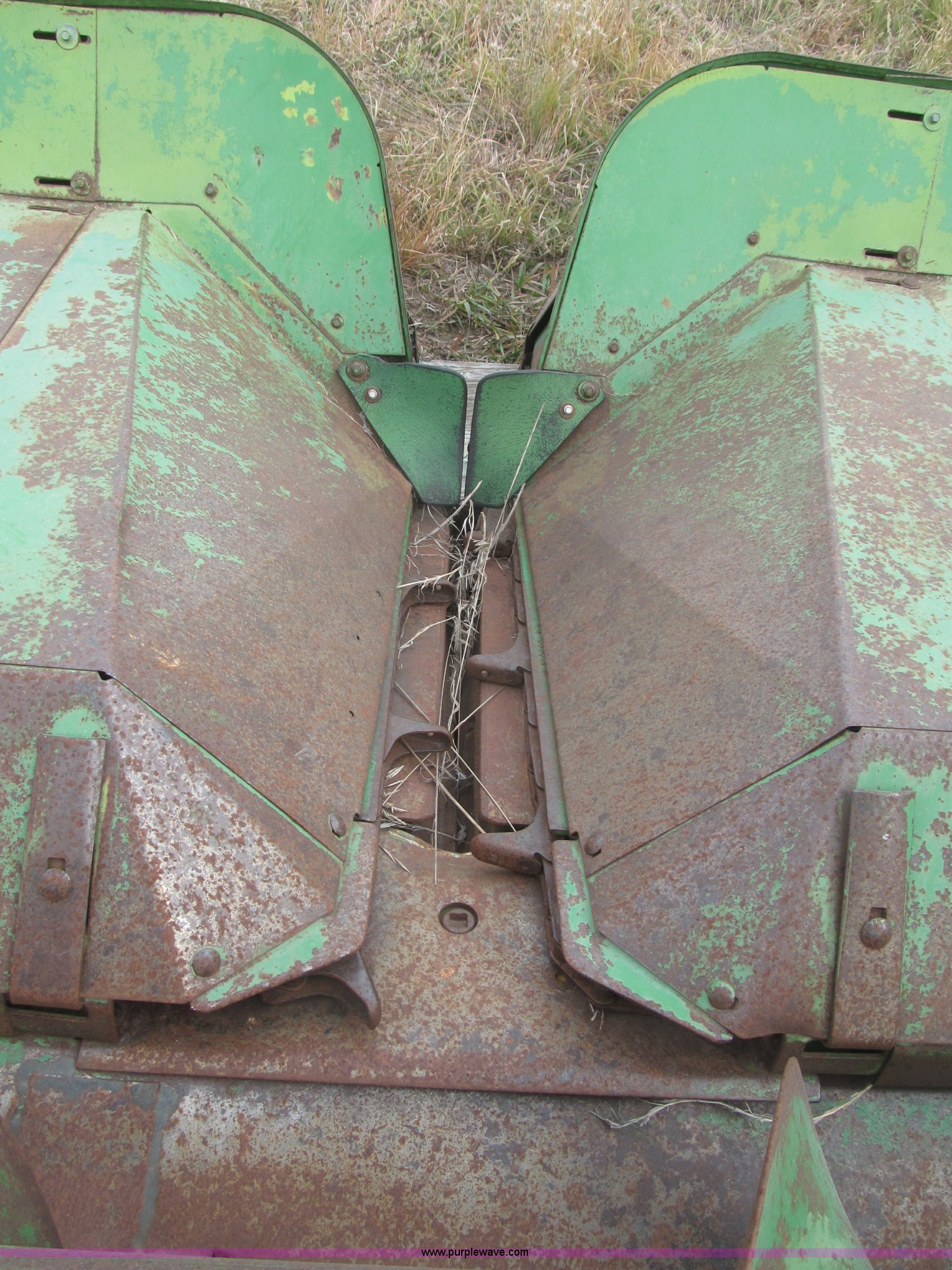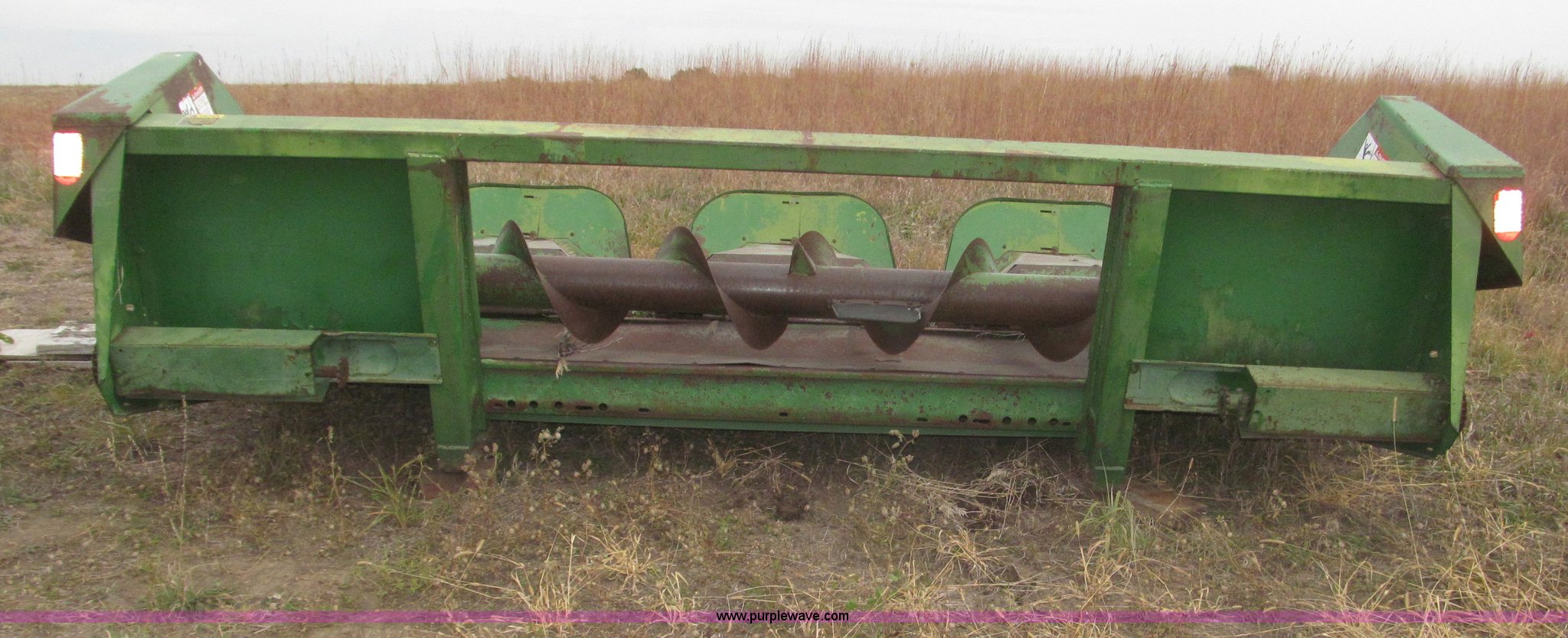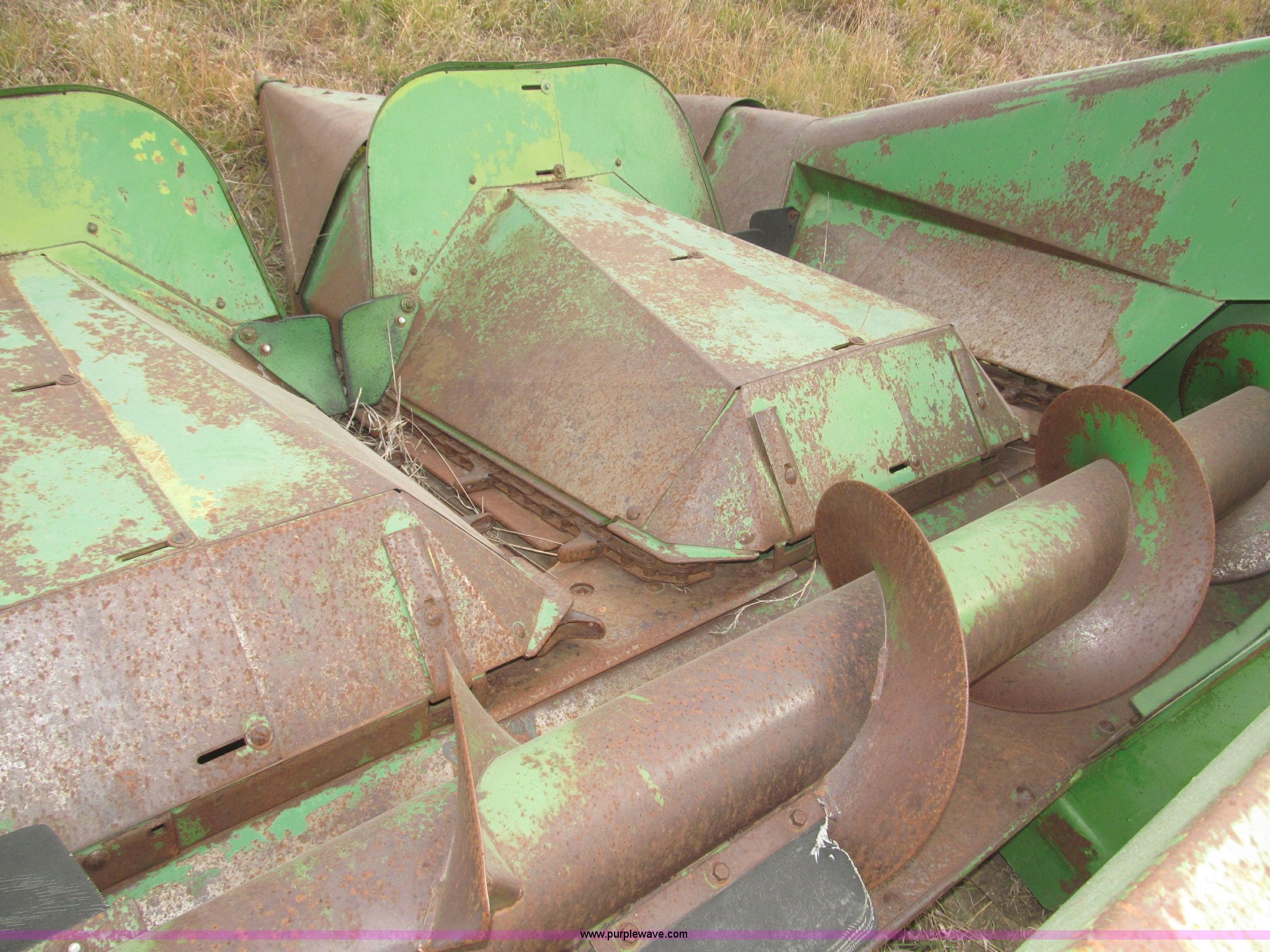 Purple Wave is selling a used Corn or Row Head in Nebraska. This item is a John Deere 444 corn header with the following: Four row, 38" spacing, Metal snouts, Side guards missing