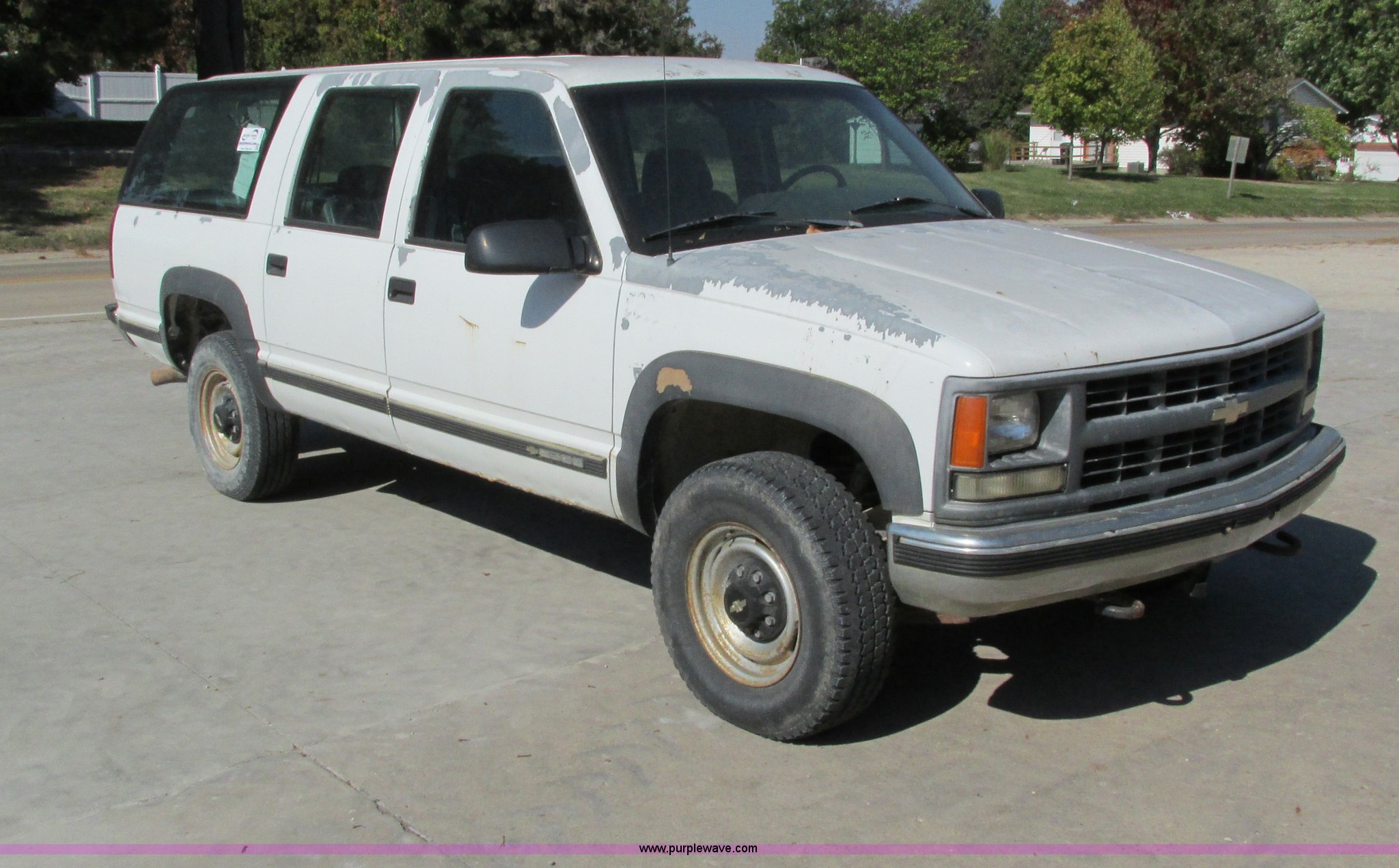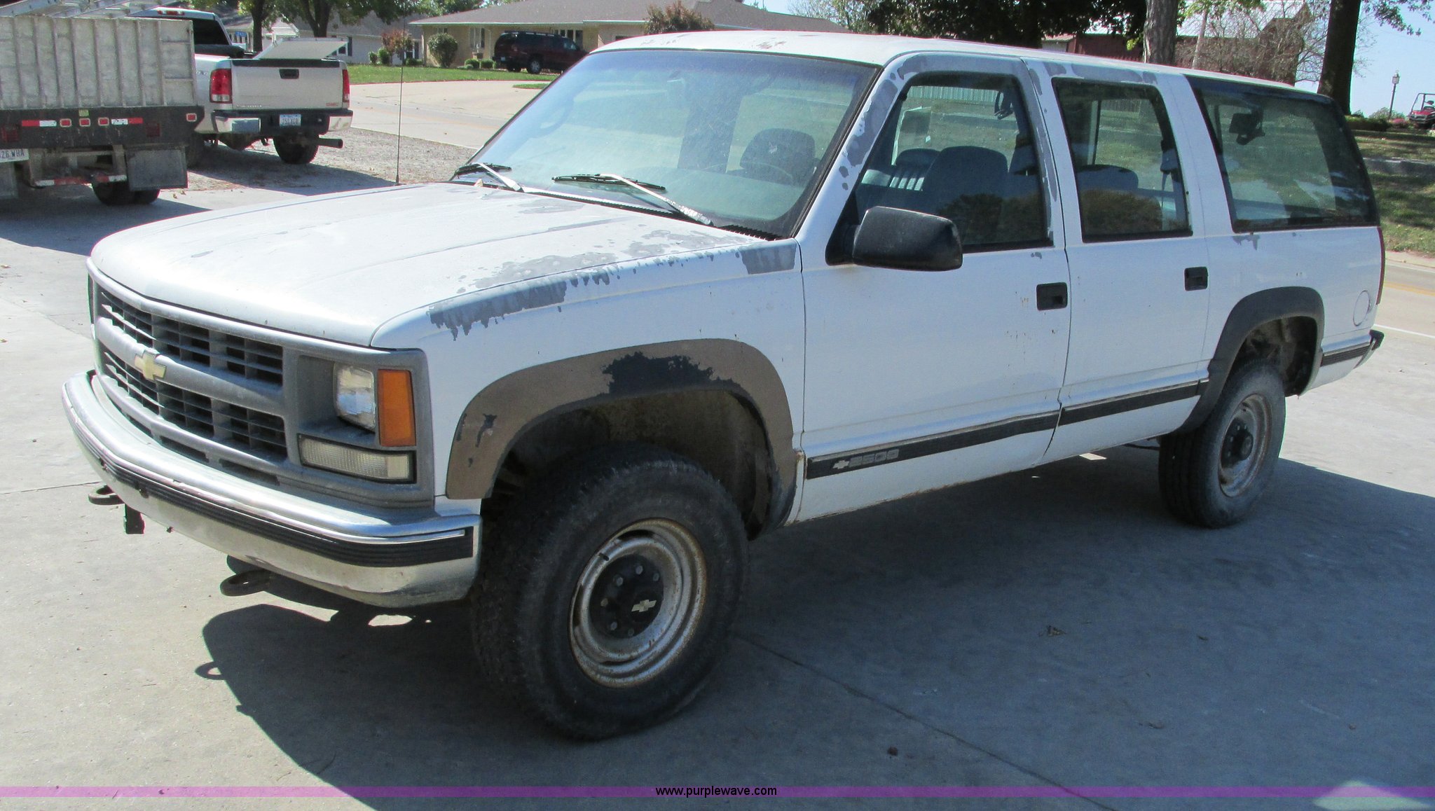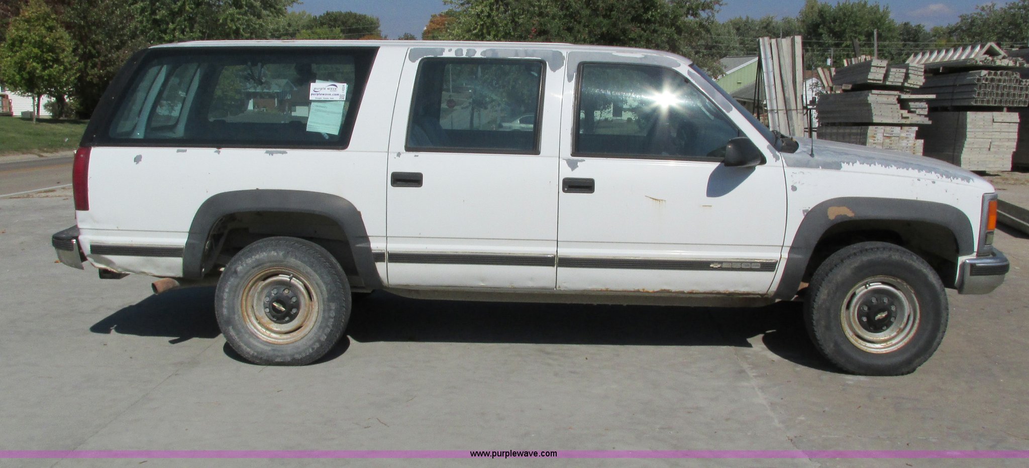 Purple Wave is selling a used Passenger Vehicle in Iowa. This item is a 1995 Chevrolet Suburban K2500 SUV with the following: 212,155 actual miles, 5.7L V8 OHV 16V gas engine, Automatic transmission, Four wheel drive, AC and heat, Tilt, Cruise, AM/FM, Manual windows and locks, Vinyl interior, Receiver hitch, Trailer wiring, LT245/75R16 tires, Windshield wipers inoperable