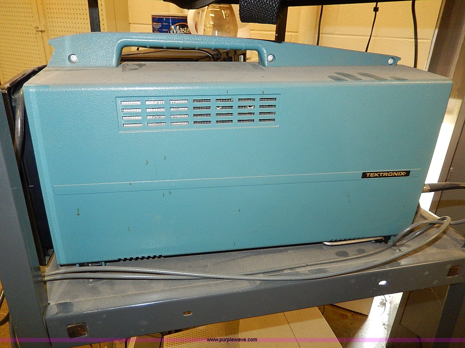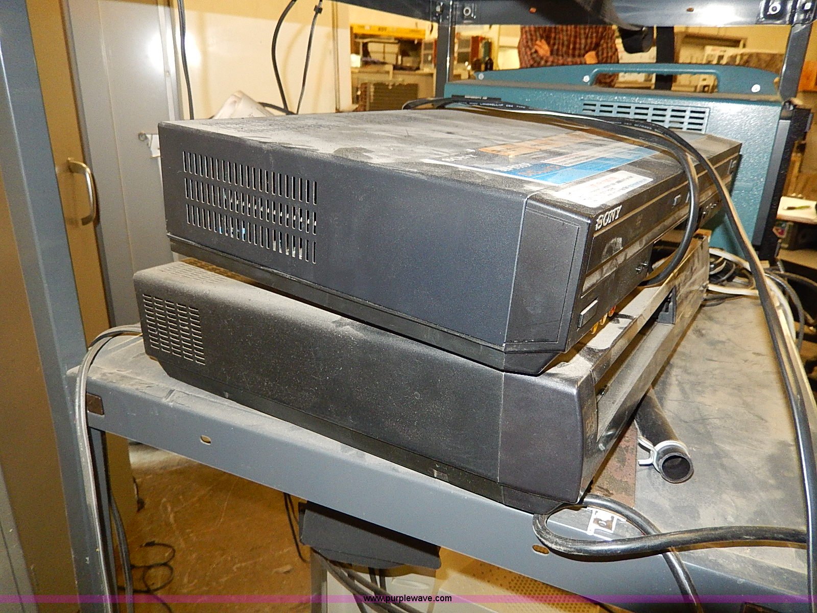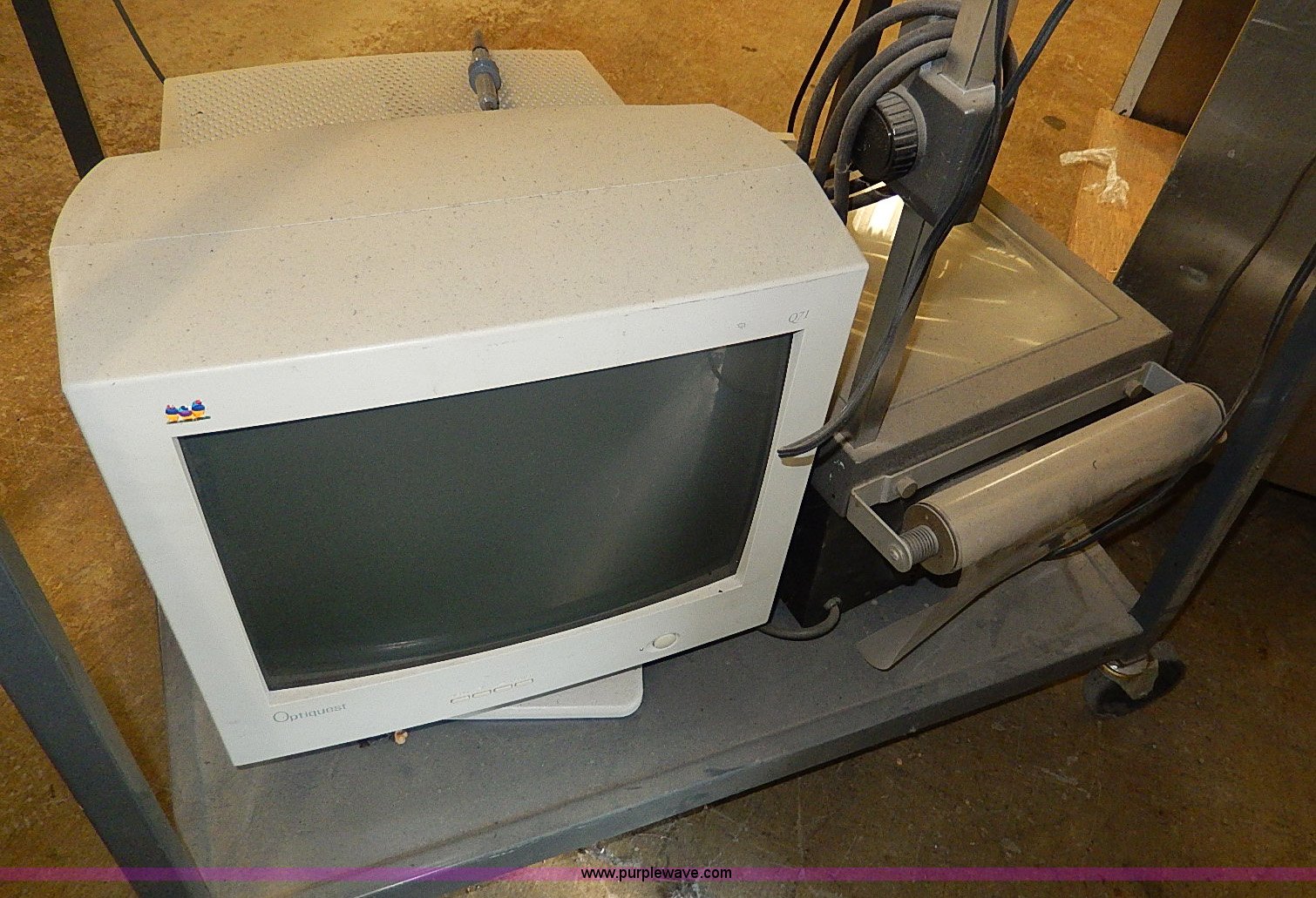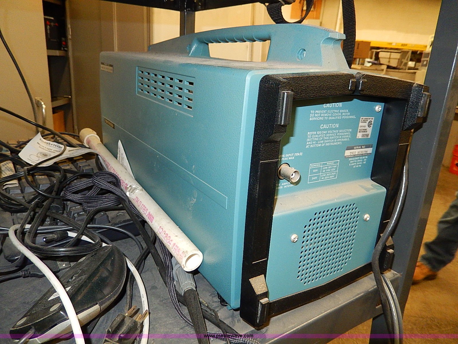 Purple Wave is selling a used Electronics in Kansas. This item is a Assorted electronics with the following: Sony 32" television, Power cord, Remote missing, Sony DVD/VHS player, Hitachi VHS player, Remote, Tek Tronix T922 oscilloscope, Serial T922B030196, Projector, Radio, Ootiquest monitor, Keyboard, Mouse, Dell DHP tower, (2) rolling carts