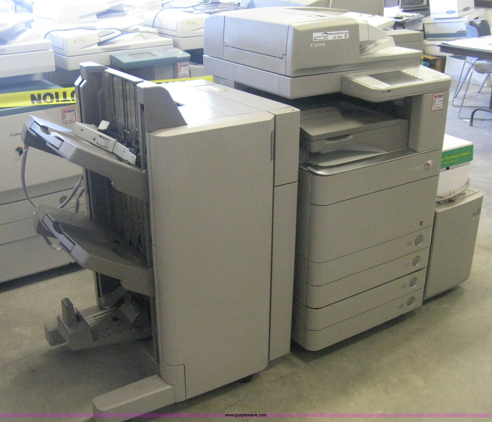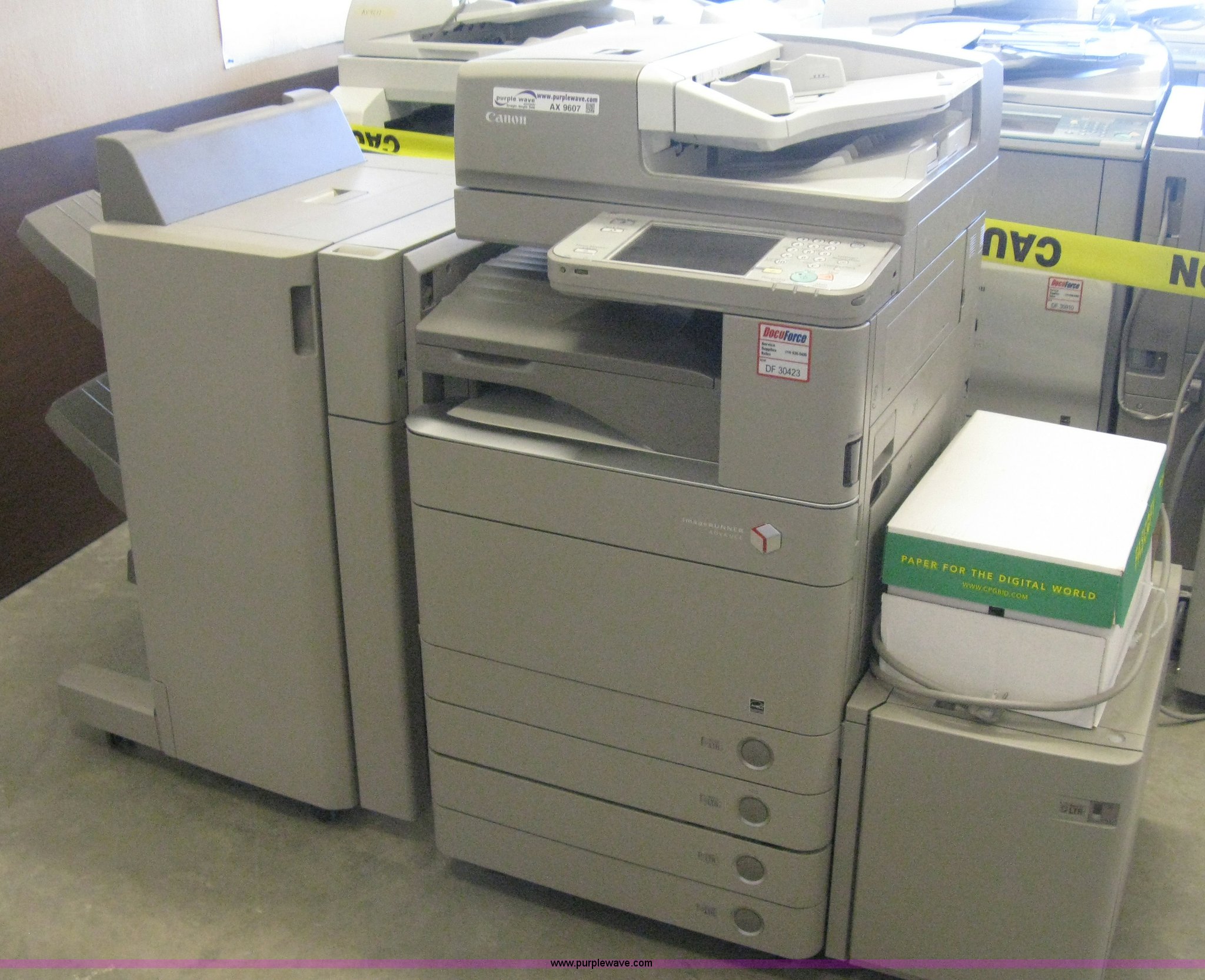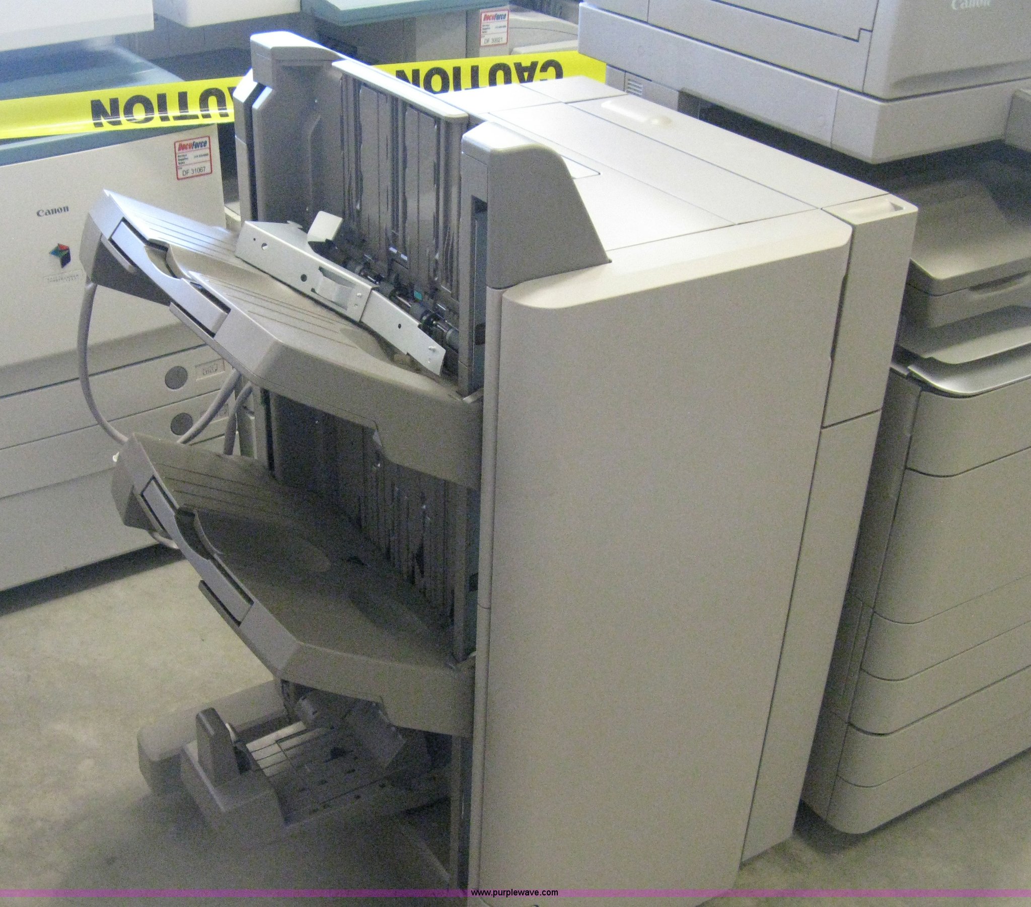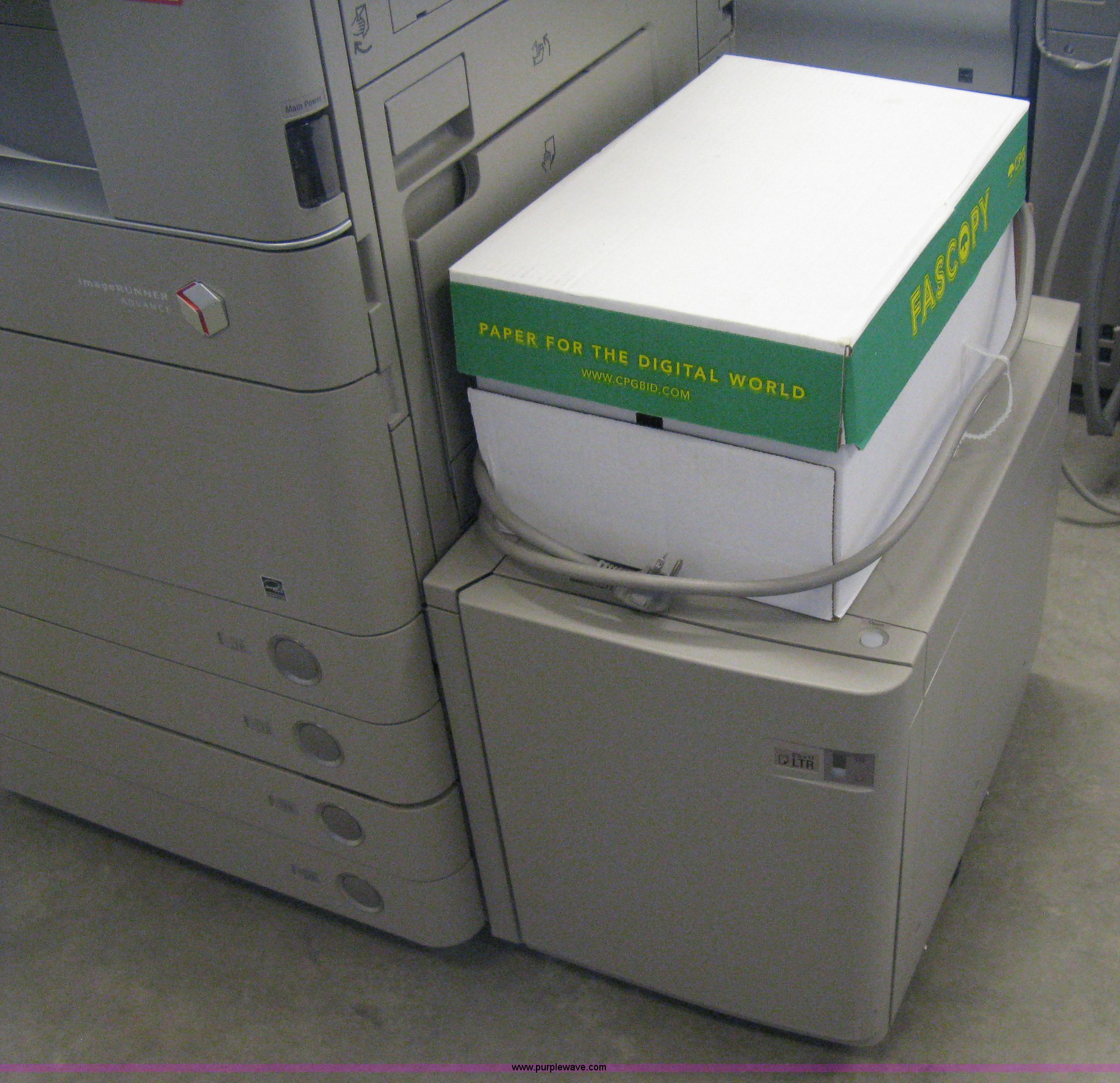 Purple Wave is selling a used Electronics in Kansas. This item is a Canon C5045 copier with the following: Punch/stapler/finisher, Hard drive erased, 45 copies per minute, 55,225 black copies on meter, 22,613 color copies on meter, Unit# 30423
