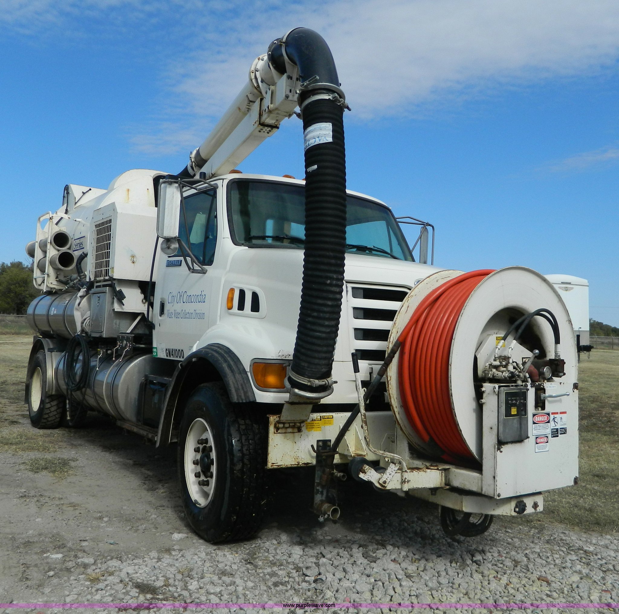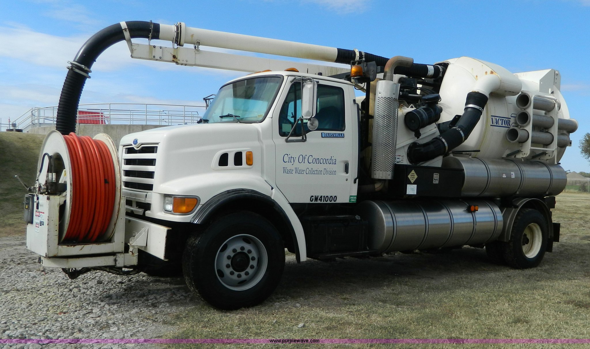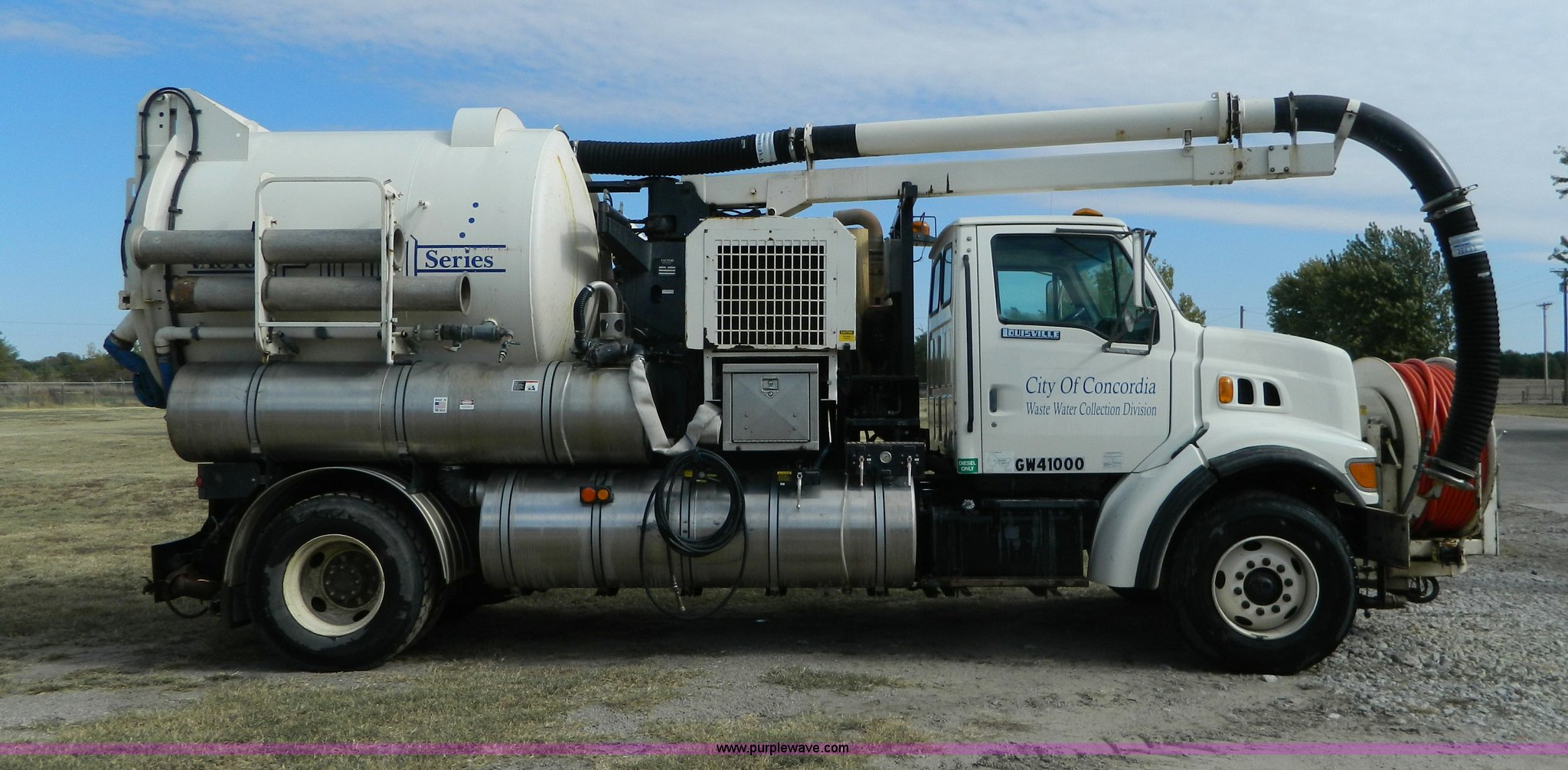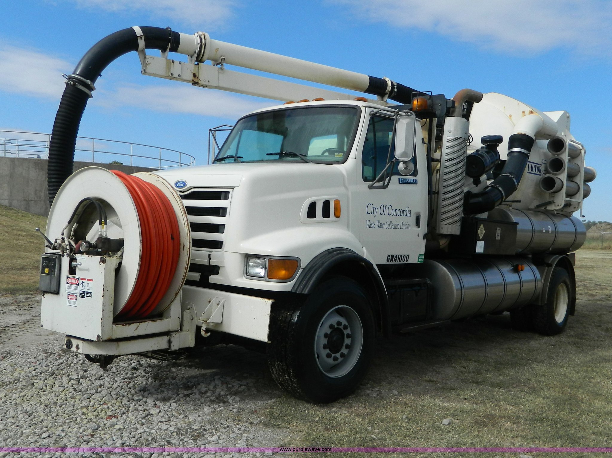 Purple Wave is selling a used Vacuum Truck in Kansas. This item is a 1997 Ford L8501 Louisville 101 sewer cleaning truck with the following: 61,150 miles on odometer, Cummins six cylinder diesel engine, Automatic transmission, Heat, Air ride driver's seat