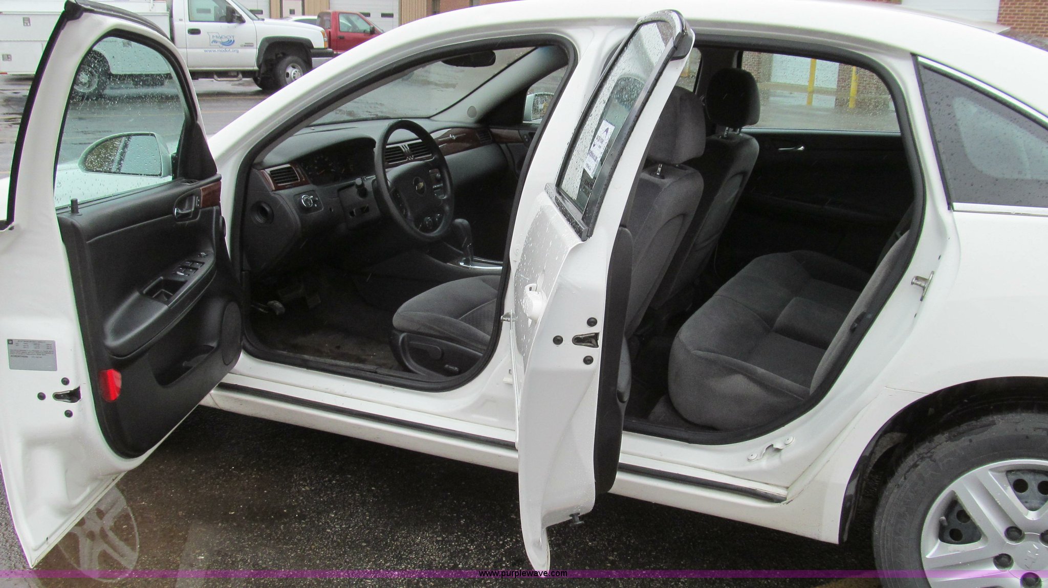 2007 Chevrolet Impala LS. 158,244 miles on odometer, 3.5L V6 OHV 16V FFV gas engine, Automatic transmission, AC and heat, Tilt, Cruise, AM/FM/CD, Power windows, locks, mirrors, and seats, Cloth interior, P225/60R16 tires, Small hole drilled in driver's side dash, Paint chipped on front and rear bumpers , Dented driver's side front door post, Right rear quarter panel dented and scratched, MoDOT ID B6265. 2G1WB55K879405480. Missouri Department of Transportation (MODOT). 1511 Missouri Blvd. Jefferson City, MO 65102