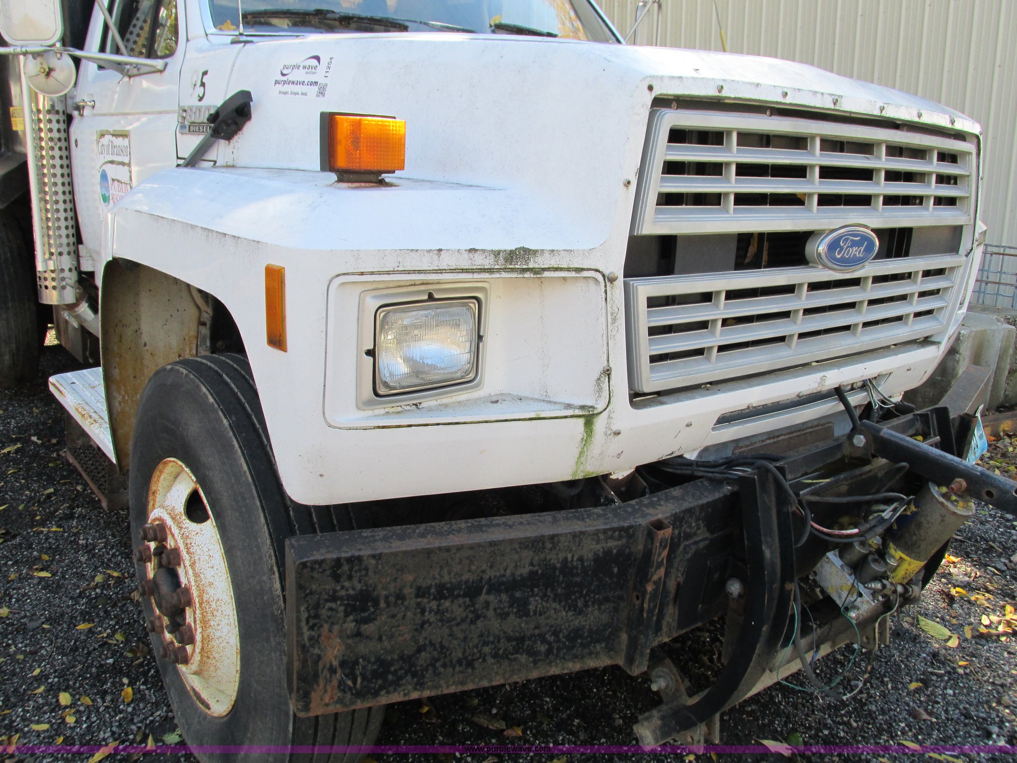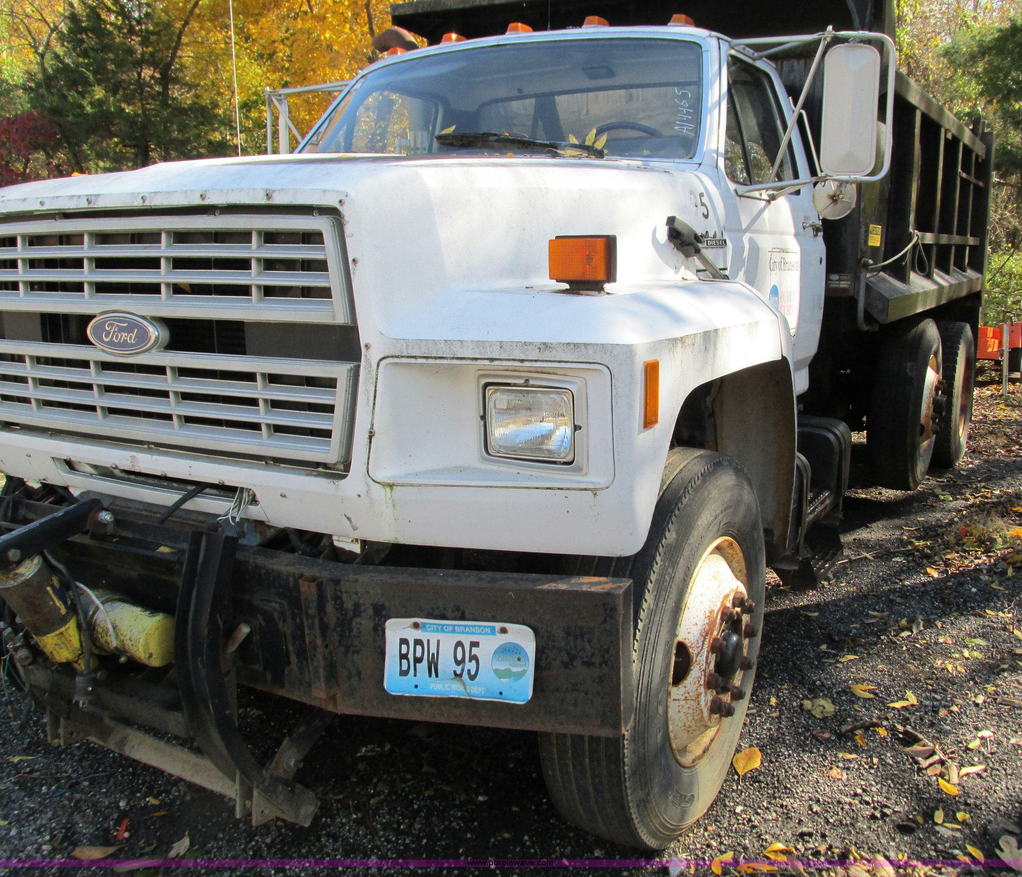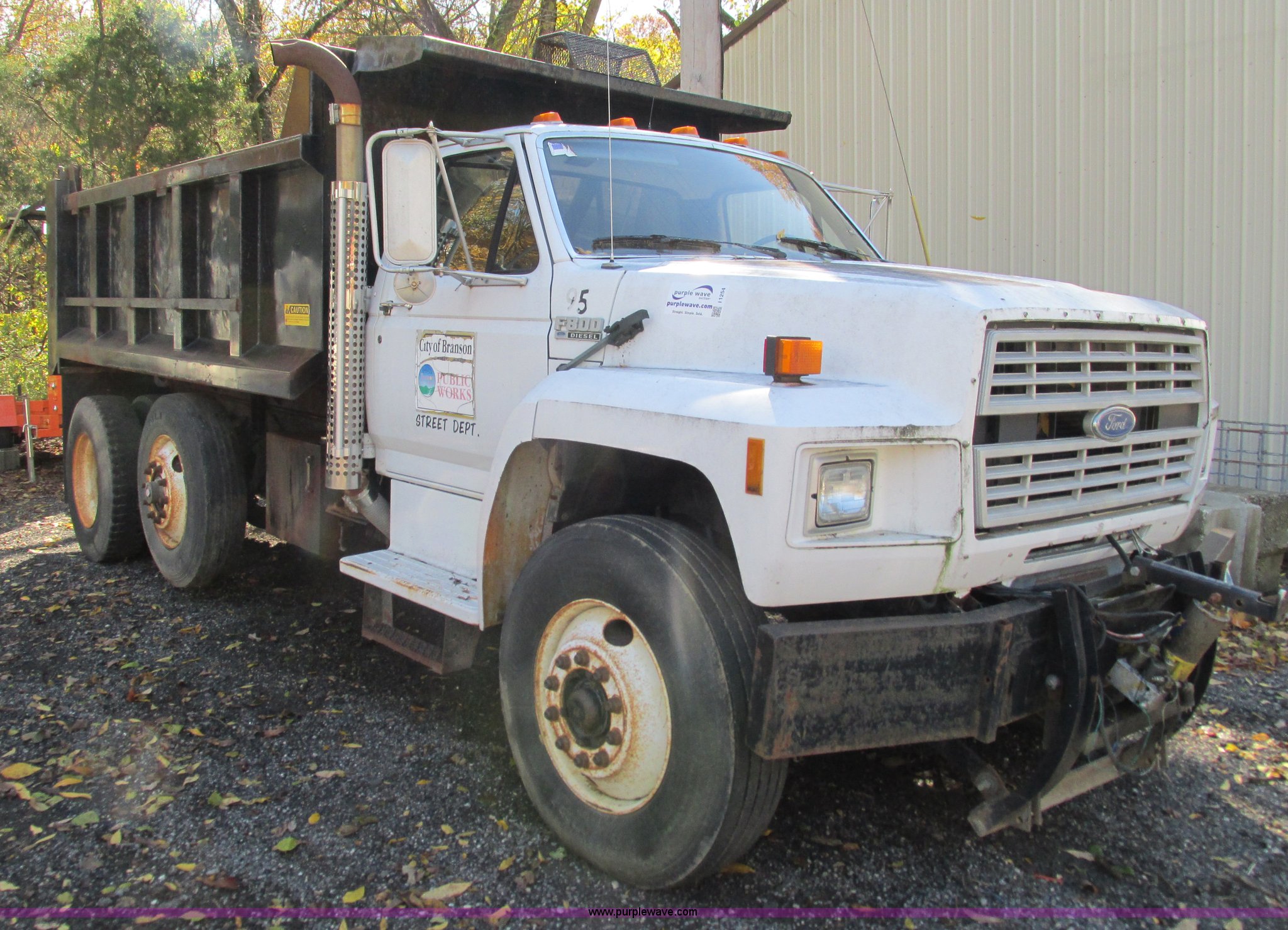 Purple Wave is selling a used Construction Dump Truck in Missouri. This item is a 1994 Ford F800 dump truck with the following: 61,448 miles on odometer, Ford six cylinder diesel engine, Six speed manual transmission, Heat, AM/FM, Heil HPT10YD13 dump bed, 13'L x 8'W x 5'H, Serial 93T262200, Meyer snow plow mount, Pintle hitch, 90 gallon fuel tank, Single exhaust stack, Muncie PTO, Spring suspension, Air brakes, 178" wheelbase, 11R22.5 tires, GVWR 33,000 lbs, FAWR 12,000 lbs, RAWR 21,000 lbs