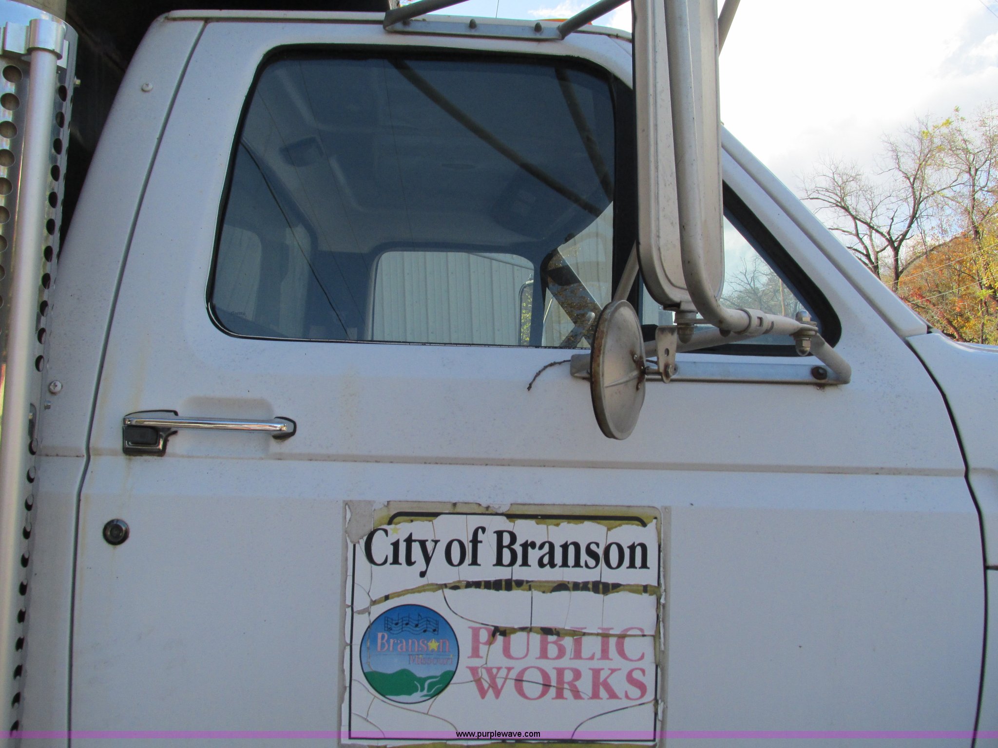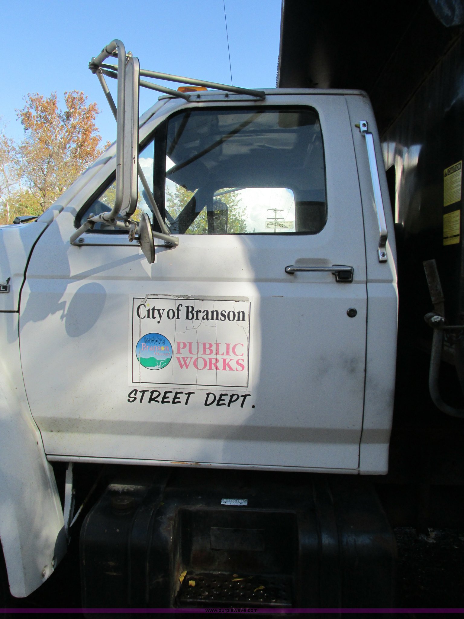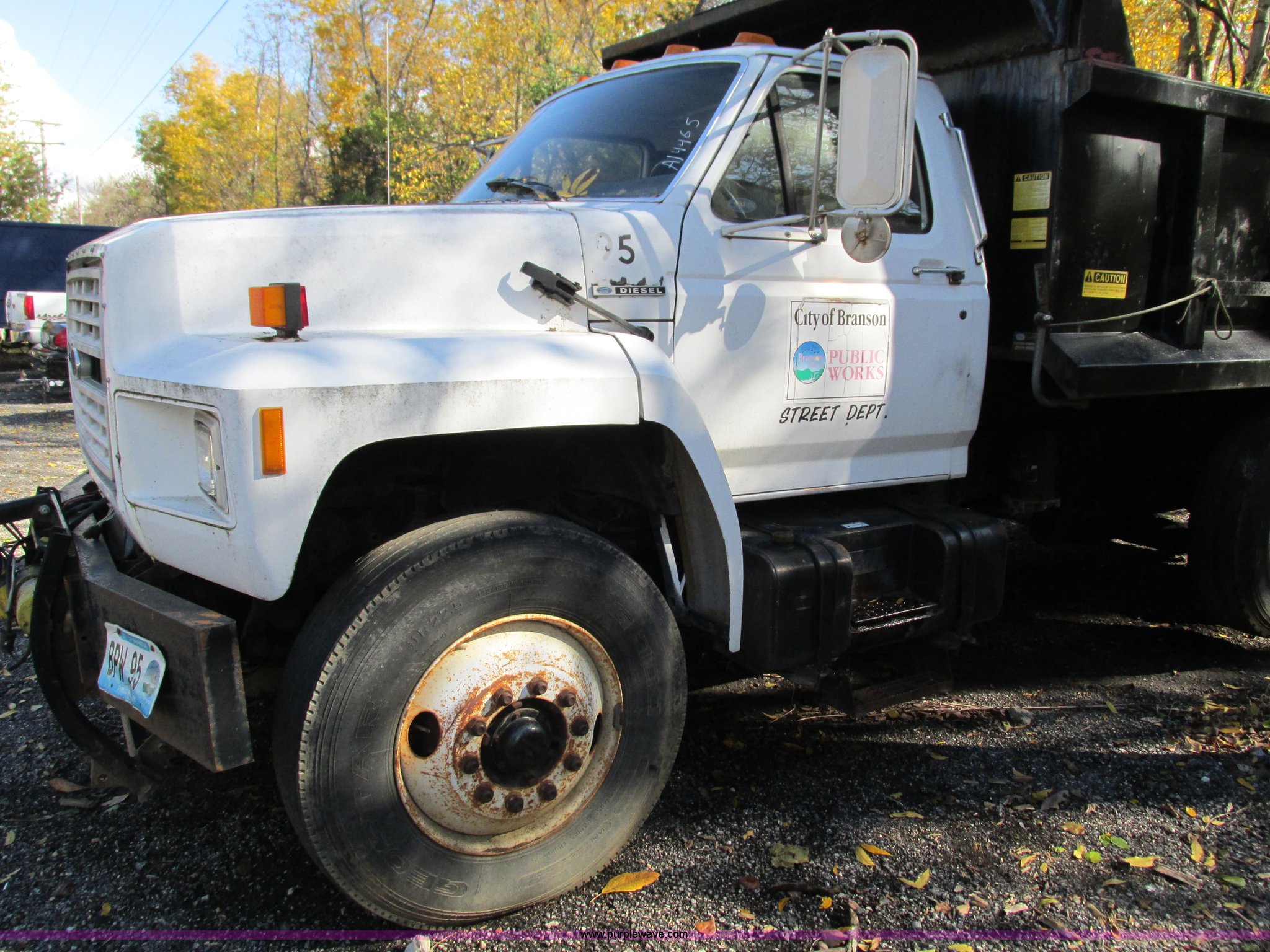 1994 Ford F800 dump truck. 61,448 miles on odometer, Ford six cylinder diesel engine, Six speed manual transmission, Heat, AM/FM, Heil HPT10YD13 dump bed 13'L x 8'W x 5'H, Serial 93T262200, Meyer snow plow mount, Pintle hitch, 90 gallon fuel tank, Single exhaust stack, Muncie PTO, Spring suspension, Air brakes, 178" wheelbase, 11R22.5 tires, GVWR 33,000 lbs, FAWR 12,000 lbs, RAWR 21,000 lbs. Seller is a government entity who will be assigning and distributing the title. Please contact the seller for distribution questions. 1FDXK84E1RVA14465. City of Branson. 625 Stockstill Lane. Branson, MO 65616