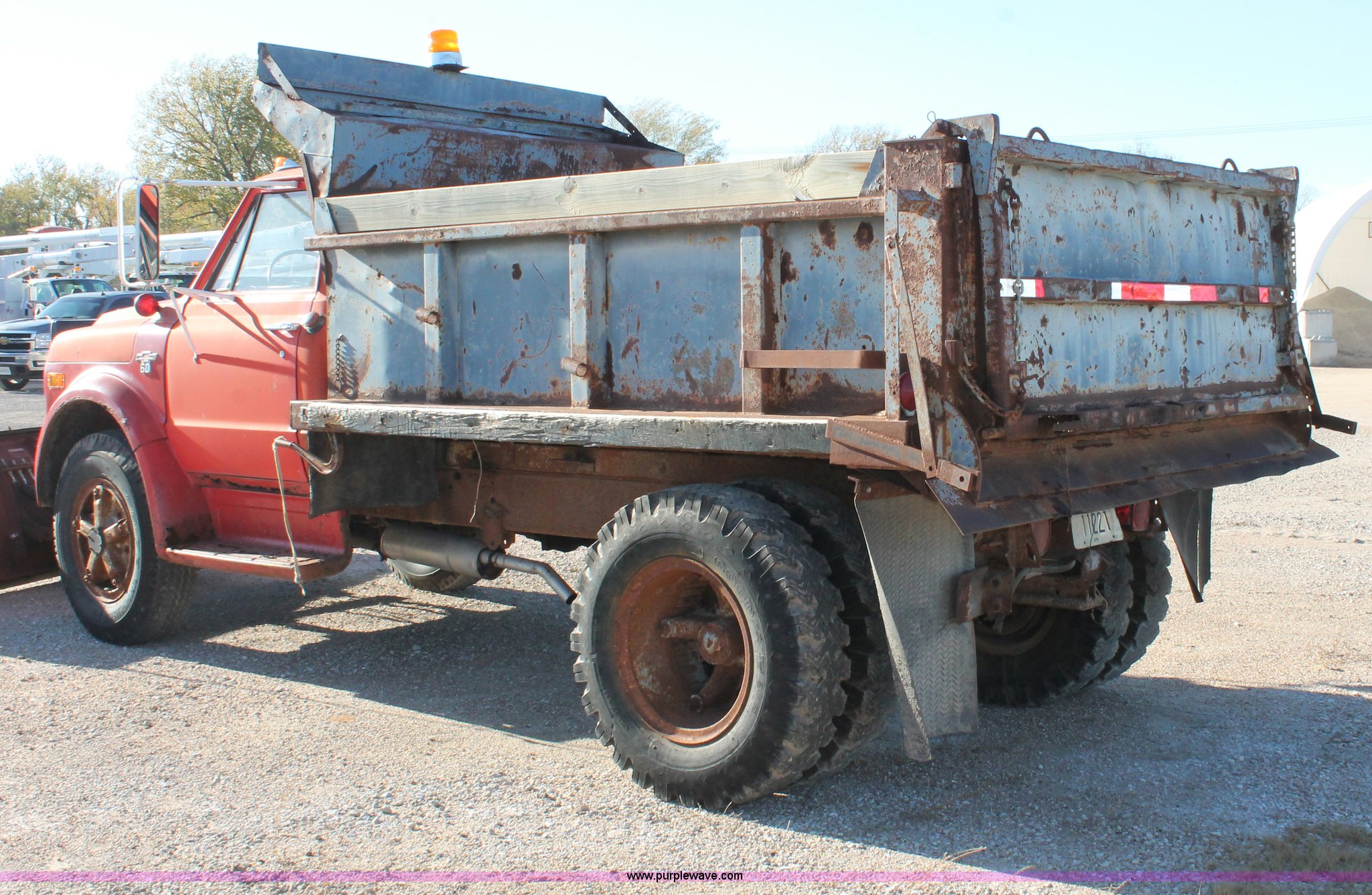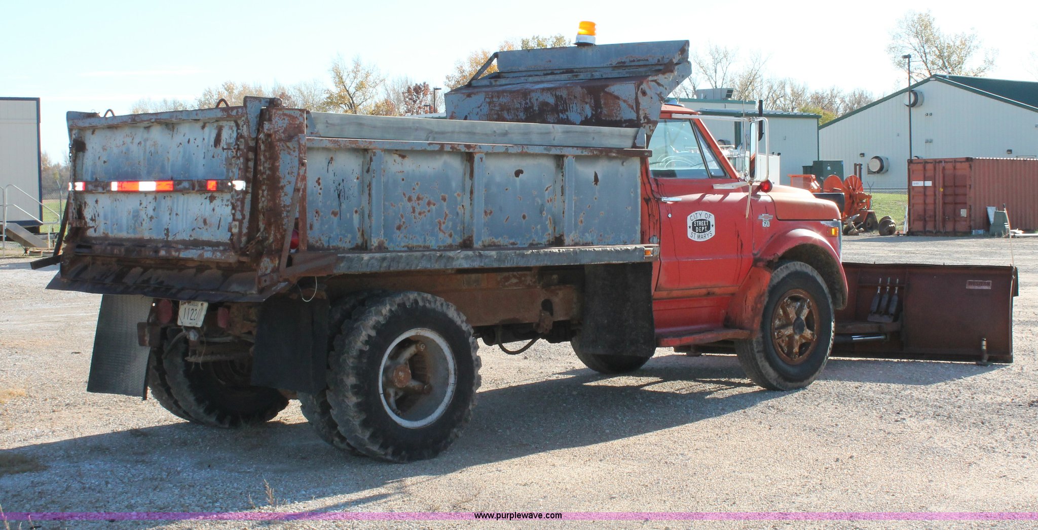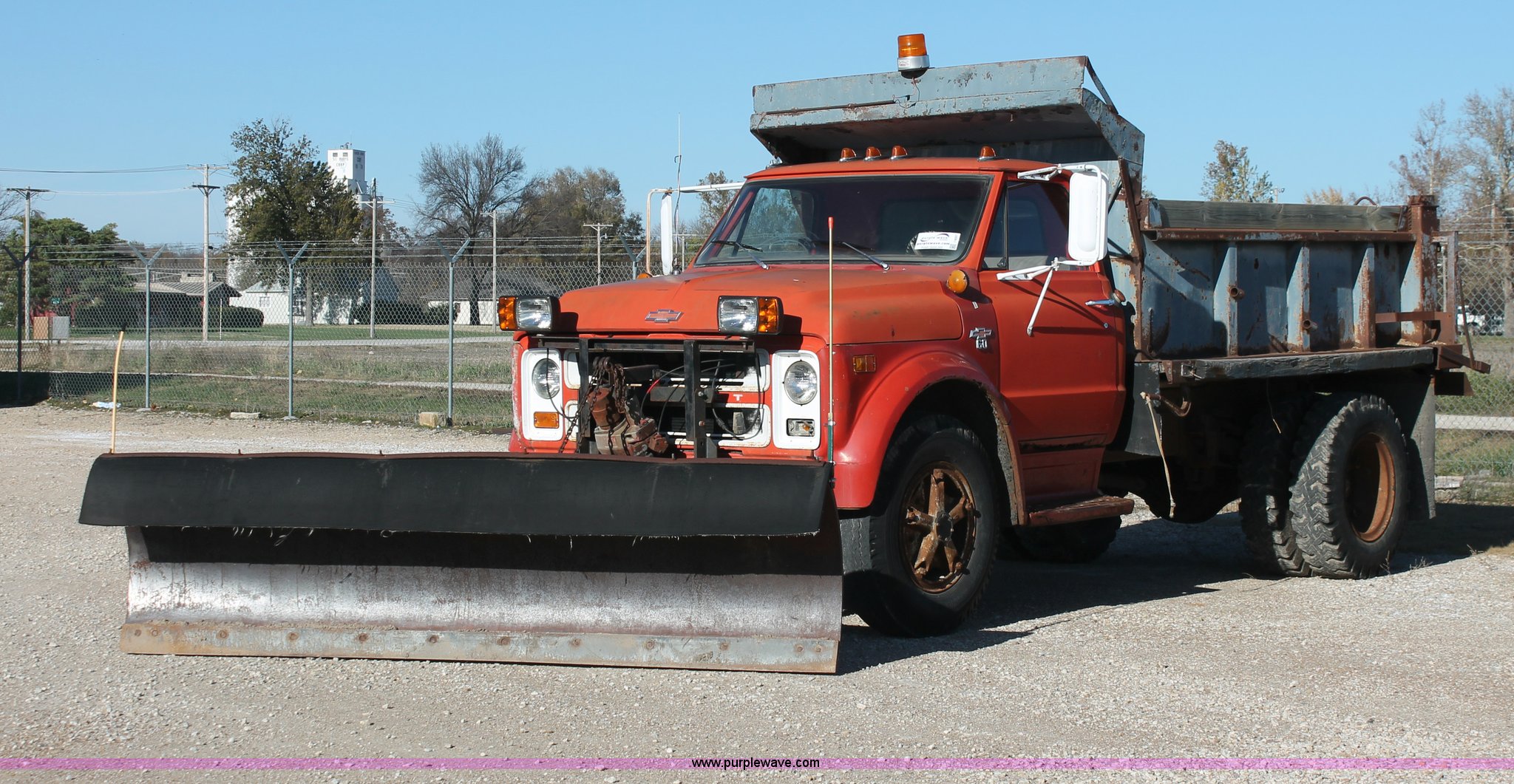 Purple Wave is selling a used Construction Dump Truck in Kansas. This item is a 1968 Chevrolet C60 dump truck with the following: 75,629 miles on odometer, 350 C.I.D. V8 gas engine, Five speed manual transmission, Heat, AM/FM/cassette, Heil A610-1767 10' dump bed, Five yard capacity, Manual end gate, Single ram three stage hoist, PTO, Western 58496HW 10' snow plow, Work lights, Single fuel tank, Receiver hitch, Trailer wiring, 9.00-20 tires, GVWR 24,000 lbs, Odometer inoperable, Engine rebuilt, Clutch and pressure plate replaced