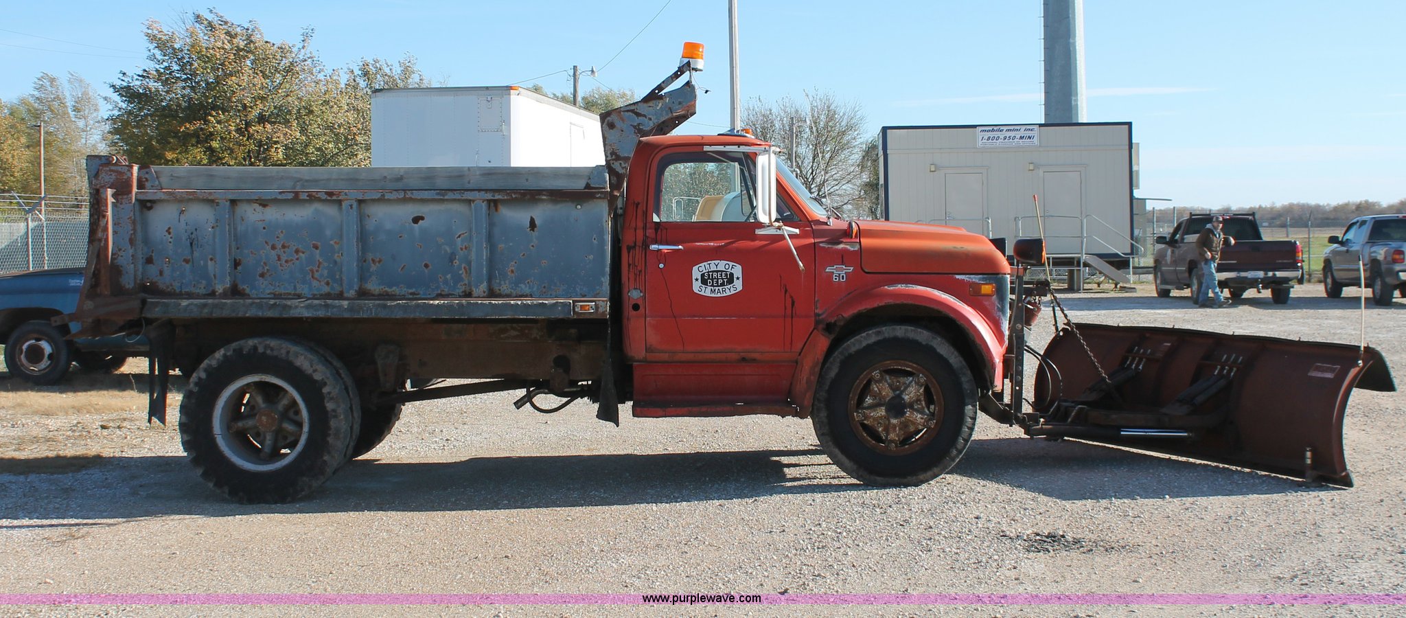 1968 Chevrolet C60 dump truck. 75,629 miles on odometer, 350 C.I.D. V8 gas engine, Five speed manual transmission, Heat, AM/FM/cassette, Heil A610-1767 10' dump bed Five yard capacity, Manual end gate, Single ram three stage hoist, PTO, Western 58496HW 10' snow plow Work lights, Single fuel tank, Receiver hitch, Trailer wiring, 9.00-20 tires, GVWR 24,000 lbs, Odometer inoperable, Engine rebuilt, Clutch and pressure plate replaced. CE638J124860. City of St. Marys. St. Marys, KS 66536