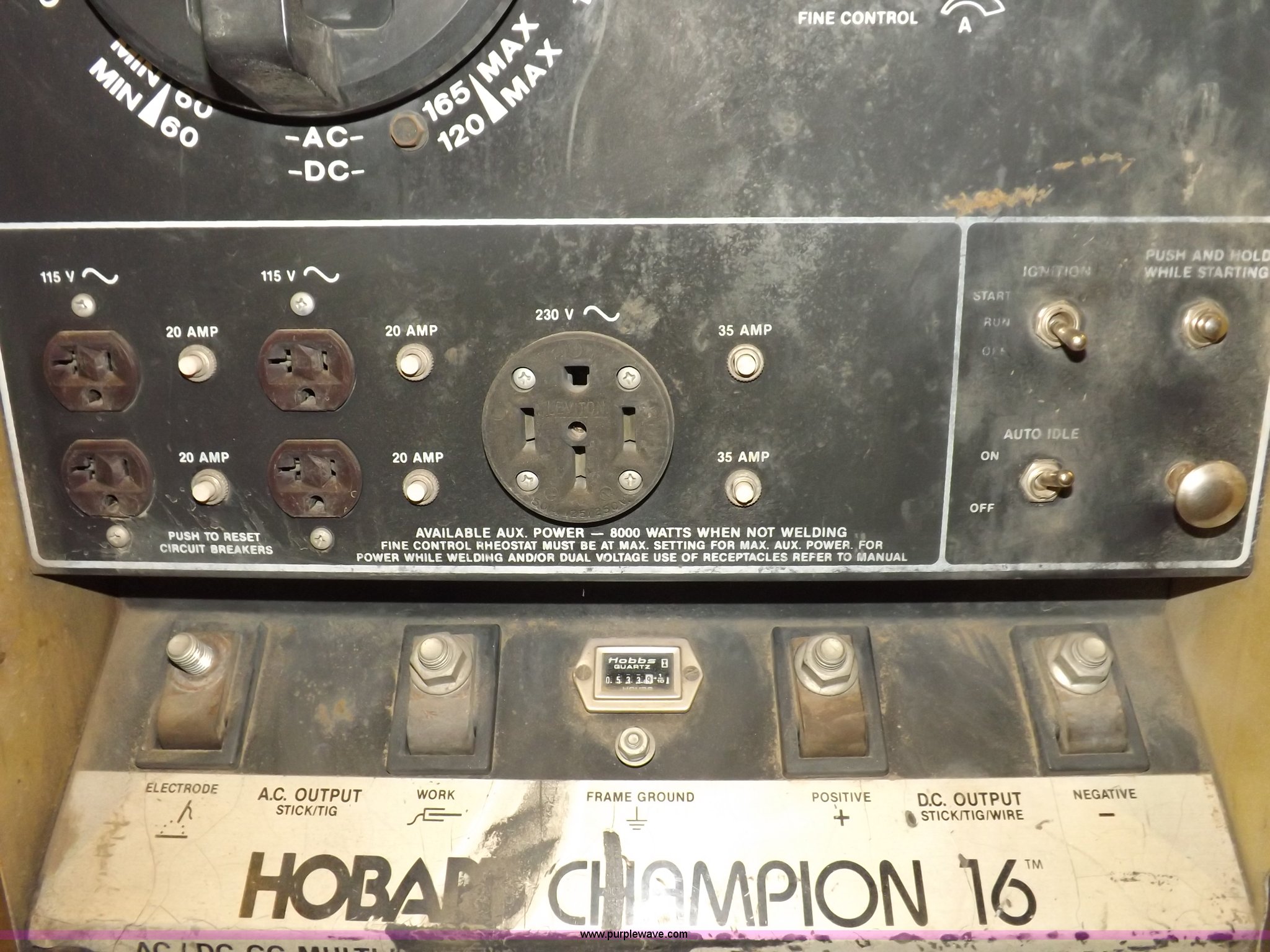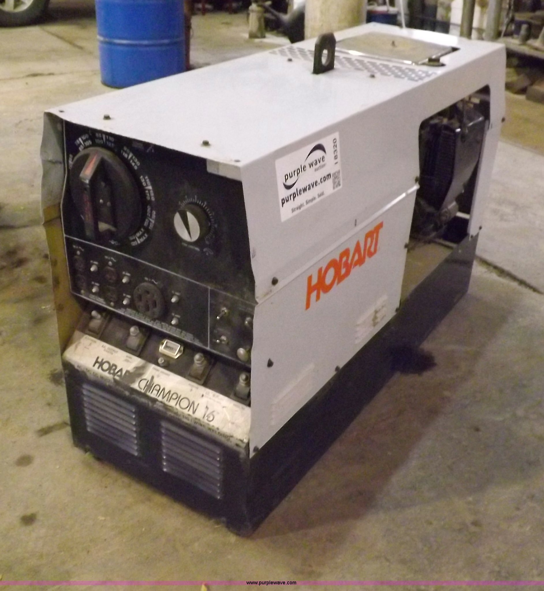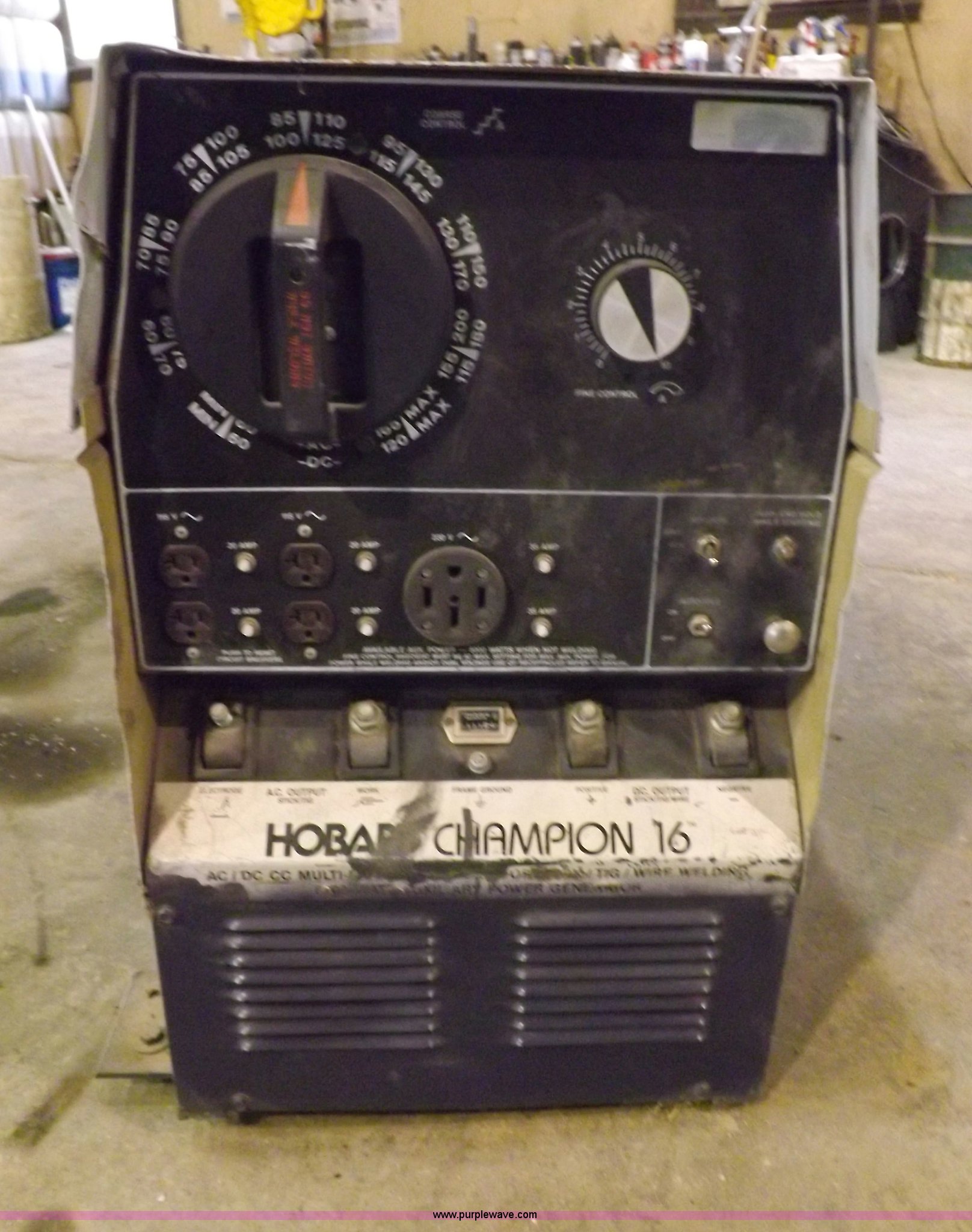Purple Wave is selling a used Welder (Manual) in Kansas. This item is a Hobart Champion 16 welder/generator with the following: 533 hours on meter, 165 amps AC, 120 amps DC, Onan two cylinder four cycle gas engine, 16 HP, Auto idle, (4) 120V outlets, 240V outlet, 8,000 watter auxiliary power, Lifting eye