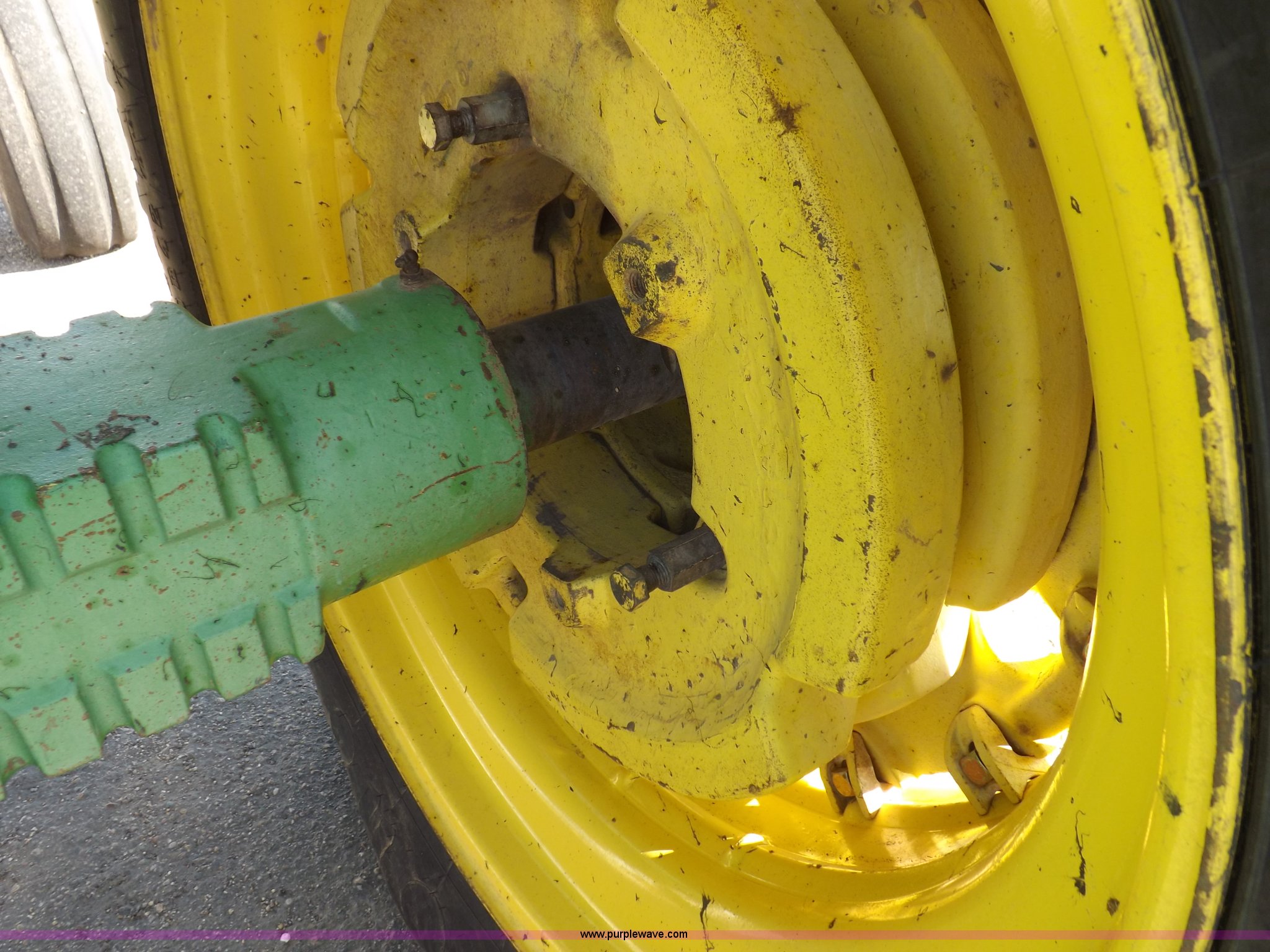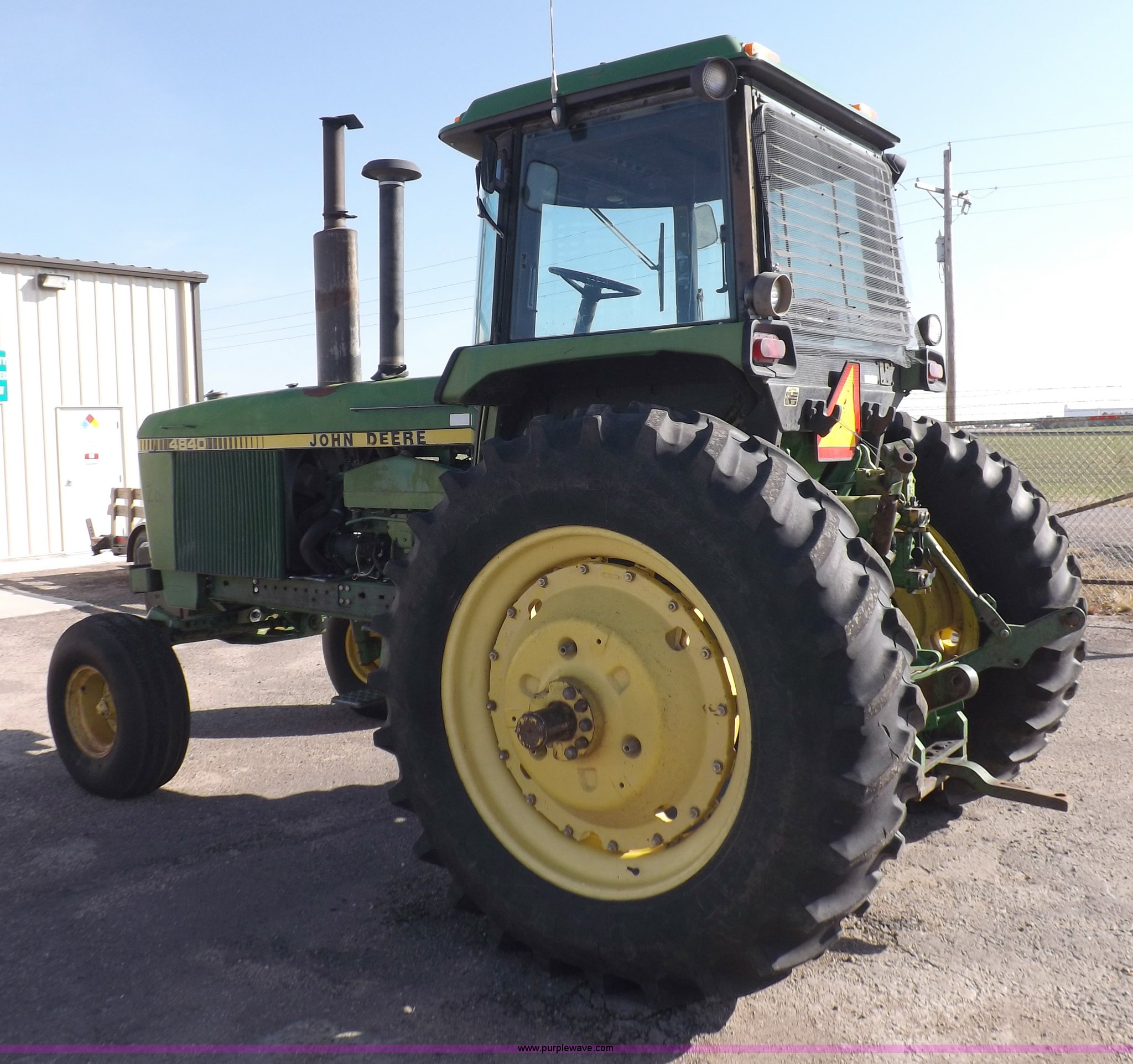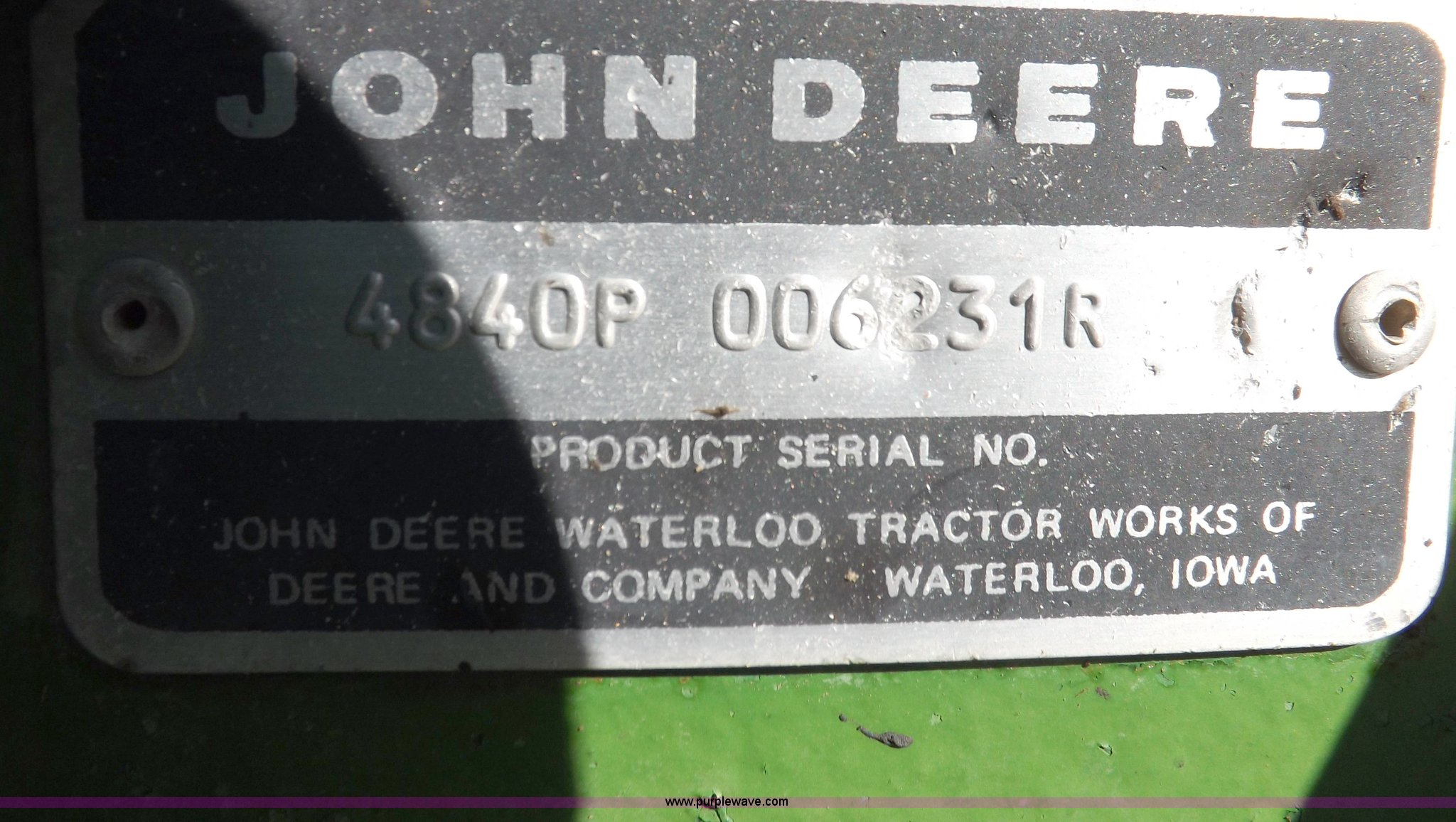 Purple Wave is selling a used Tractor in Kansas. This item is a John Deere 4840 tractor with the following: 4,437 hours on meter, John Deere 6466 six cylinder diesel engine, Serial 6466AR-05 081536RG, Powershift transmission, 8F-4R gears, Differential lock, AC and heat, AM/FM, Spring suspension seat, Tilt steering wheel, Rear shade and screen, Three point, Large 1000 PTO, Draw bar, Auxiliary hydraulics, Suitcase weights, Wheel weights, 118" wheelbase, 11-16 front tires, 480/80R42 rear tires, Fan shroud screen patched, Serial 4840P006231R