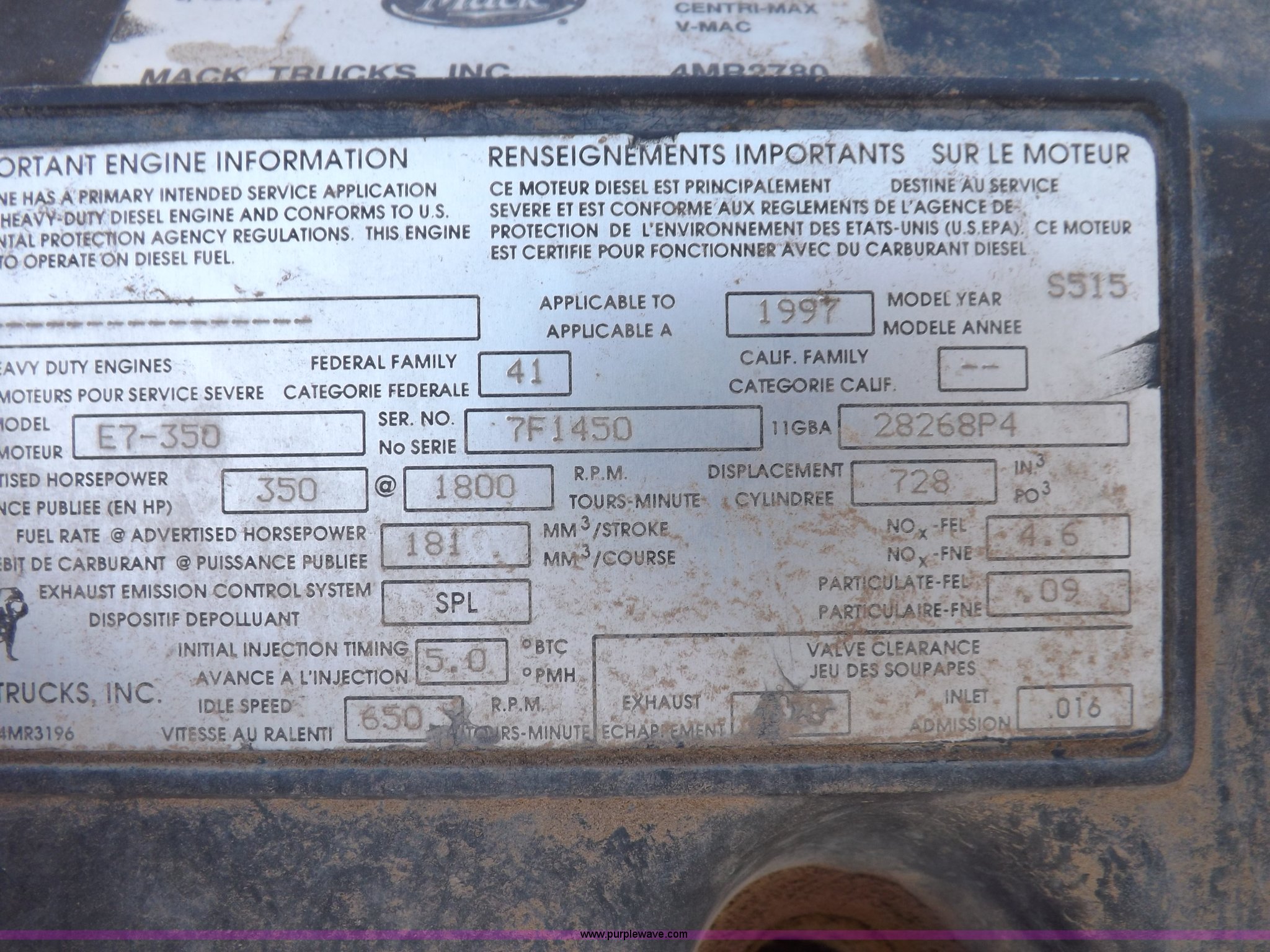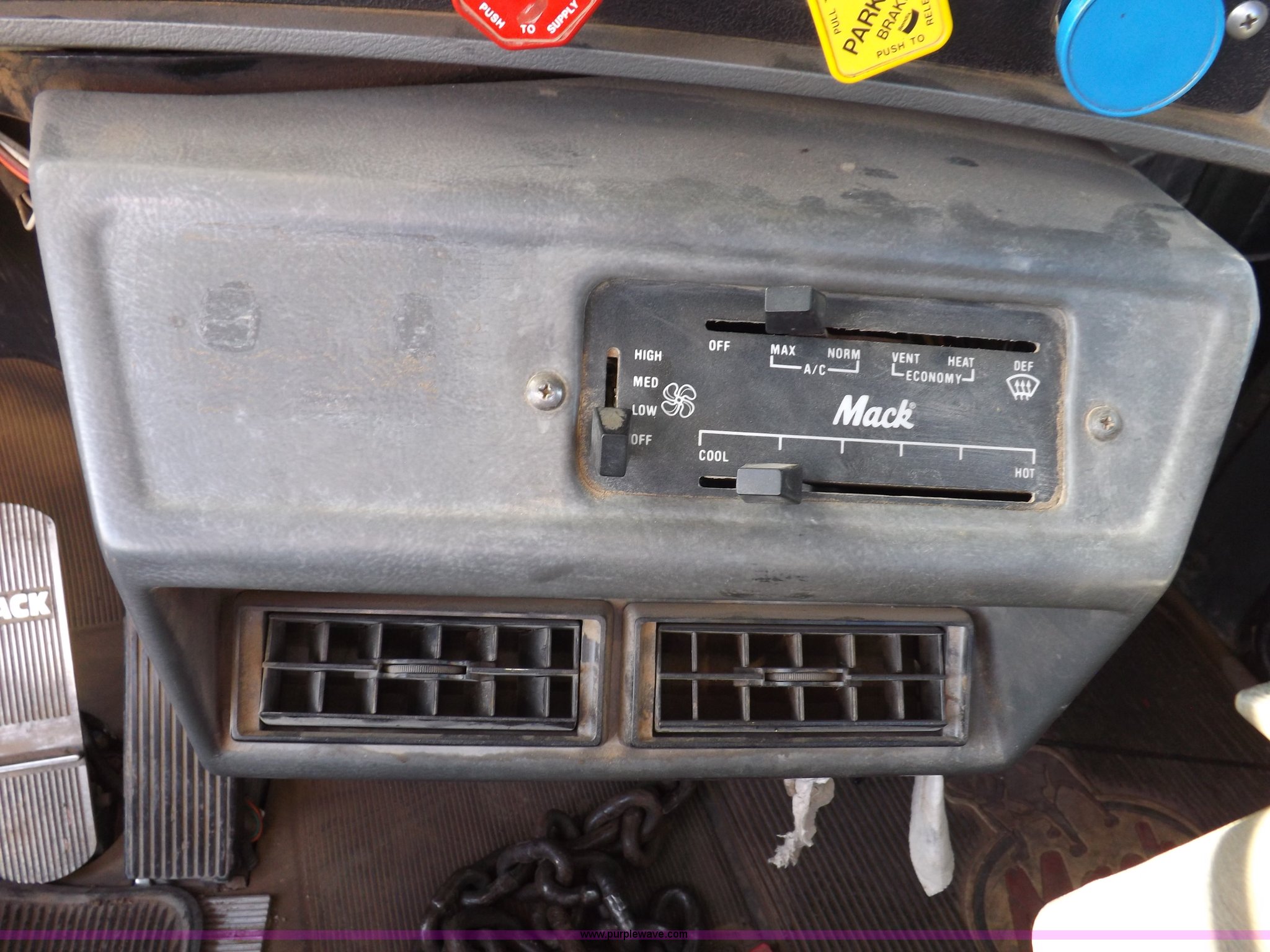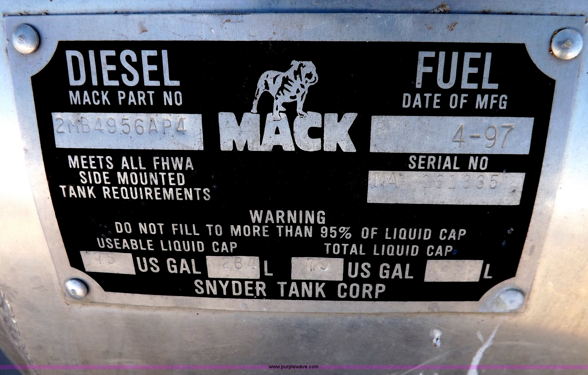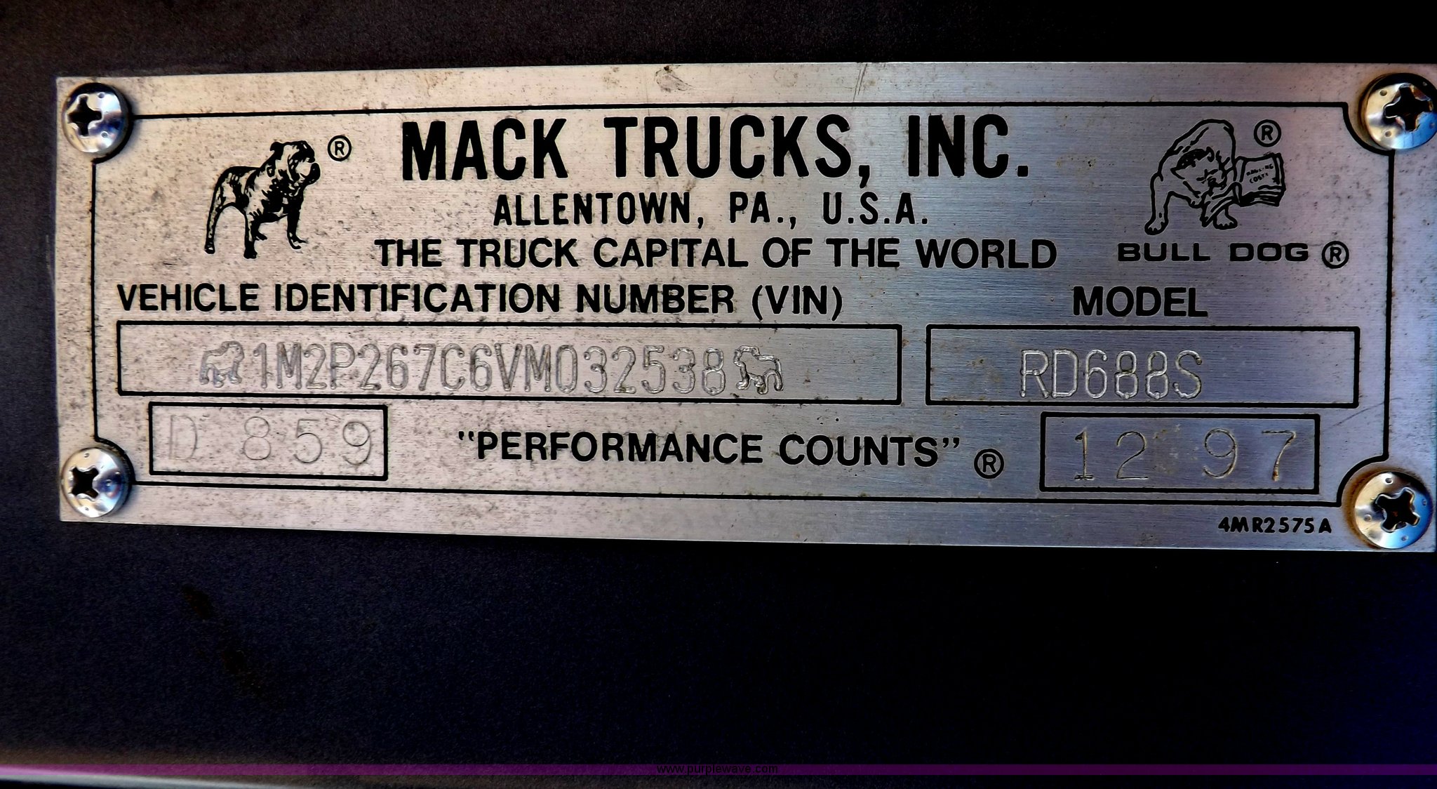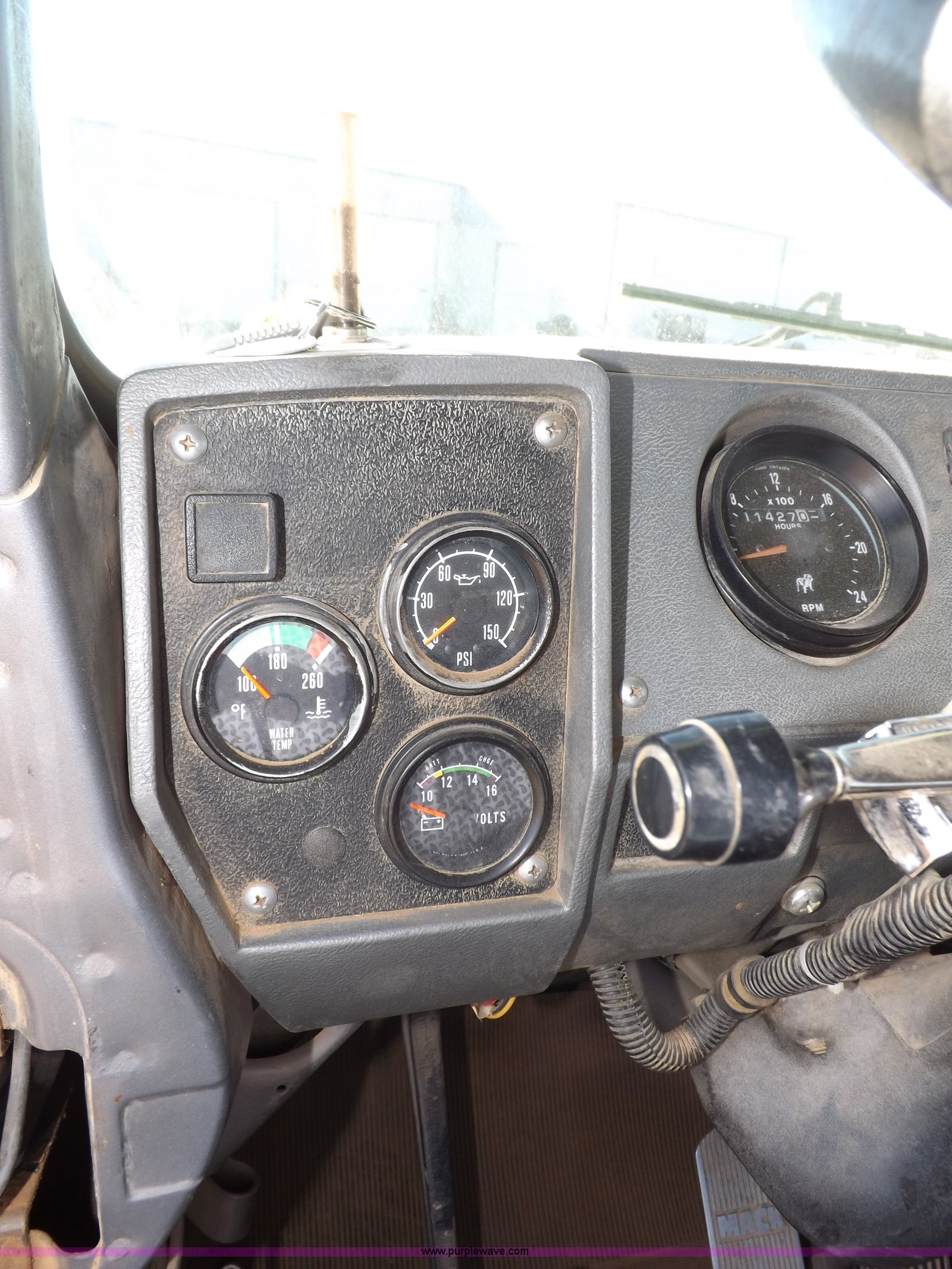 Purple Wave is selling a used Truck Tractor in Kansas. This item is a 1997 Mack RD688S semi truck with the following: 320,856 miles on odometer, Mack E7 12.0L L6 diesel engine, 350 HP, Maxitorque T2130 13 speed manual transmission, AC and heat, Tilt, Cruise, AM/FM/cassette, Air suspension seat, Heated mirrors, Air ride cab, Visor, Chrome bumper, Block heater, Air slide fifth wheel, Dual 79 gallon fuel tanks, Single rear exhaust stack, Aluminum deck plate, Steel quarter fenders, Spring suspension, Air brakes, Brake controller, Jake brake, 231" wheelbas, 11R24.5 tires, Interior/exterior cosmetic damage, Radio gear will be removed, Torn seat, Right rear wheel seal leak, Cracked windshield, Unit# 133