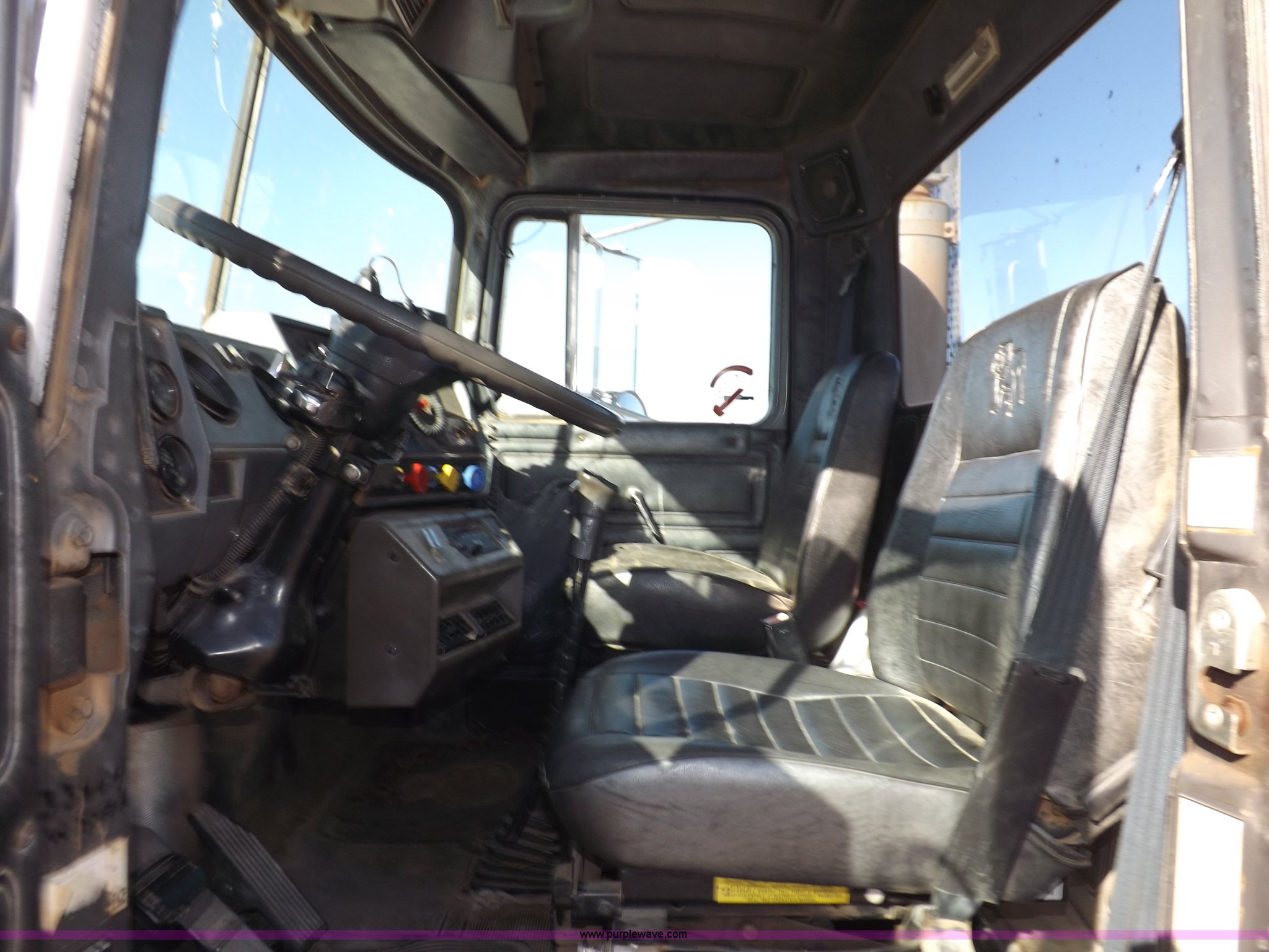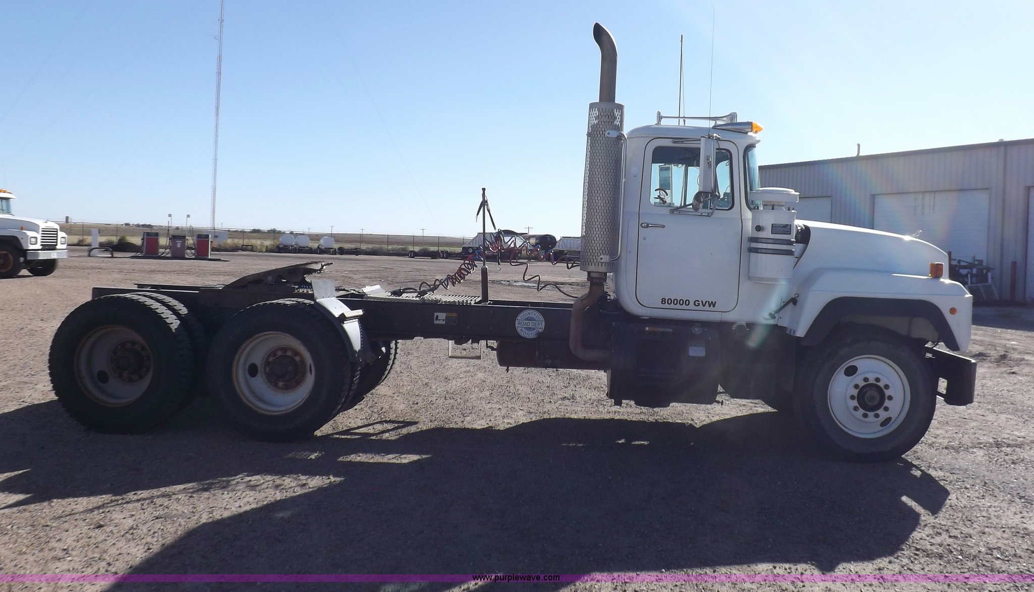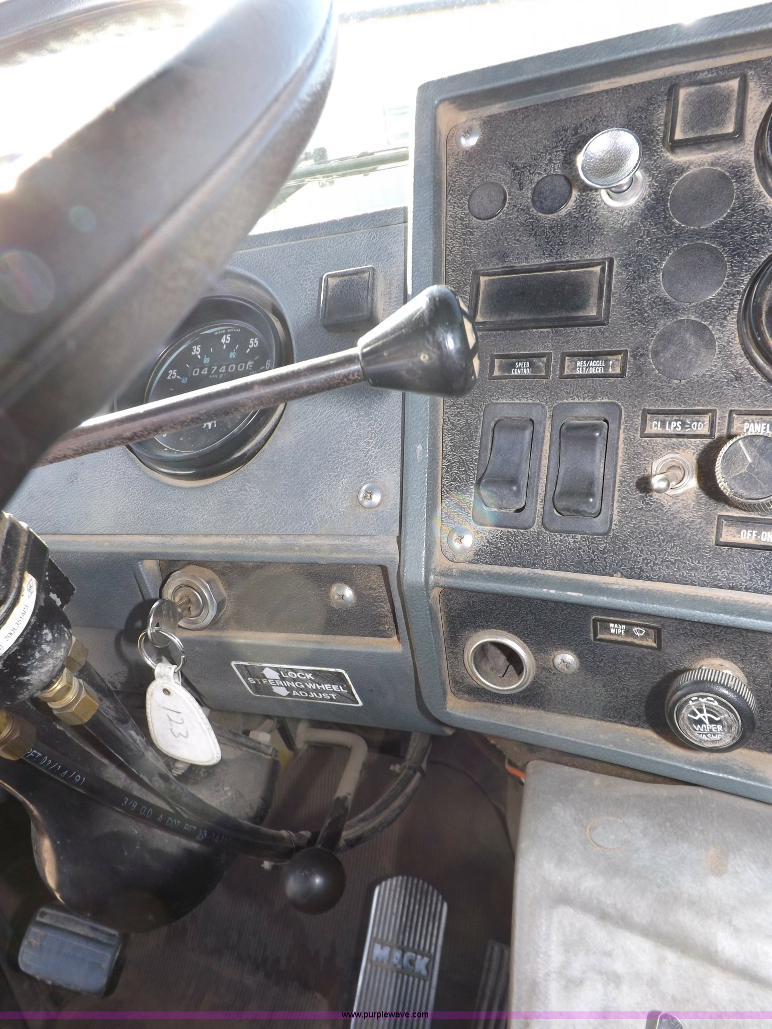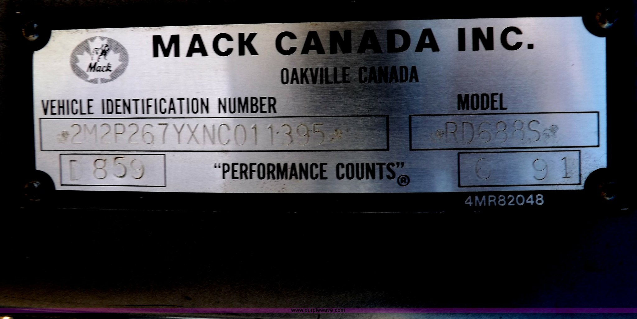 Purple Wave is selling a used Truck Tractor in Kansas. This item is a 1992 Mack RD688S semi truck with the following: 47,400 miles on odometer, Speedometer cluster replaced at 433,664 miles, Mack E7 12.0L L6 diesel engine, 350 HP, Maxitorque 13 speed manual transmission, AC and heat, Tilt, Cruise, AM/FM/cassette, Air suspension seat, Block heater, Air slide fifth wheel, Dual 59 gallon fuel tanks, Single rear exhaust stack, Aluminum deck plate, Steel quarter fenders, Spring suspension, Air brakes, Brake controller, Jake brake, 231" wheelbase, Double framed, 11R24.5 tires, Interior/exterior cosmetic damage, Cracked windshield, Radio gear will be removed, Unit# 123