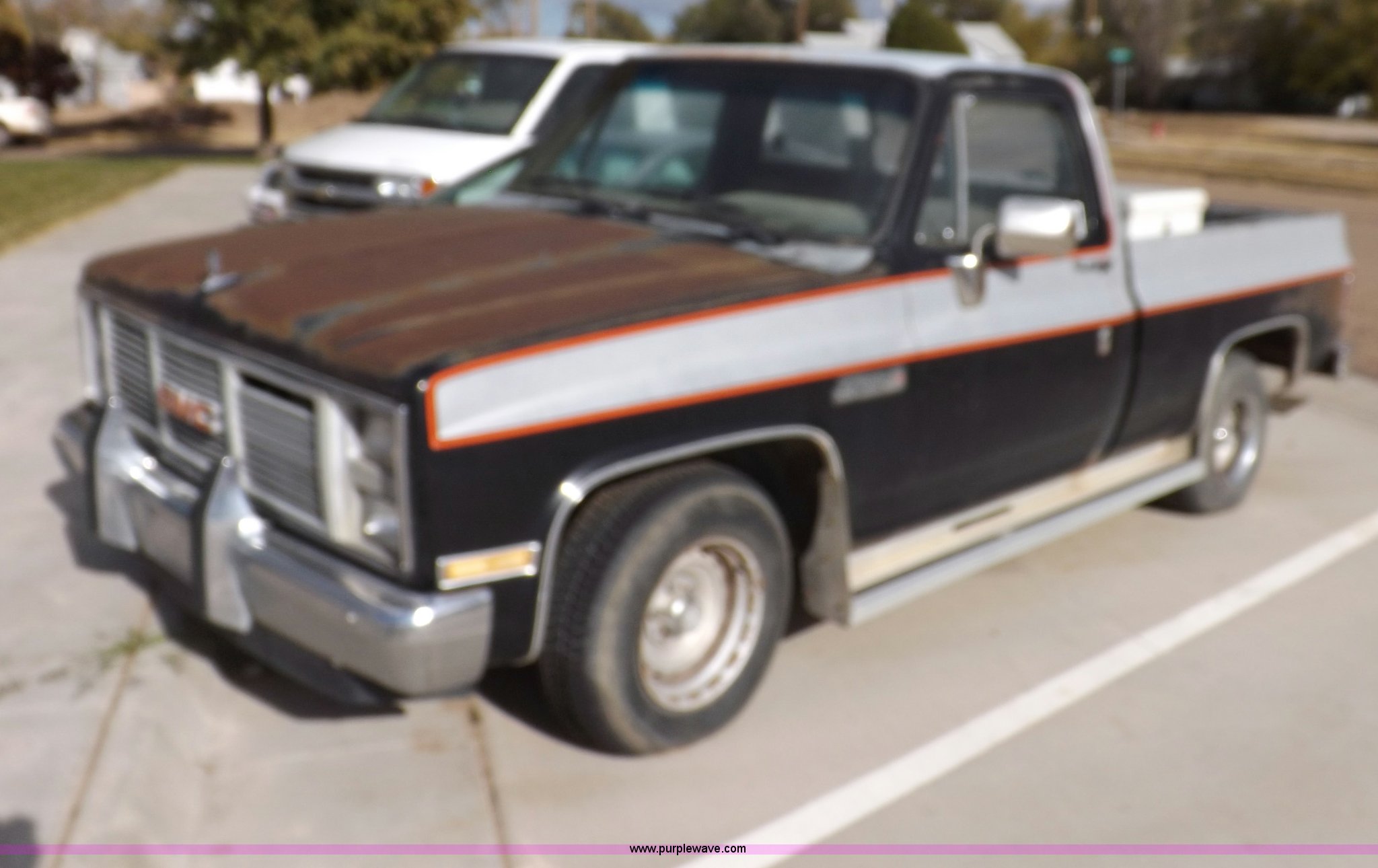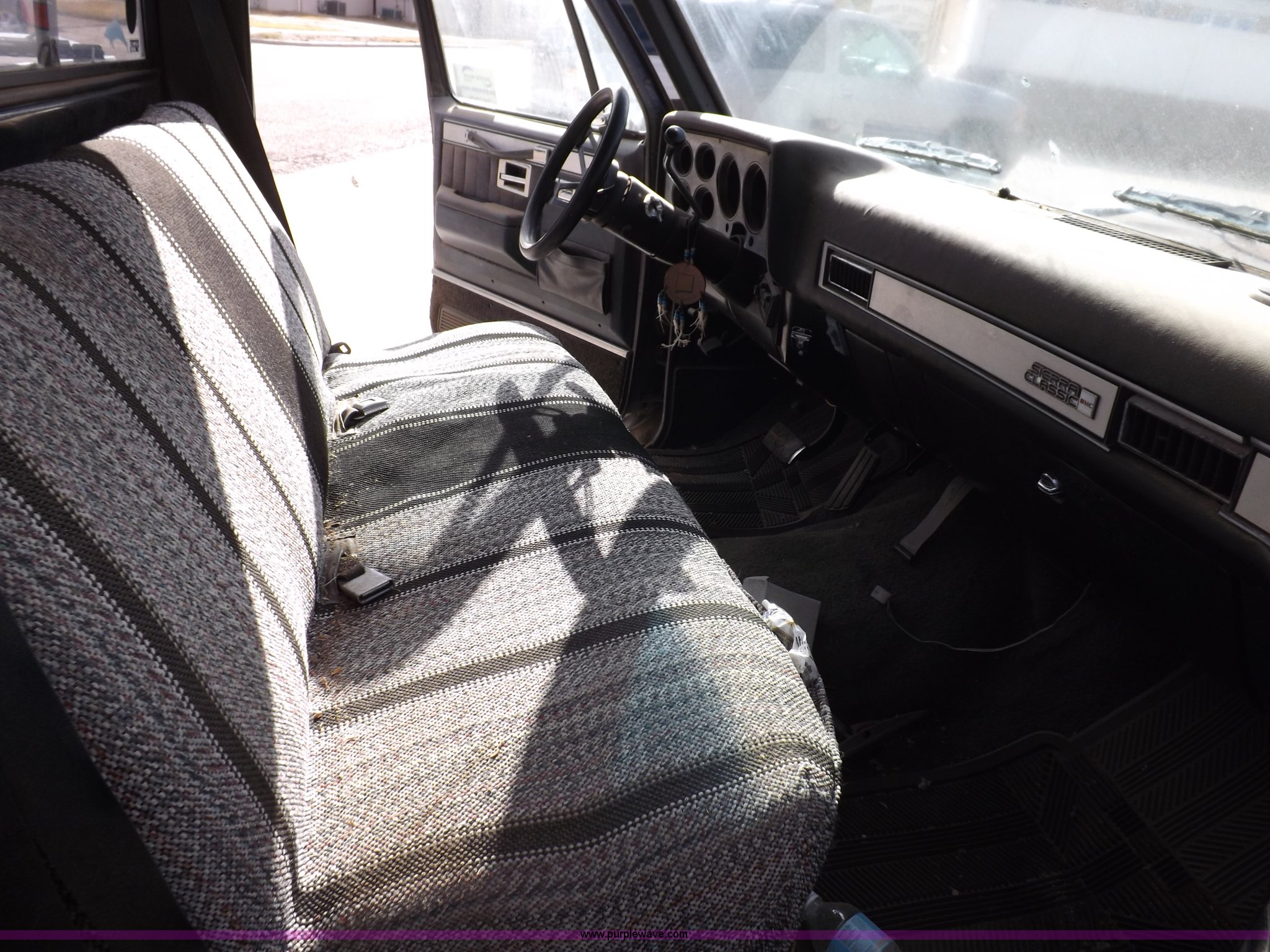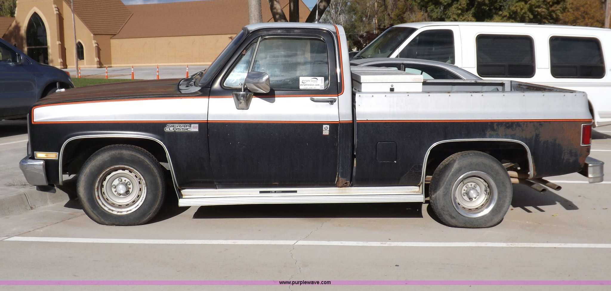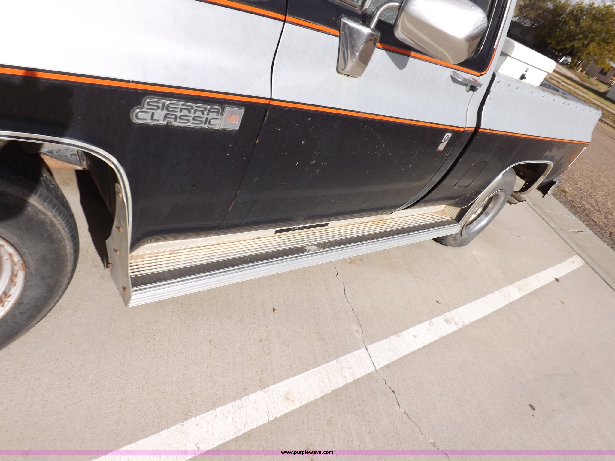 Purple Wave is selling a used Passenger Vehicle in Kansas. This item is a 1985 GMC Sierra Classic 1500 pickup truck with the following: 84,842 miles on odometer, 5.0L V8 VIH 16V gas engine, Automatic transmission, AC and heat, Tilt, Cruise, AM/FM/cassette, Power windows and locks, Cloth interior, Running boards, Cross bed toolbox, Window trim, 225/75R15 tires, Non-operational, Interior/exterior cosmetic damage, Paint and trim damage, Chipped windshield, Rust, Rear bumper damage, Headliner loose