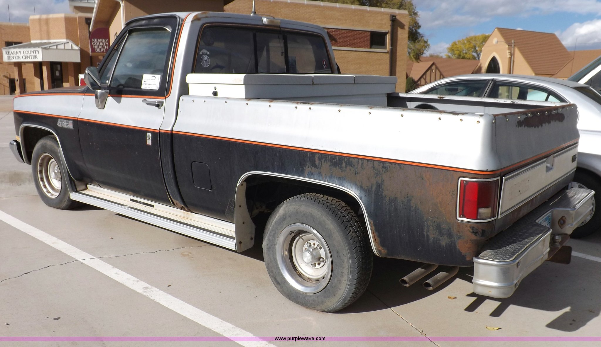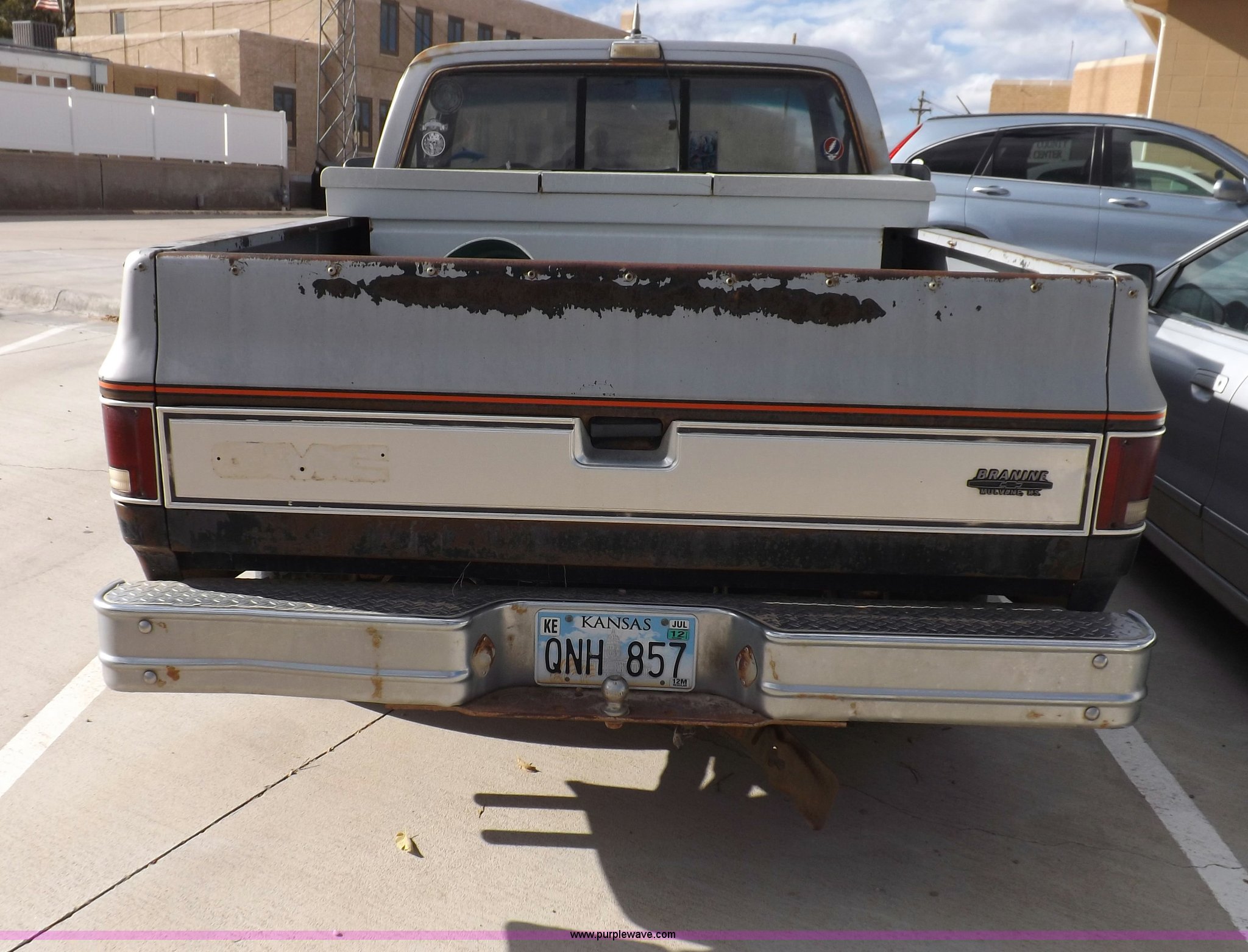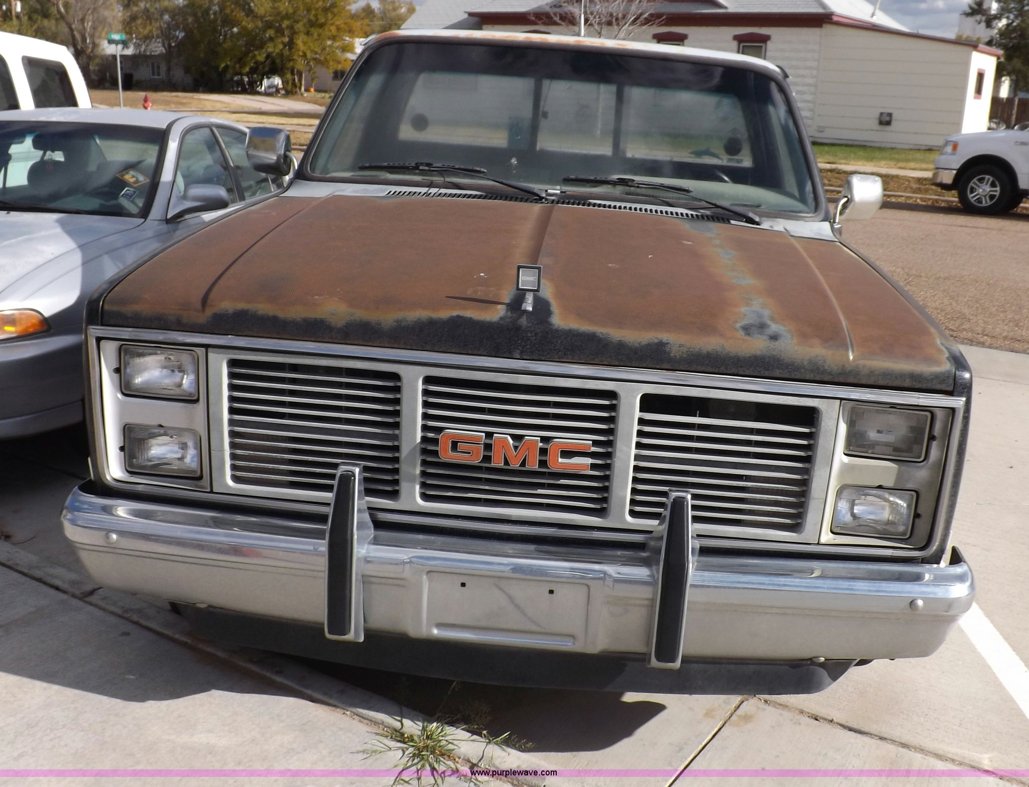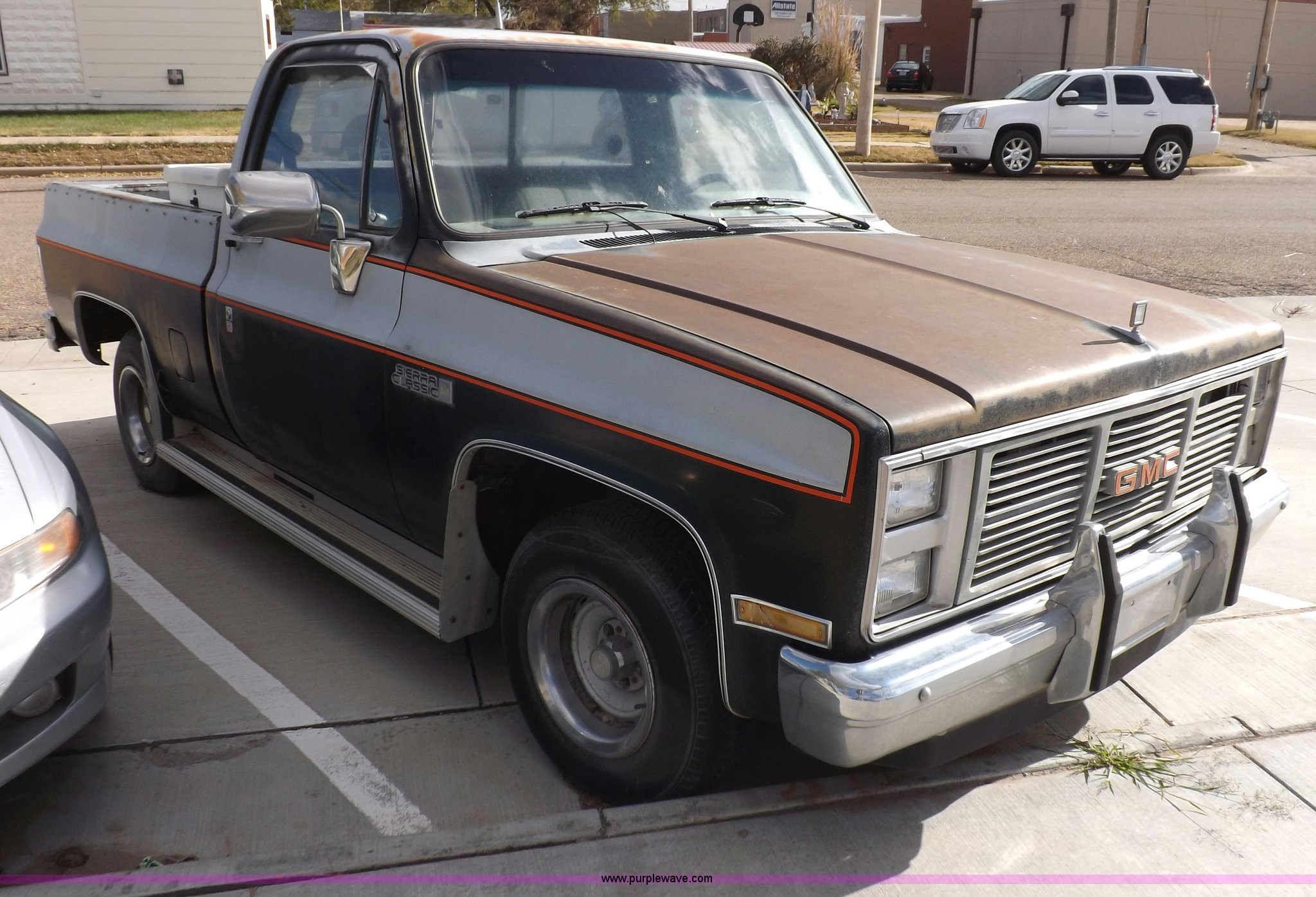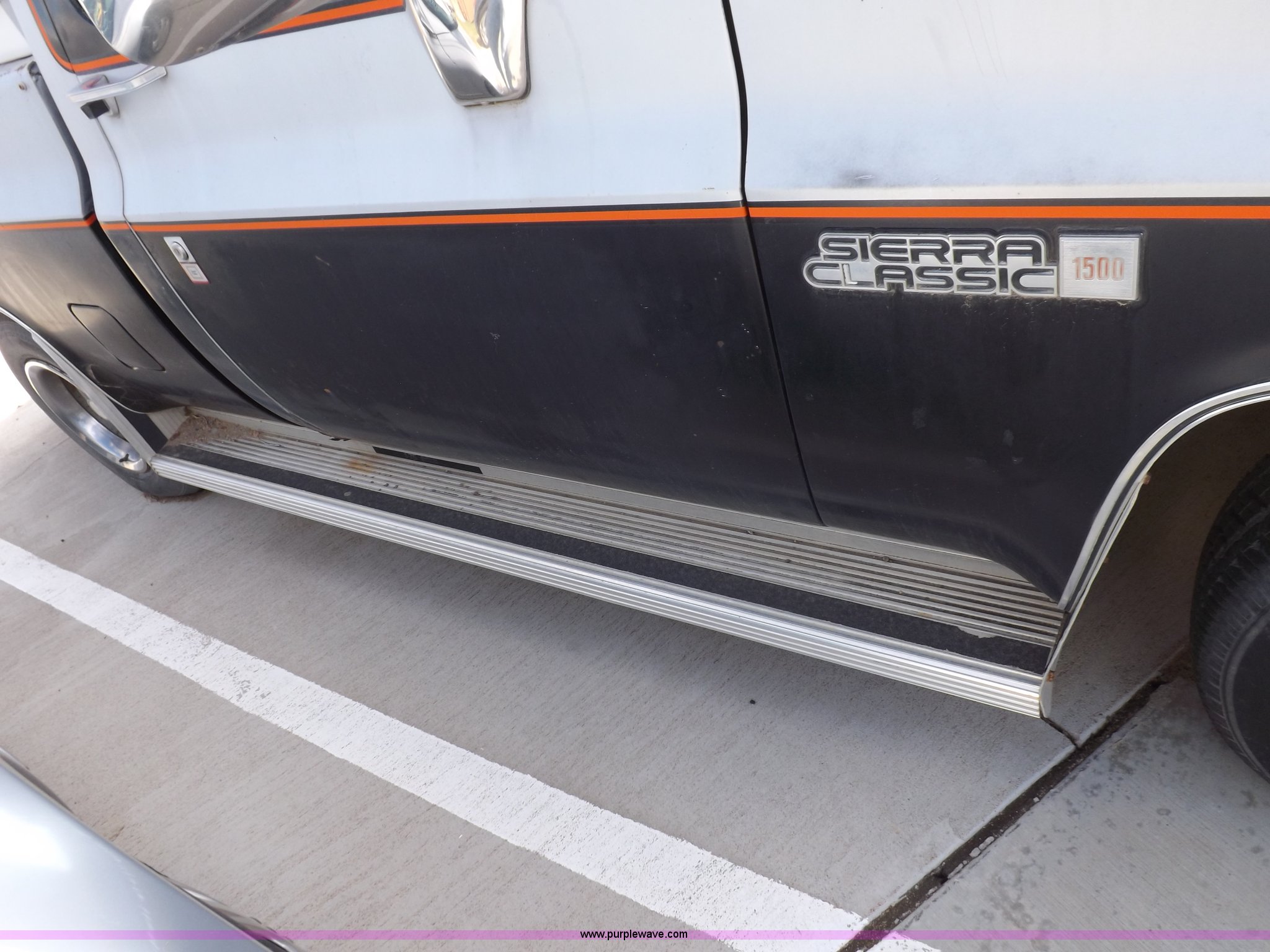 Purple Wave is selling a used Passenger Vehicle in Kansas. This item is a 1985 GMC Sierra Classic 1500 pickup truck with the following: 84,842 miles on odometer, 5.0L V8 VIH 16V gas engine, Automatic transmission, AC and heat, Tilt, Cruise, AM/FM/cassette, Power windows and locks, Cloth interior, Running boards, Cross bed toolbox, Window trim, 225/75R15 tires, Non-operational, Interior/exterior cosmetic damage, Paint and trim damage, Chipped windshield, Rust, Rear bumper damage, Headliner loose